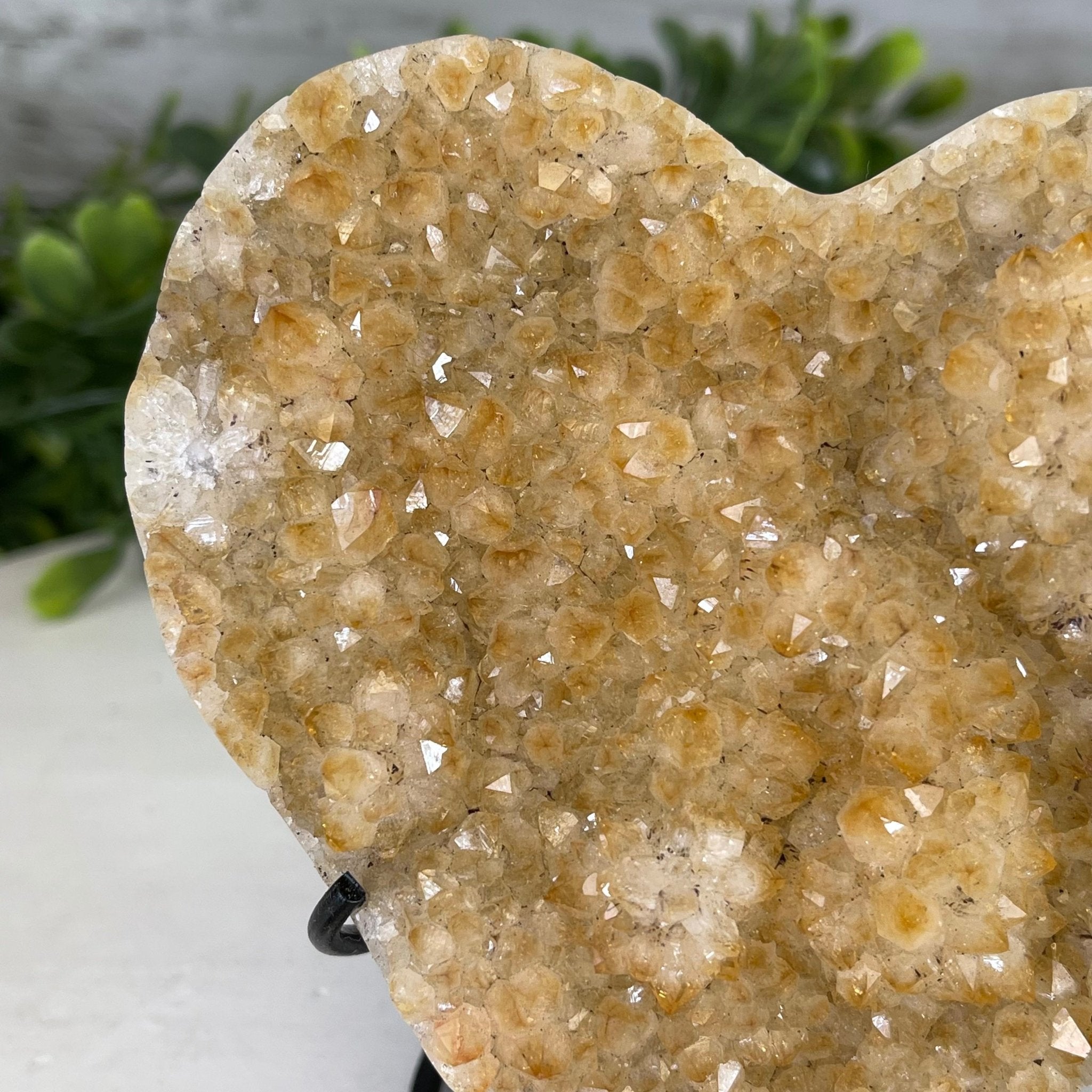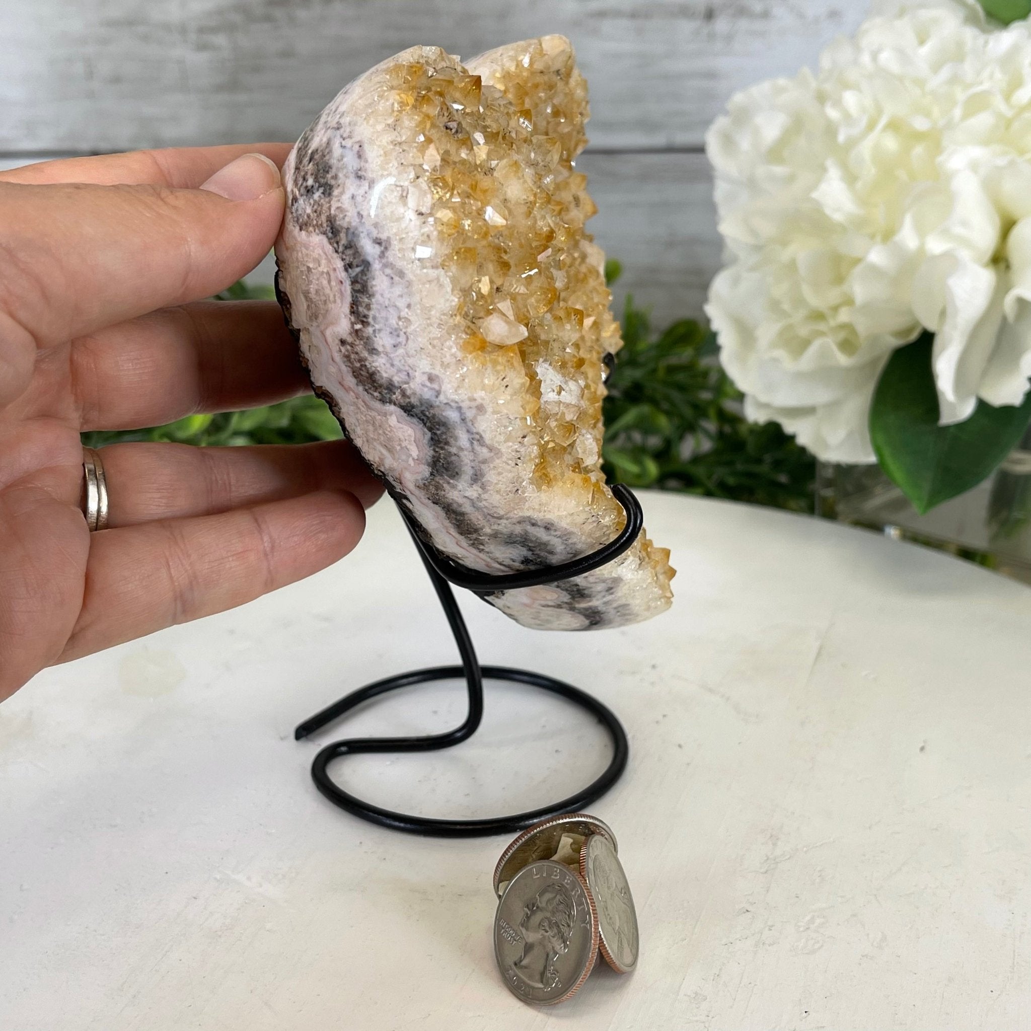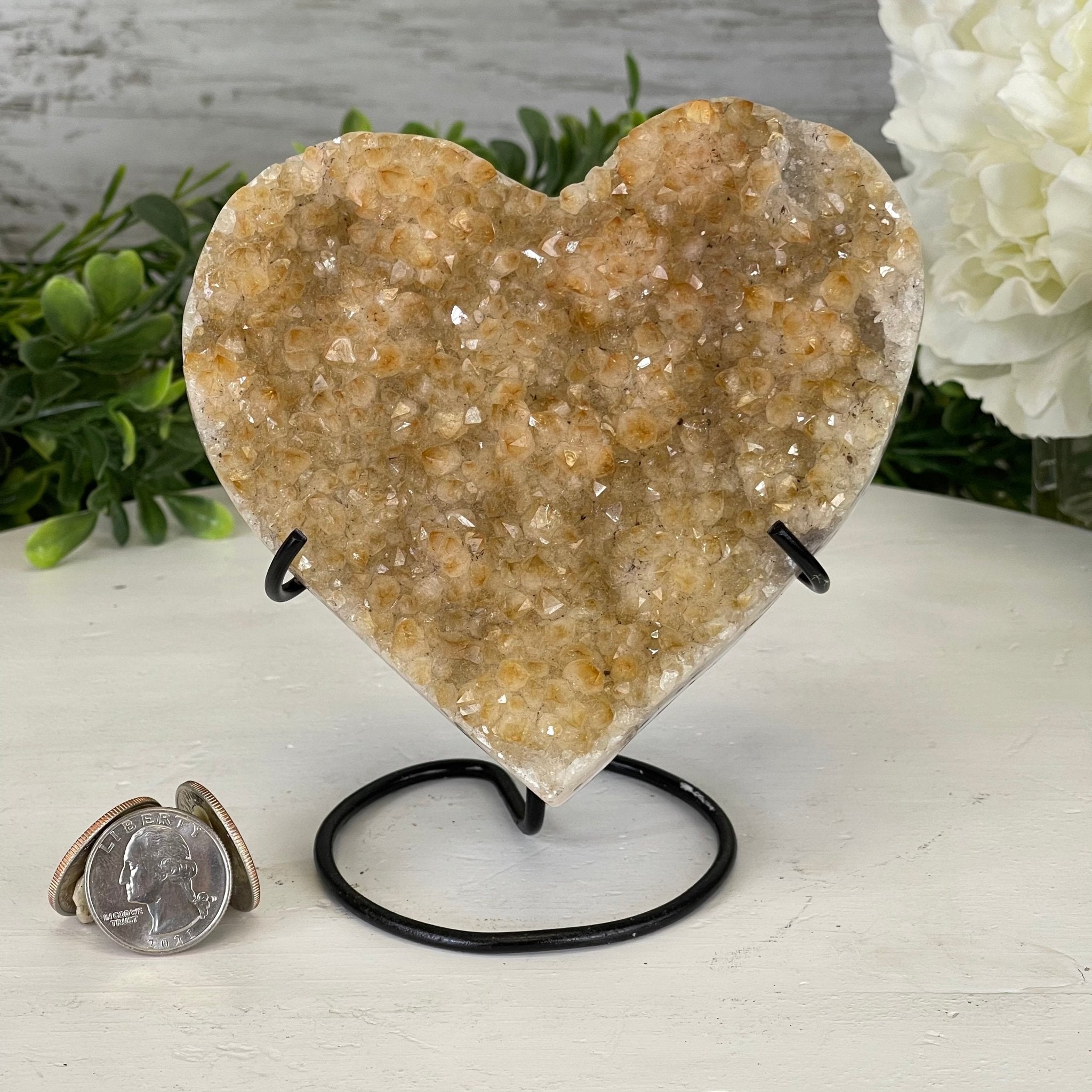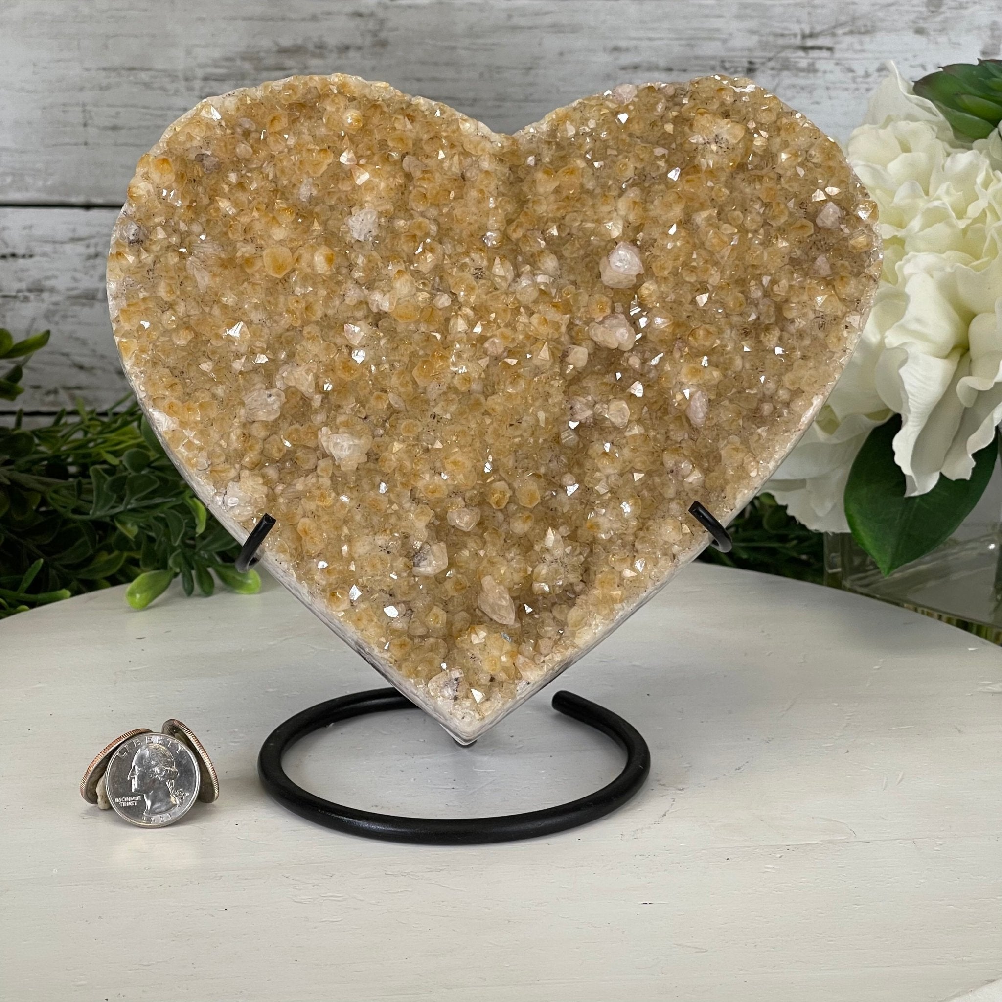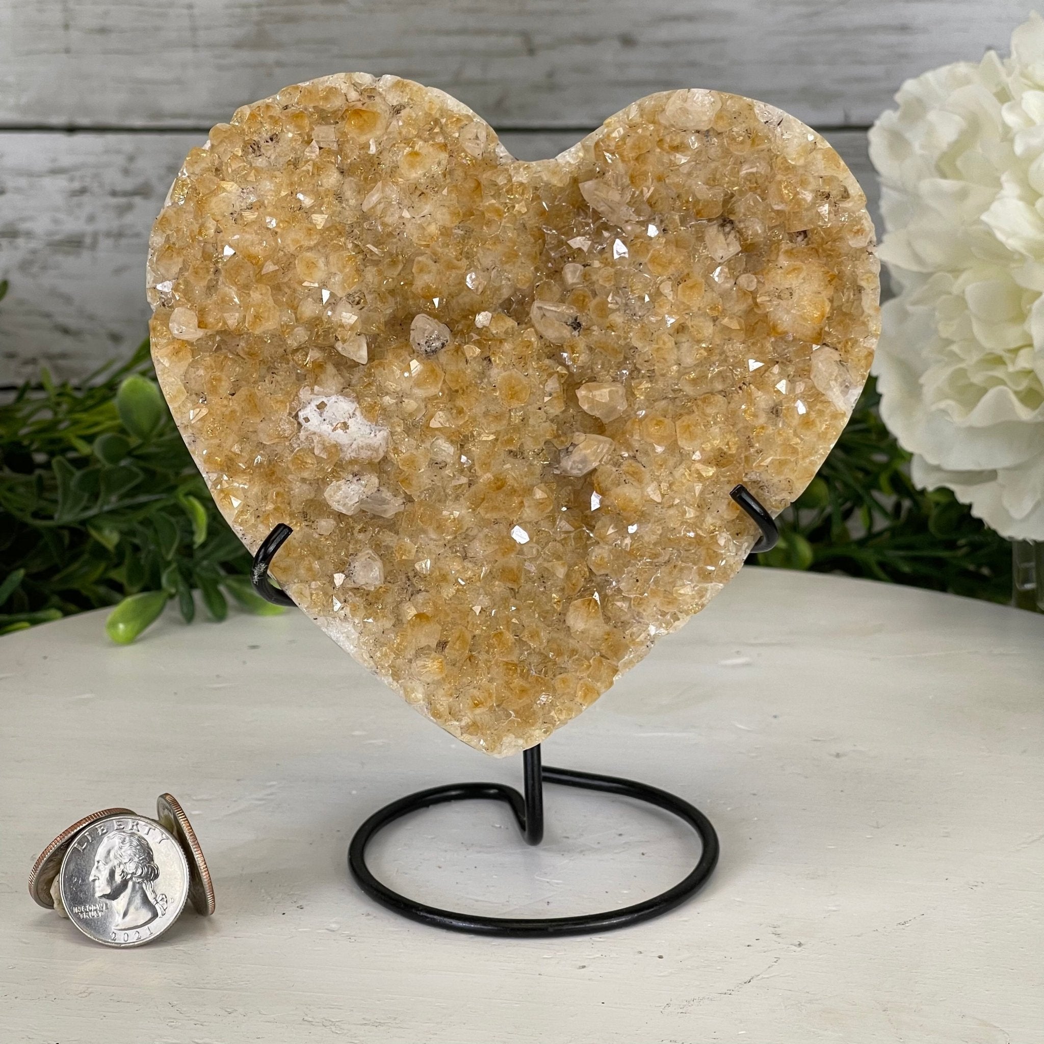 Quality Heart-Shaped Citrine Geodes on a metal or acrylic stand. Beautiful gemstones with polished edges and natural rough stone on its backside.