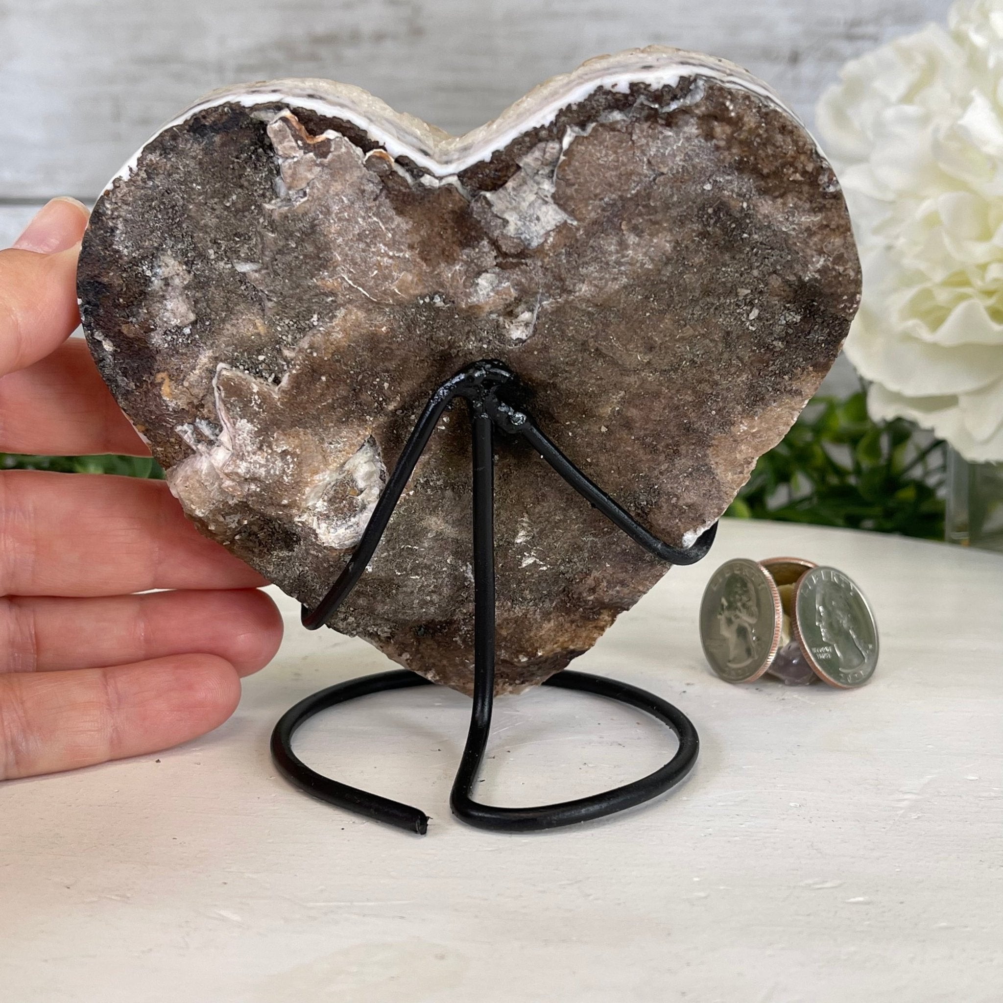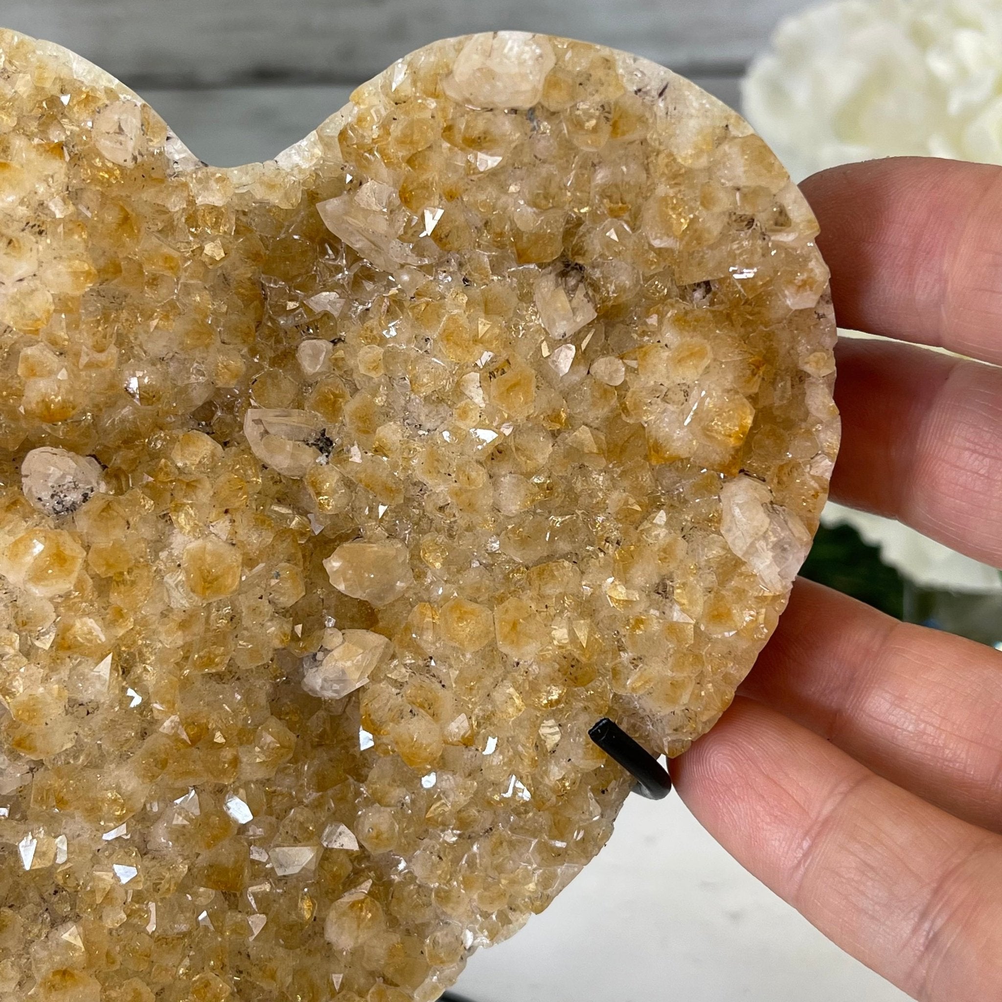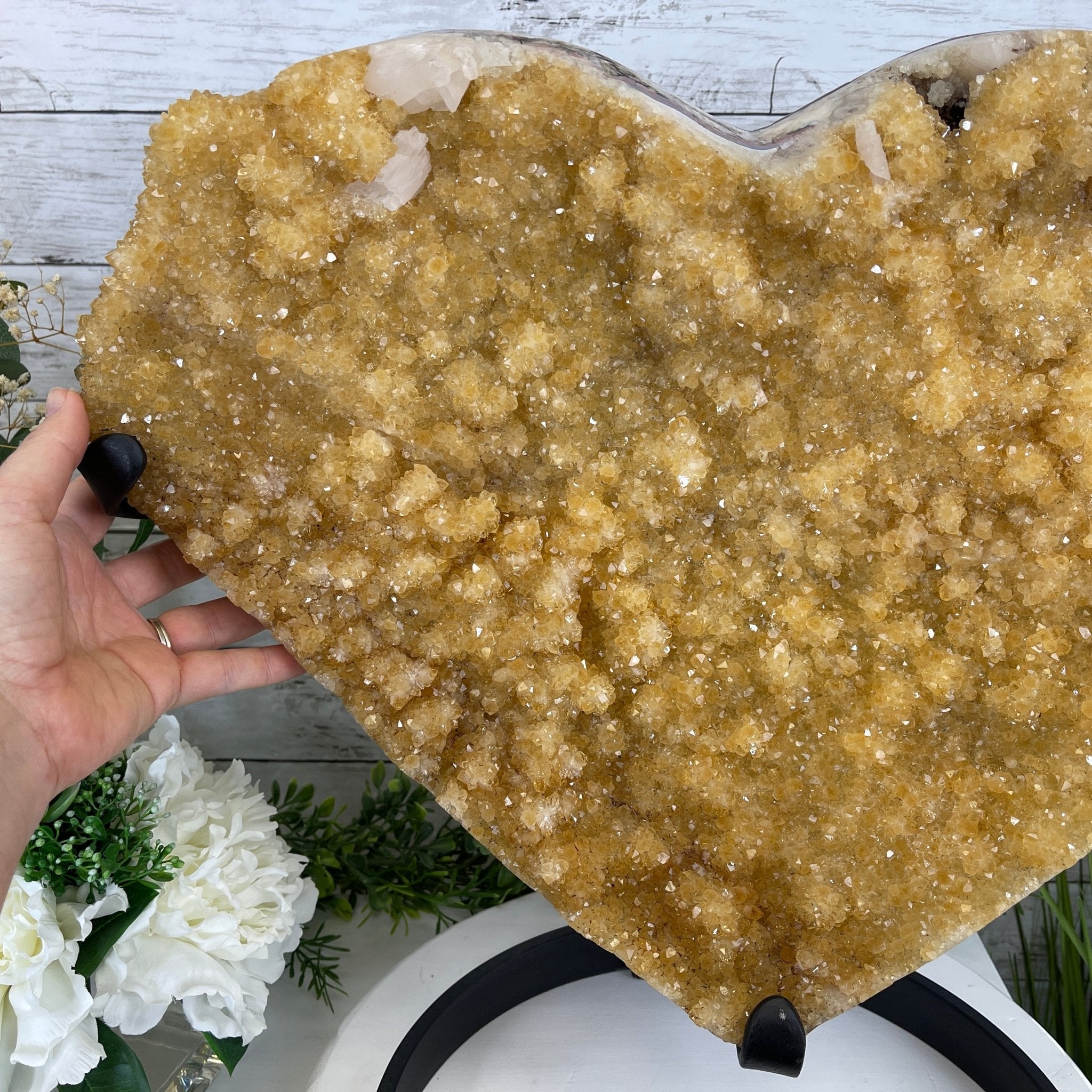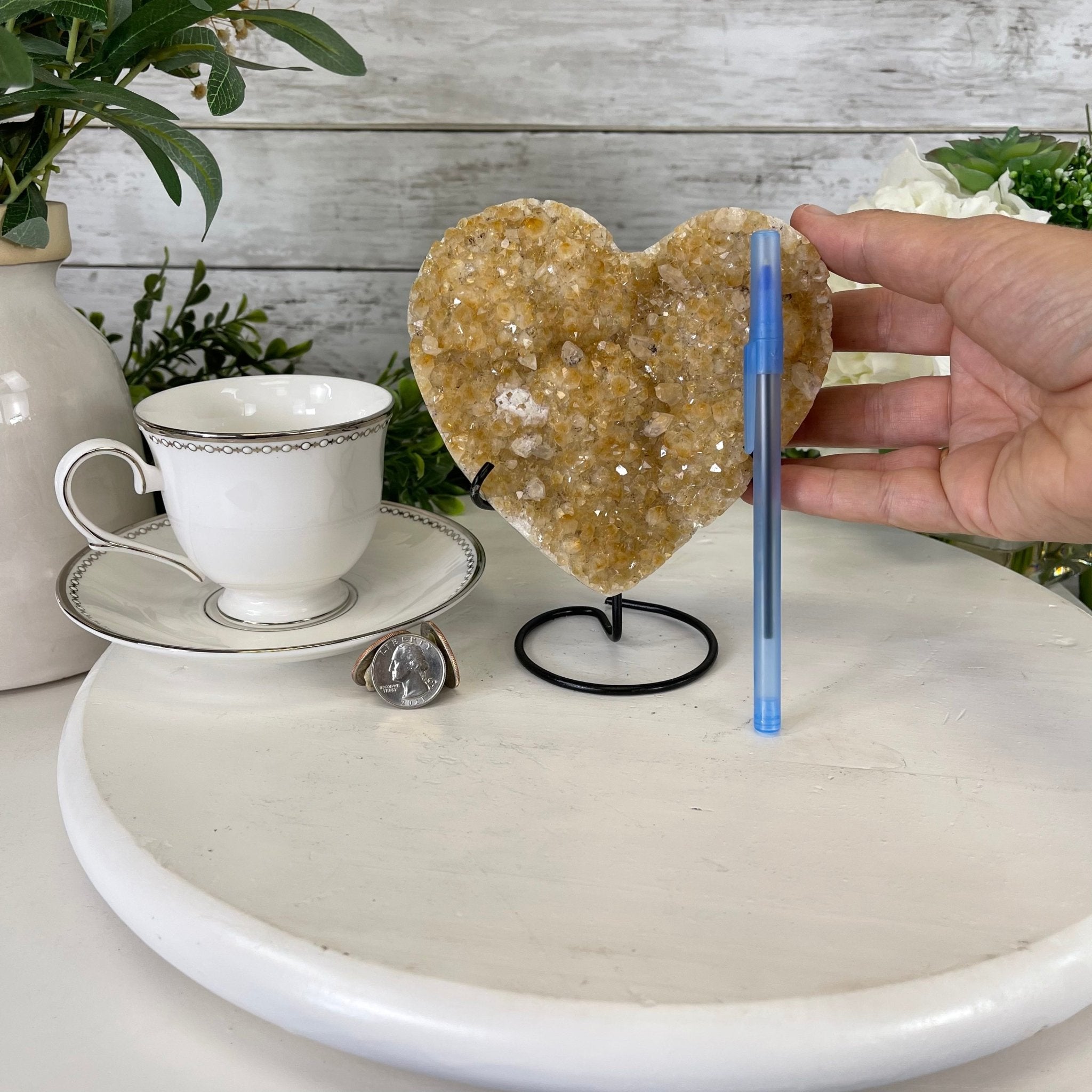 Quality Heart-Shaped Citrine Geodes on a metal or acrylic stand. Beautiful gemstones with polished edges and natural rough stone on its backside.