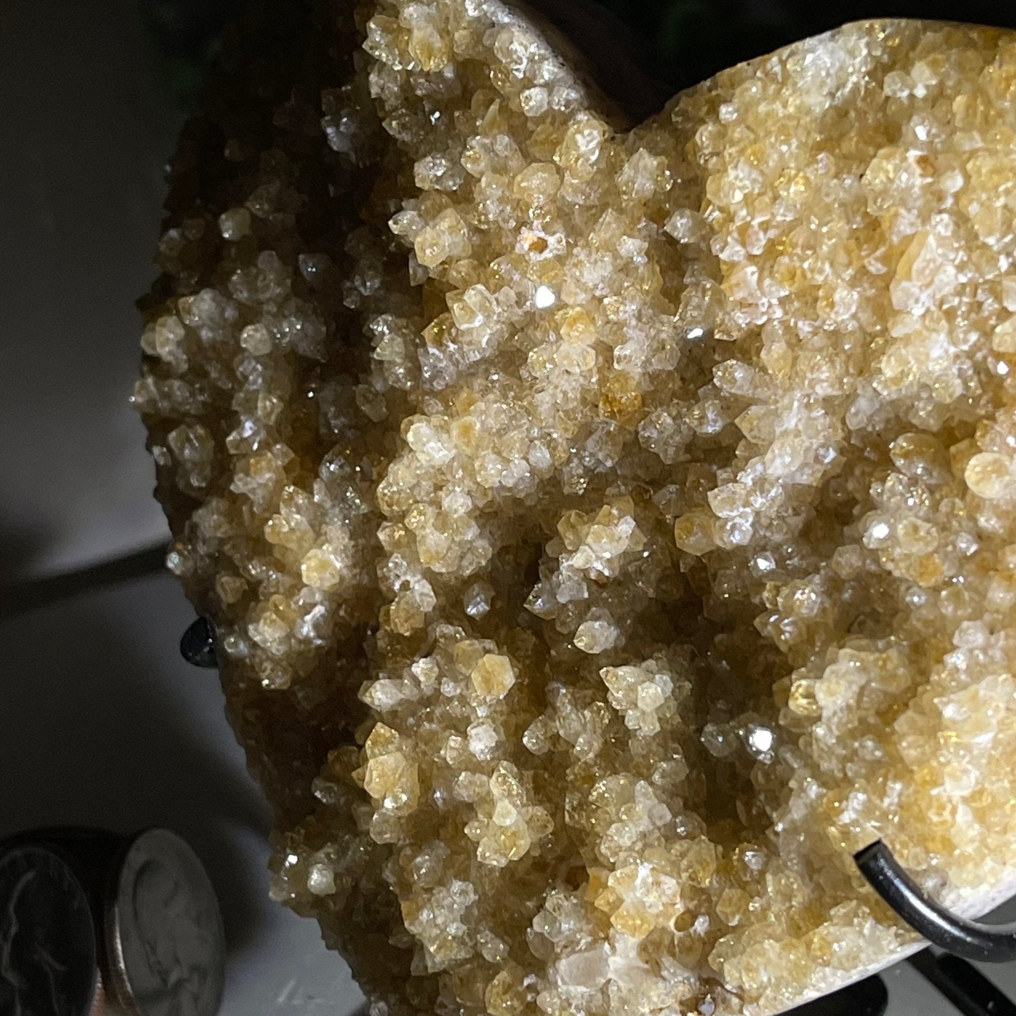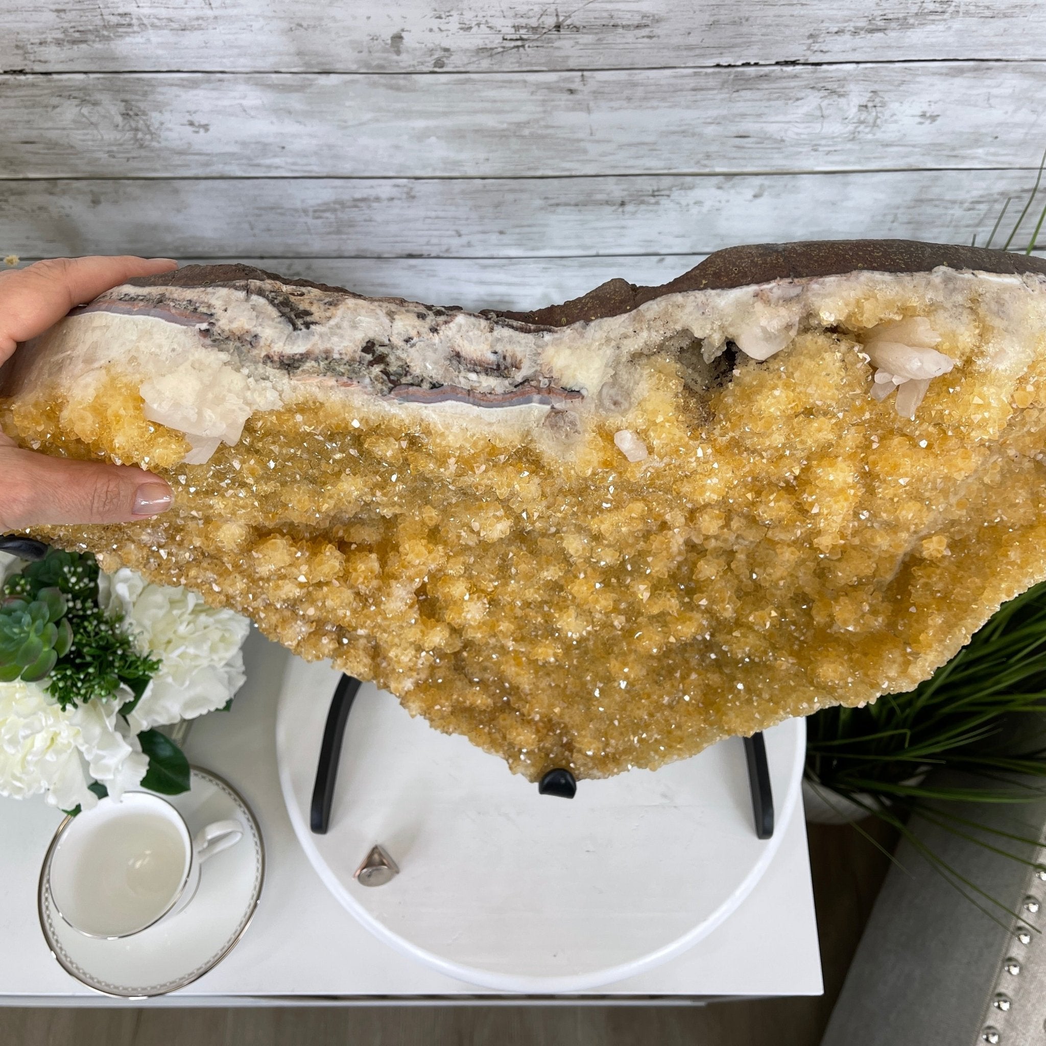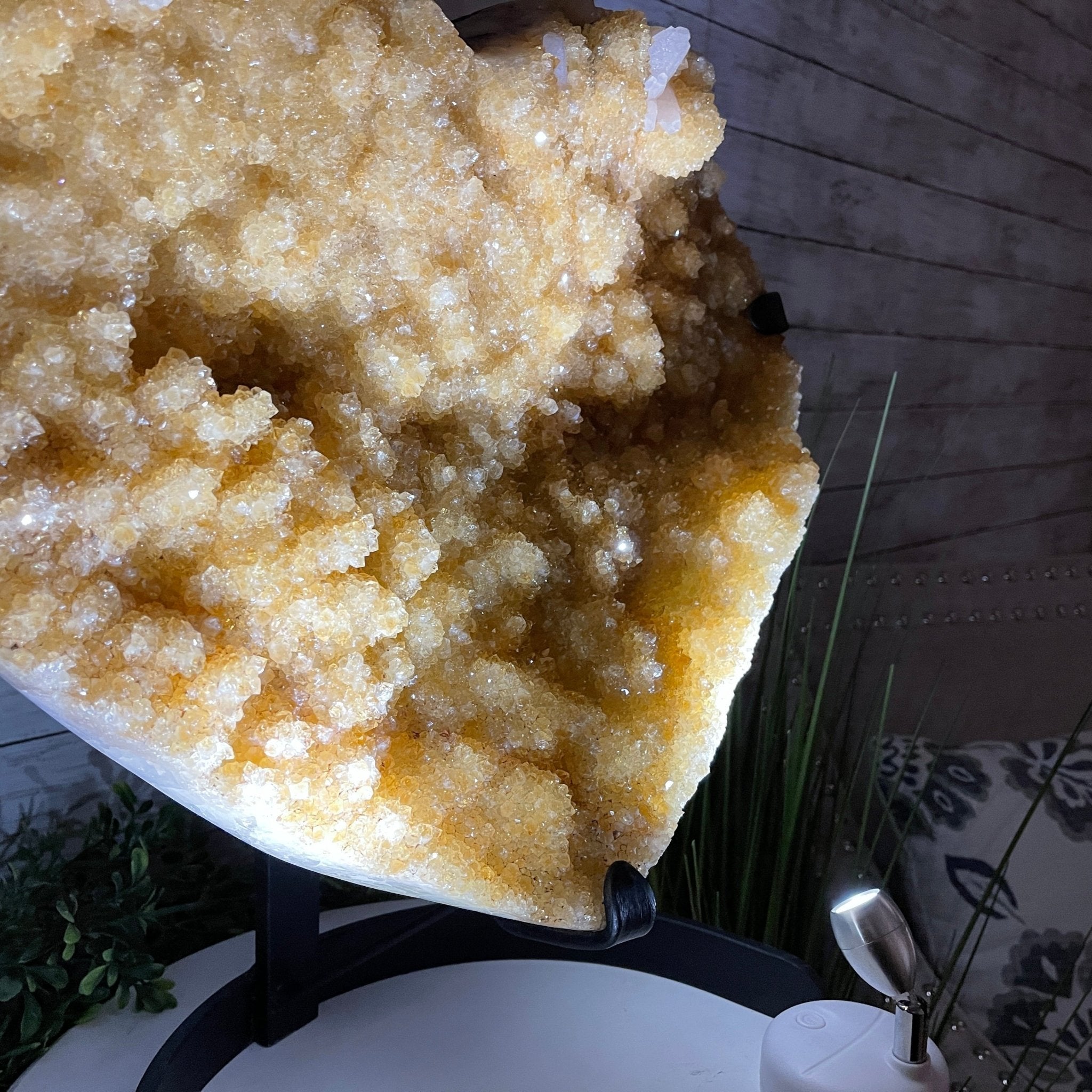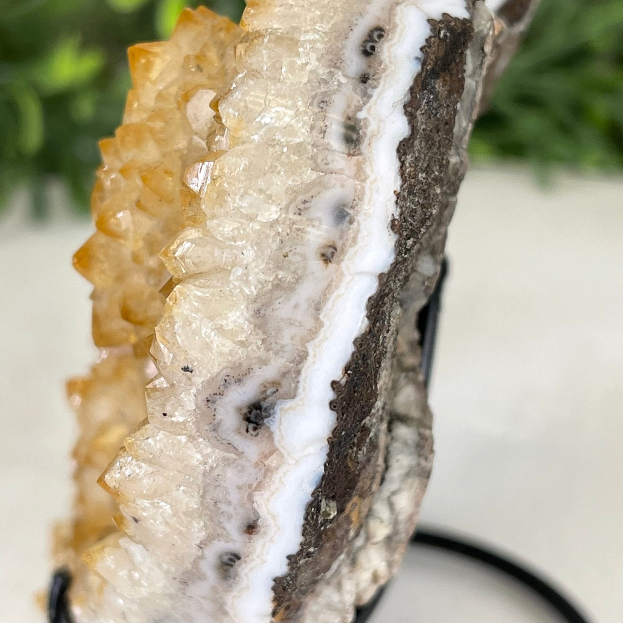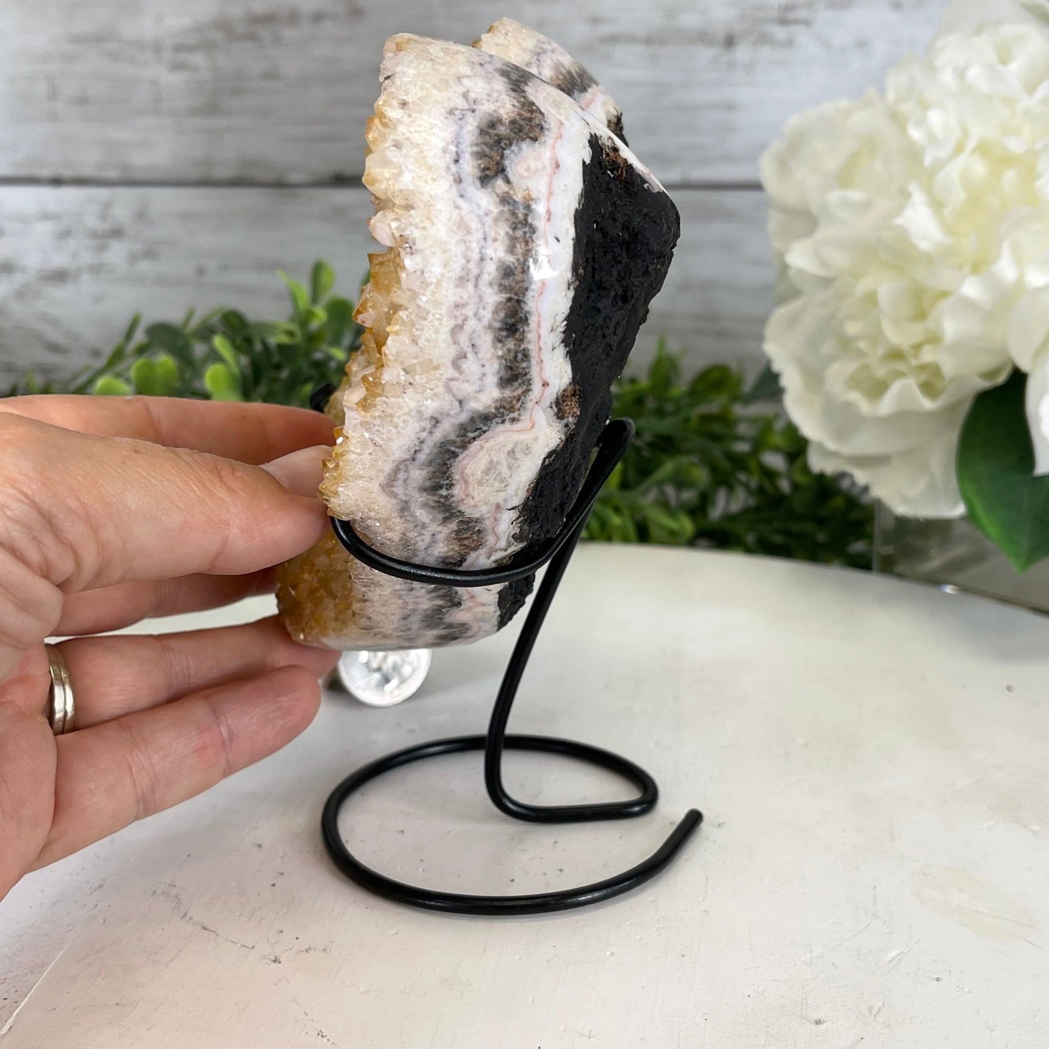 Quality Heart-Shaped Citrine Geodes on a metal or acrylic stand. Beautiful gemstones with polished edges and natural rough stone on its backside.