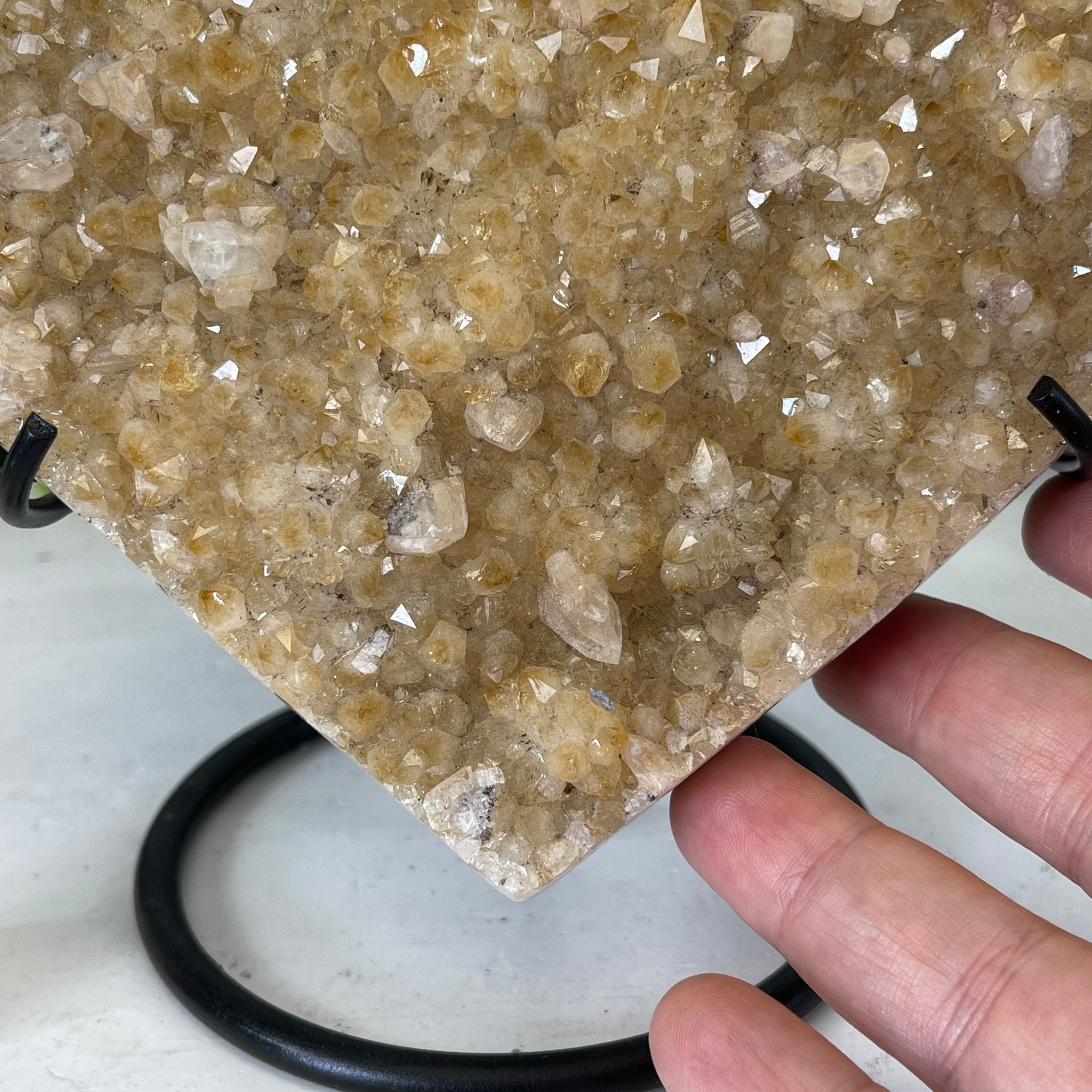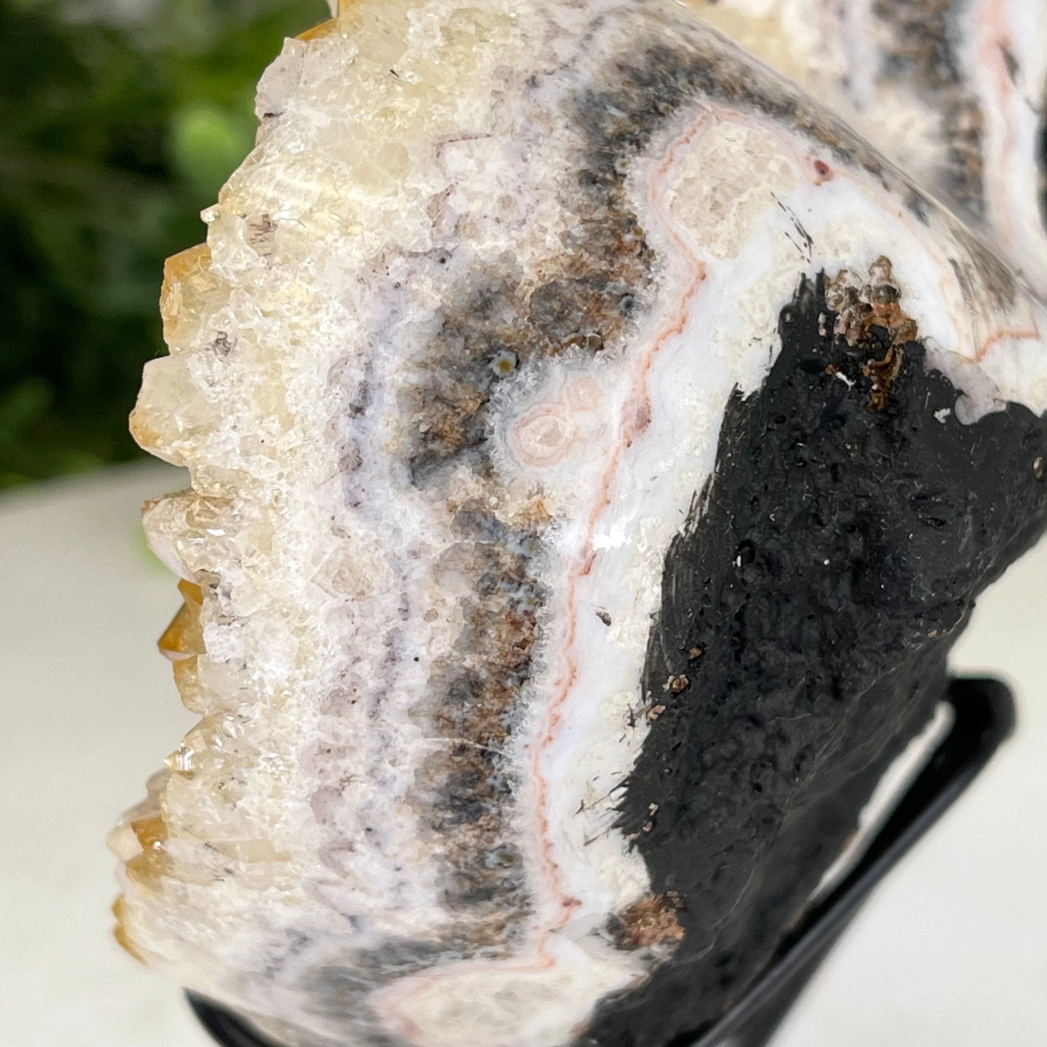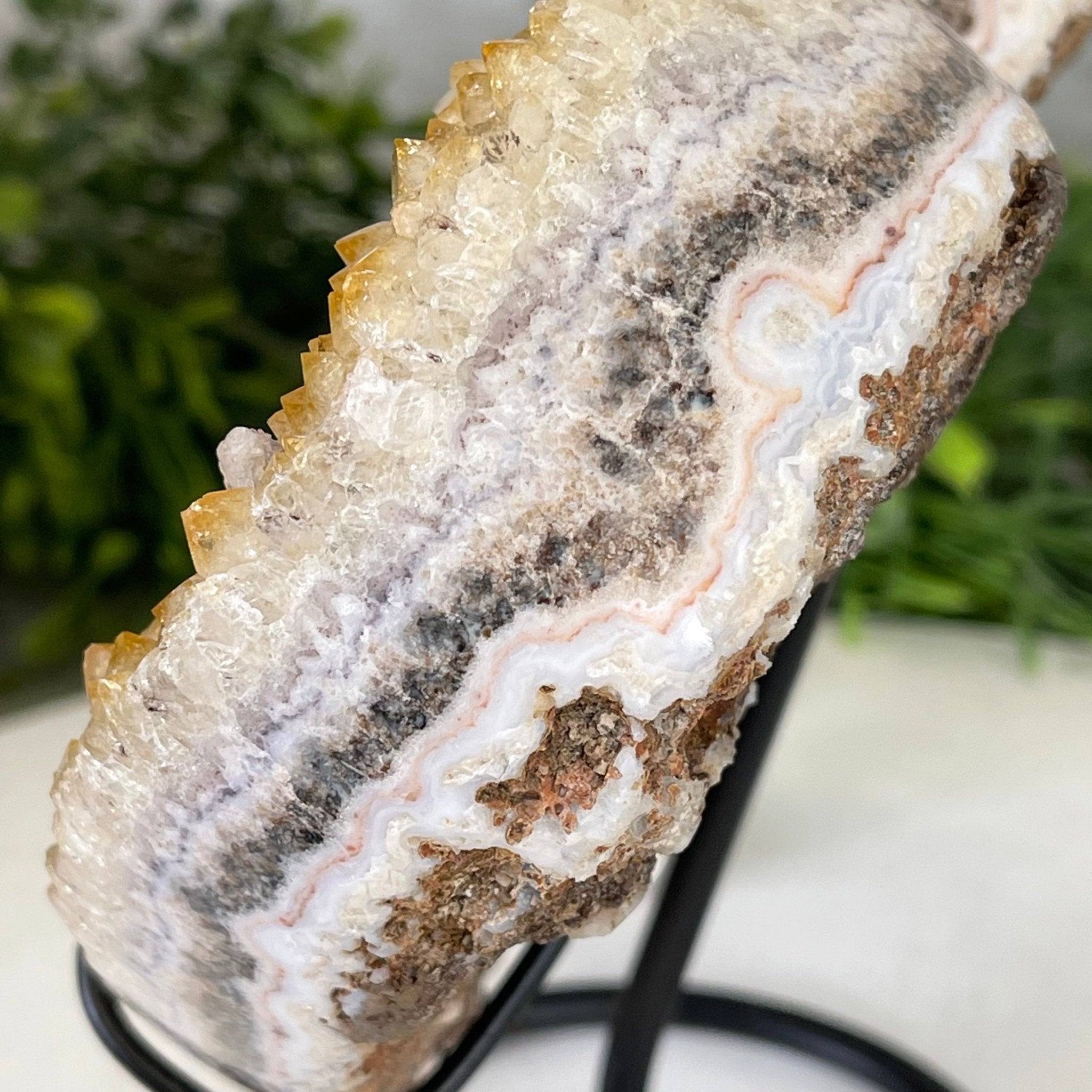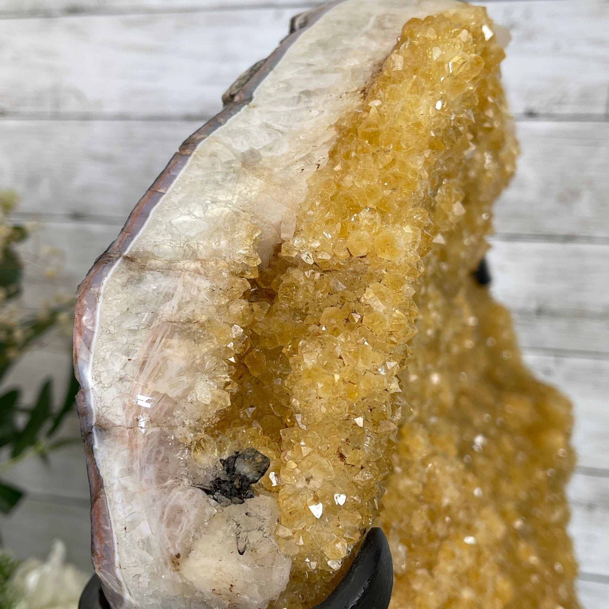 Quality Heart-Shaped Citrine Geodes on a metal or acrylic stand. Beautiful gemstones with polished edges and natural rough stone on its backside.