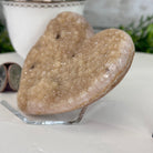 Extra Quality Heart-Shaped Citrine Geode on a clear acrylic stand. This delicate gemstone has polished edges and the backside is its own natural stone.