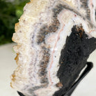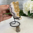 Standard Plus Quality Heart-Shaped Citrine Geode on a black metal stand. With polished edges, this citrine geode has vibrant amber colors and nicely shaped crystal points.