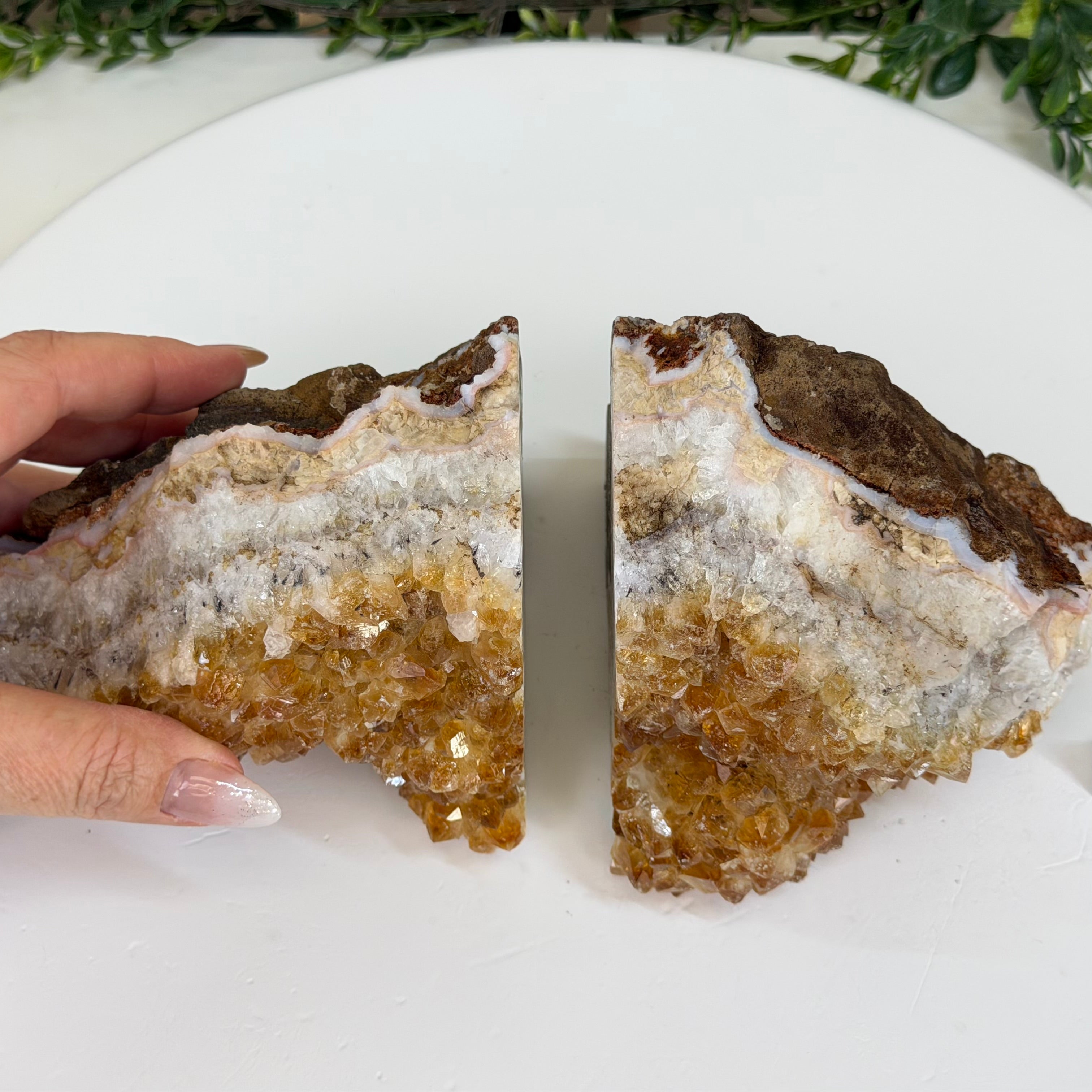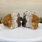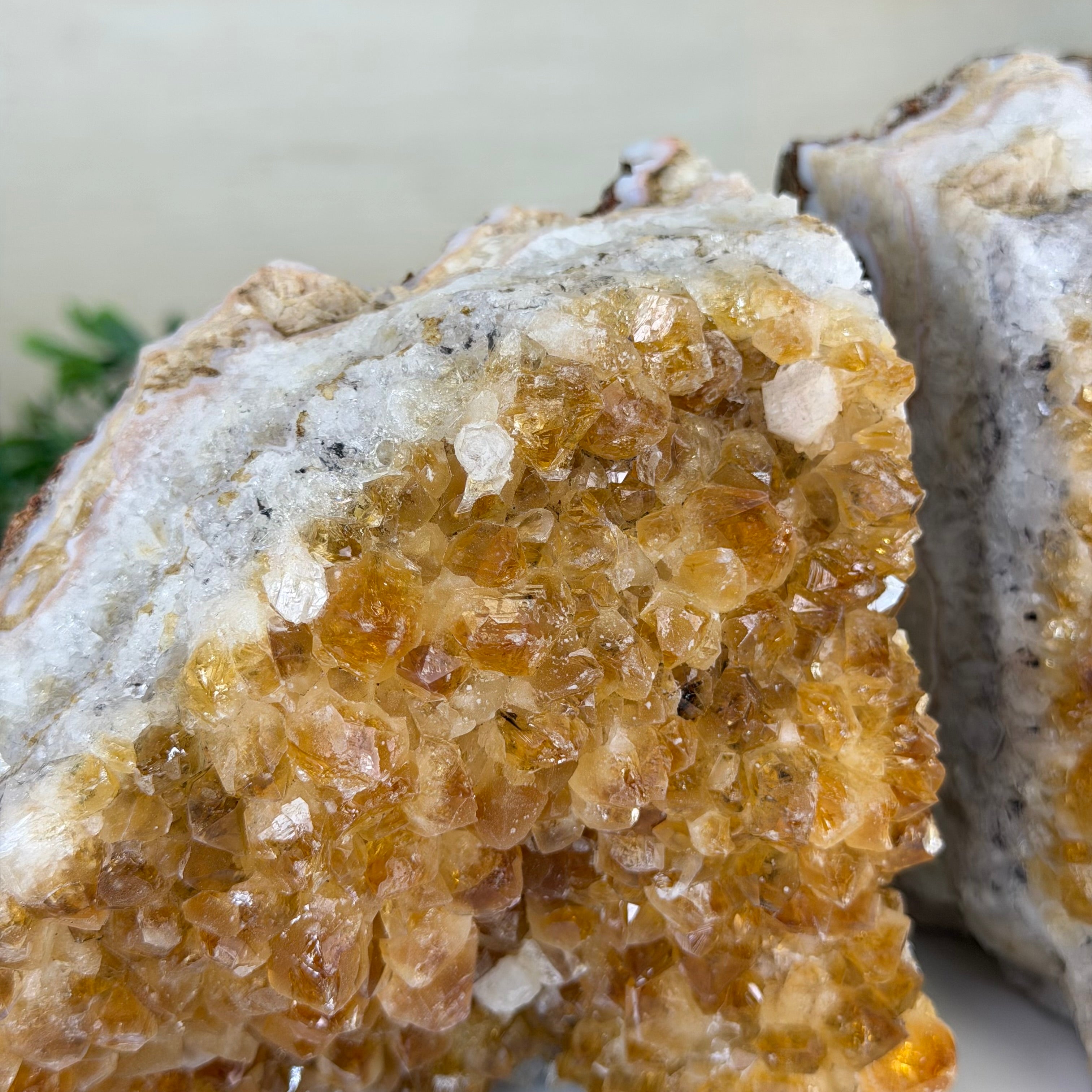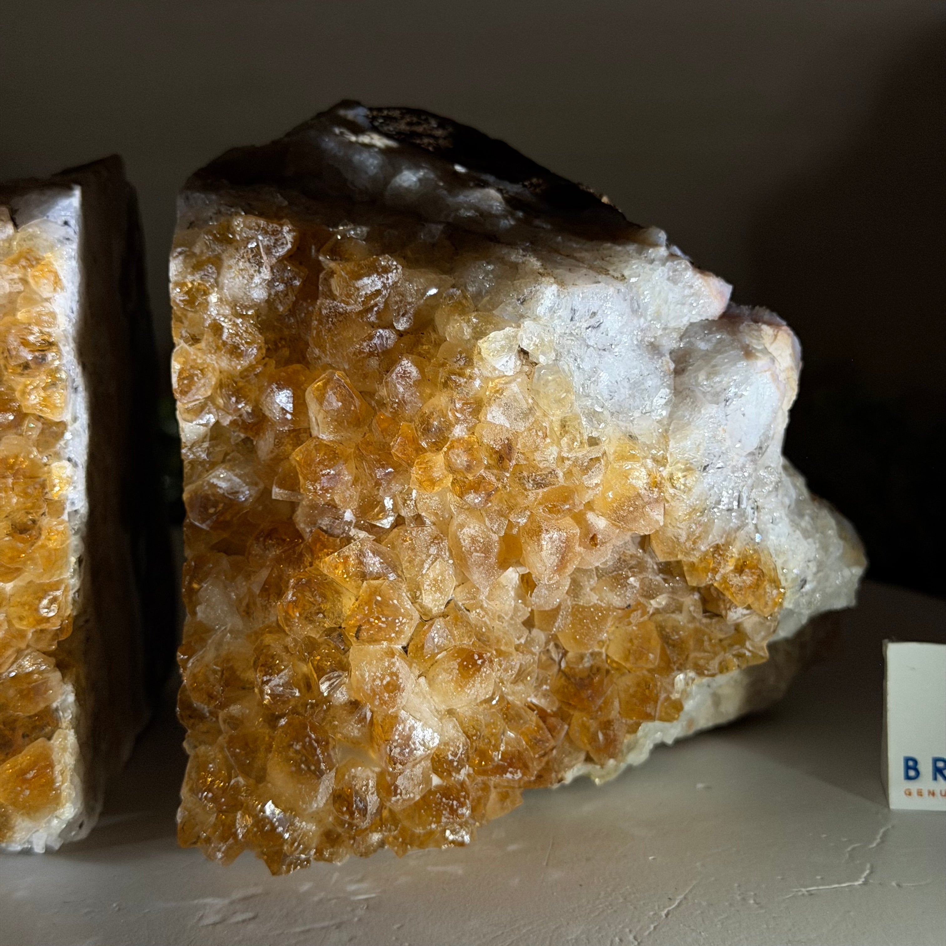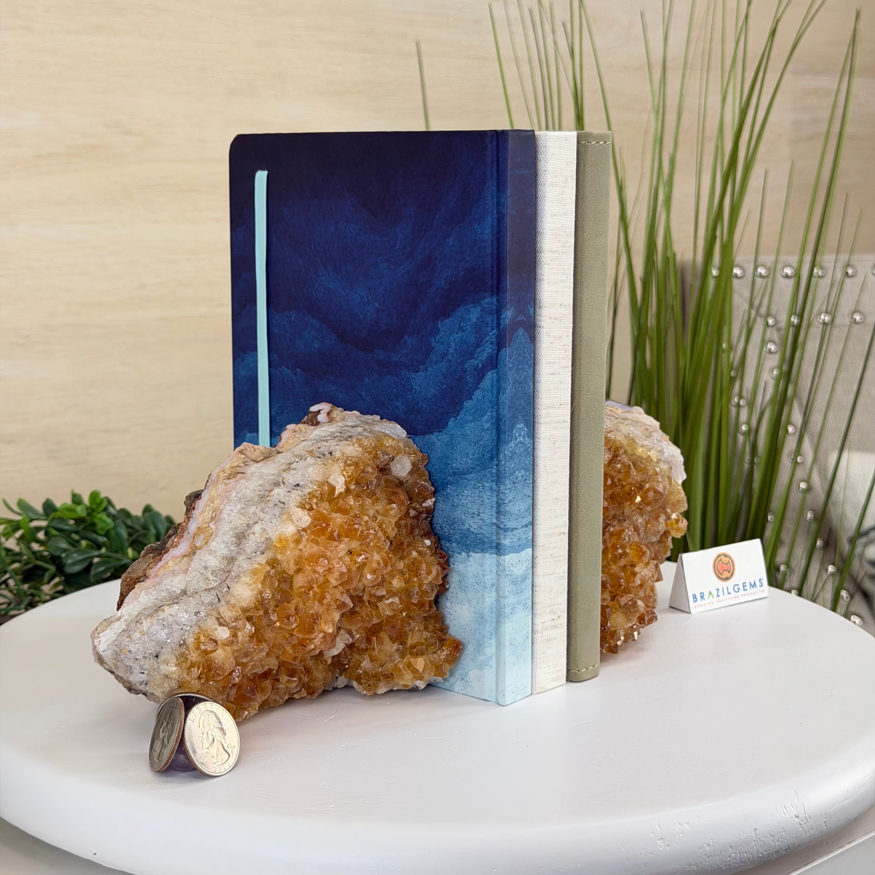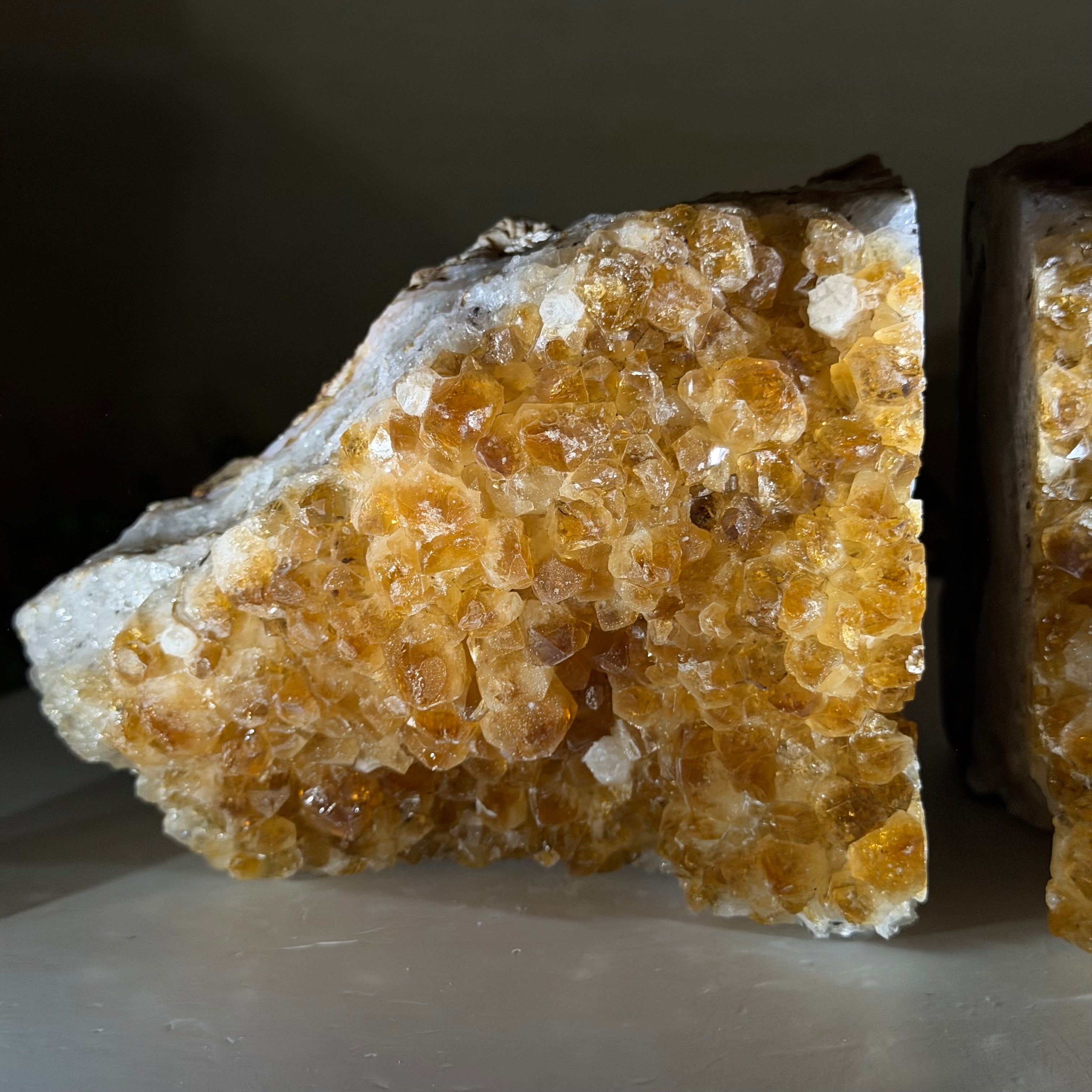 Formed from Brazilian Citrine geode pieces, these Citrine Crystal bookends showcase sparkling drusy points across the front, with interior sides and bases polished smooth for balance and stability. Each pair reveals citrine’s warm amber and golden hues, blending raw crystal radiance with refined craftsmanship. As is the case for the majority of Citrine on the market from Brazil, this Citrine has been heated to give it its beautiful amber color.