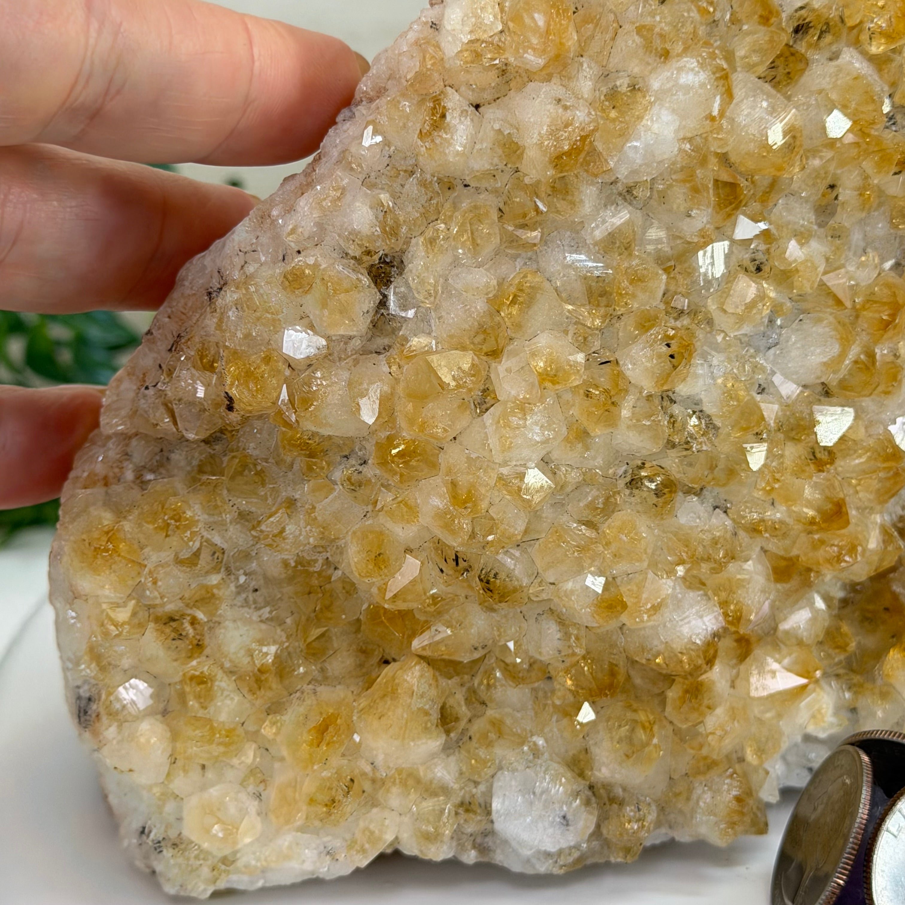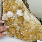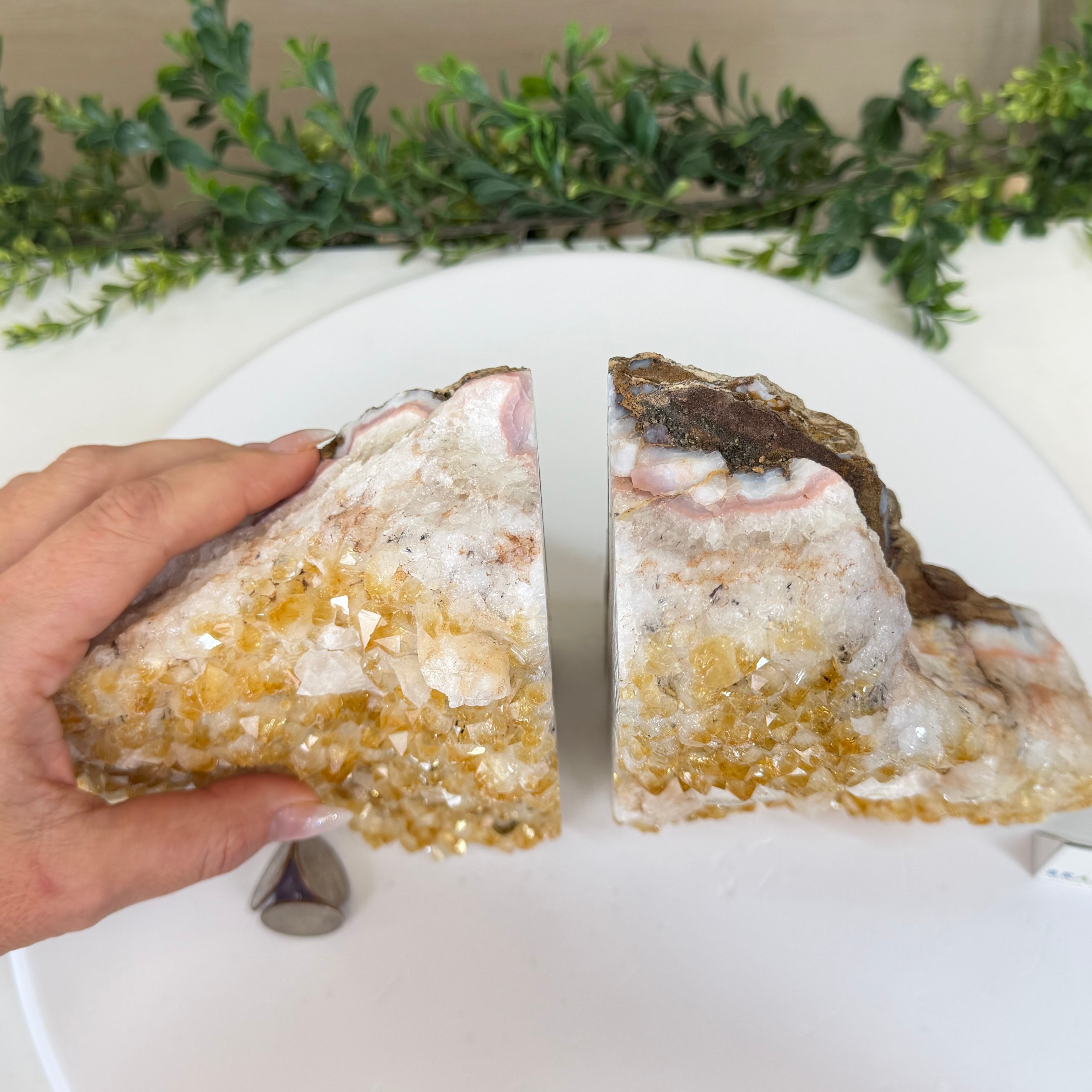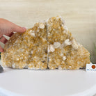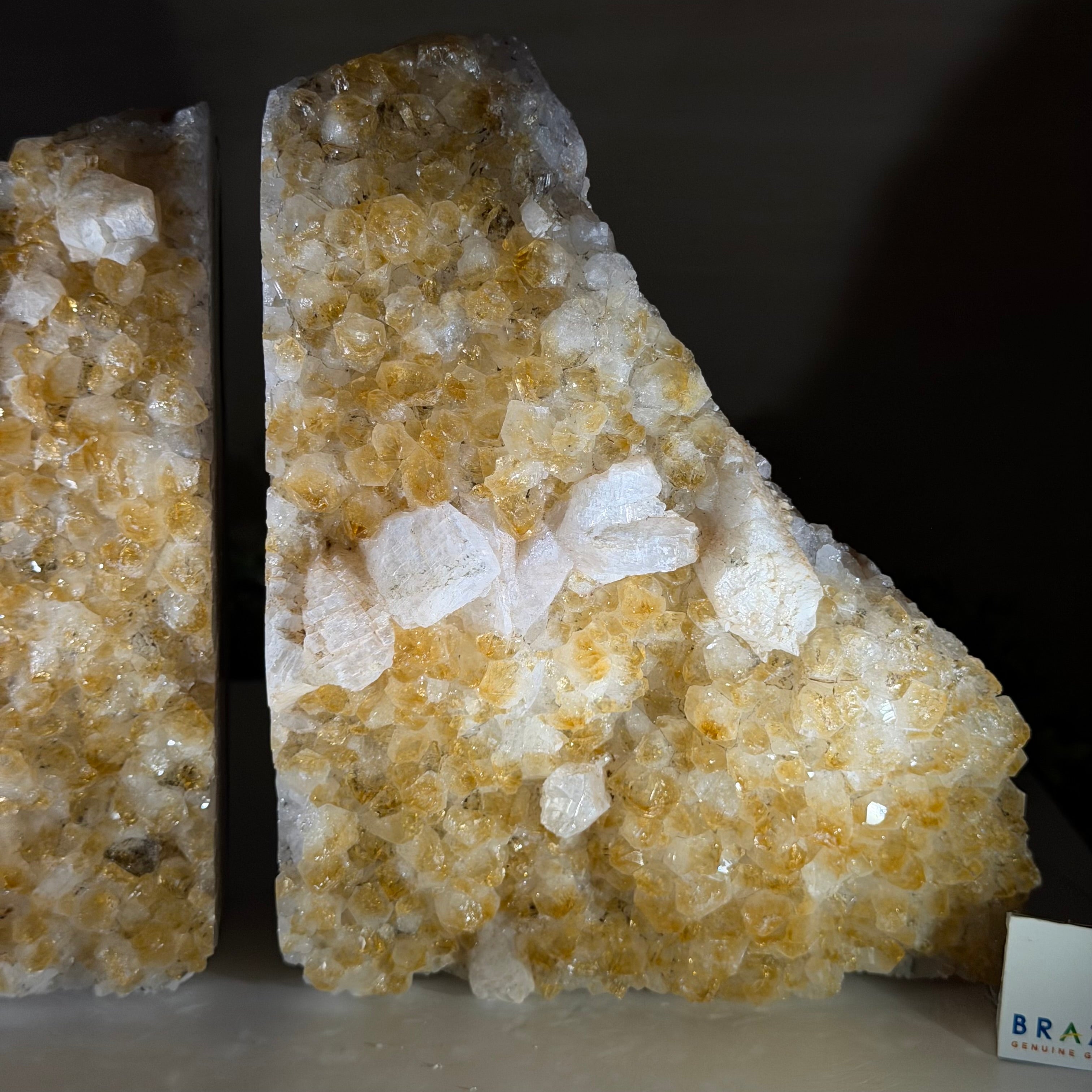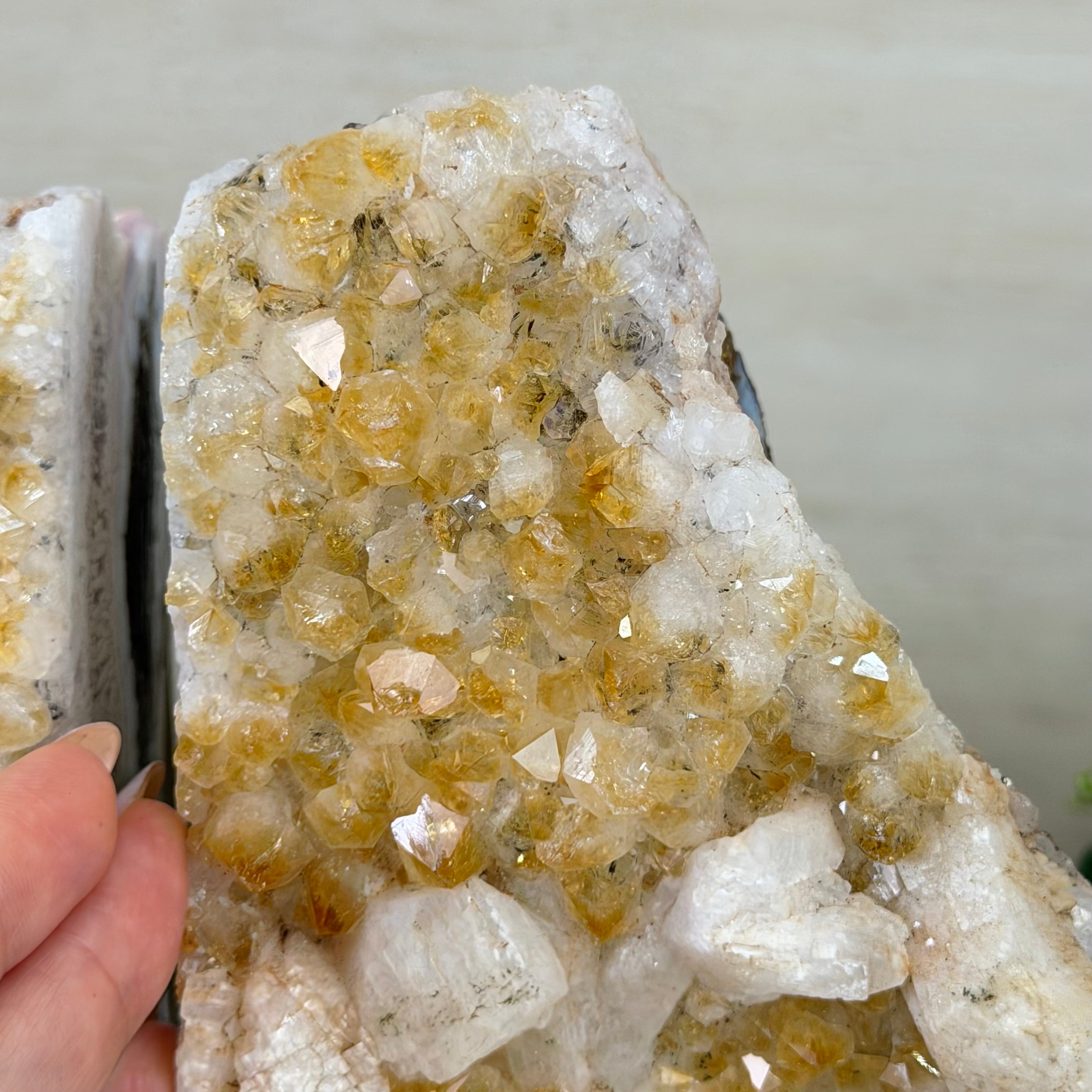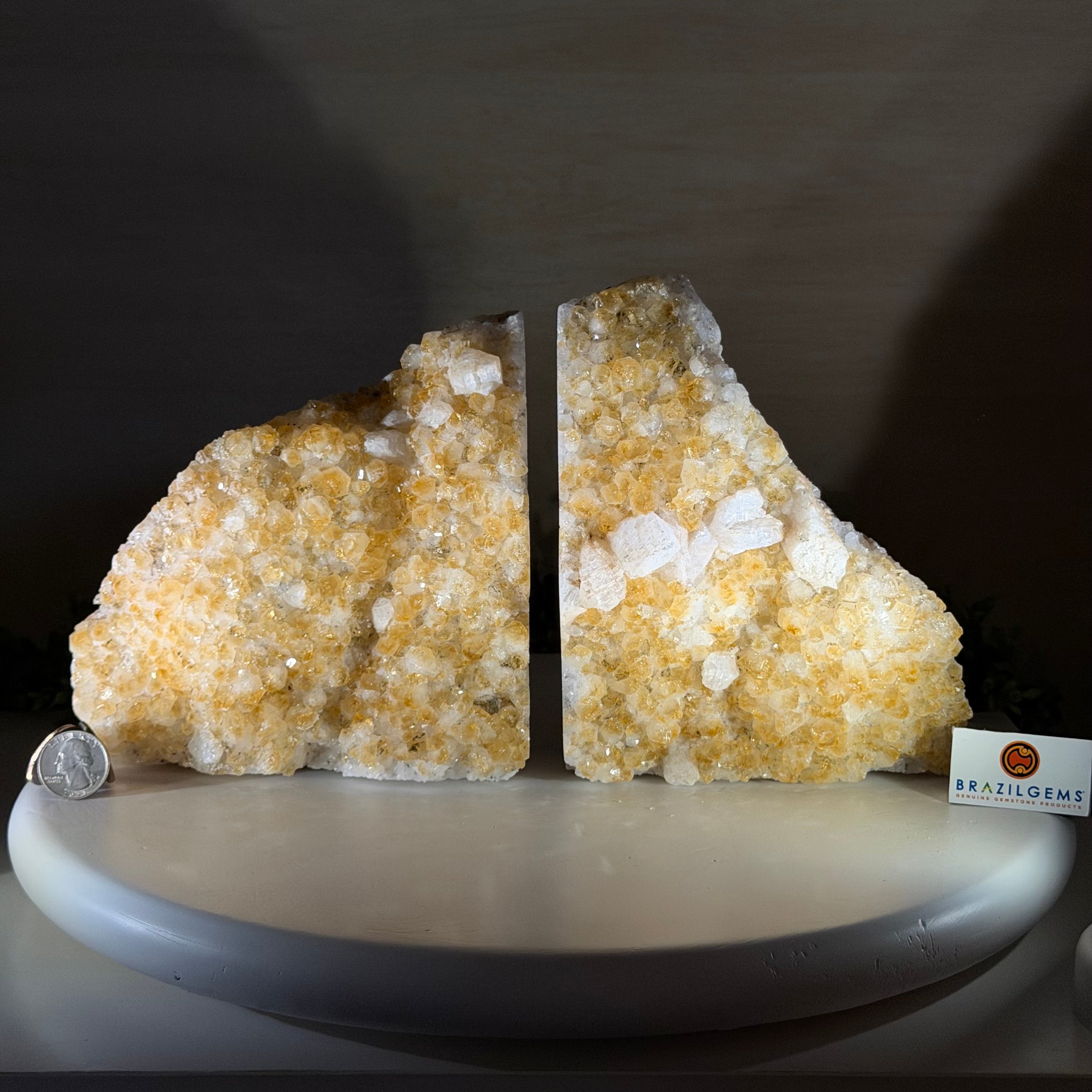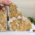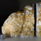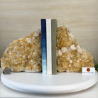 Formed from Brazilian Citrine geode pieces, these Citrine Crystal bookends showcase sparkling drusy points across the front, with interior sides and bases polished smooth for balance and stability. Each pair reveals citrine’s warm amber and golden hues, blending raw crystal radiance with refined craftsmanship. As is the case for the majority of Citrine on the market from Brazil, this Citrine has been heated to give it its beautiful amber color.