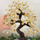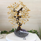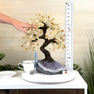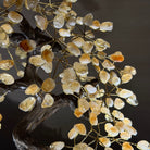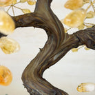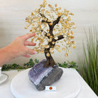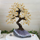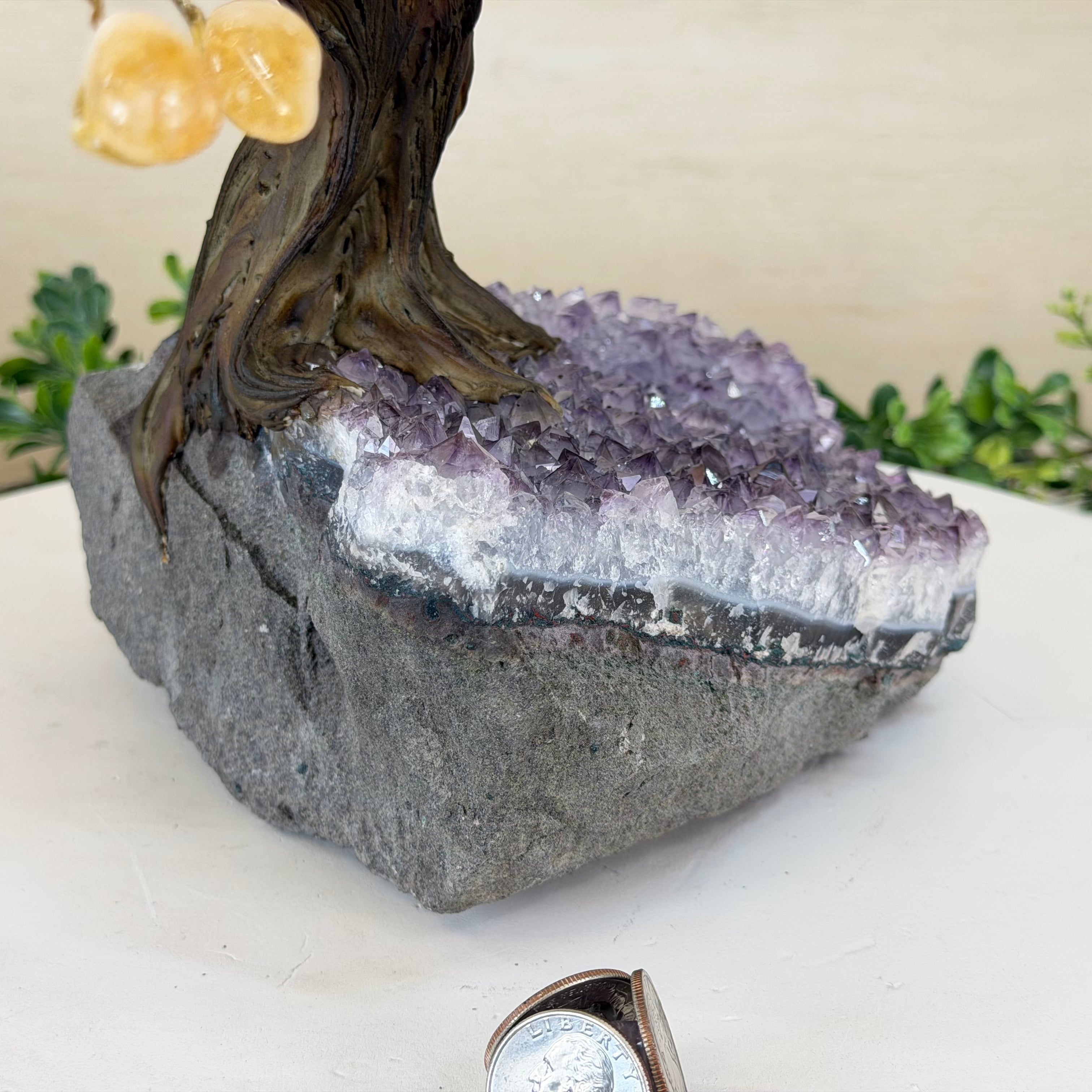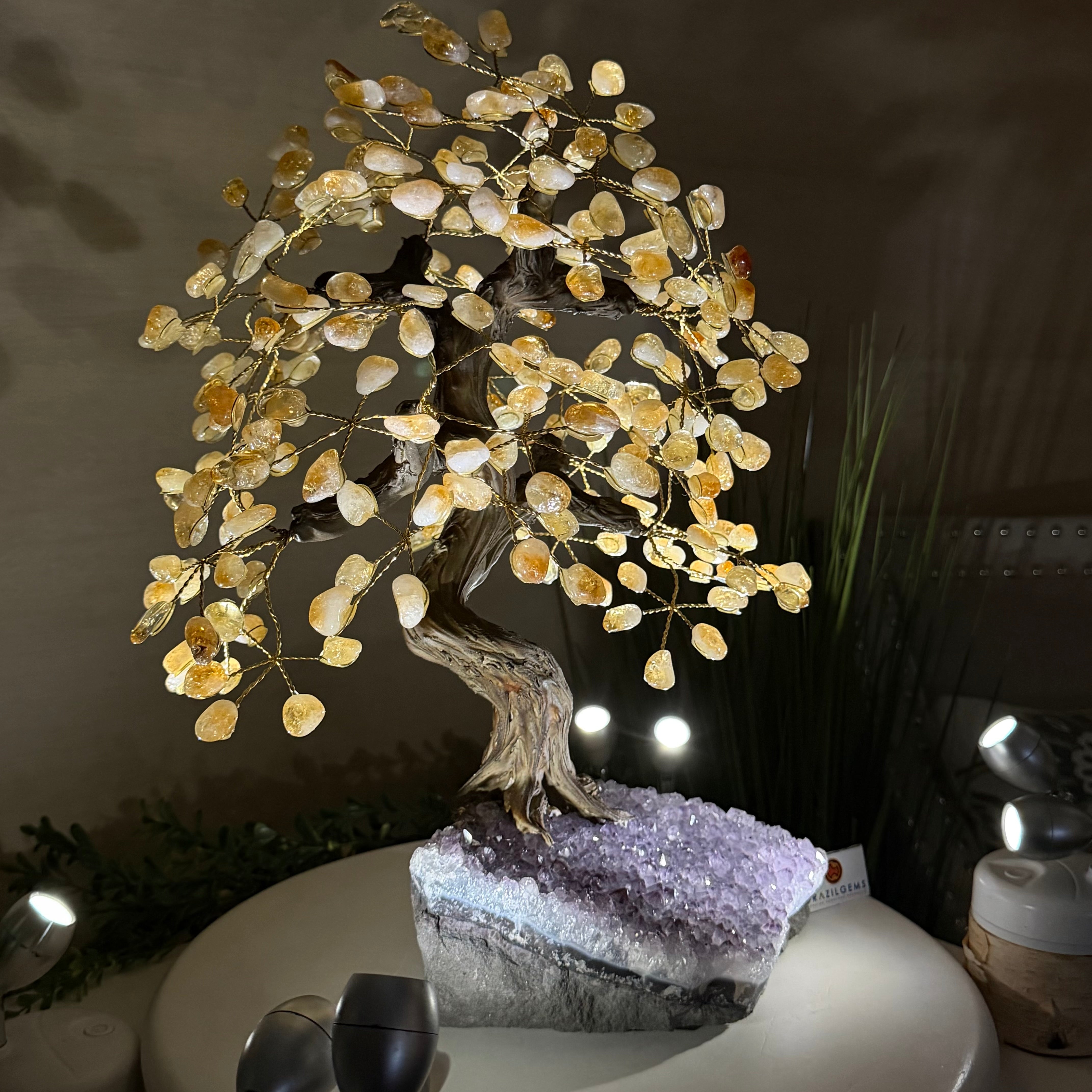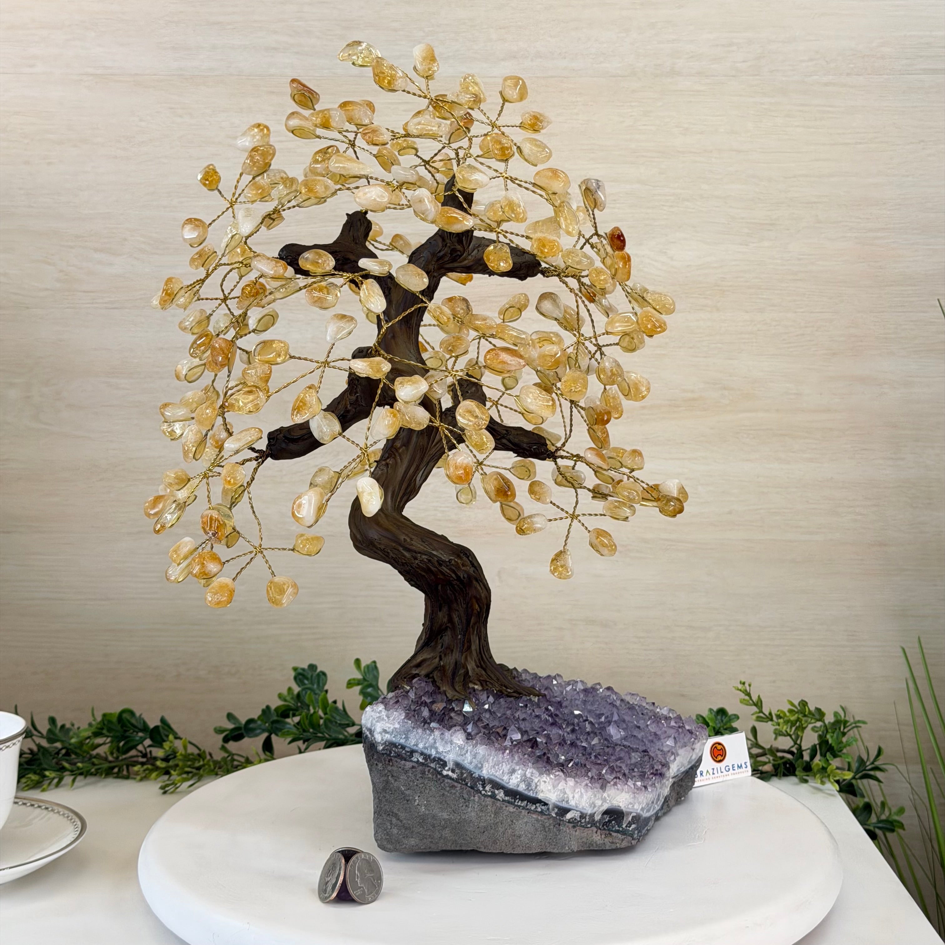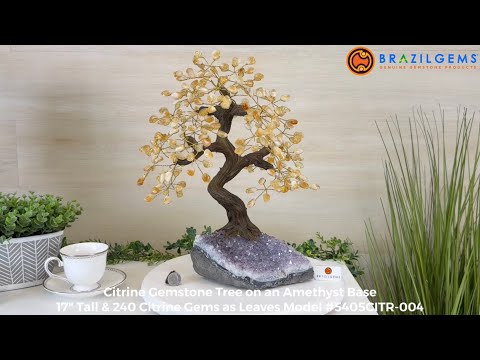 Citrine Bonsai Gemstone Tree on an Amethyst Cluster Base Handcrafted in Brazil, this striking gemstone tree stands approximately 17" tall and features a sturdy bonsai-style trunk and branches adorned with 240 tumbled Citrine gemstones as its leaves.