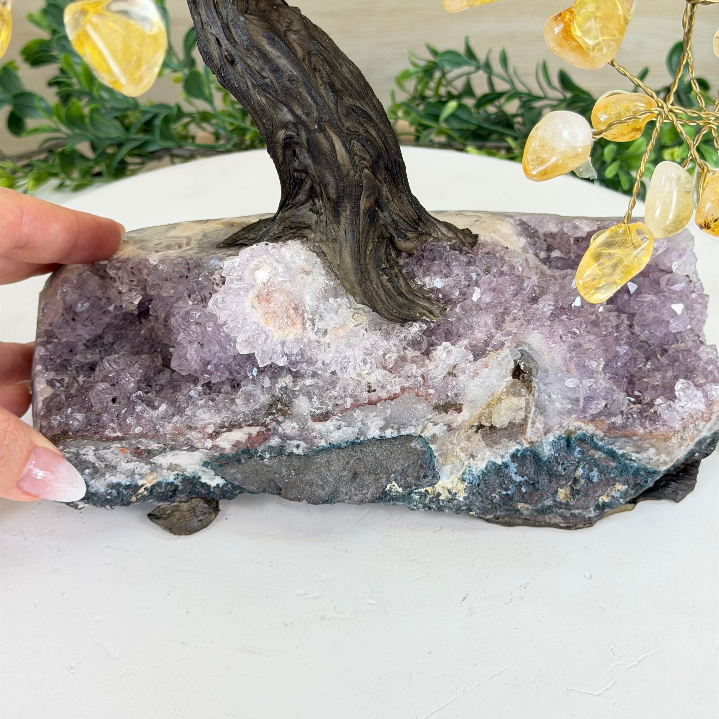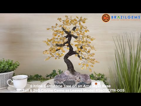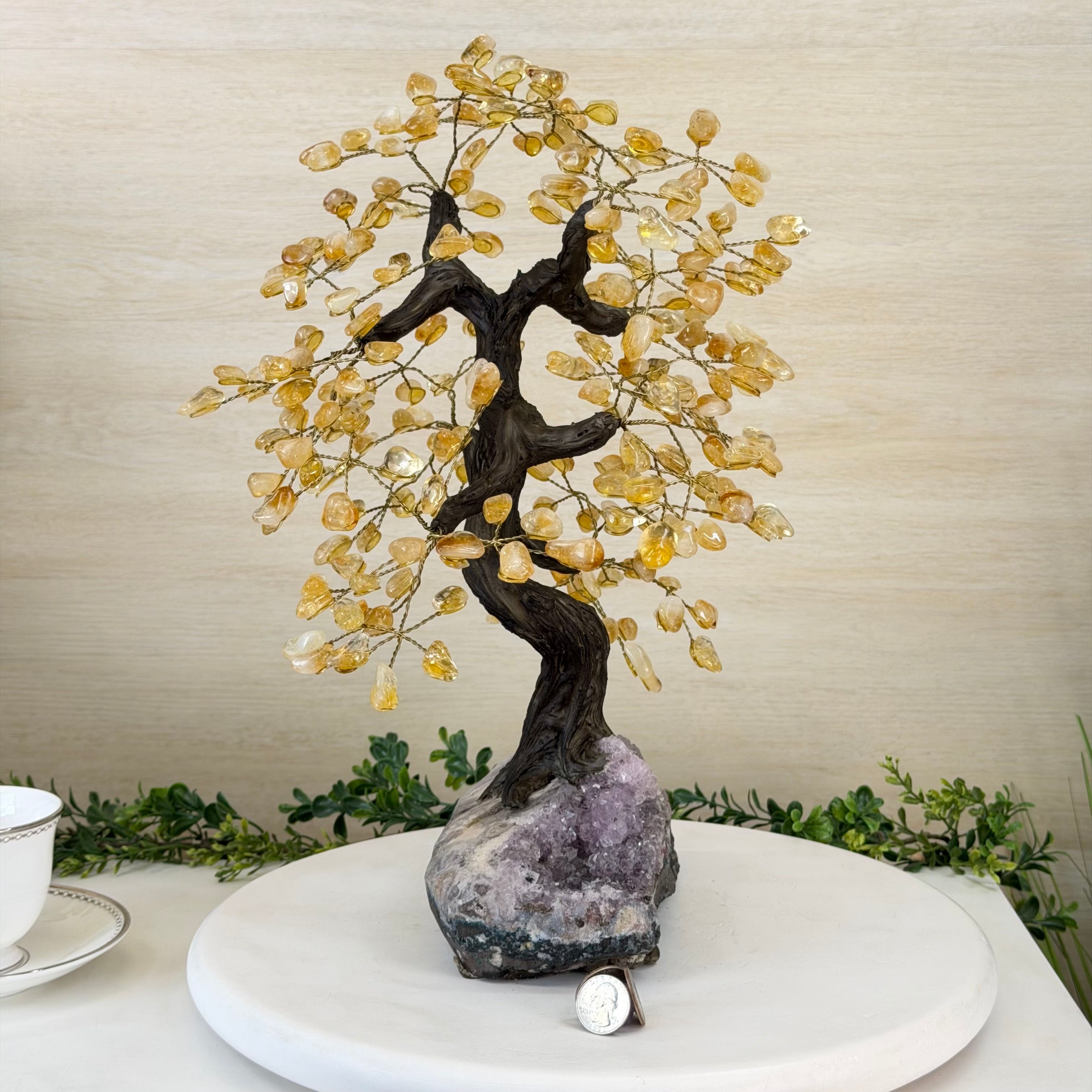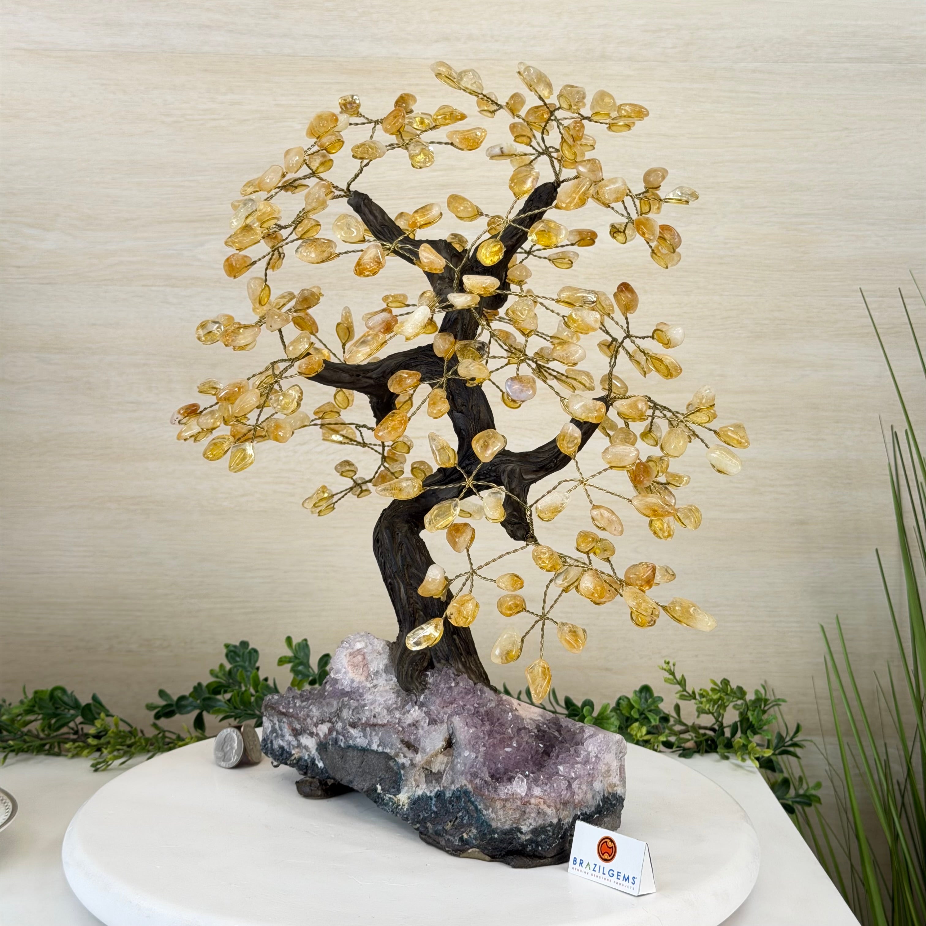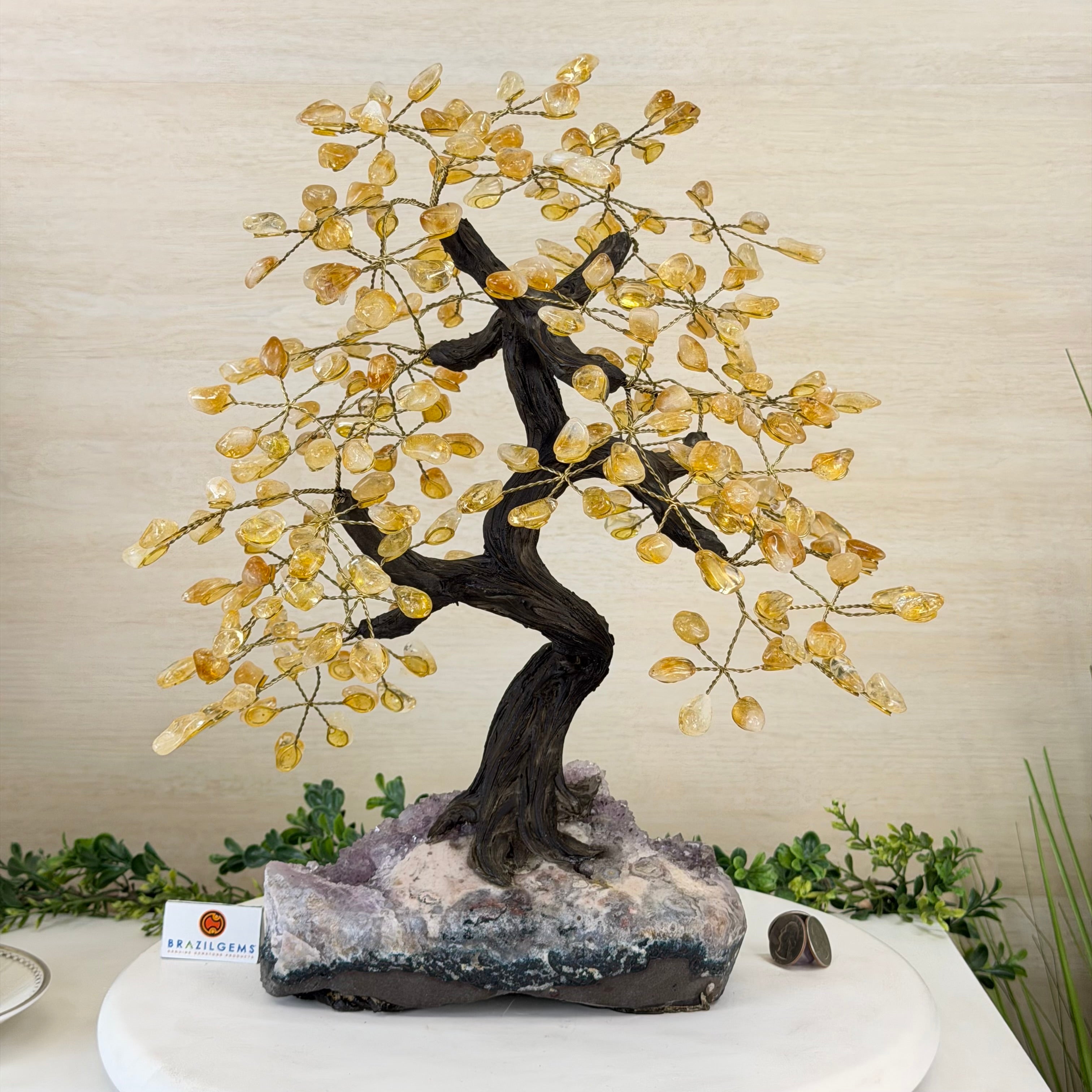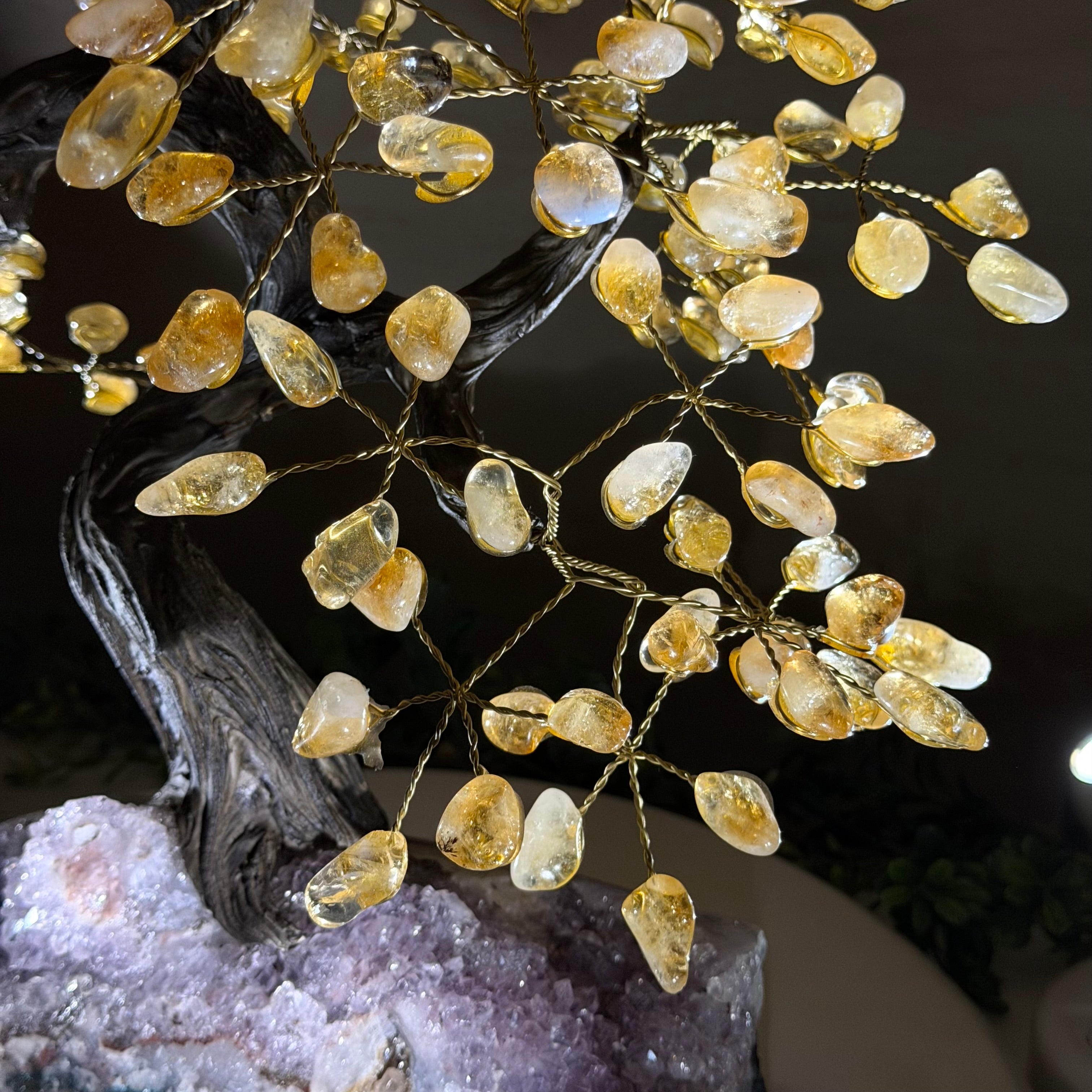 Citrine Bonsai Gemstone Tree on an Amethyst Cluster Base Handcrafted in Brazil, this striking gemstone tree stands approximately 17" tall and features a sturdy bonsai-style trunk and branches adorned with 240 tumbled Citrine gemstones as its leaves.
