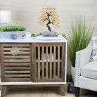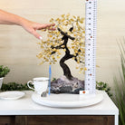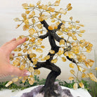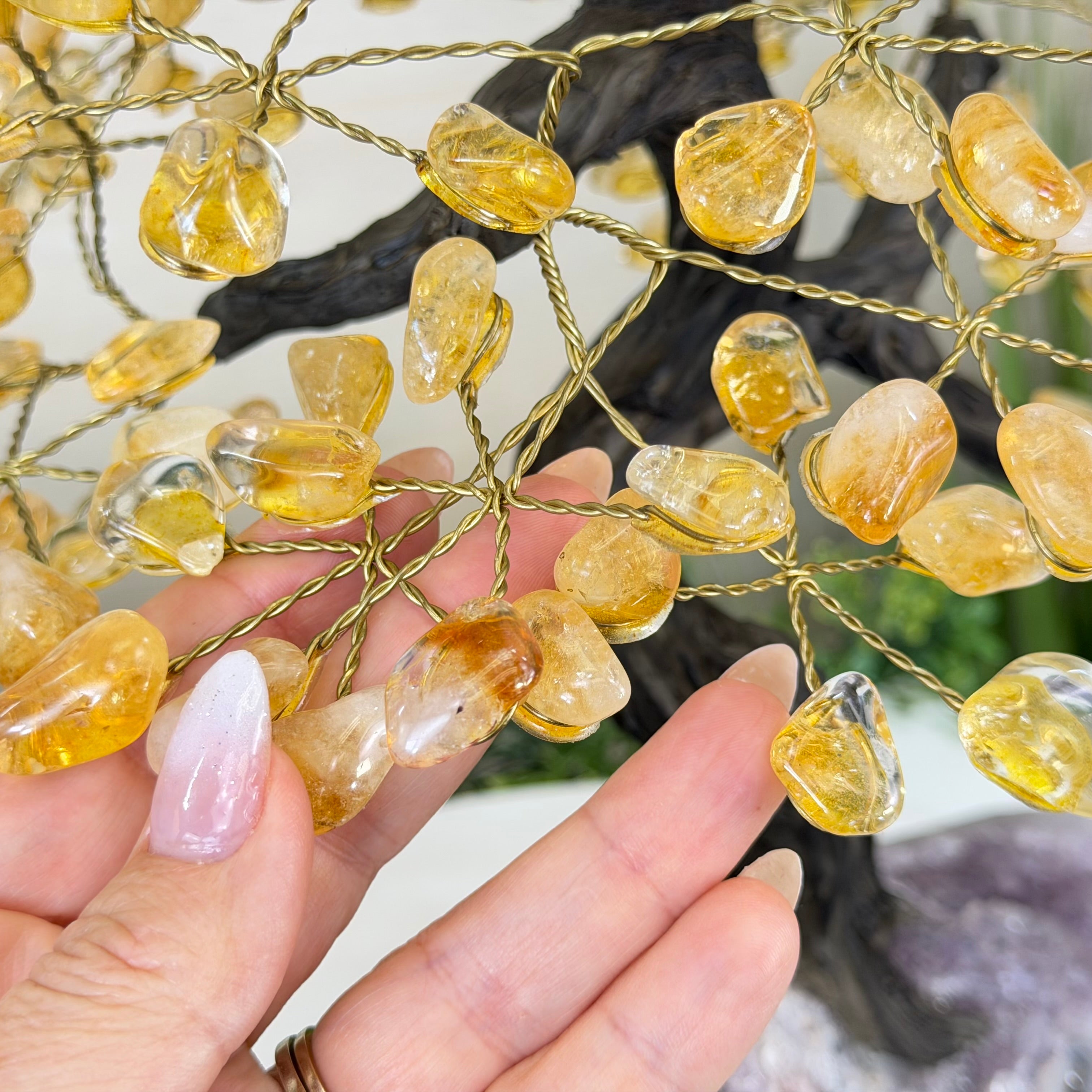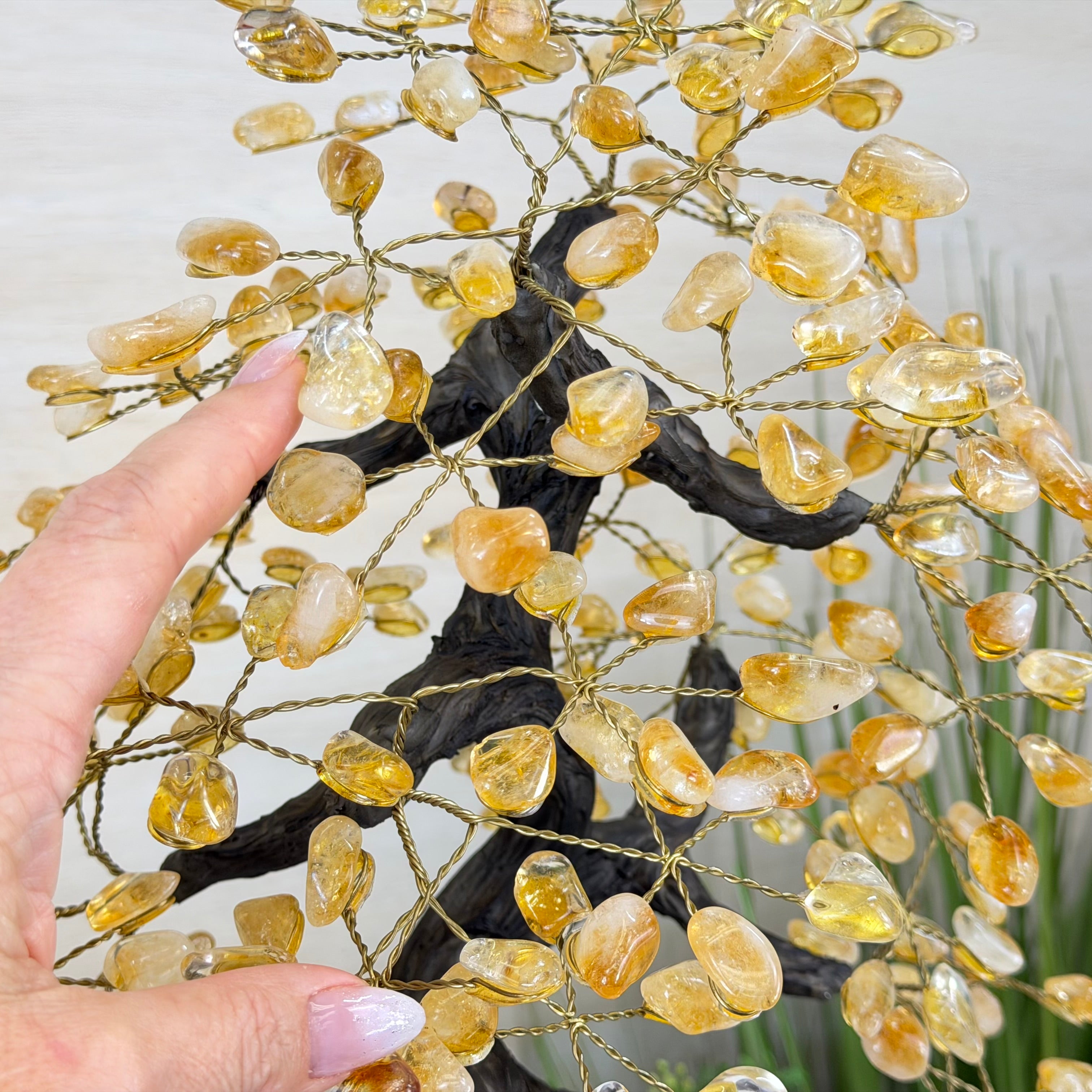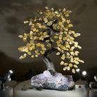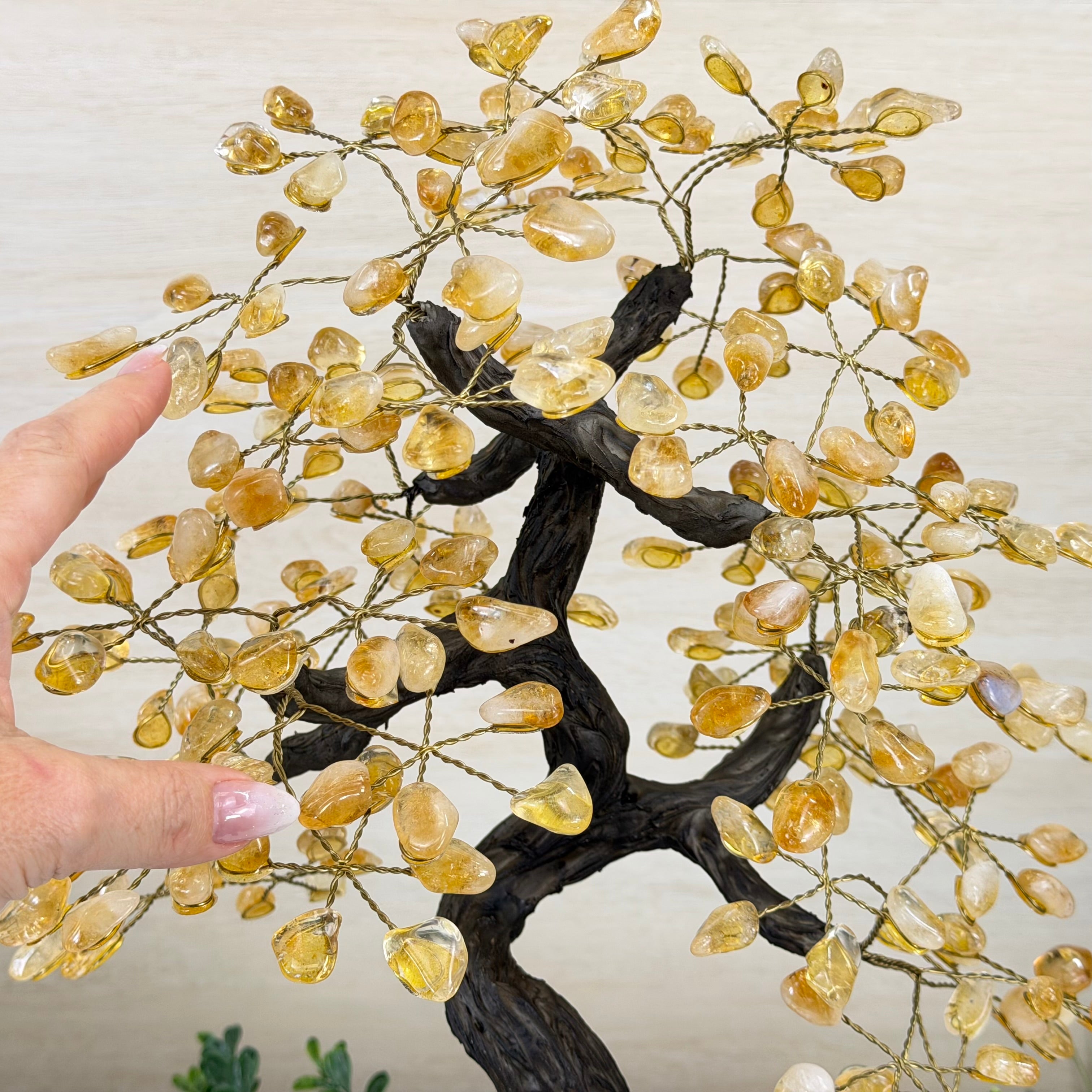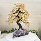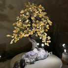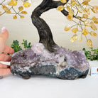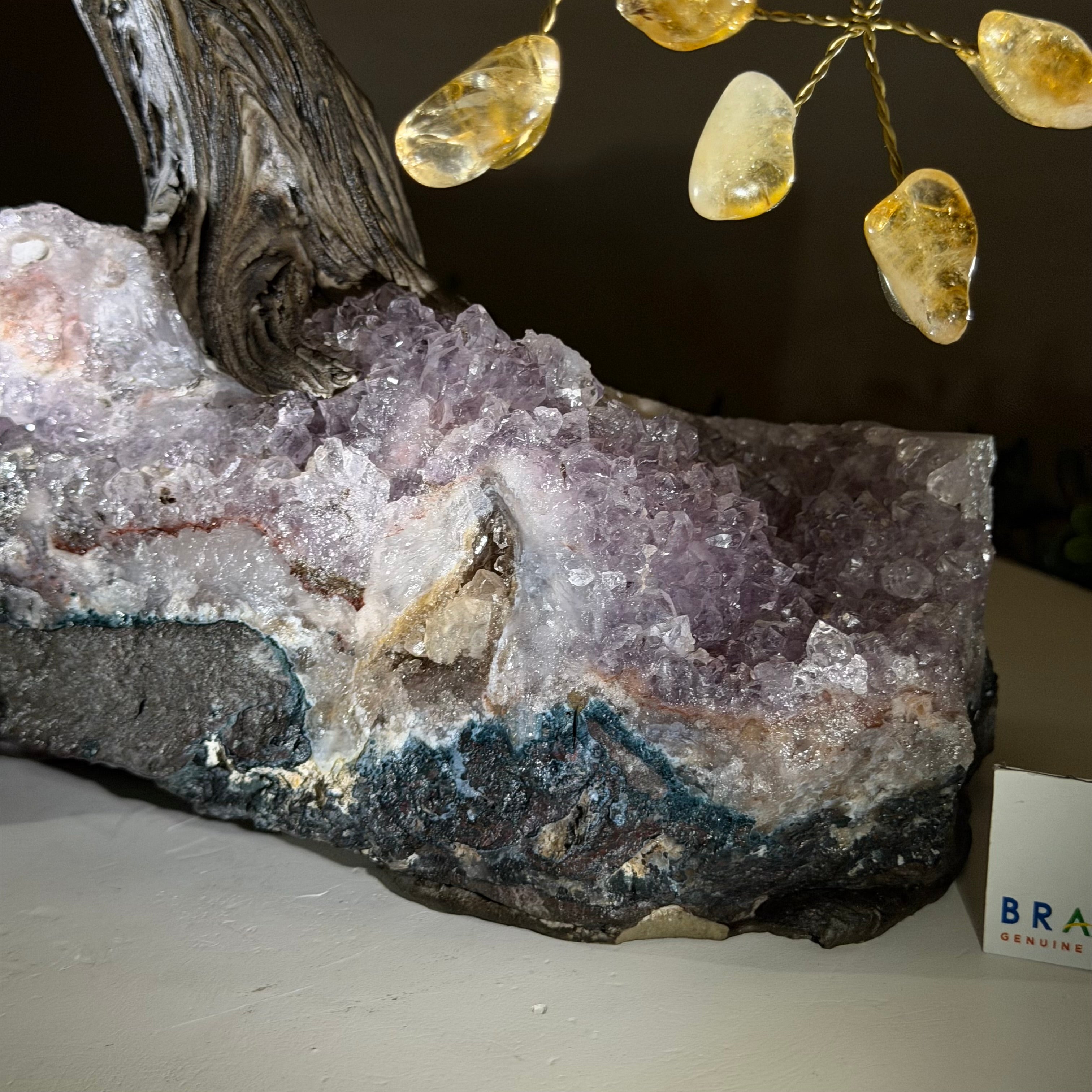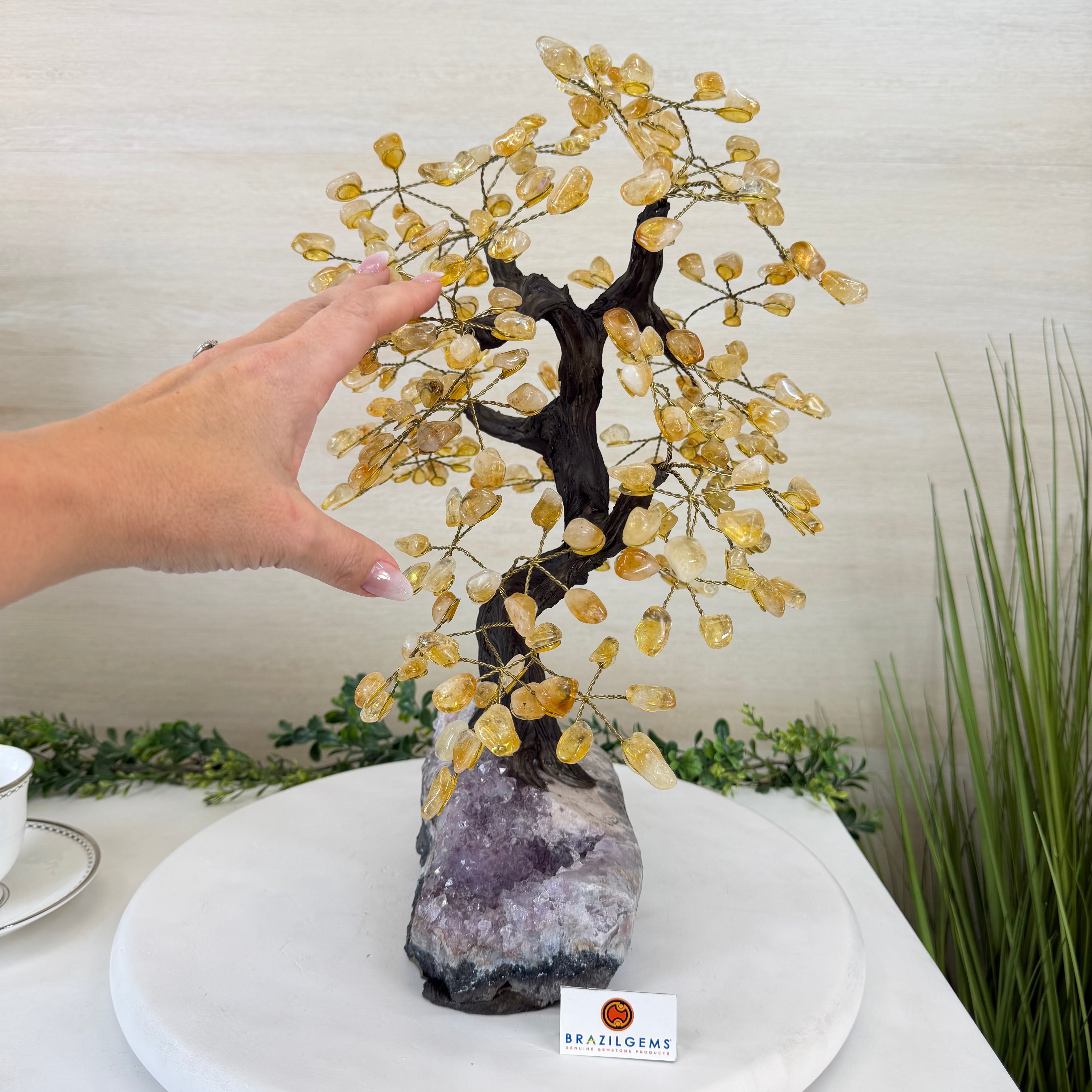 Citrine Bonsai Gemstone Tree on an Amethyst Cluster Base Handcrafted in Brazil, this striking gemstone tree stands approximately 17" tall and features a sturdy bonsai-style trunk and branches adorned with 240 tumbled Citrine gemstones as its leaves.