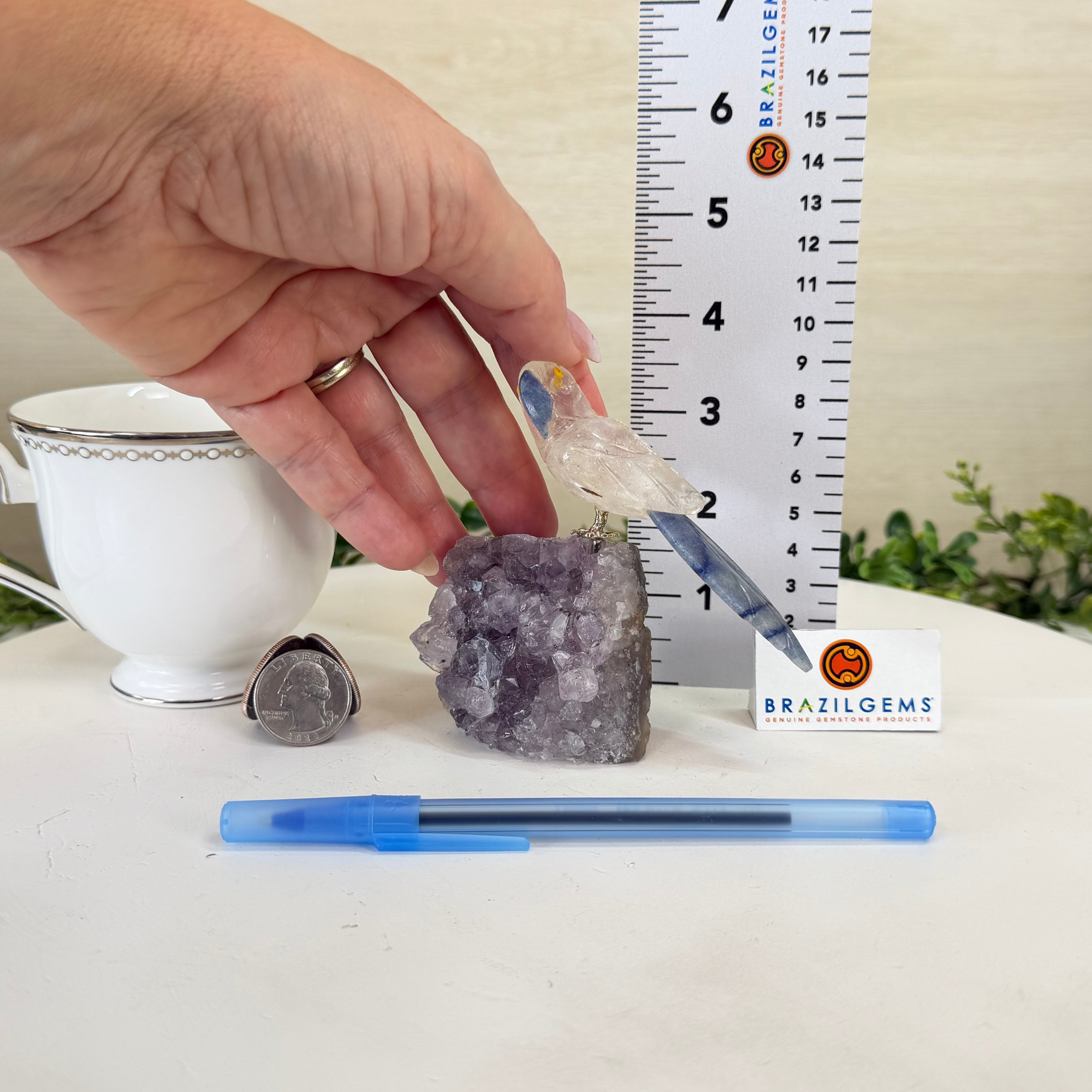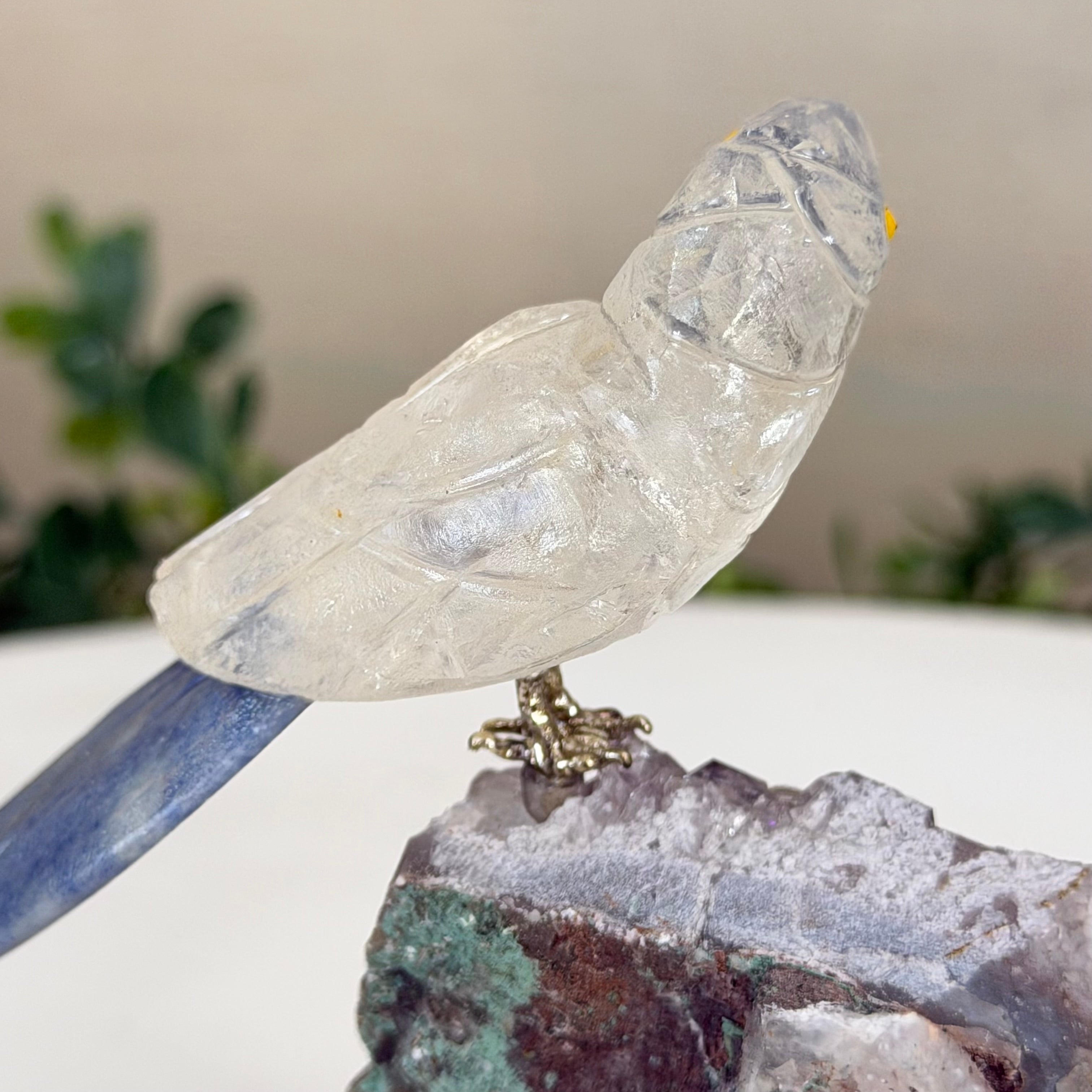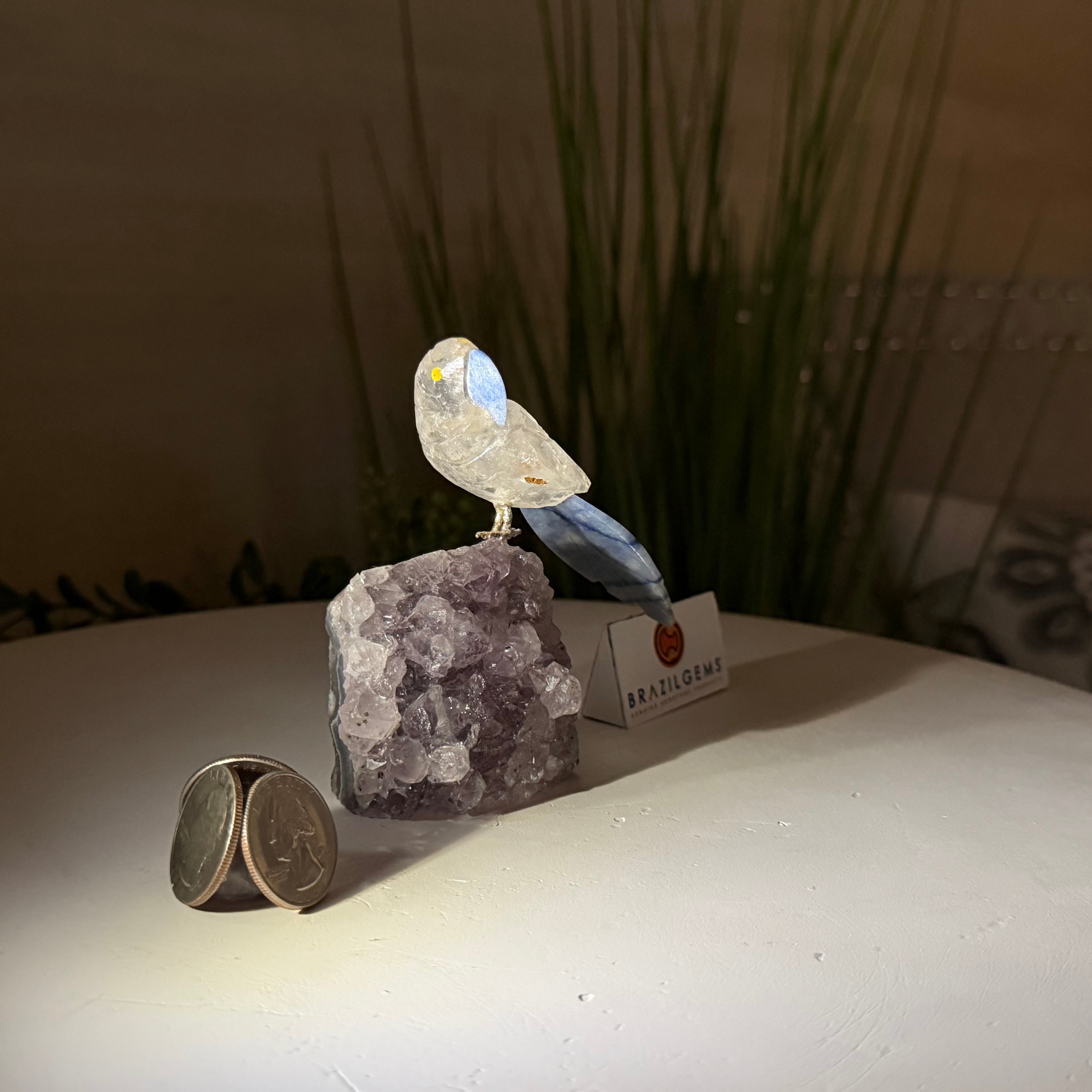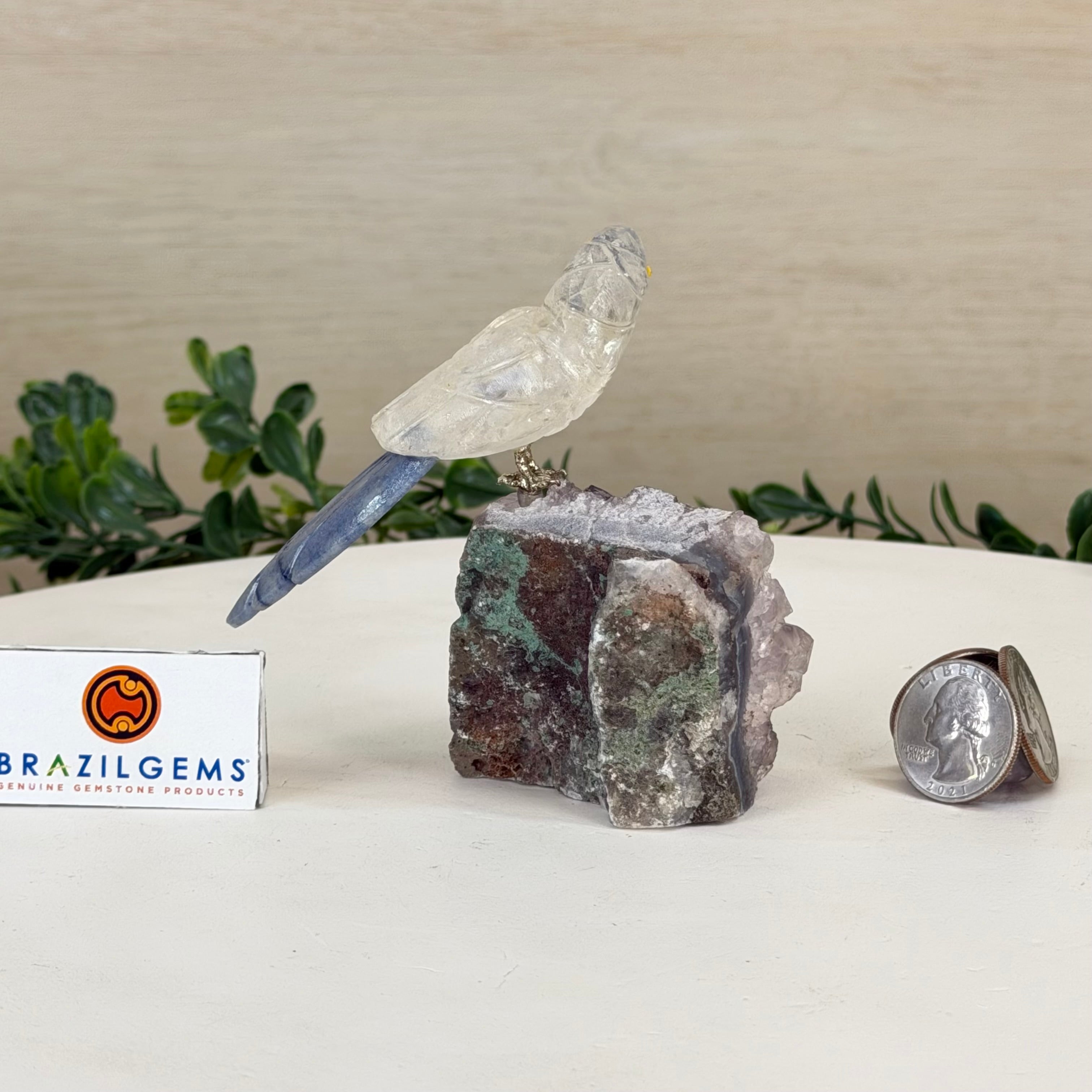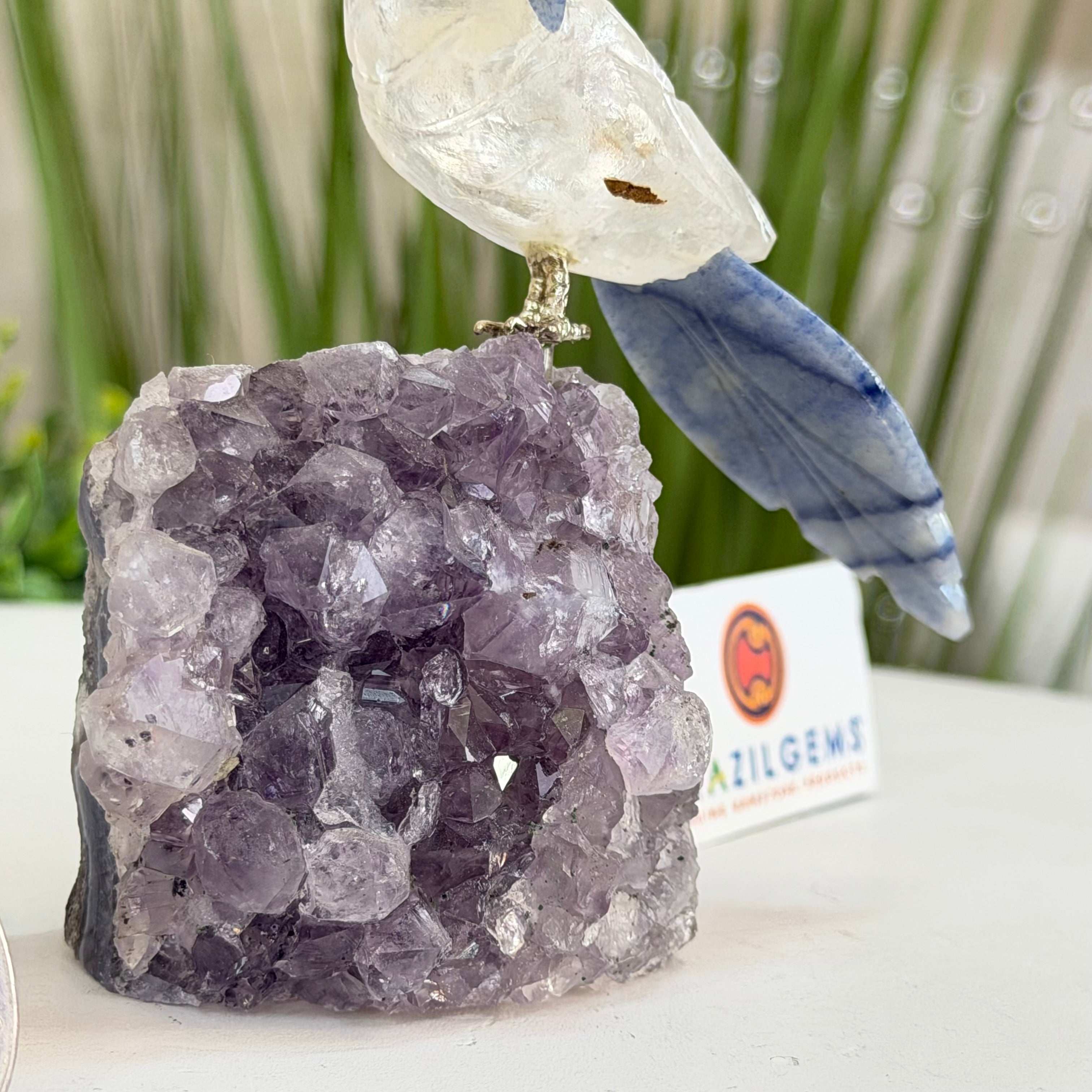 Discover the beauty of our hand-carved gemstone bird, a stunning fusion of Brazilian artistry and natural elegance. Each sculpture is thoughtfully crafted from genuine gemstones and perched on a captivating crystal cluster base, creating a timeless décor piece that blends nature, color, and craftsmanship.