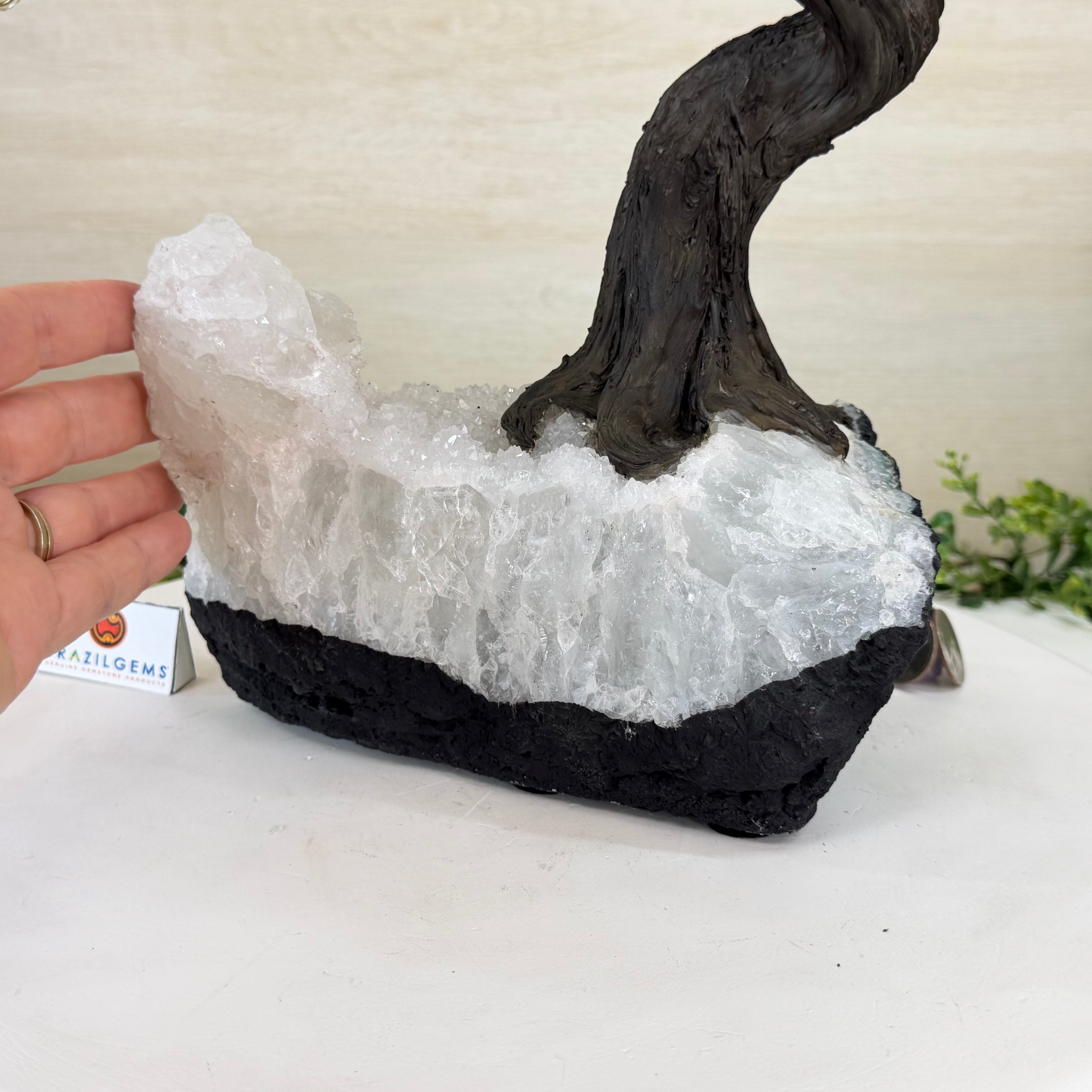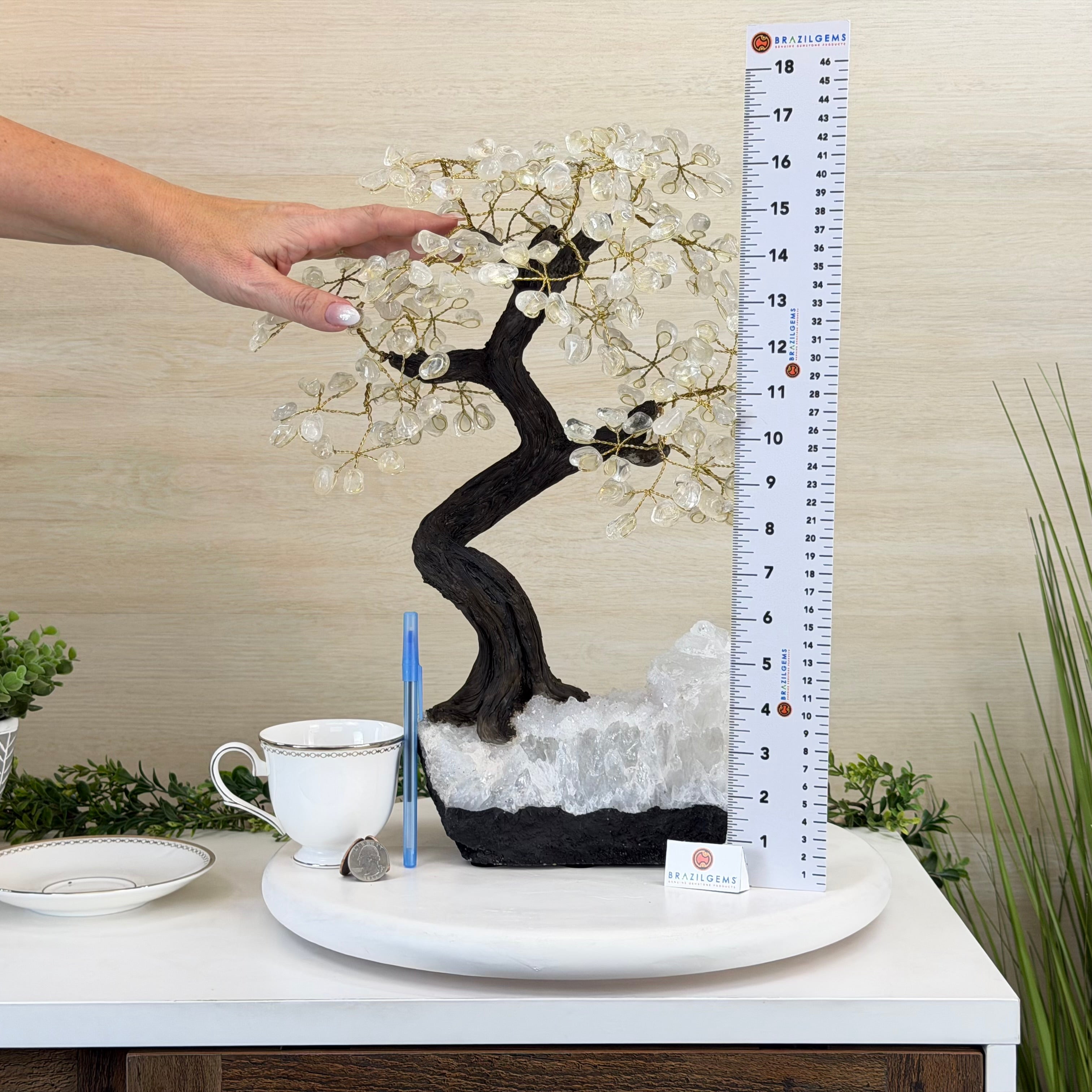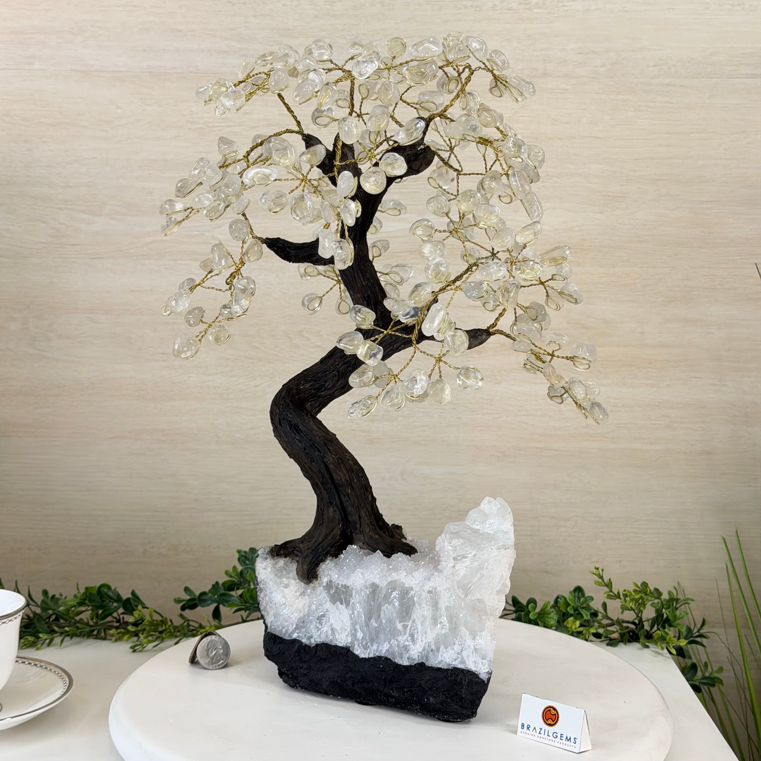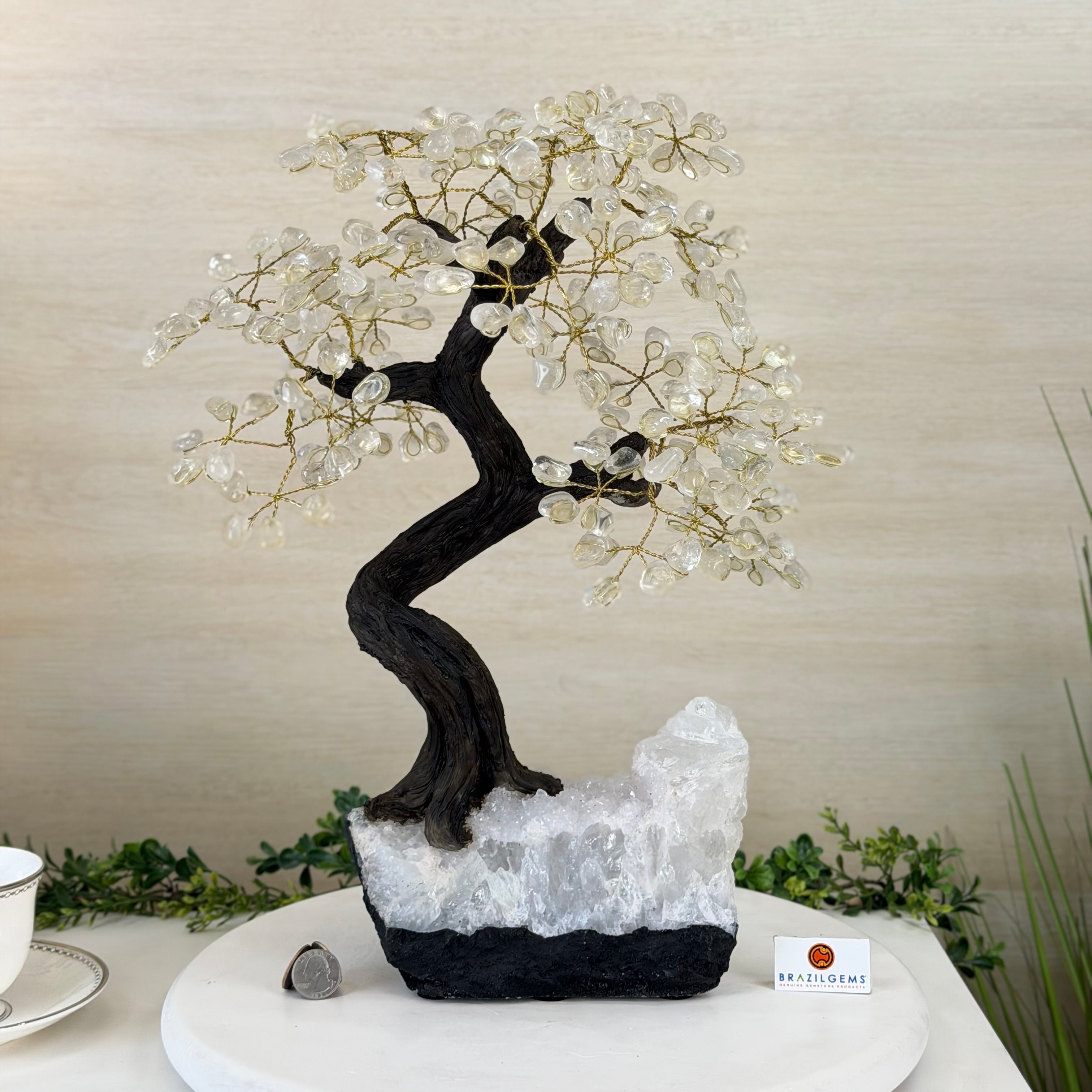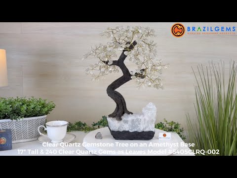 Clear Quartz Bonsai Gemstone Tree on an Amethyst Cluster Base Handcrafted in Brazil, this striking gemstone tree stands approximately 17" tall and features a sturdy bonsai-style trunk and branches adorned with 240 tumbled Clear Quartz gemstones as its leaves.