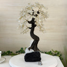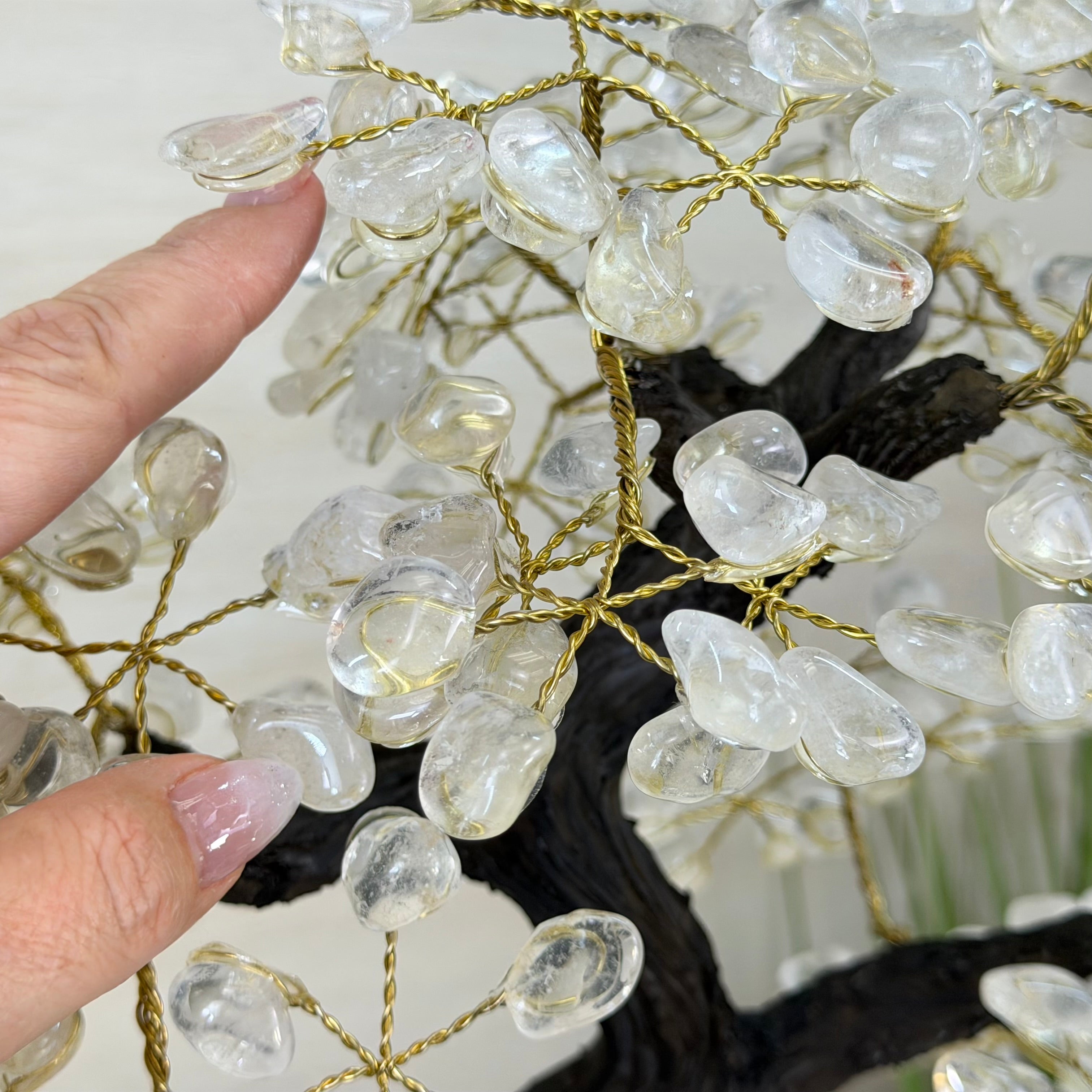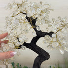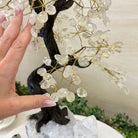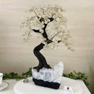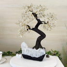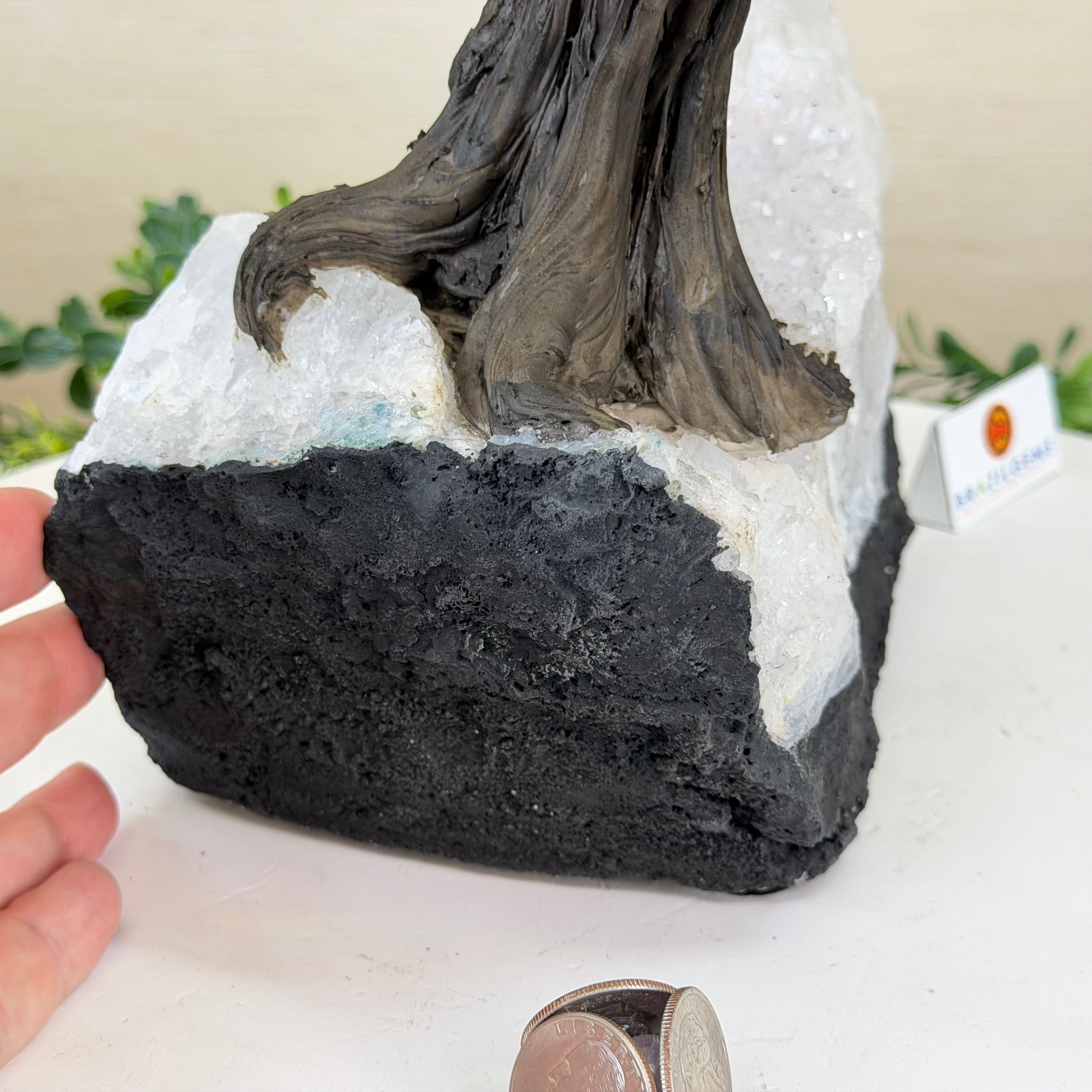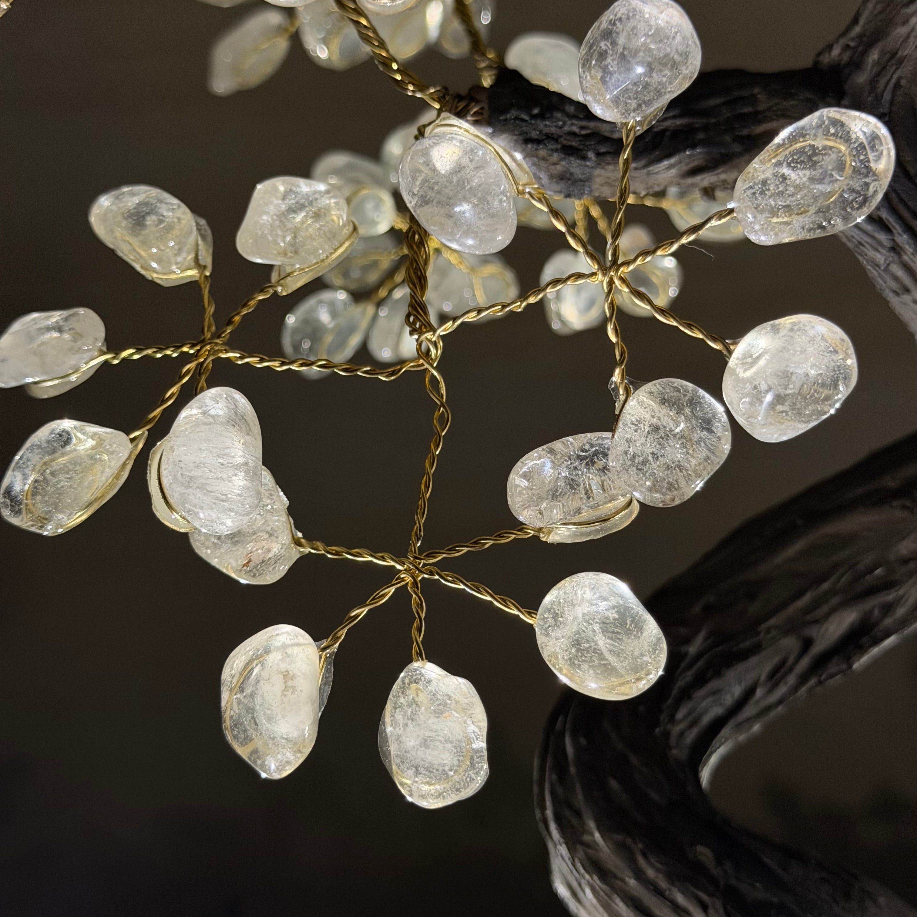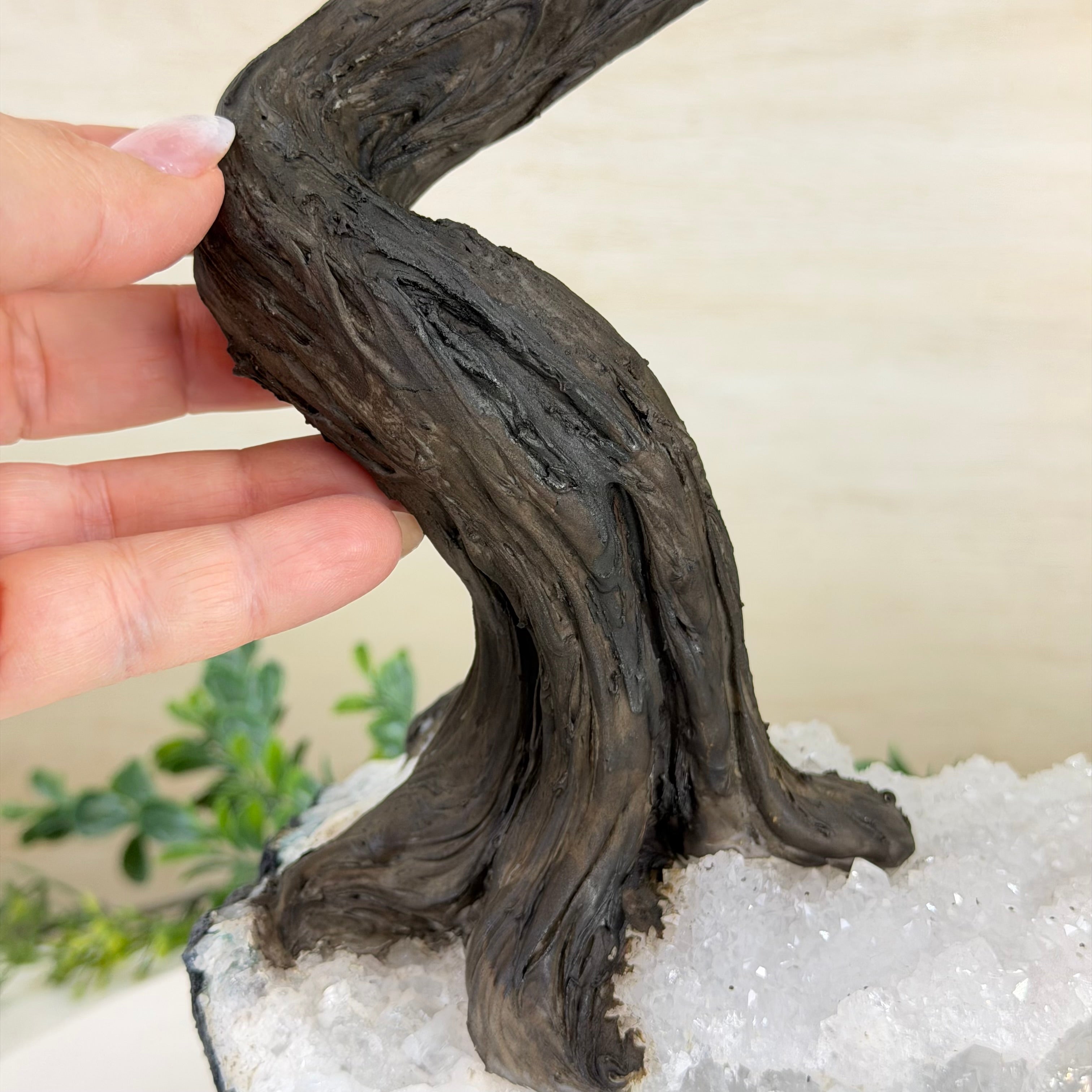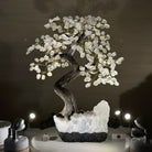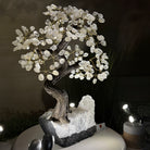 Clear Quartz Bonsai Gemstone Tree on an Amethyst Cluster Base Handcrafted in Brazil, this striking gemstone tree stands approximately 17" tall and features a sturdy bonsai-style trunk and branches adorned with 240 tumbled Clear Quartz gemstones as its leaves.