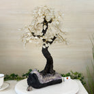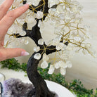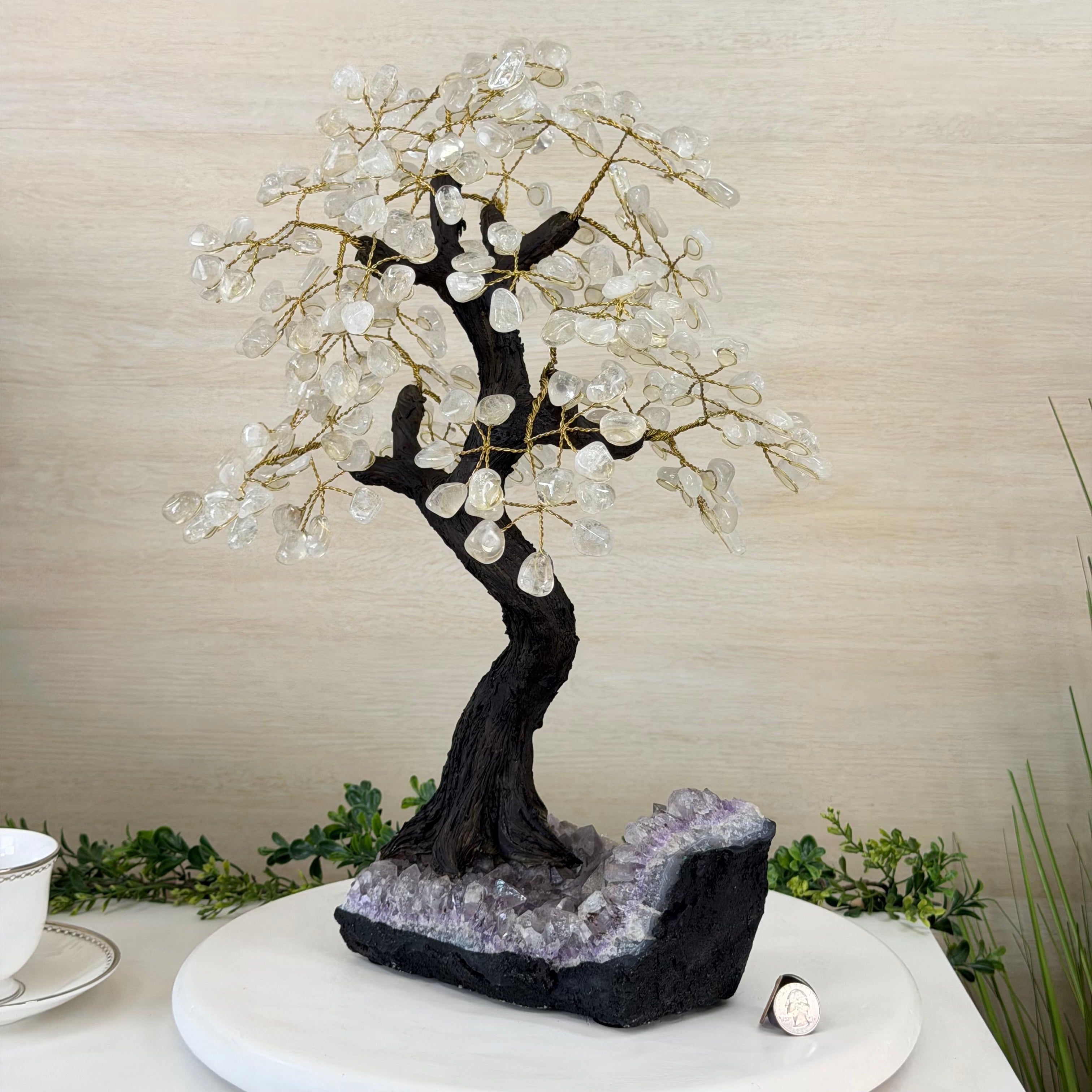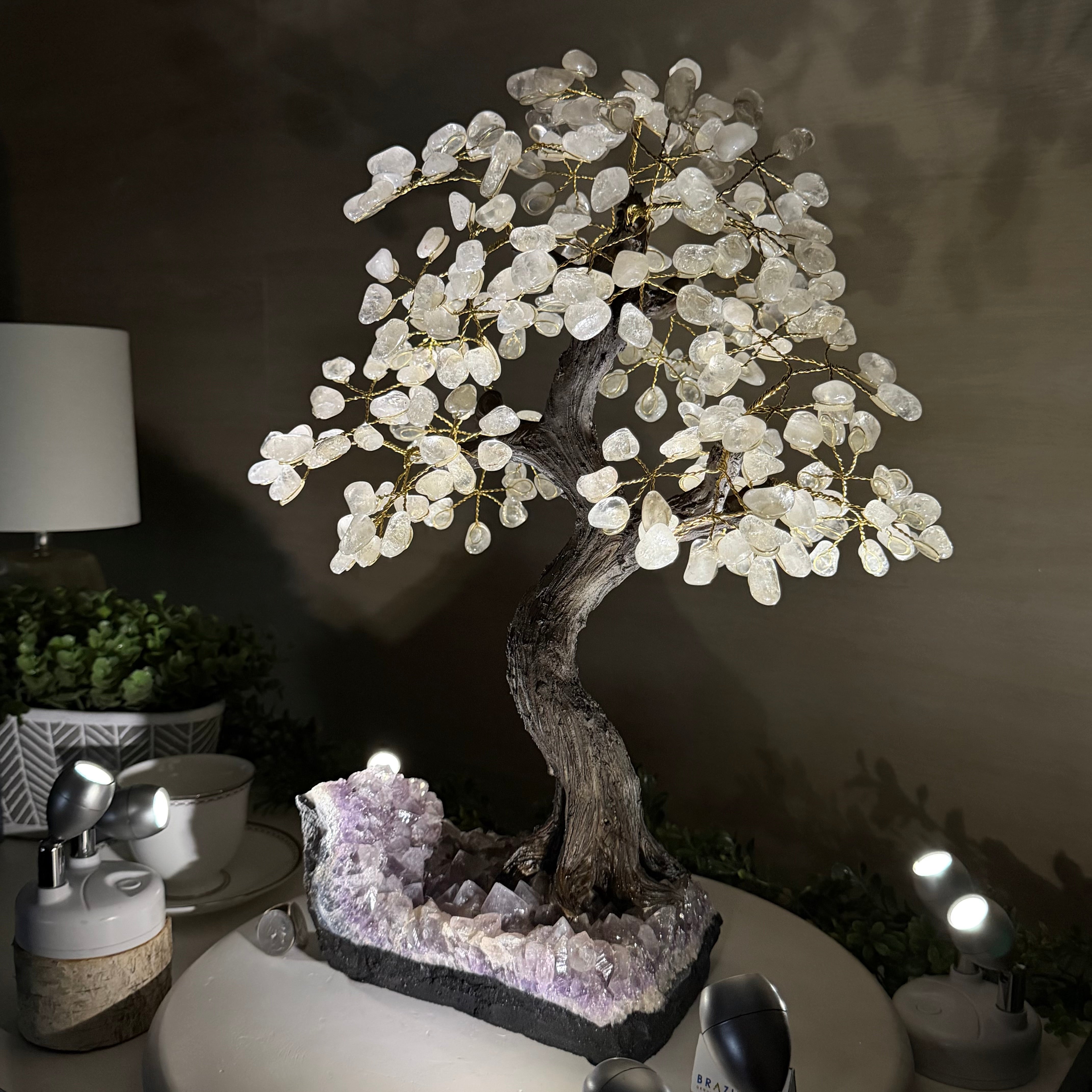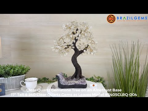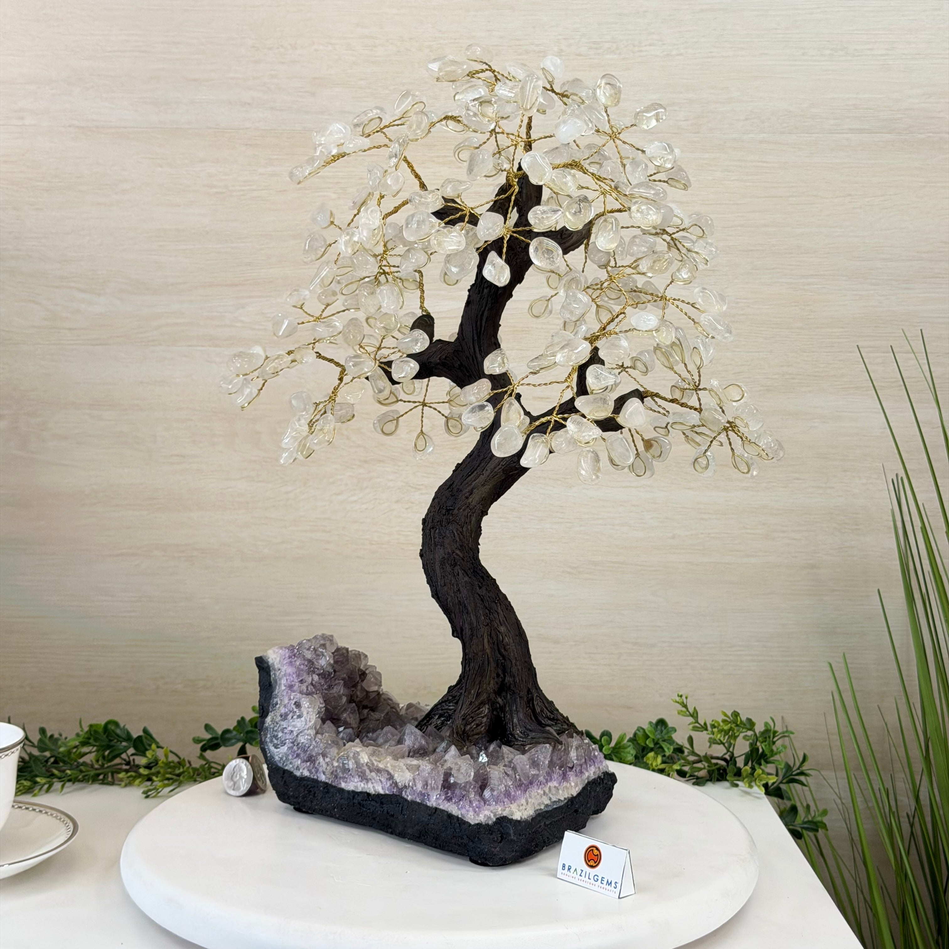 Clear Quartz Bonsai Gemstone Tree on an Amethyst Cluster Base Handcrafted in Brazil, this striking gemstone tree stands approximately 17" tall and features a sturdy bonsai-style trunk and branches adorned with 240 tumbled Clear Quartz gemstones as its leaves.