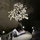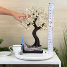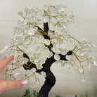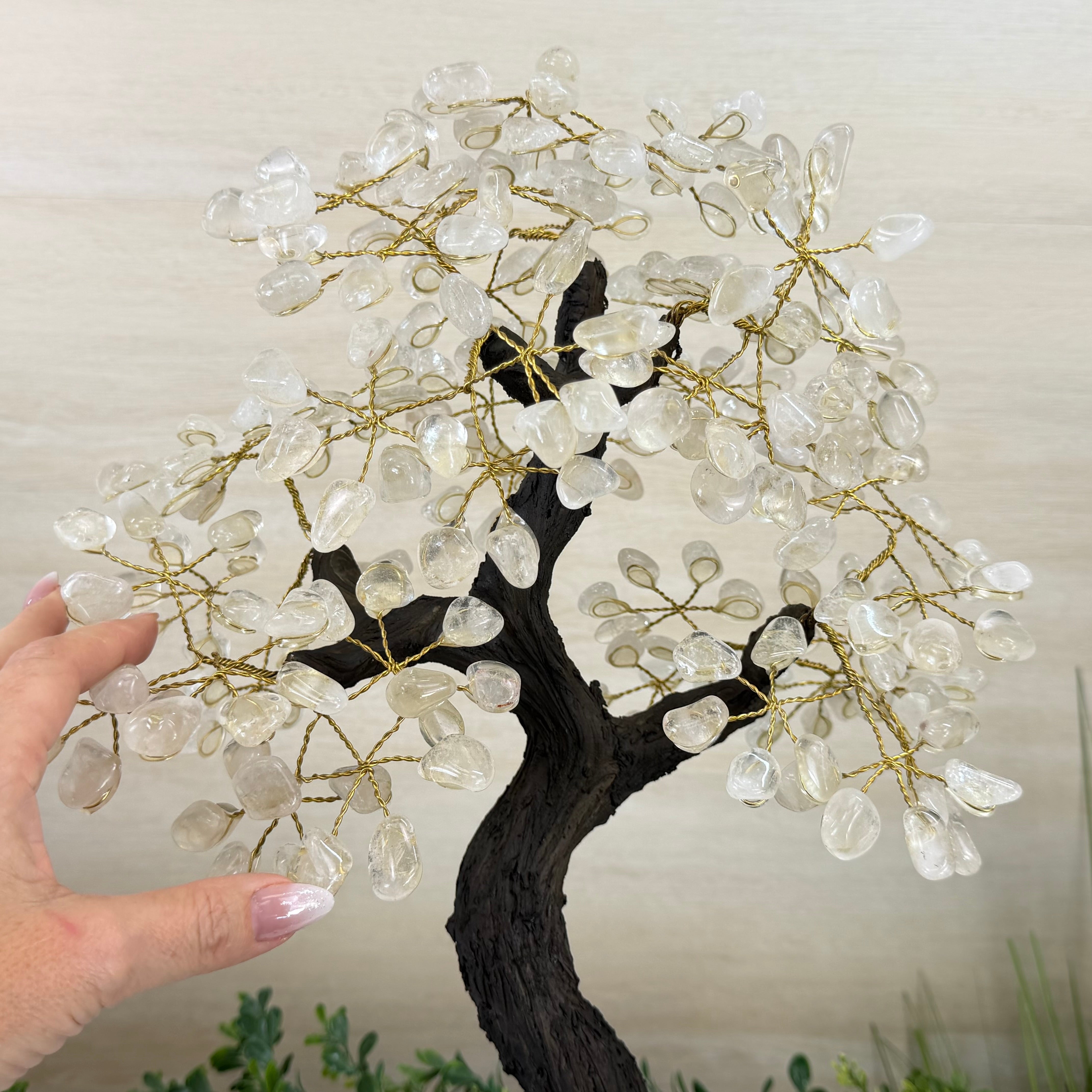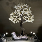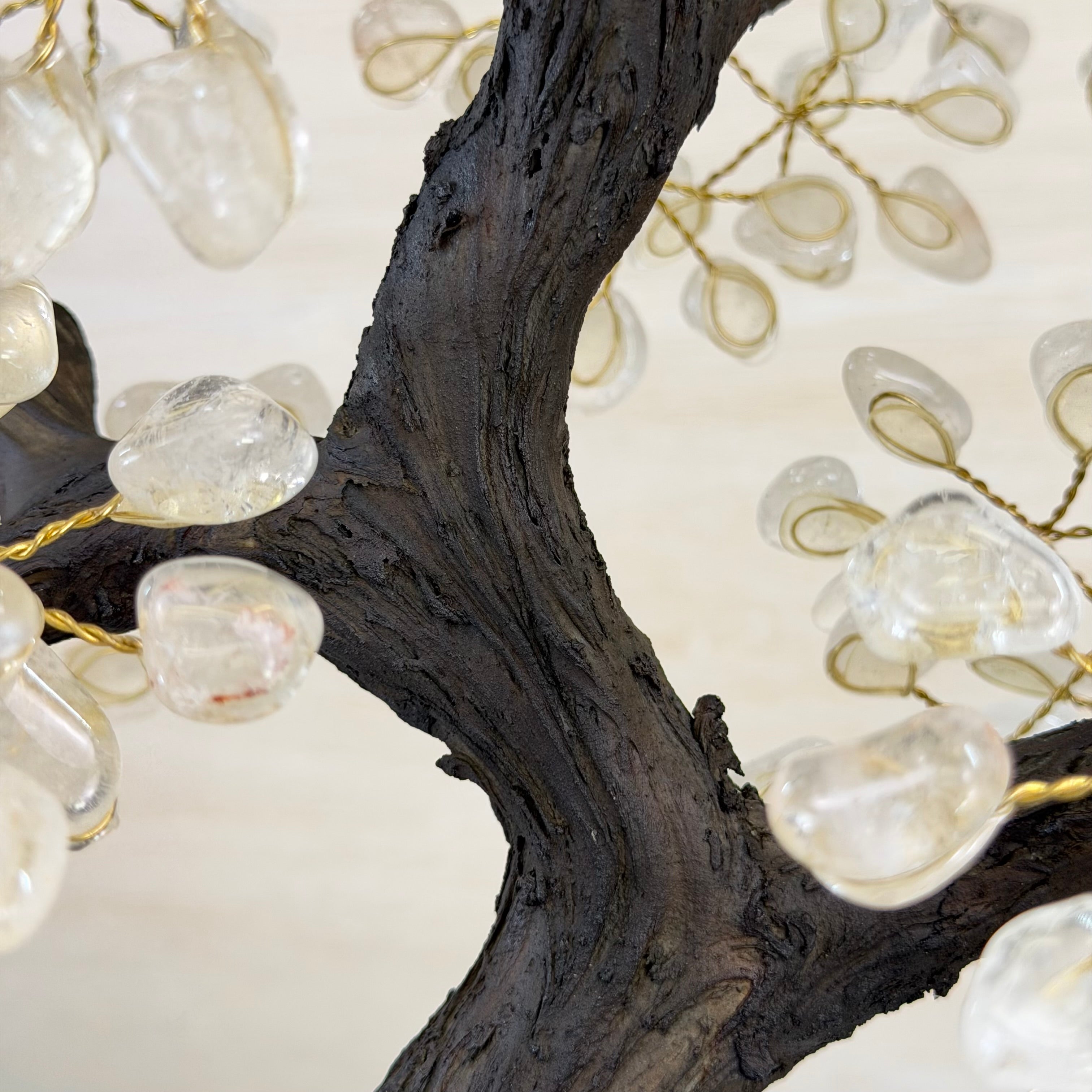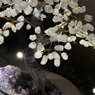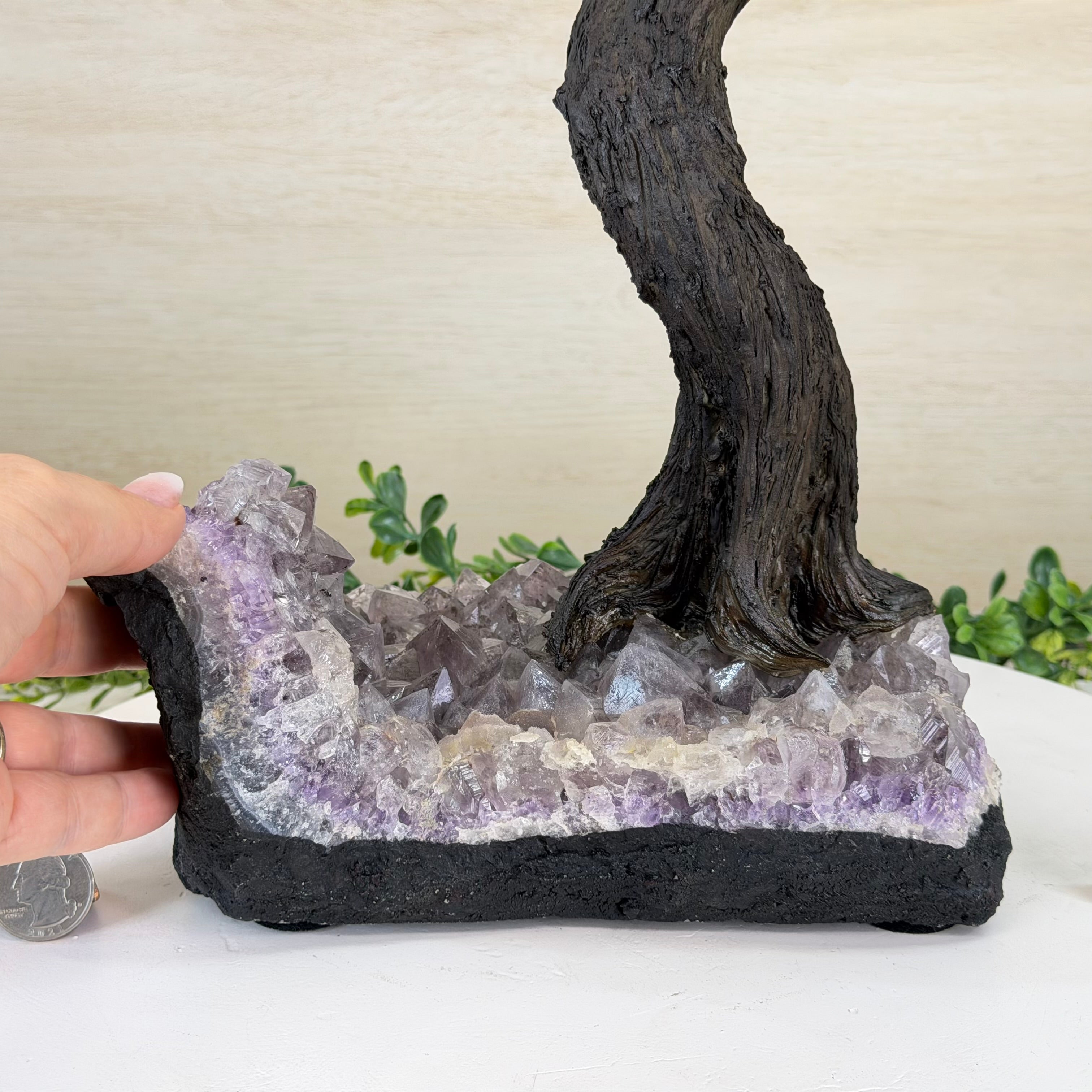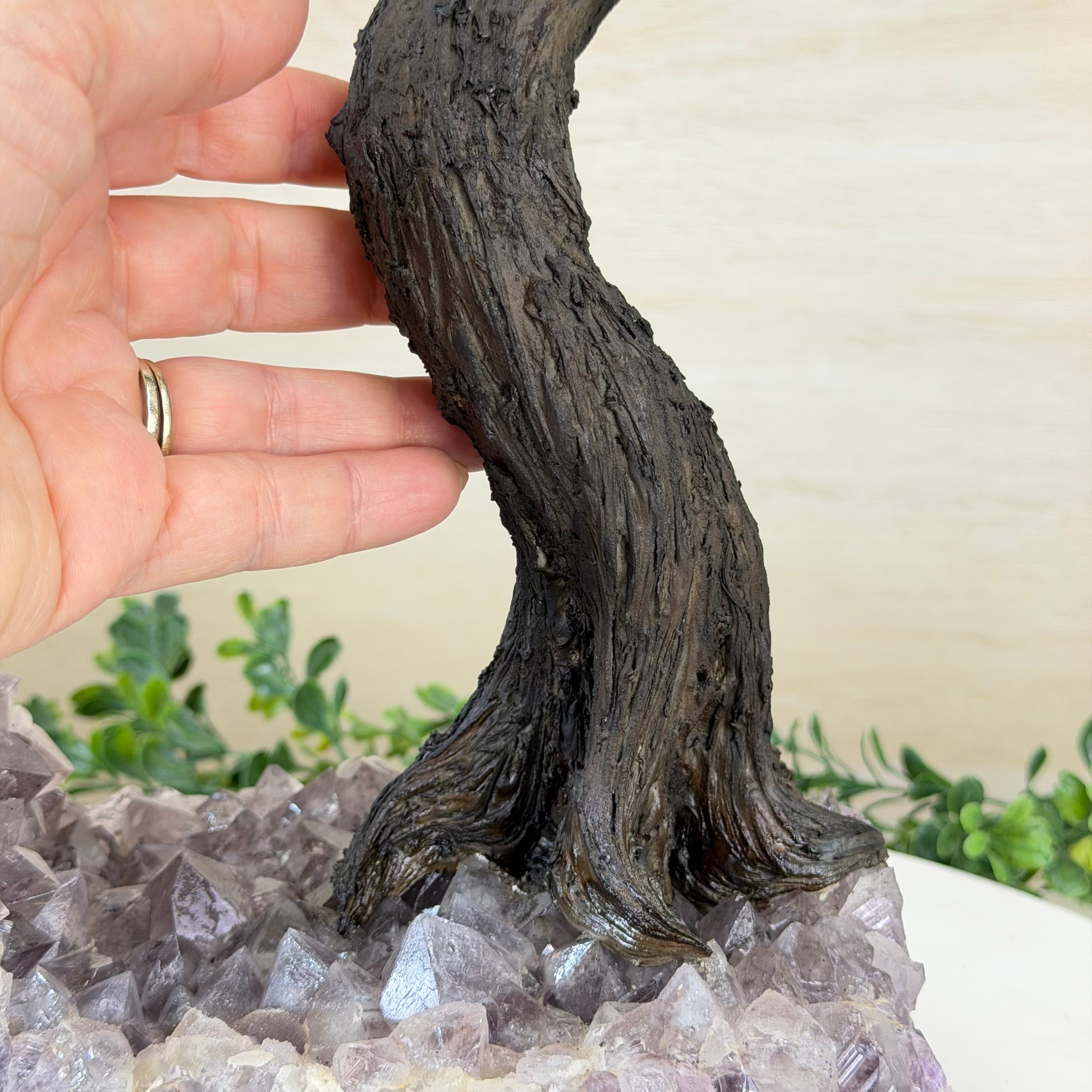 Clear Quartz Bonsai Gemstone Tree on an Amethyst Cluster Base Handcrafted in Brazil, this striking gemstone tree stands approximately 17" tall and features a sturdy bonsai-style trunk and branches adorned with 240 tumbled Clear Quartz gemstones as its leaves.