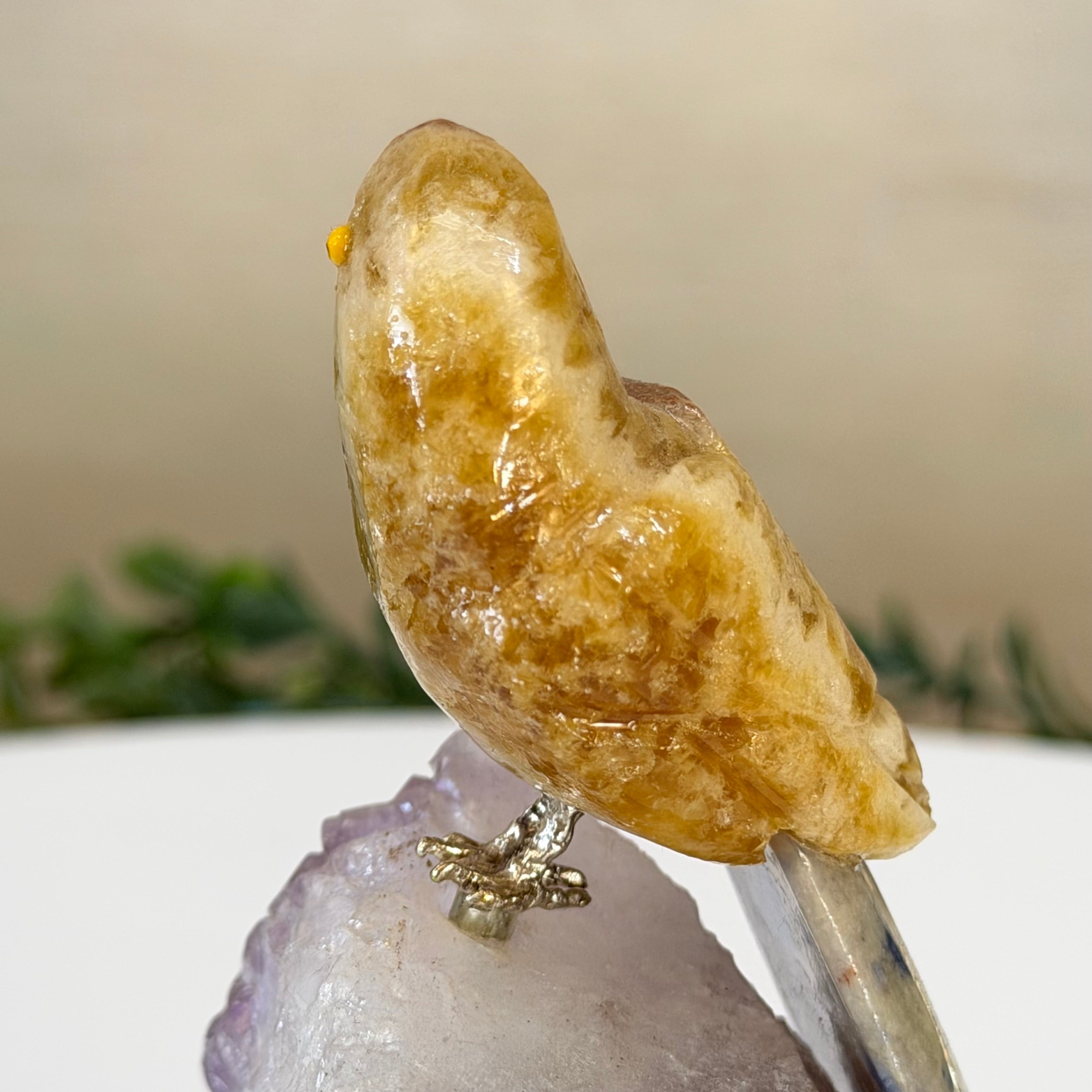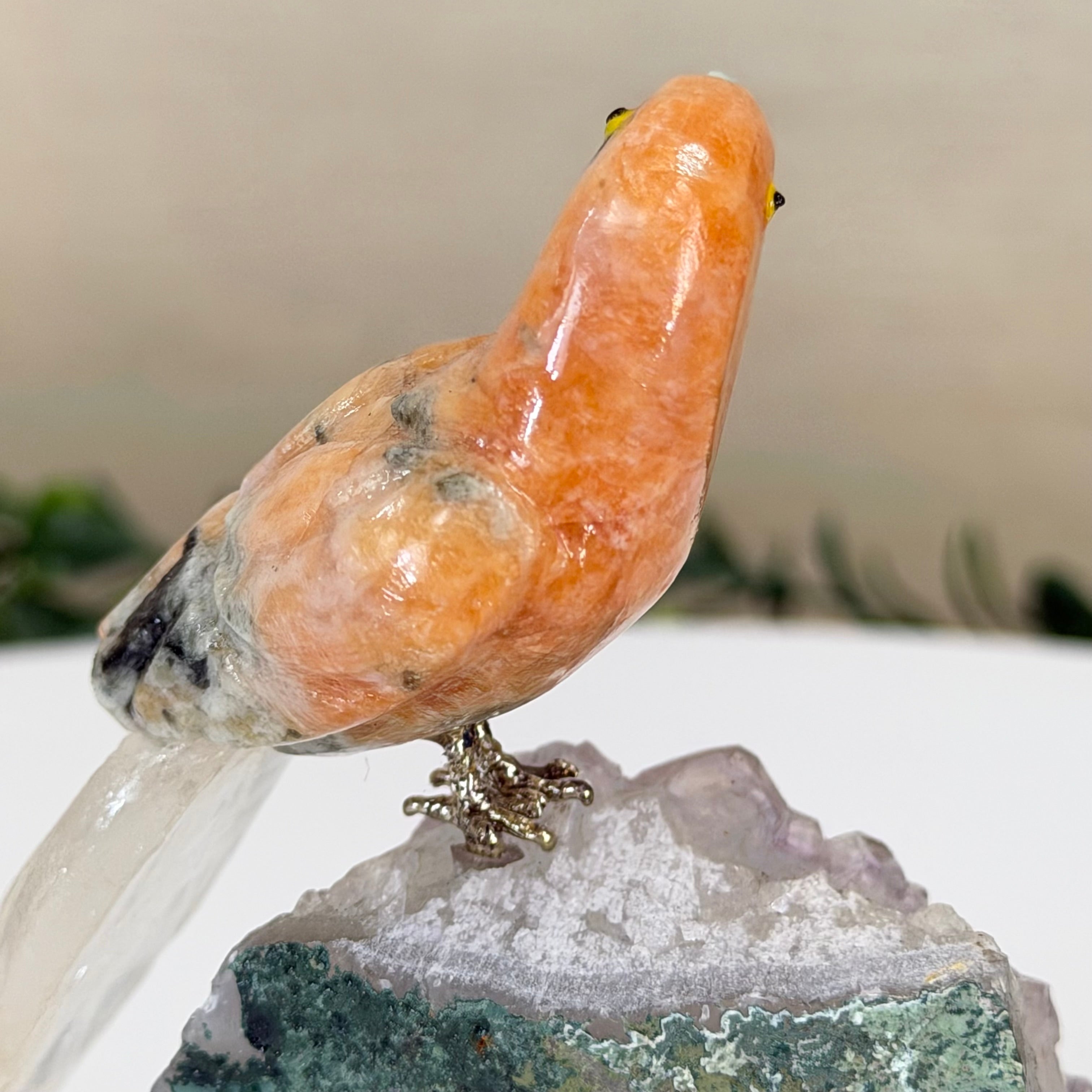 Marvel at our exquisite hand-carved Crystal Birds set on captivating Crystal cluster bases, a harmonious blend of nature, art, and elegance. Crafted from premium gemstones for their bodies, beaks, crests, tails and eyes and adorned with cute little metal feet, these stunning sculptures capture the essence of nature's beauty.