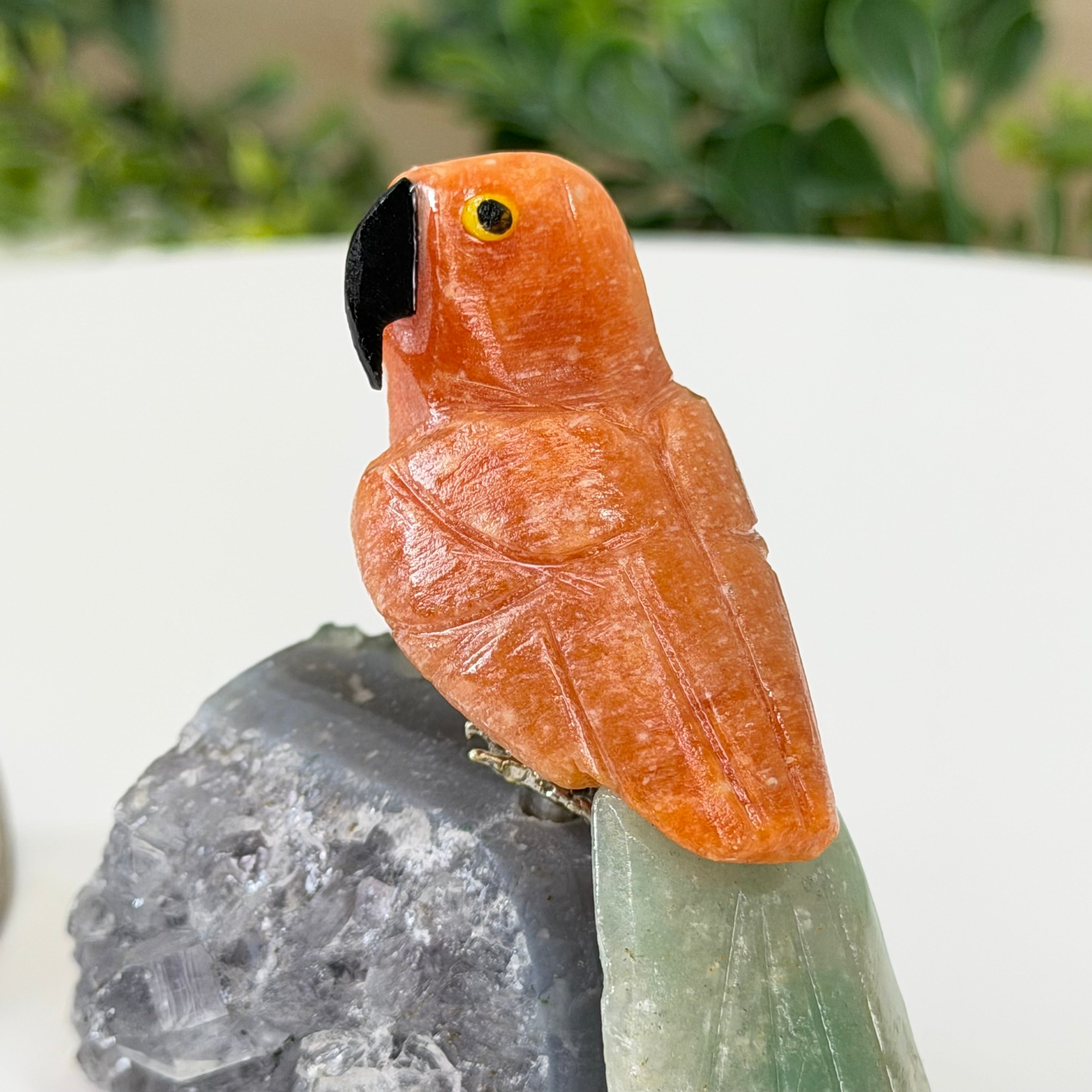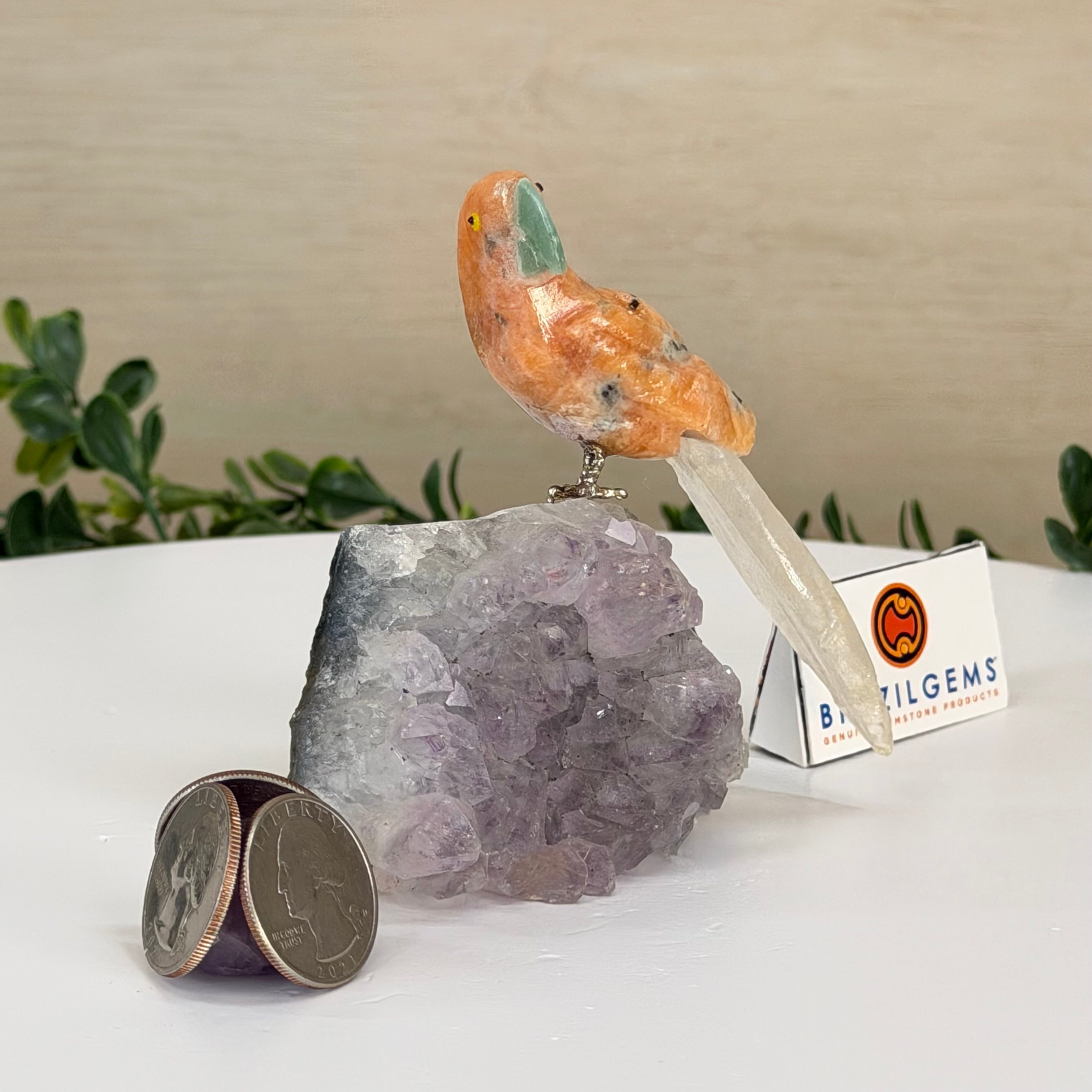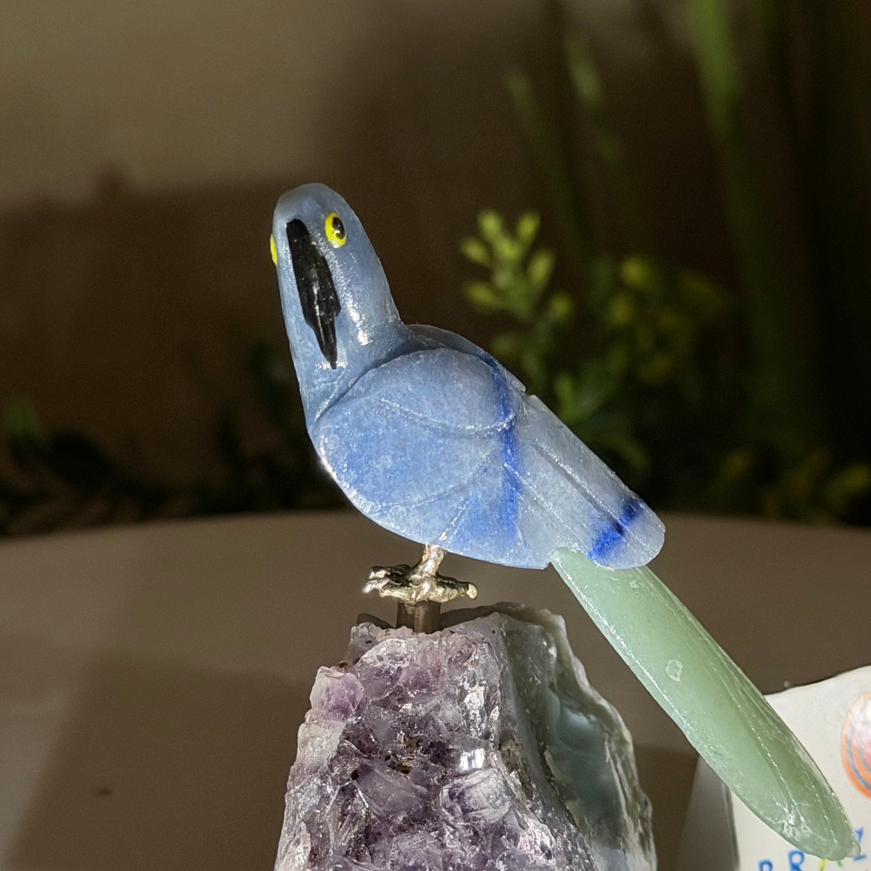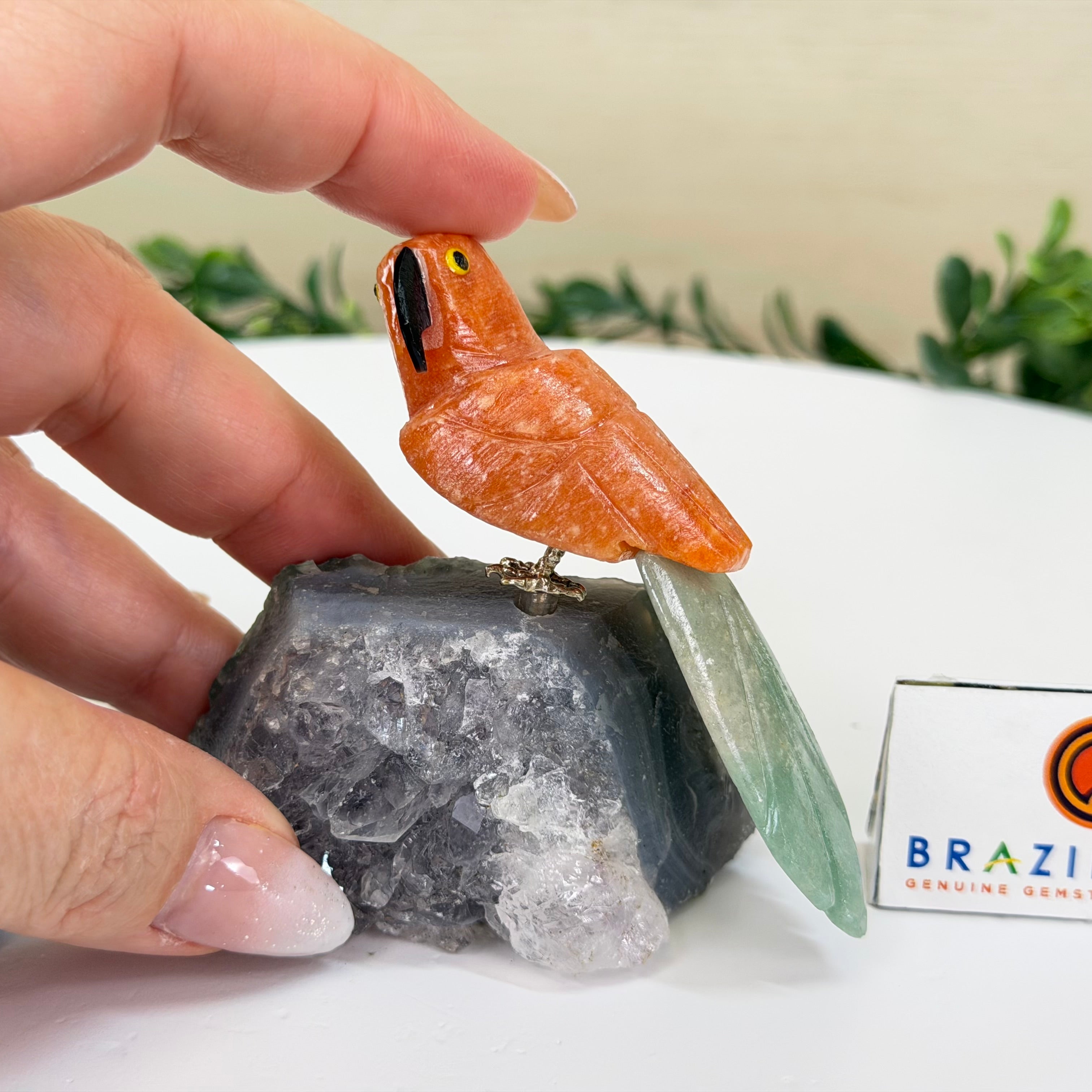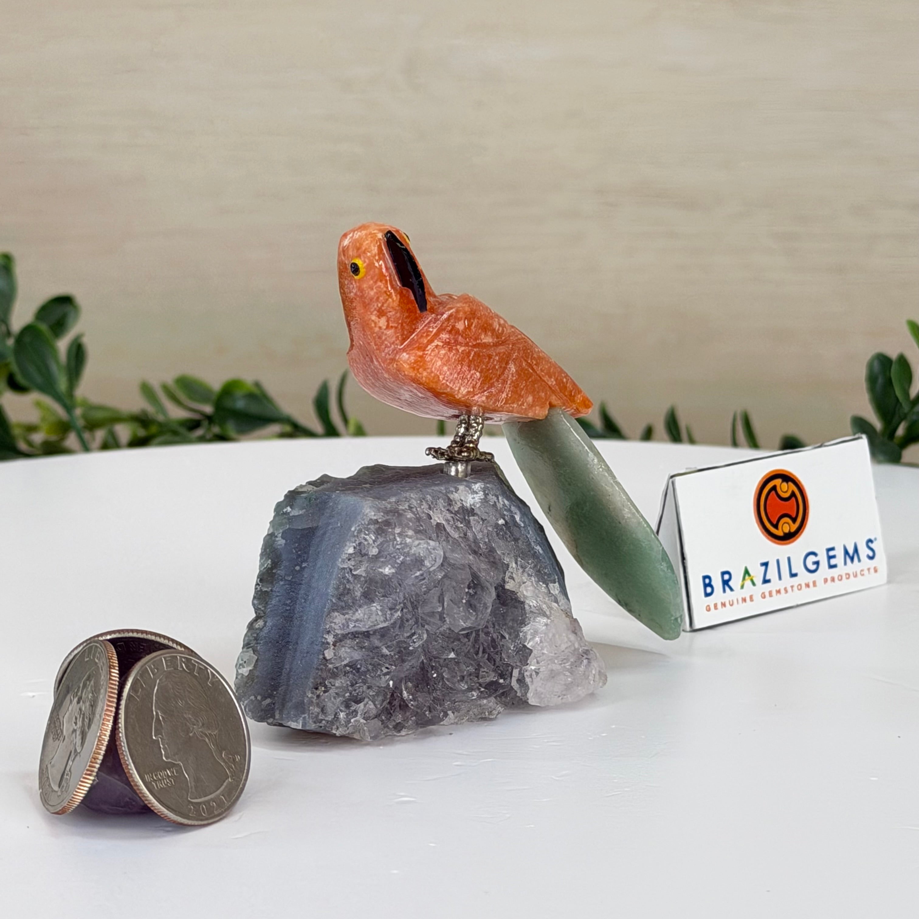 Each intricate detail of these birds is meticulously carved by skilled Brazilian artisans who have mastered the technique that combines the beauty of Brazil's gemstones with their colorful native birds into an amazing art piece. Elevate your space with the timeless charm of our Gemstone birds on an crystal cluster bases.