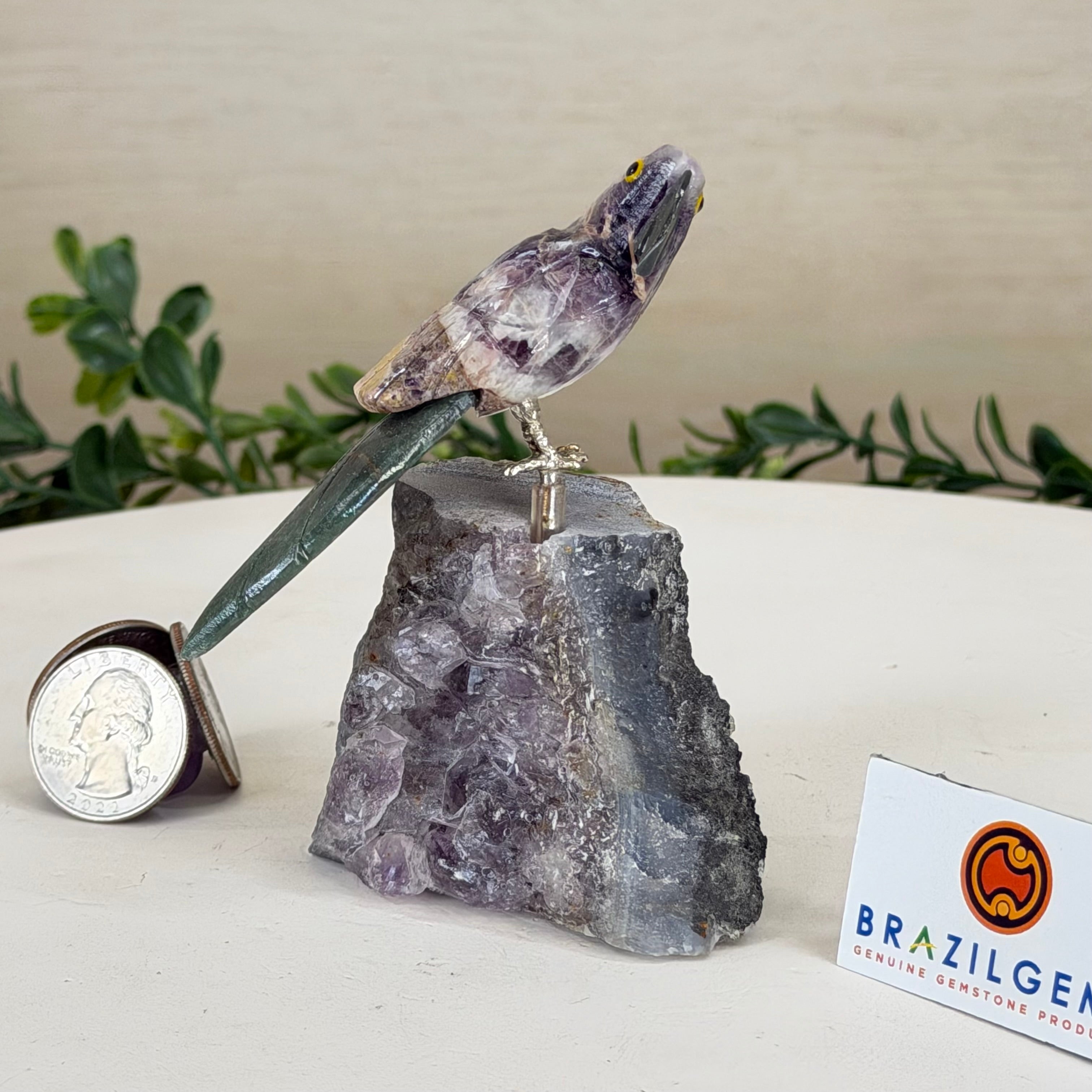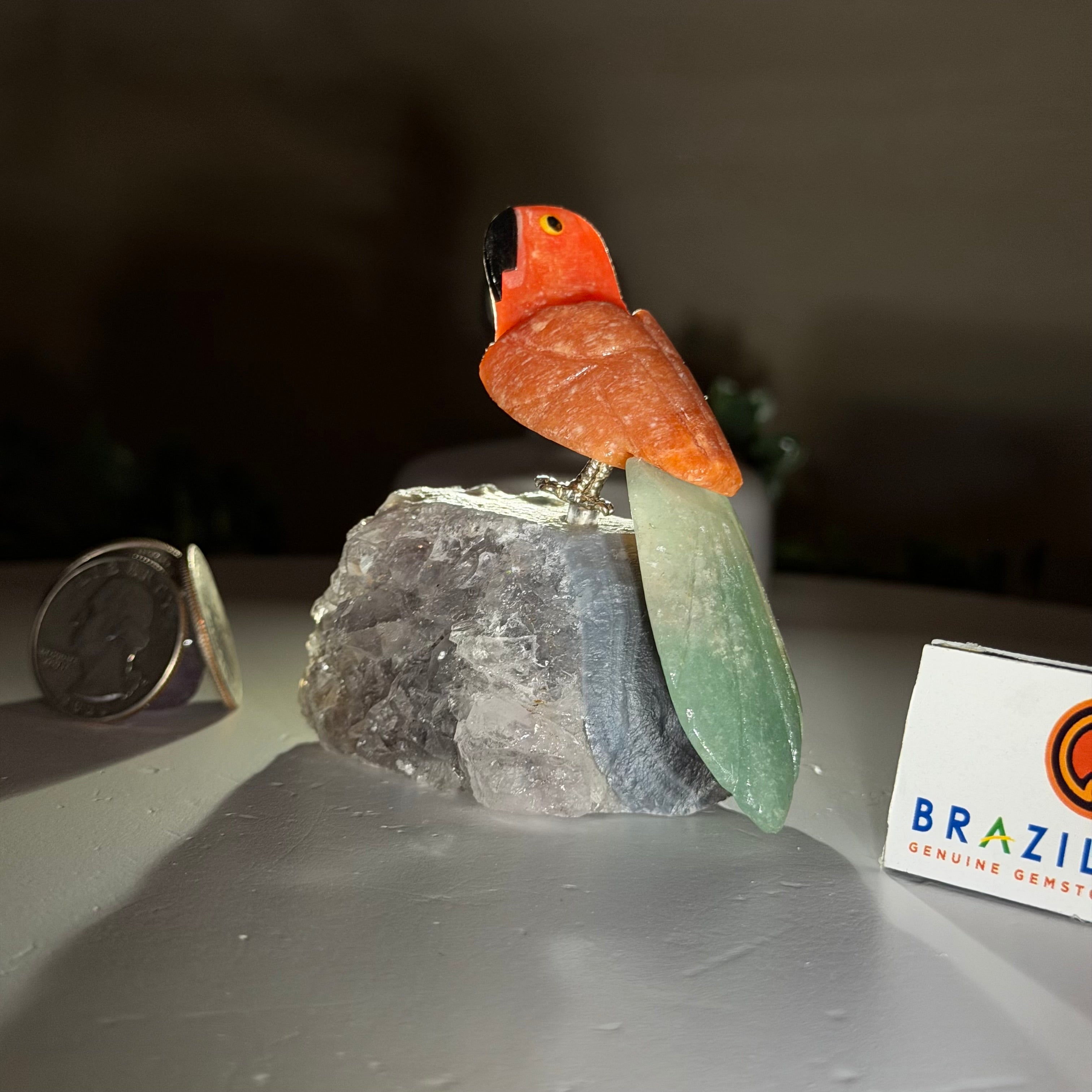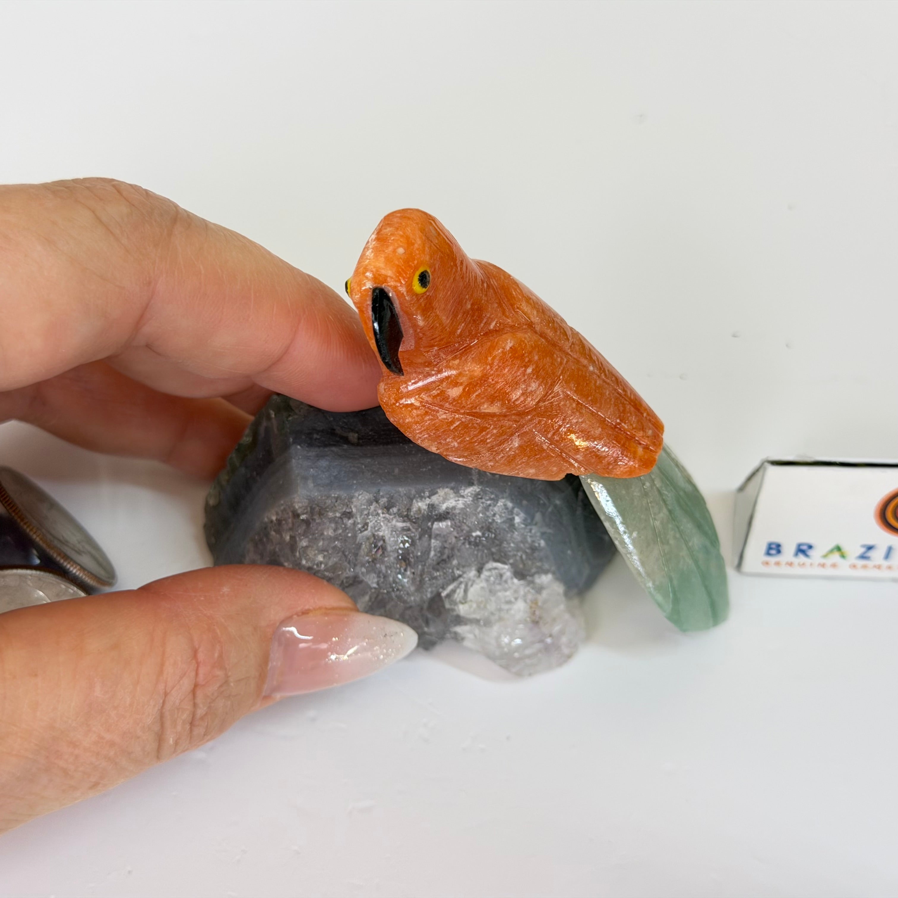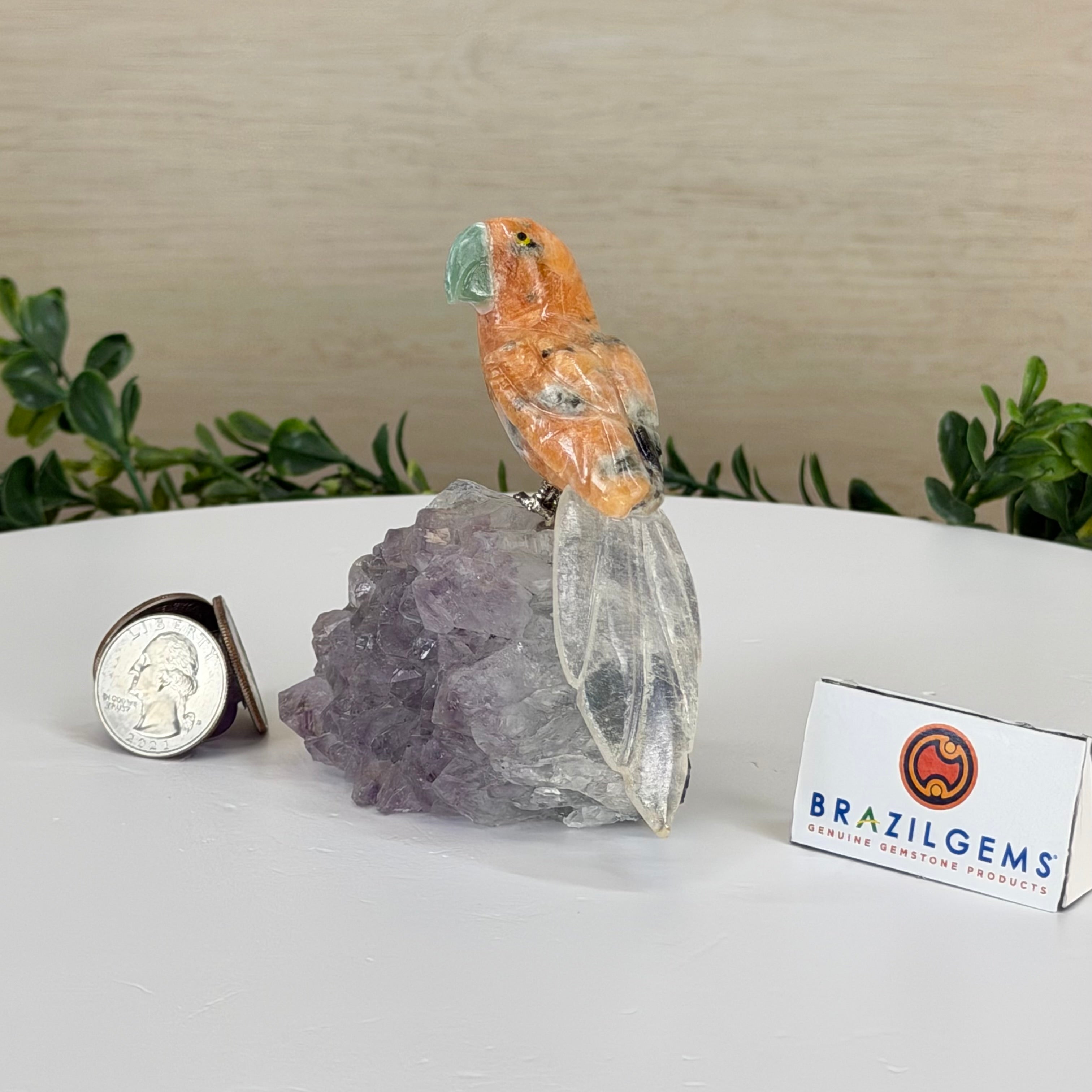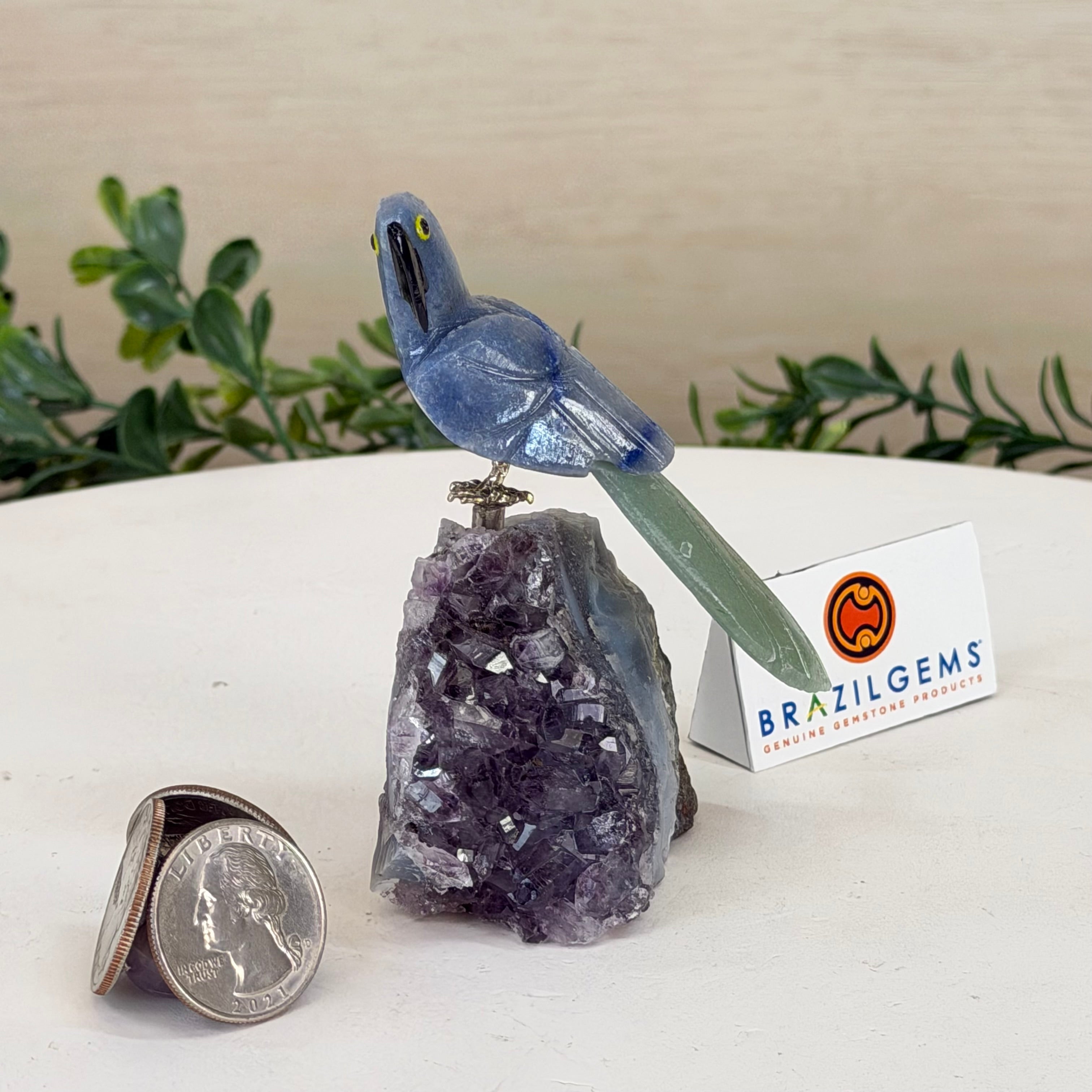 Each intricate detail of these birds is meticulously carved by skilled Brazilian artisans who have mastered the technique that combines the beauty of Brazil's gemstones with their colorful native birds into an amazing art piece. Elevate your space with the timeless charm of our Gemstone birds on an crystal cluster bases.