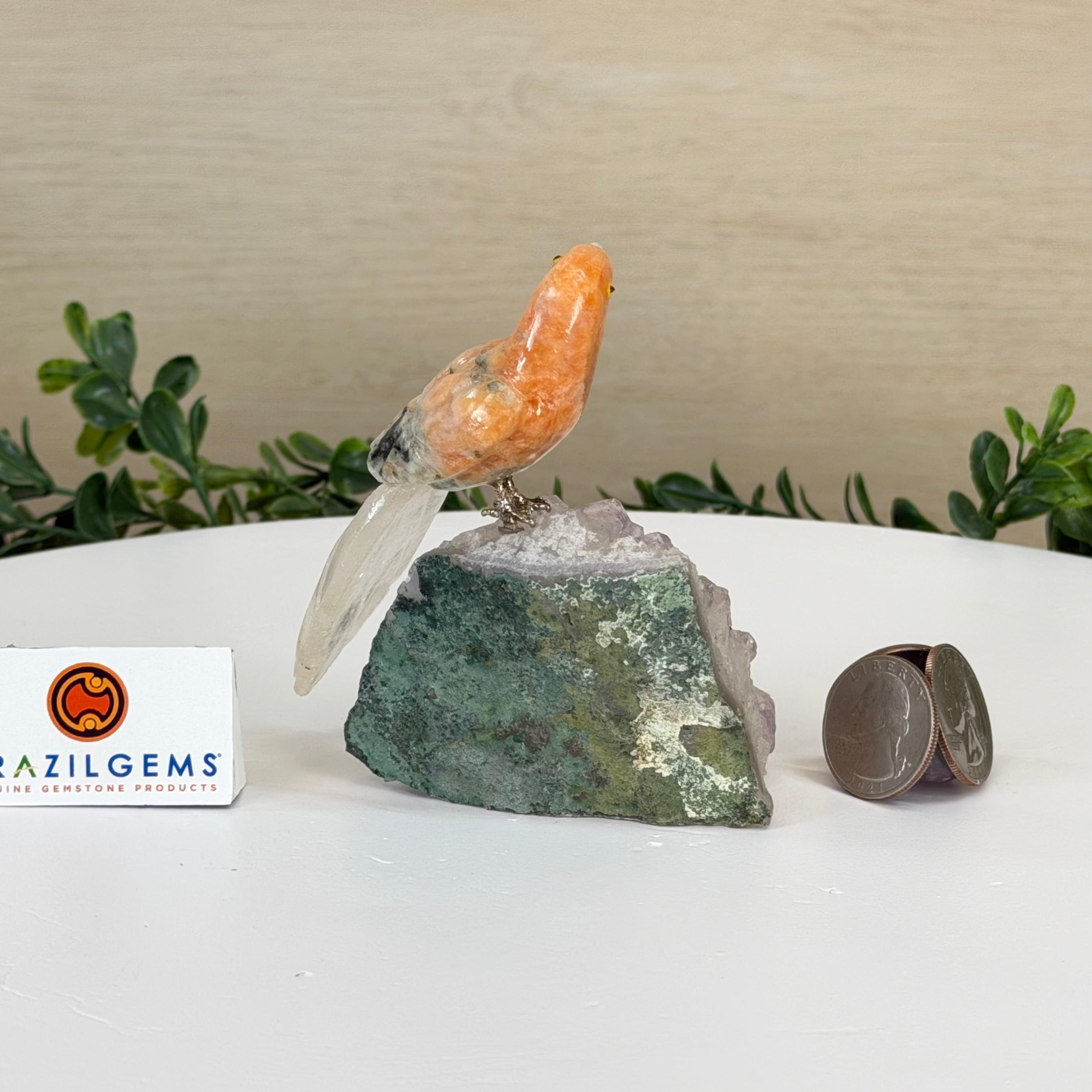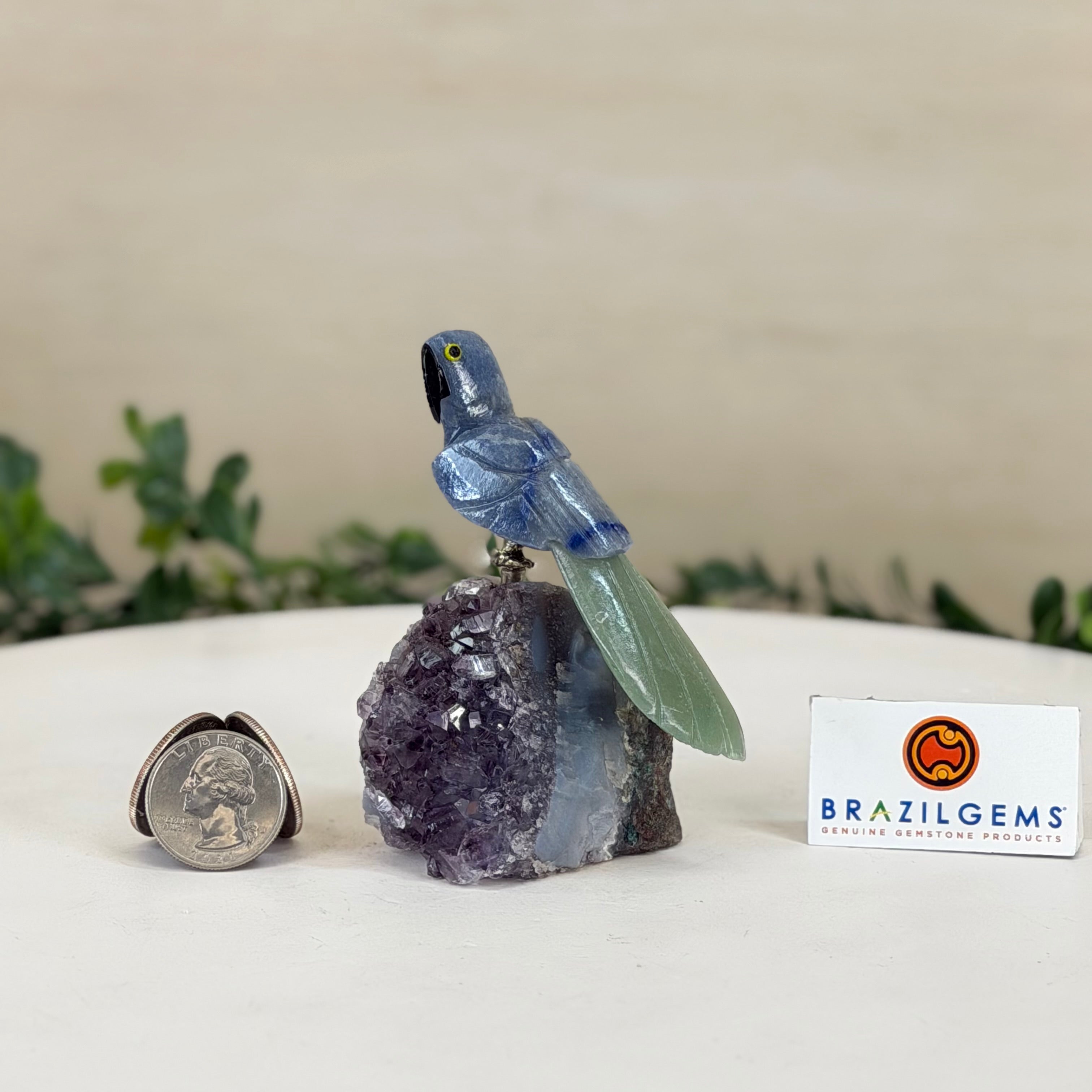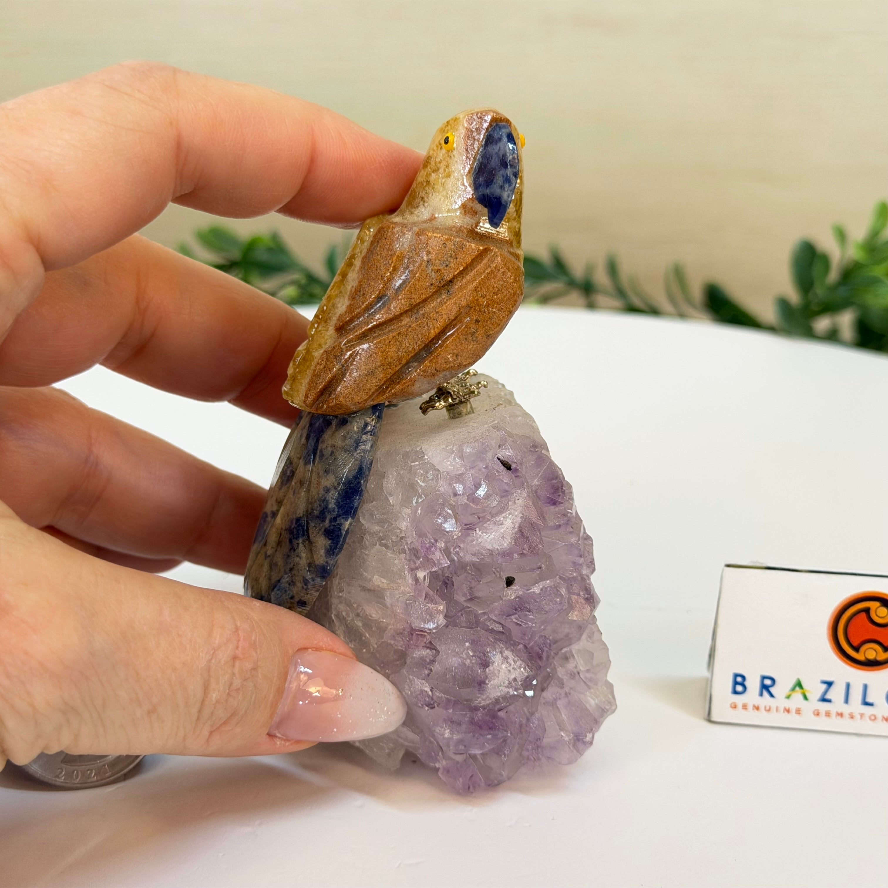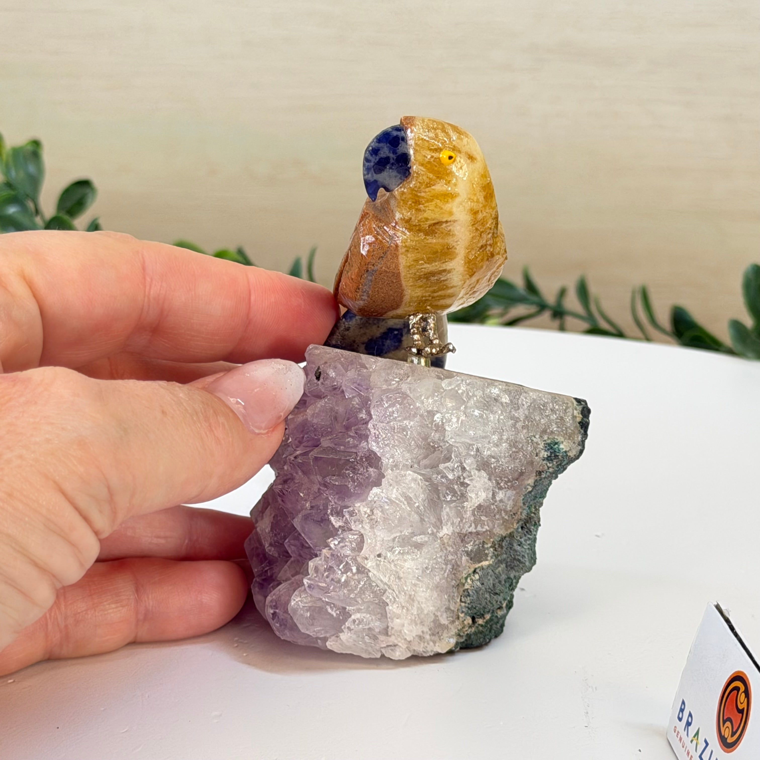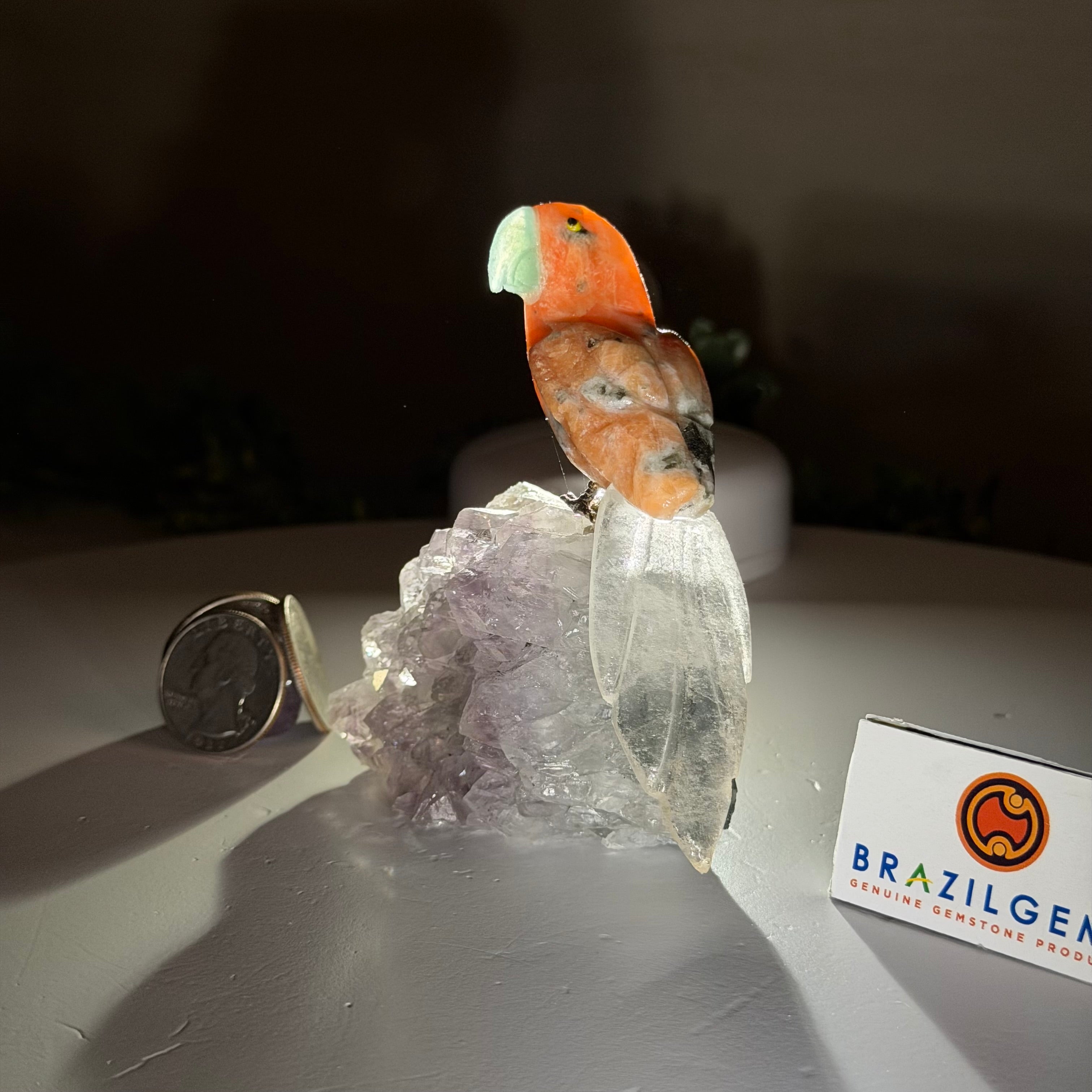 Each intricate detail of these birds is meticulously carved by skilled Brazilian artisans who have mastered the technique that combines the beauty of Brazil's gemstones with their colorful native birds into an amazing art piece. Elevate your space with the timeless charm of our Gemstone birds on an crystal cluster bases.