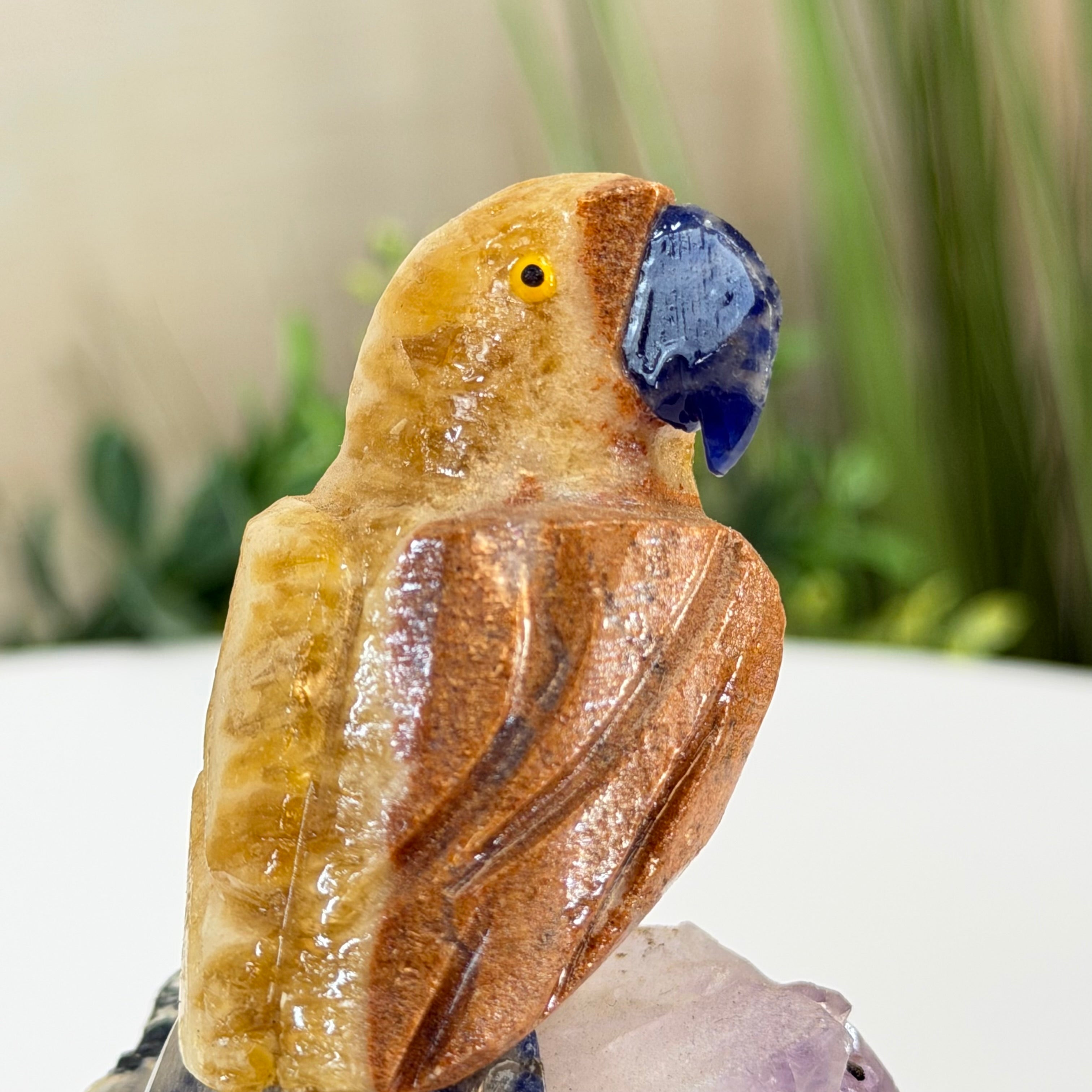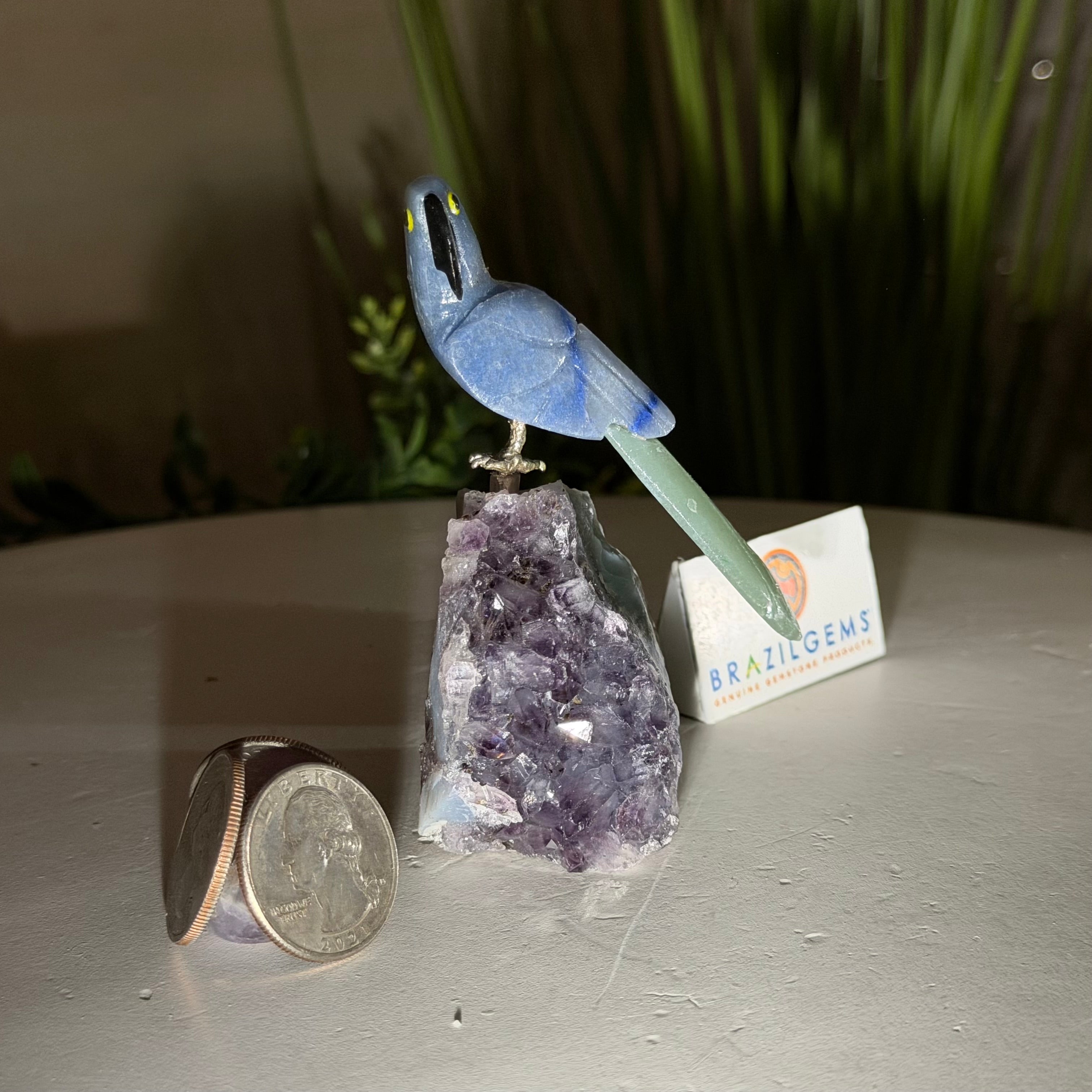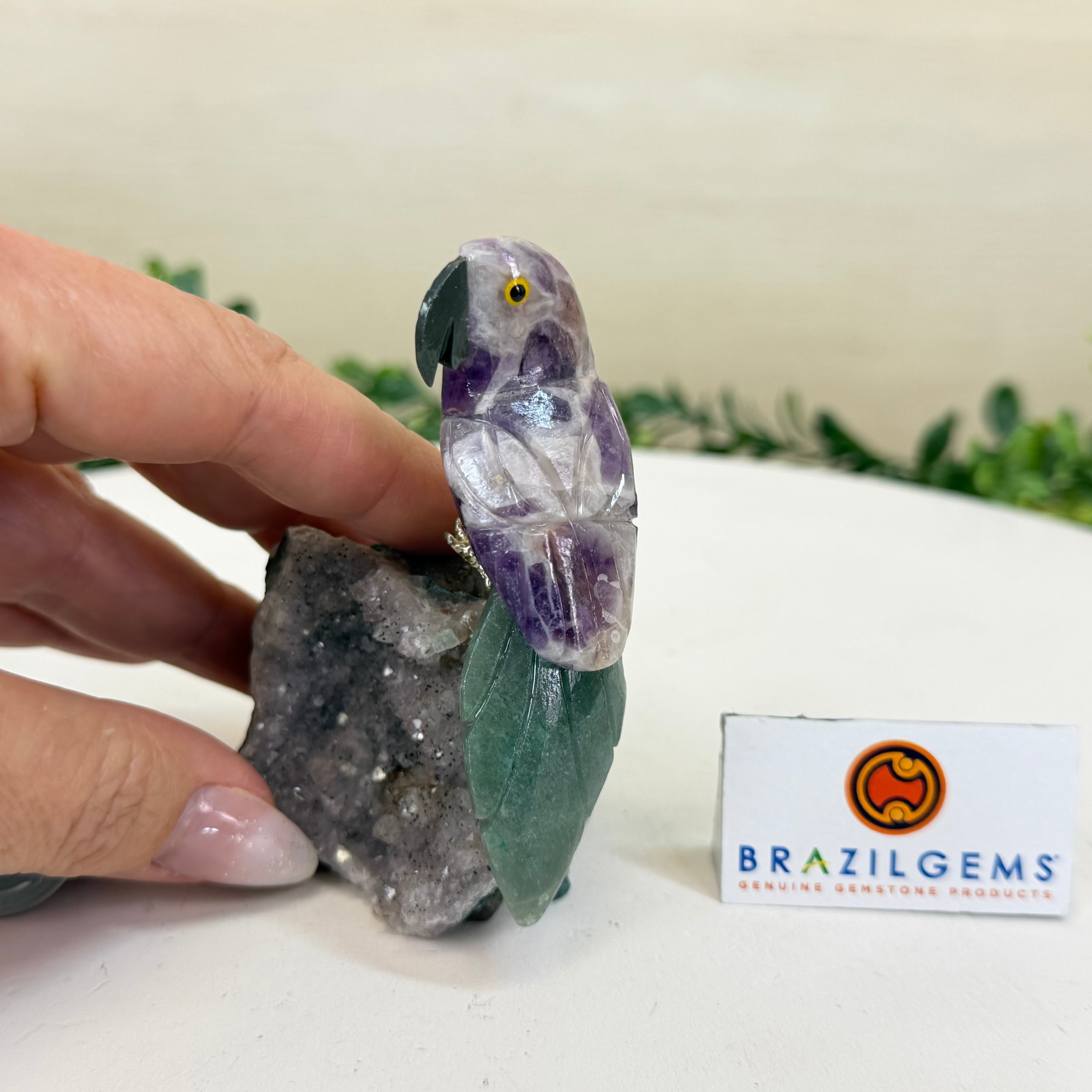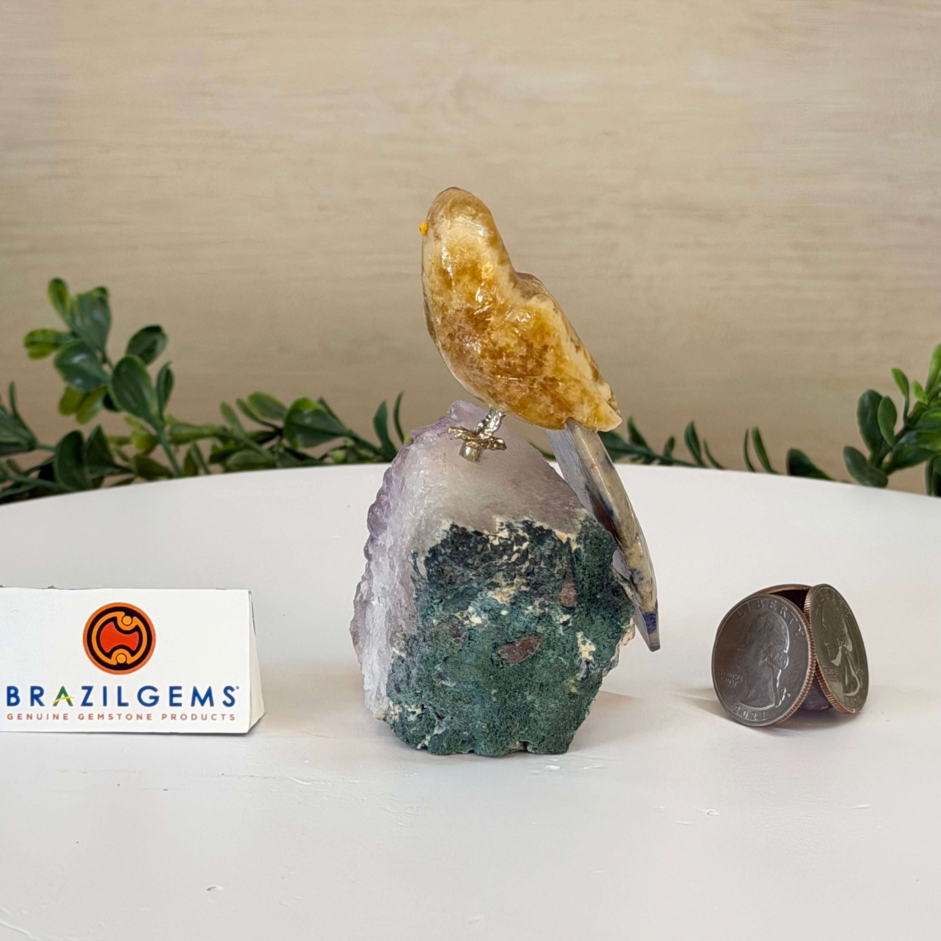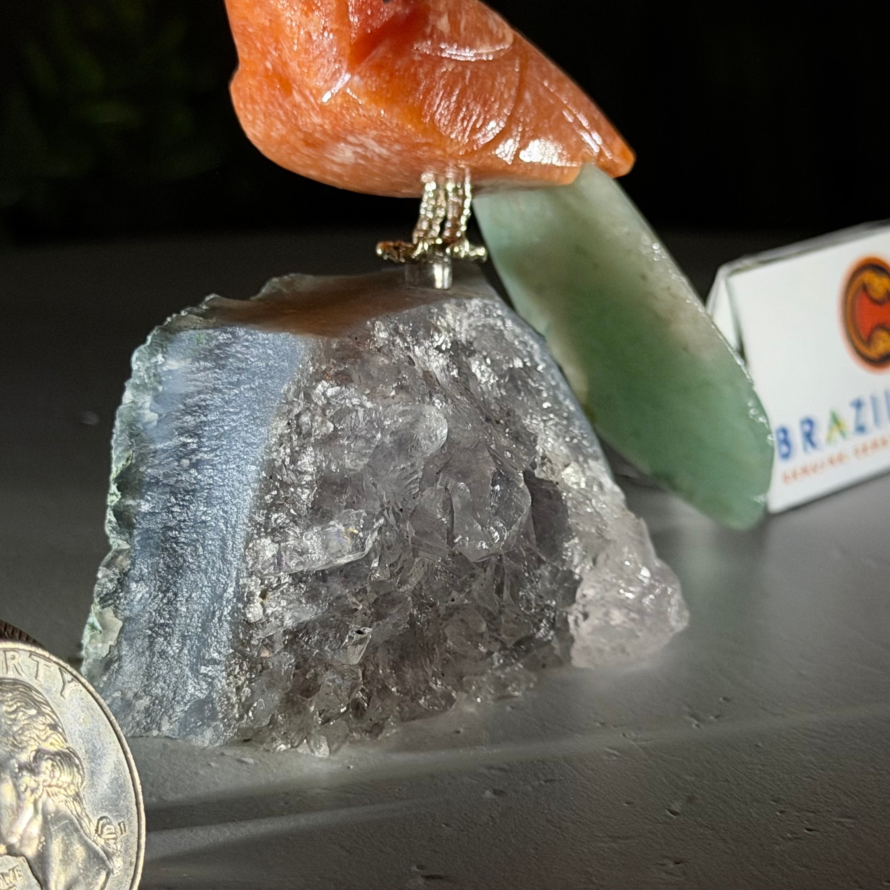 Each intricate detail of these birds is meticulously carved by skilled Brazilian artisans who have mastered the technique that combines the beauty of Brazil's gemstones with their colorful native birds into an amazing art piece. Elevate your space with the timeless charm of our Gemstone birds on an crystal cluster bases.