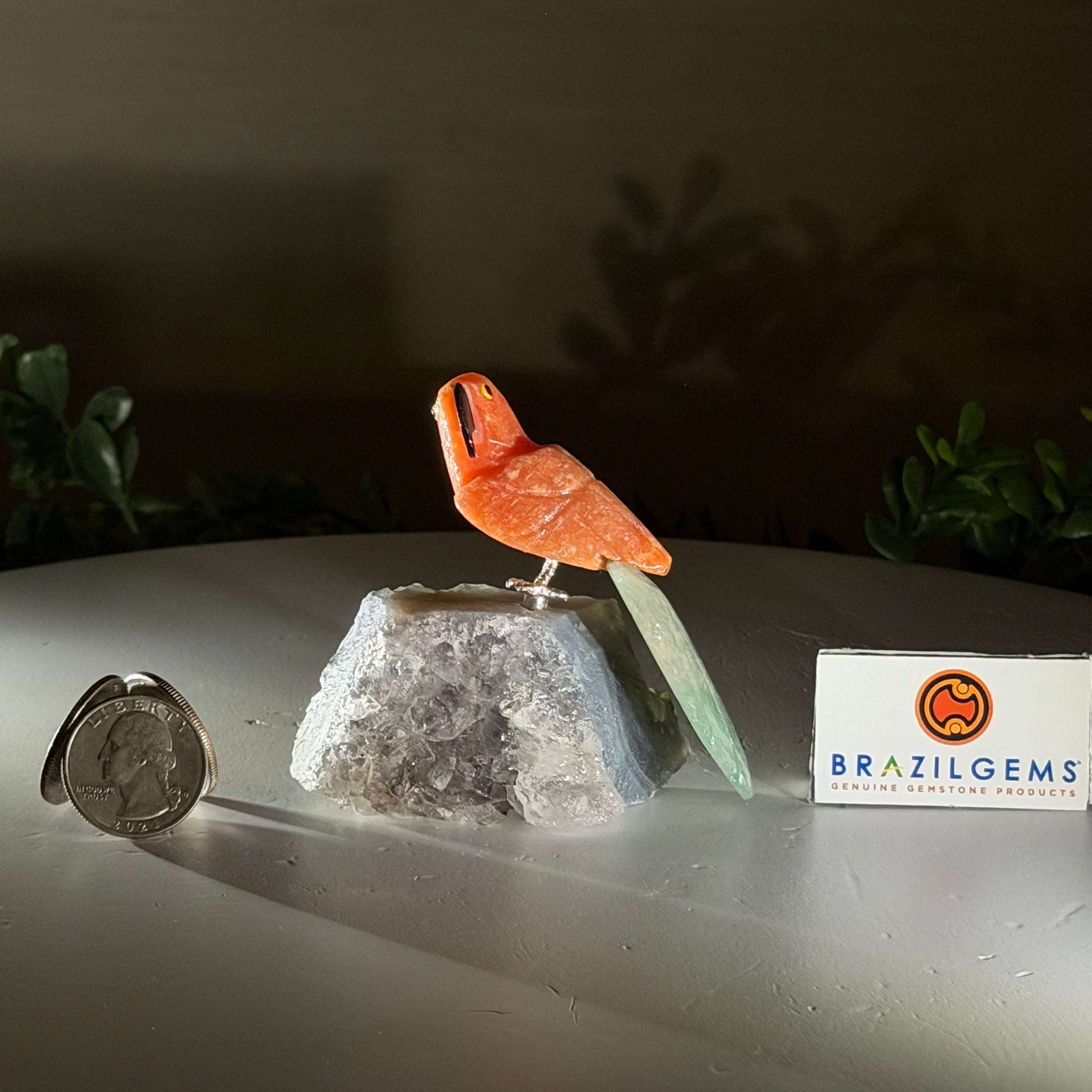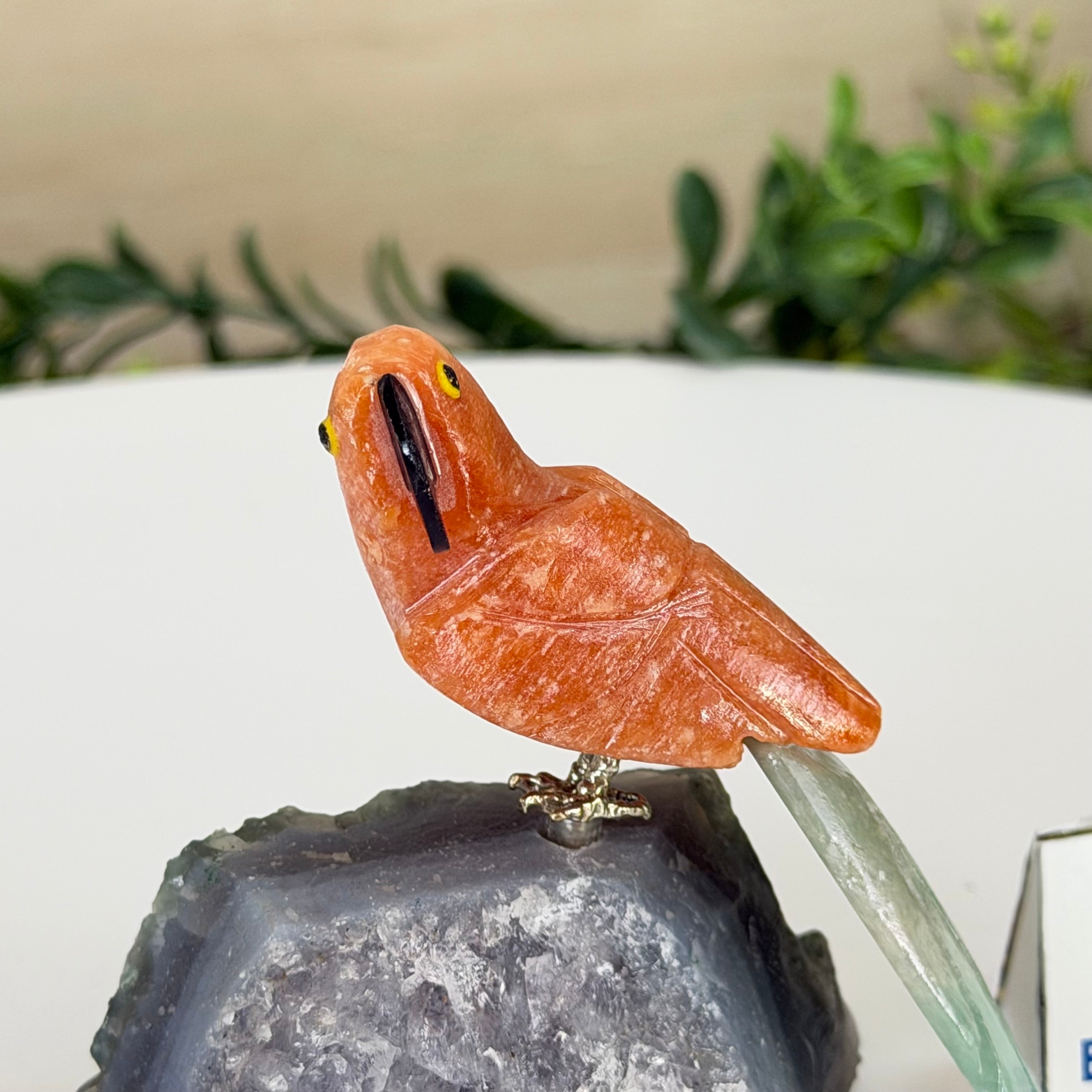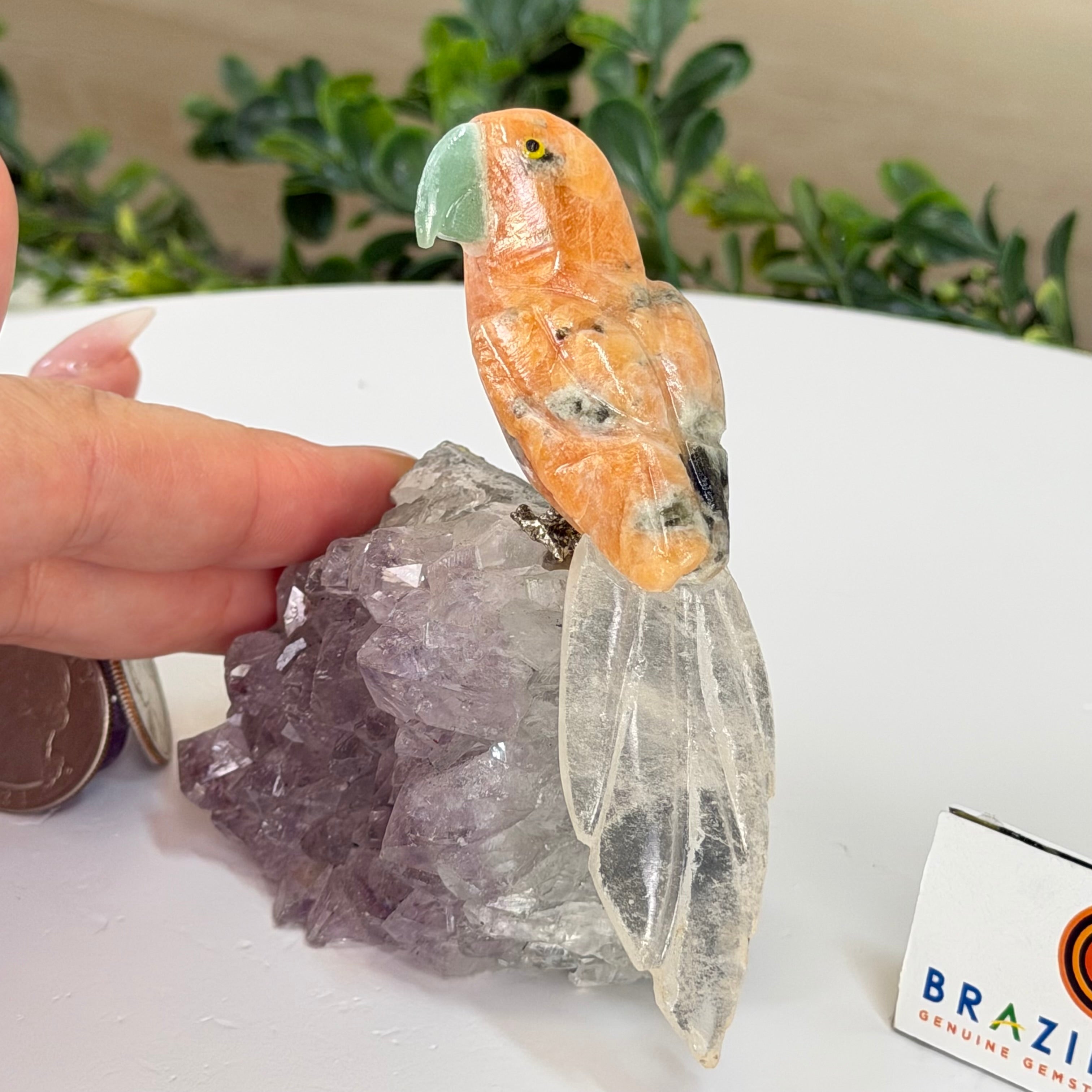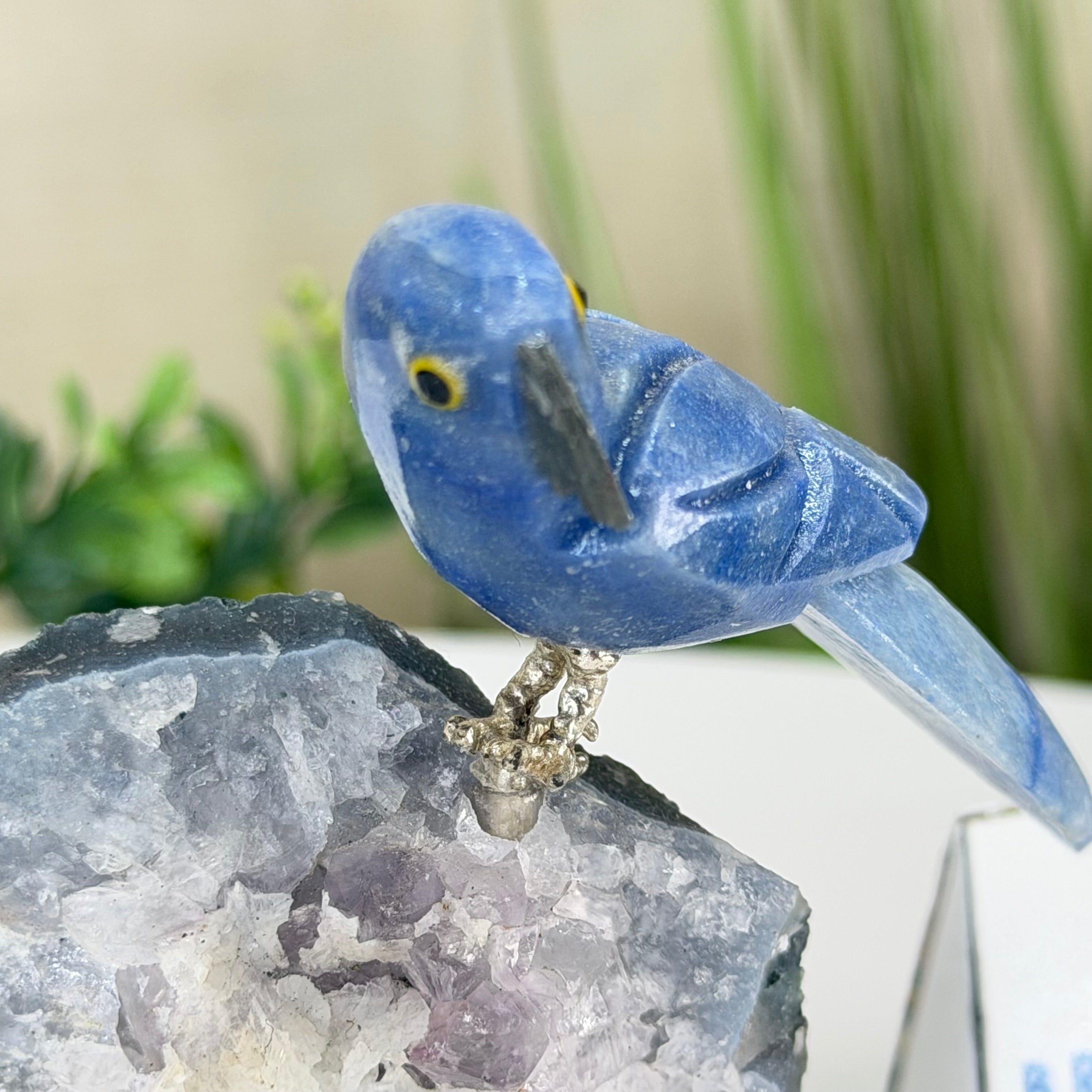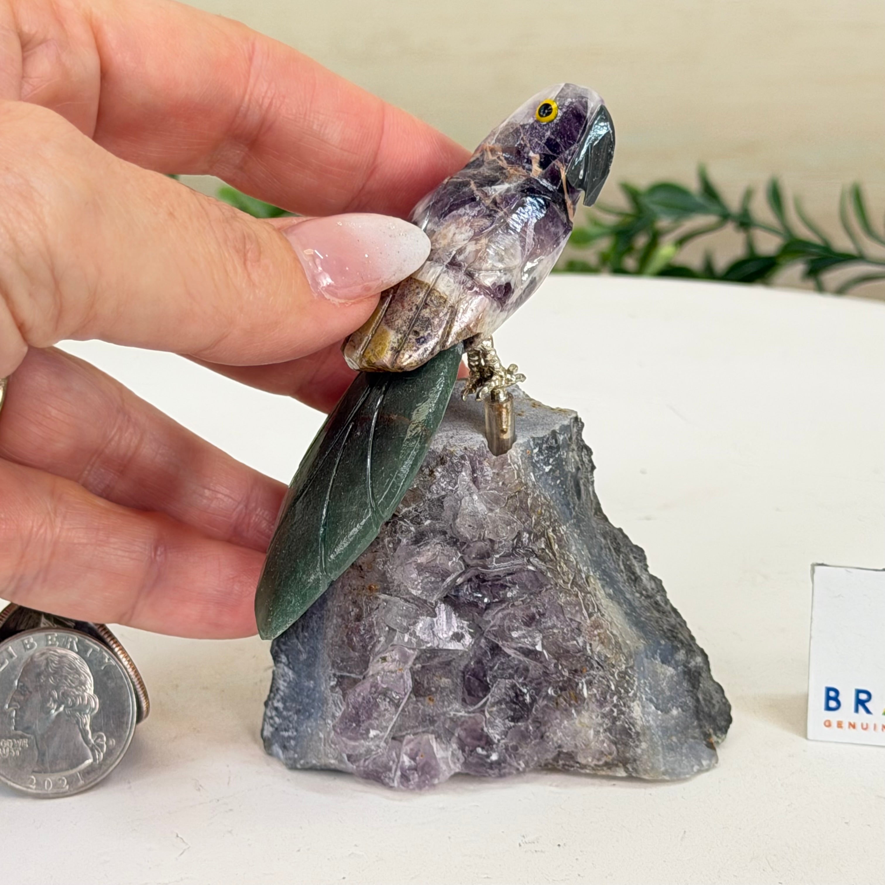Each intricate detail of these birds is meticulously carved by skilled Brazilian artisans who have mastered the technique that combines the beauty of Brazil's gemstones with their colorful native birds into an amazing art piece. Elevate your space with the timeless charm of our Gemstone birds on an crystal cluster bases.