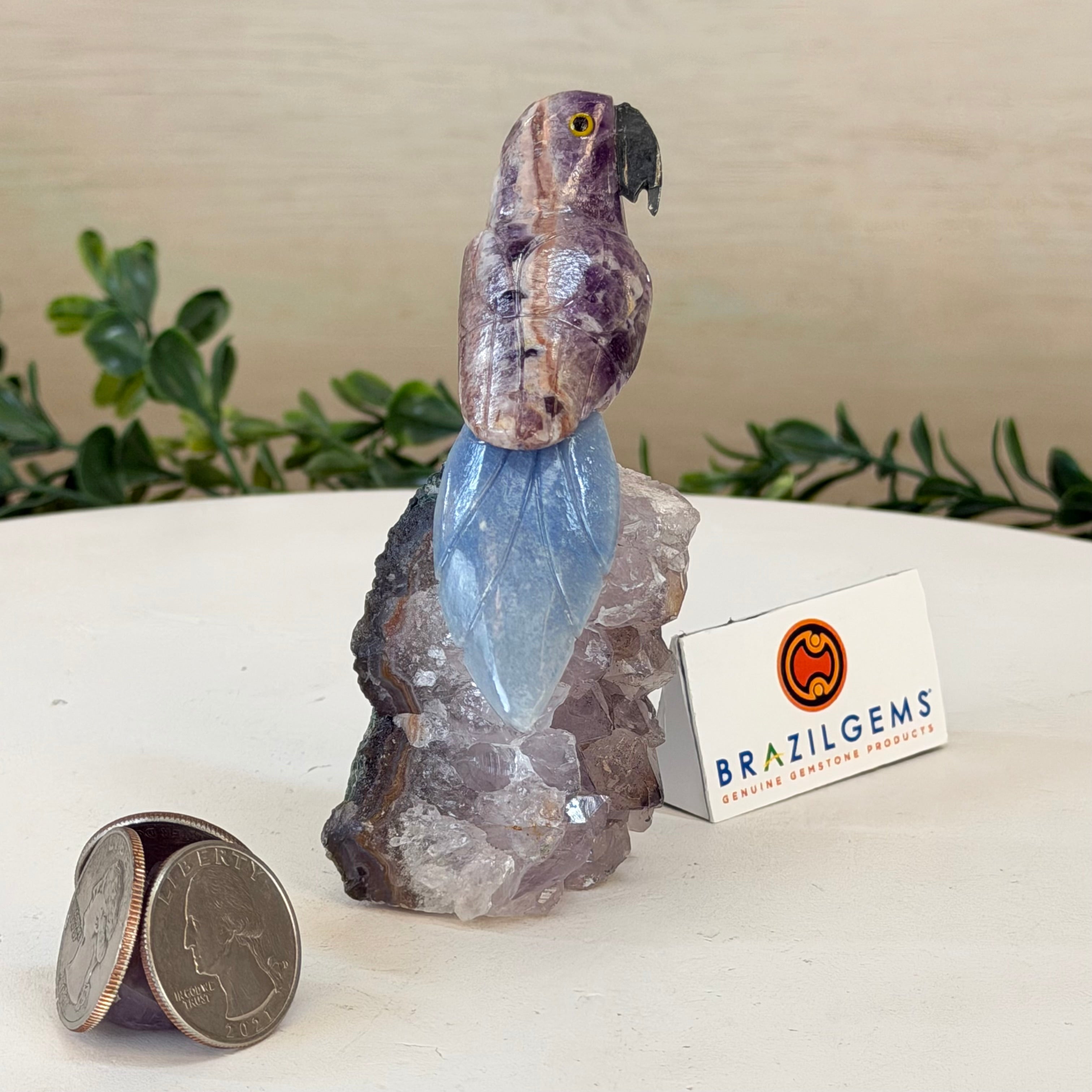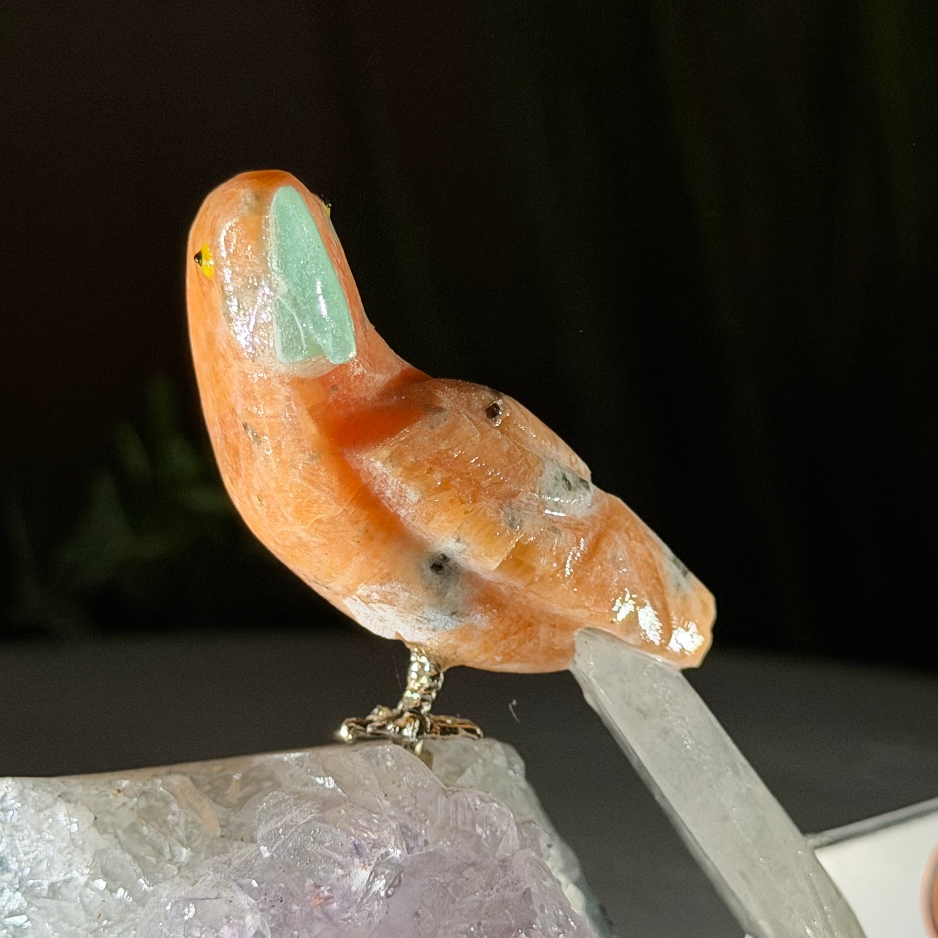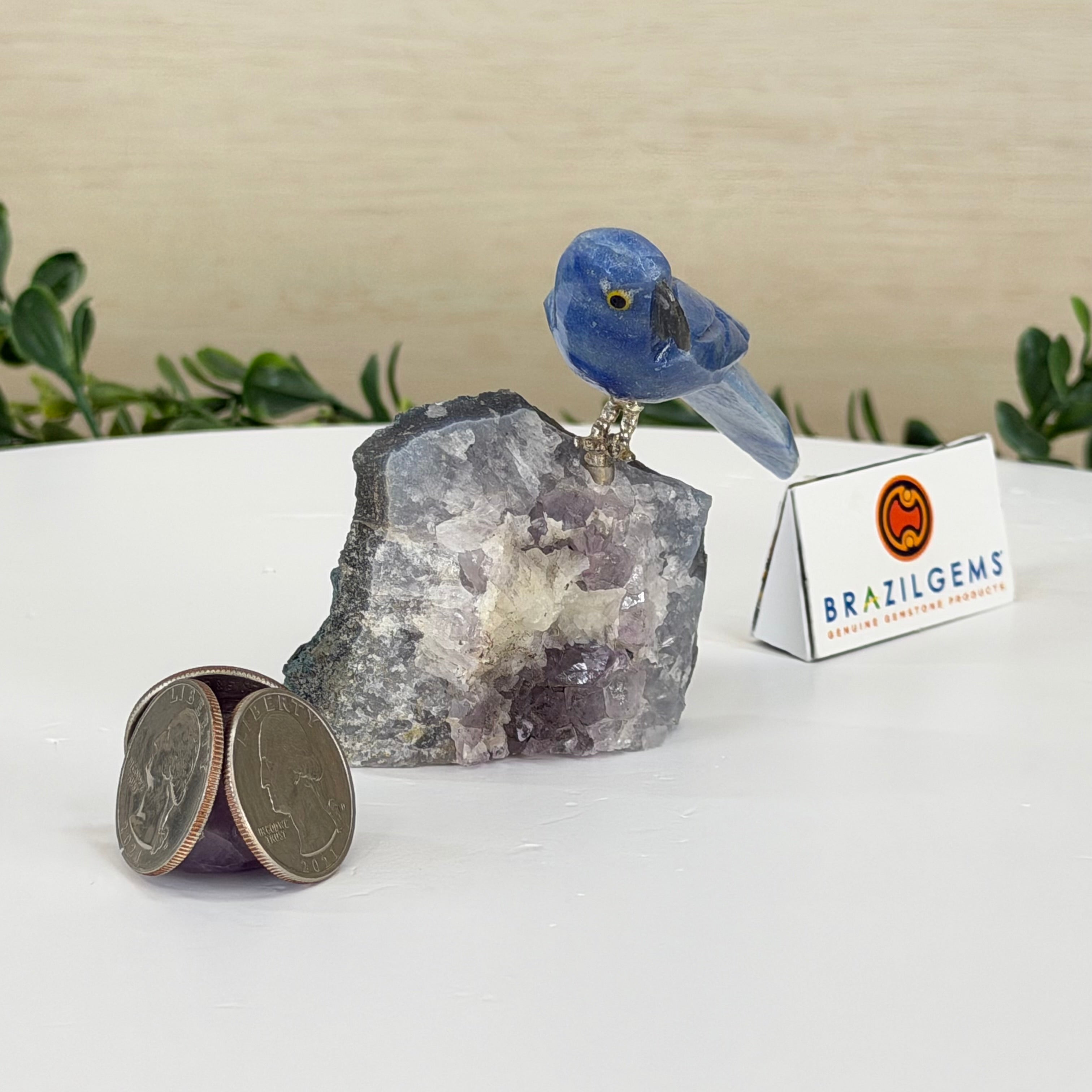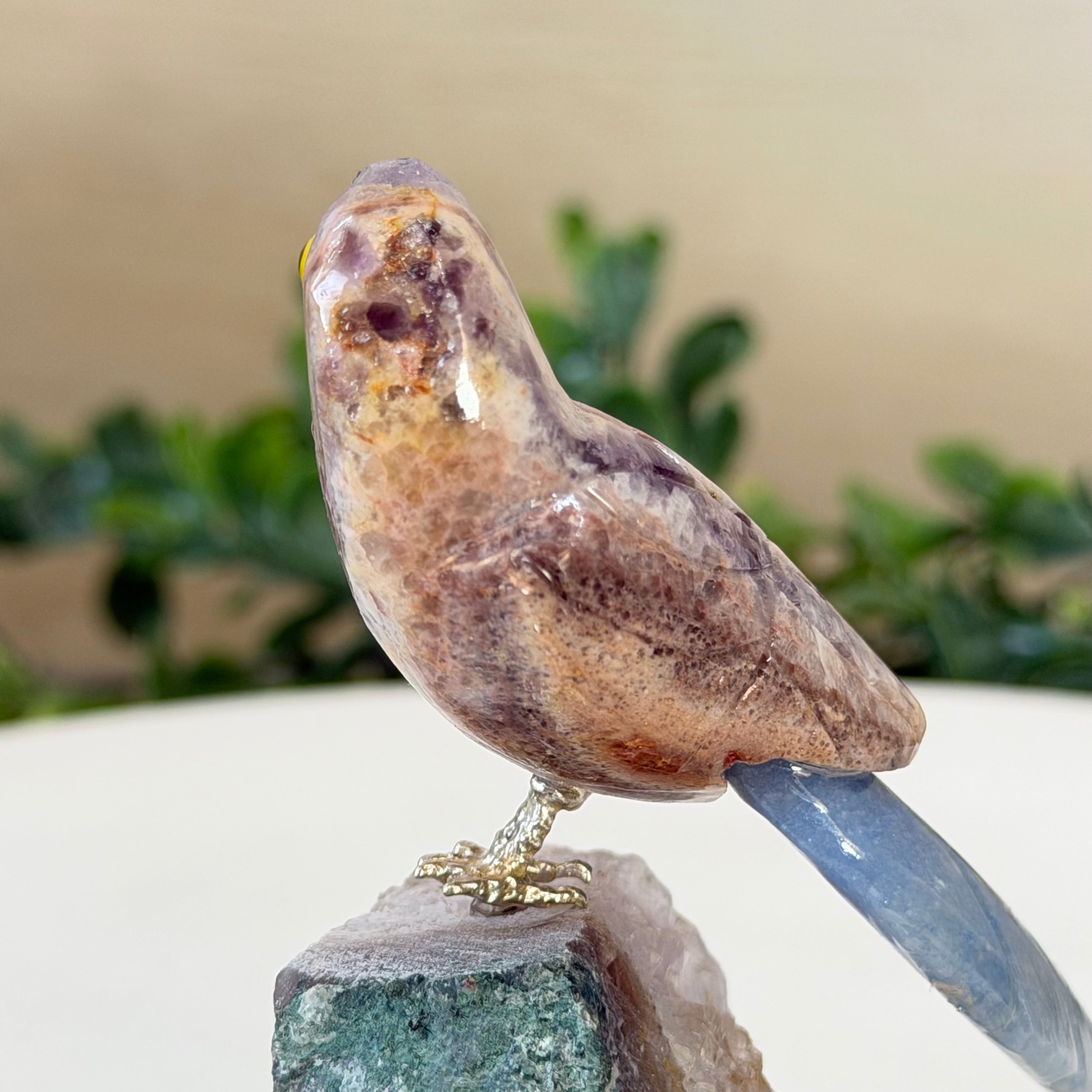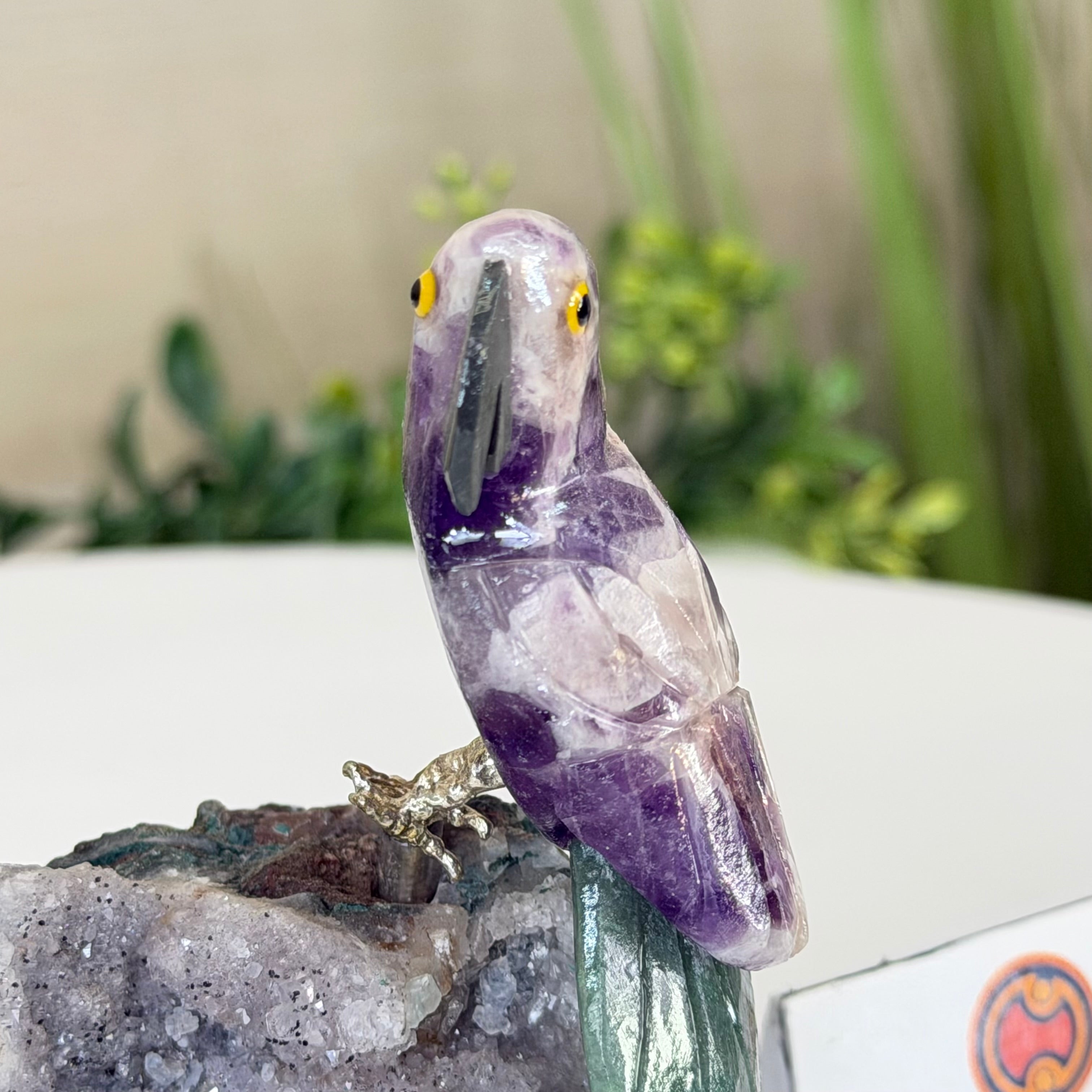 Each intricate detail of these birds is meticulously carved by skilled Brazilian artisans who have mastered the technique that combines the beauty of Brazil's gemstones with their colorful native birds into an amazing art piece. Elevate your space with the timeless charm of our Gemstone birds on an crystal cluster bases.
