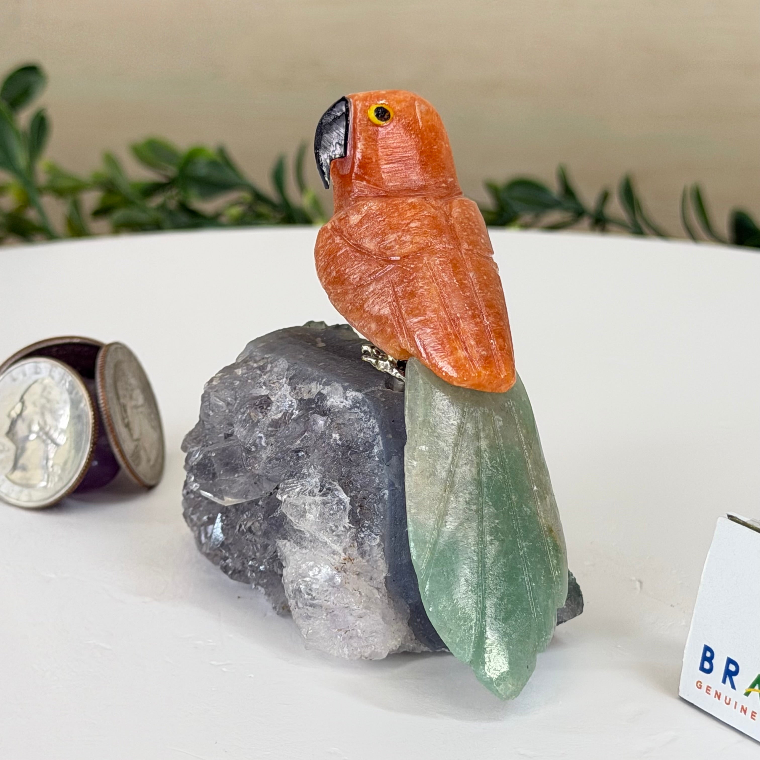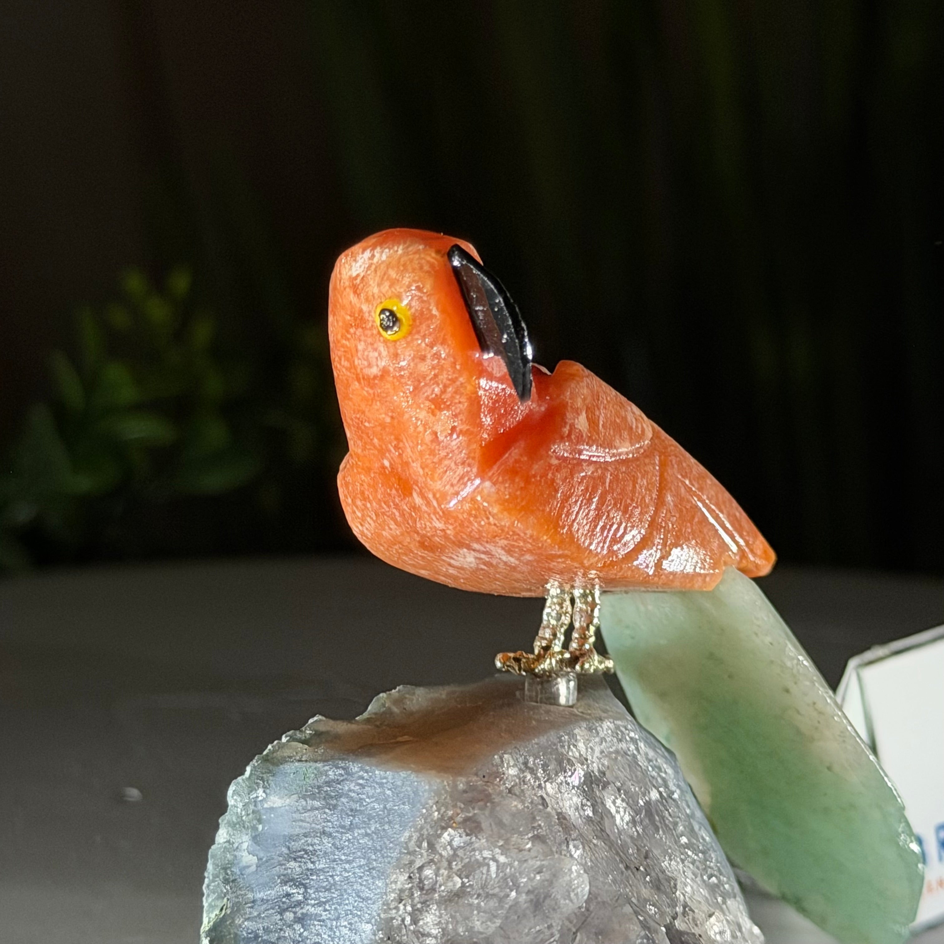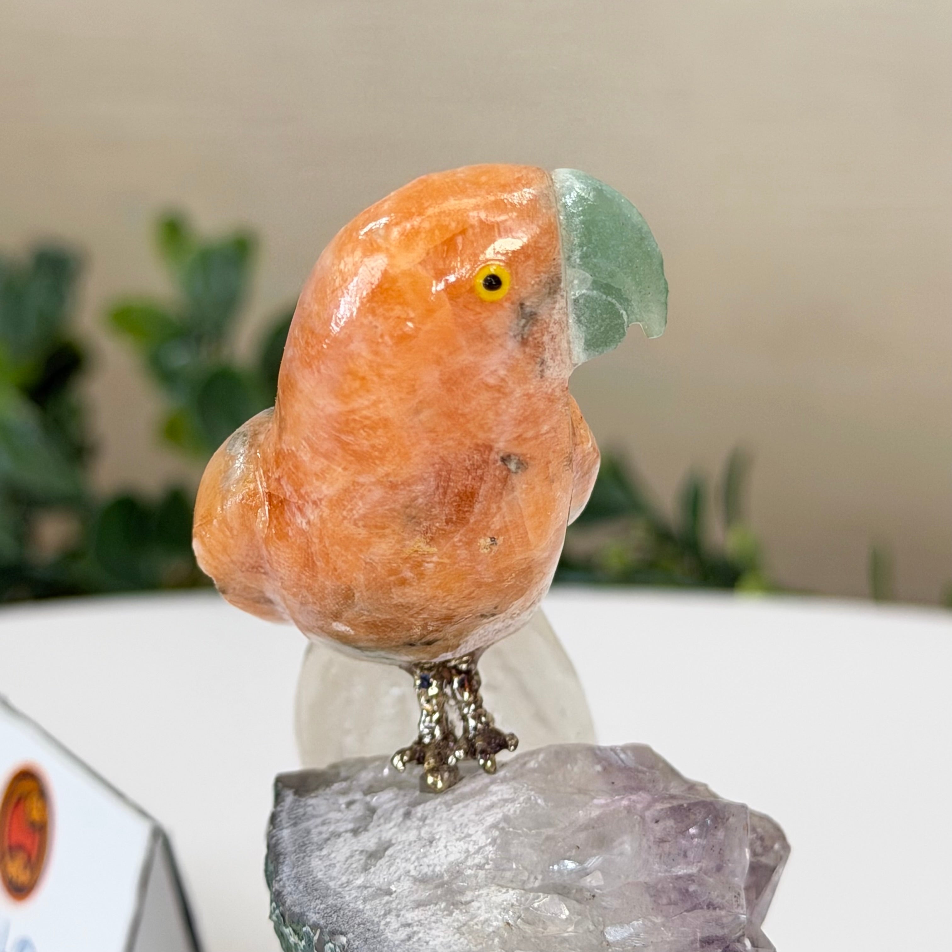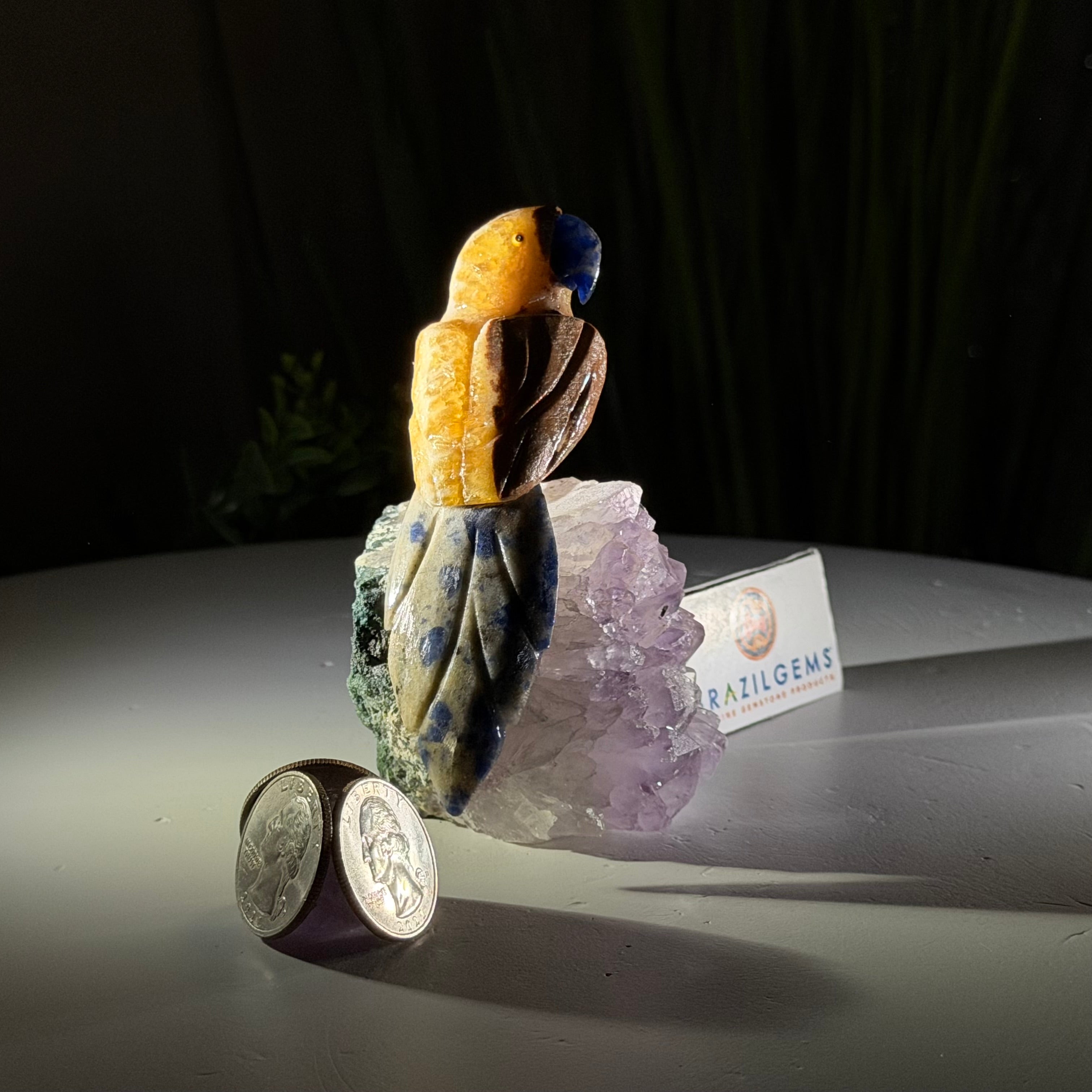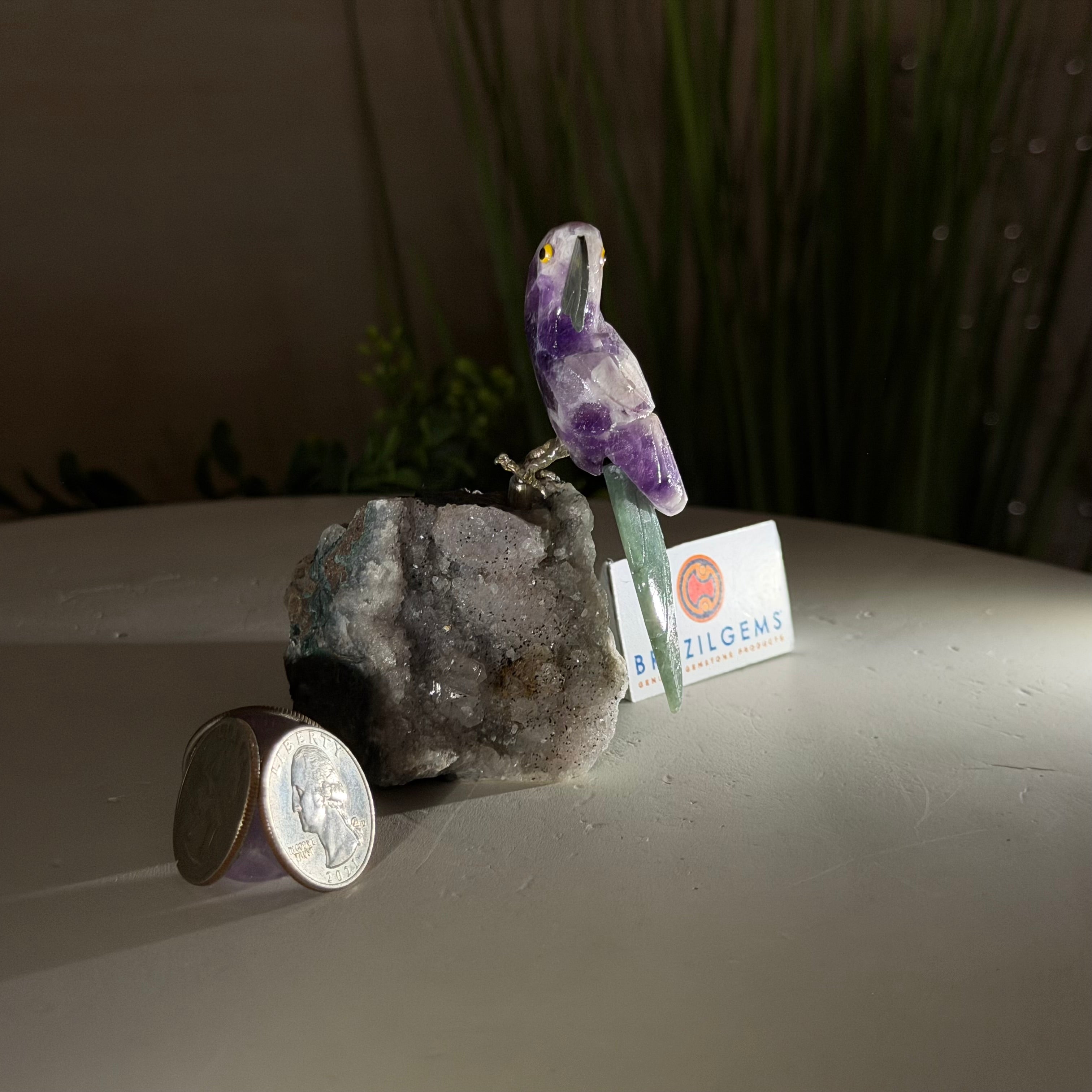 Each intricate detail of these birds is meticulously carved by skilled Brazilian artisans who have mastered the technique that combines the beauty of Brazil's gemstones with their colorful native birds into an amazing art piece. Elevate your space with the timeless charm of our Gemstone birds on an crystal cluster bases.