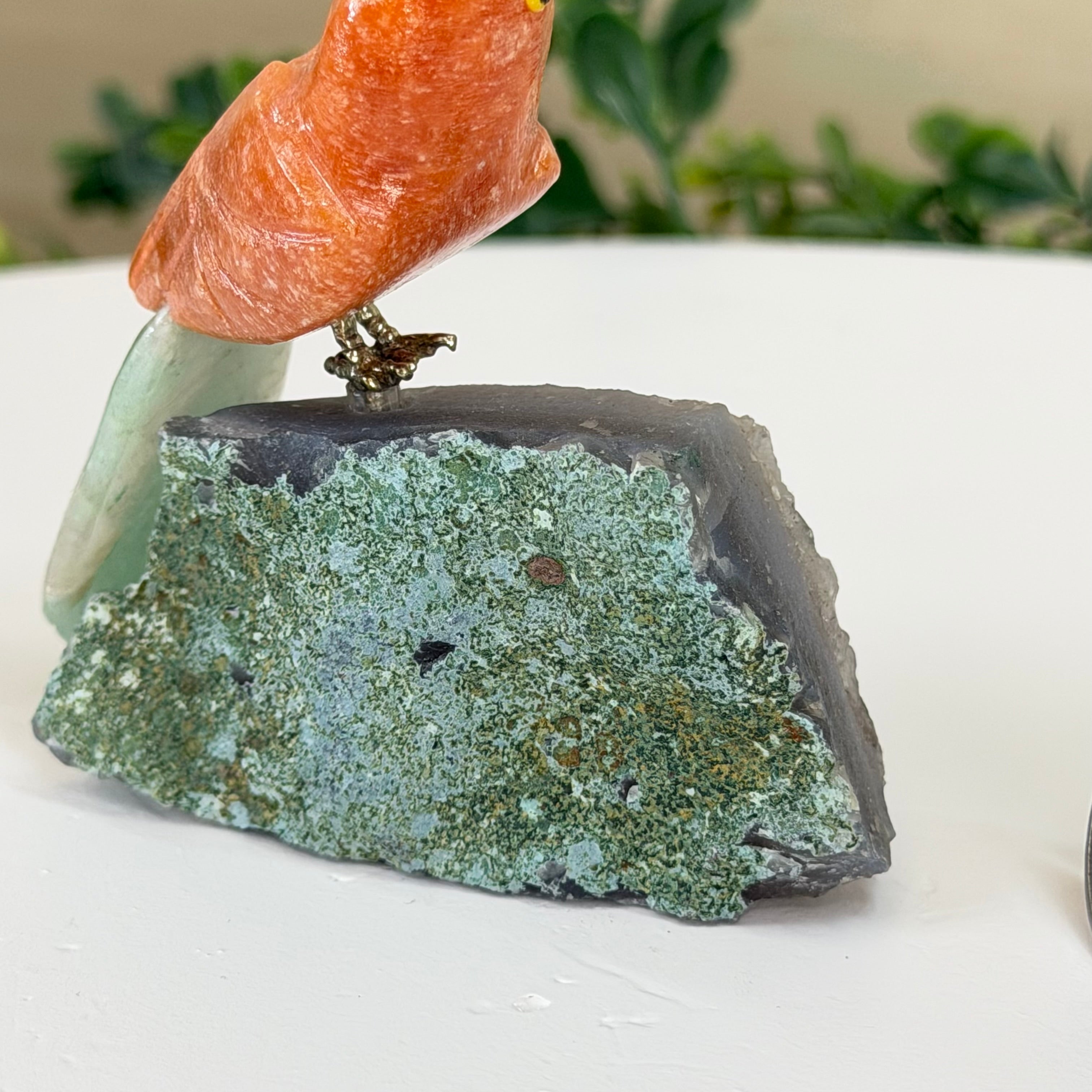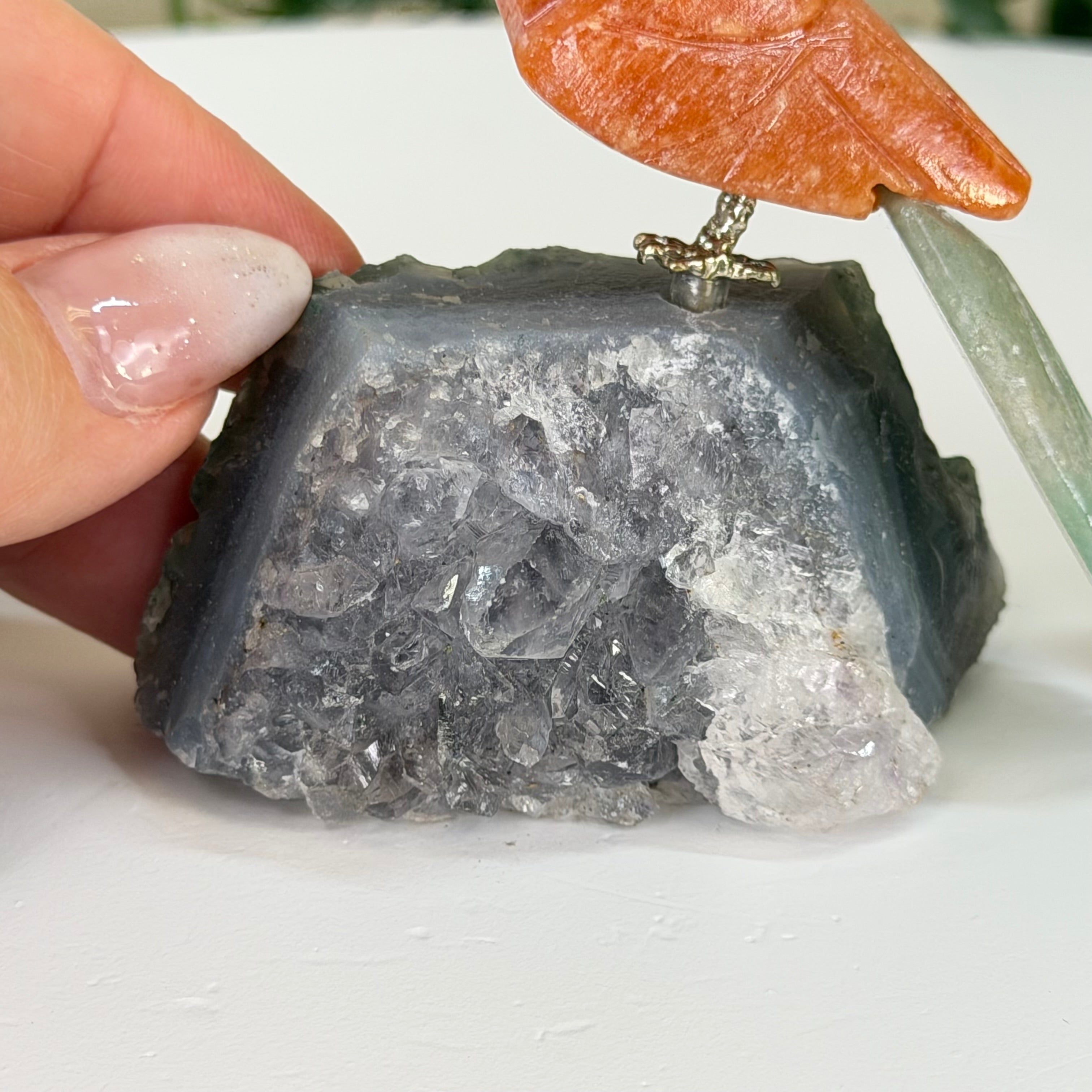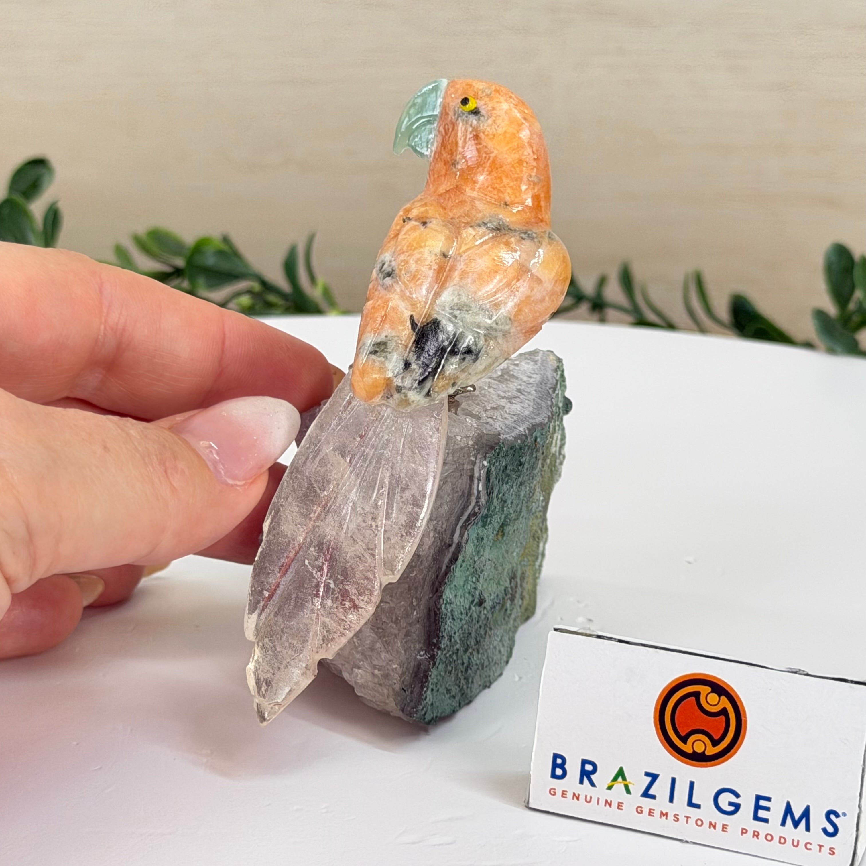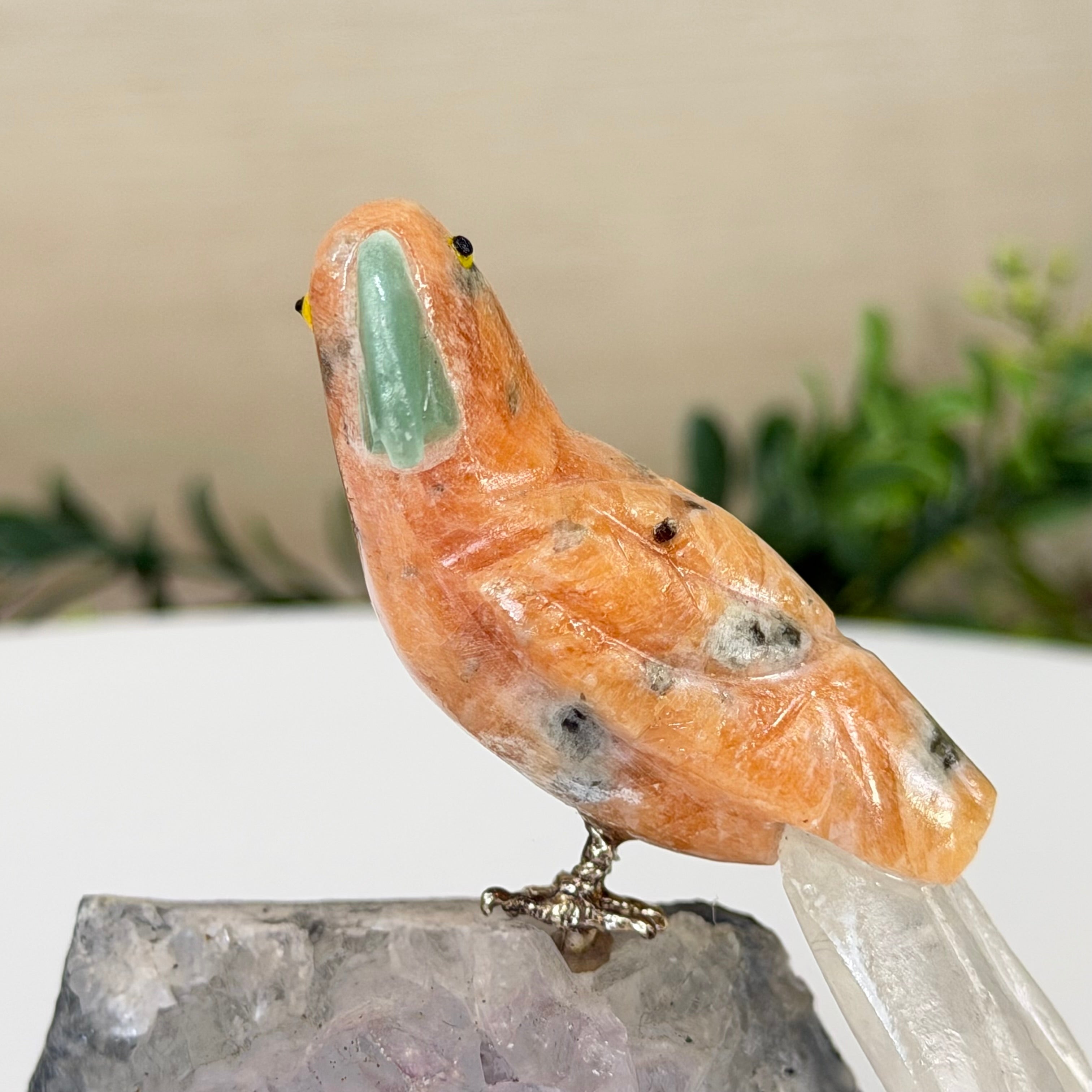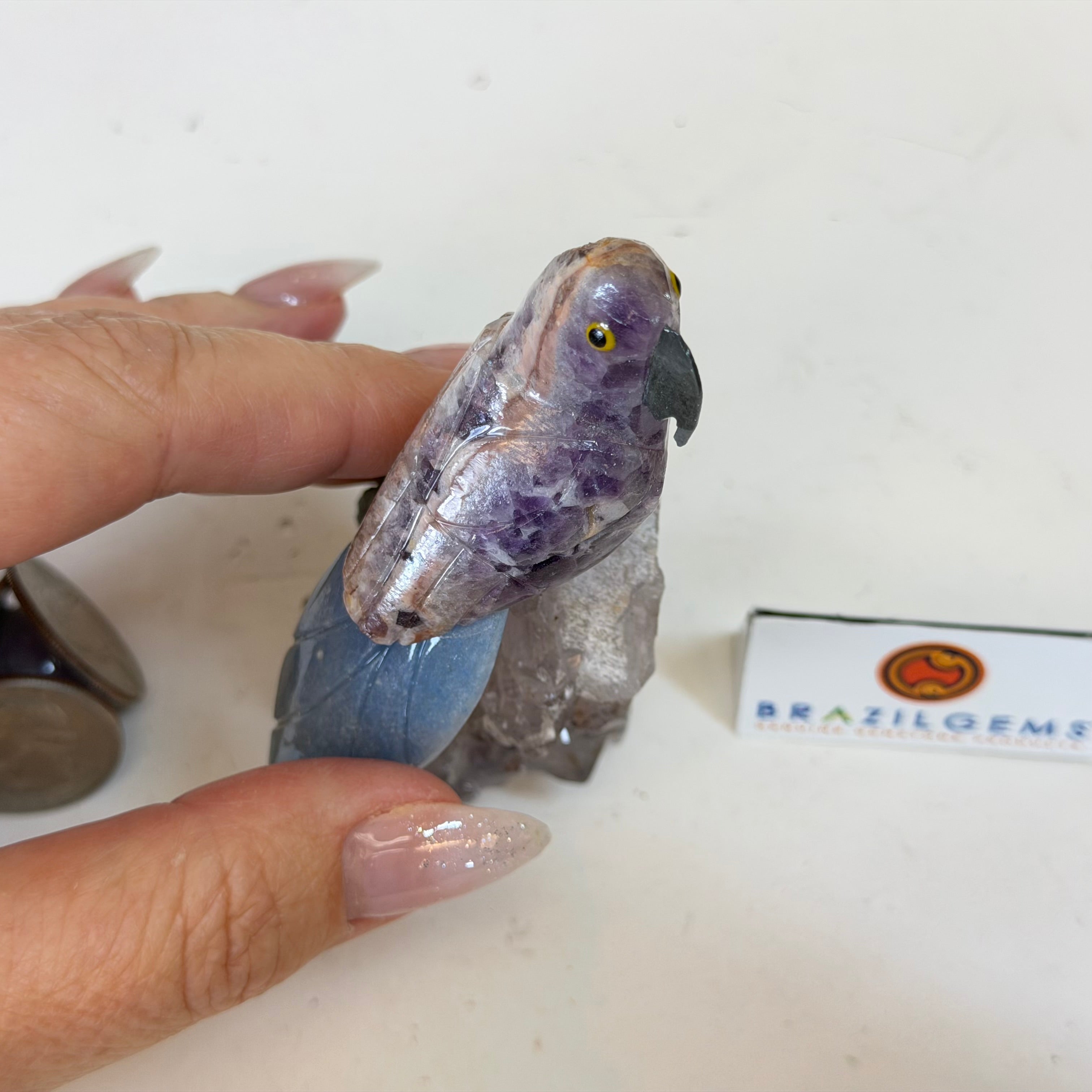 Each intricate detail of these birds is meticulously carved by skilled Brazilian artisans who have mastered the technique that combines the beauty of Brazil's gemstones with their colorful native birds into an amazing art piece. Elevate your space with the timeless charm of our Gemstone birds on an crystal cluster bases.