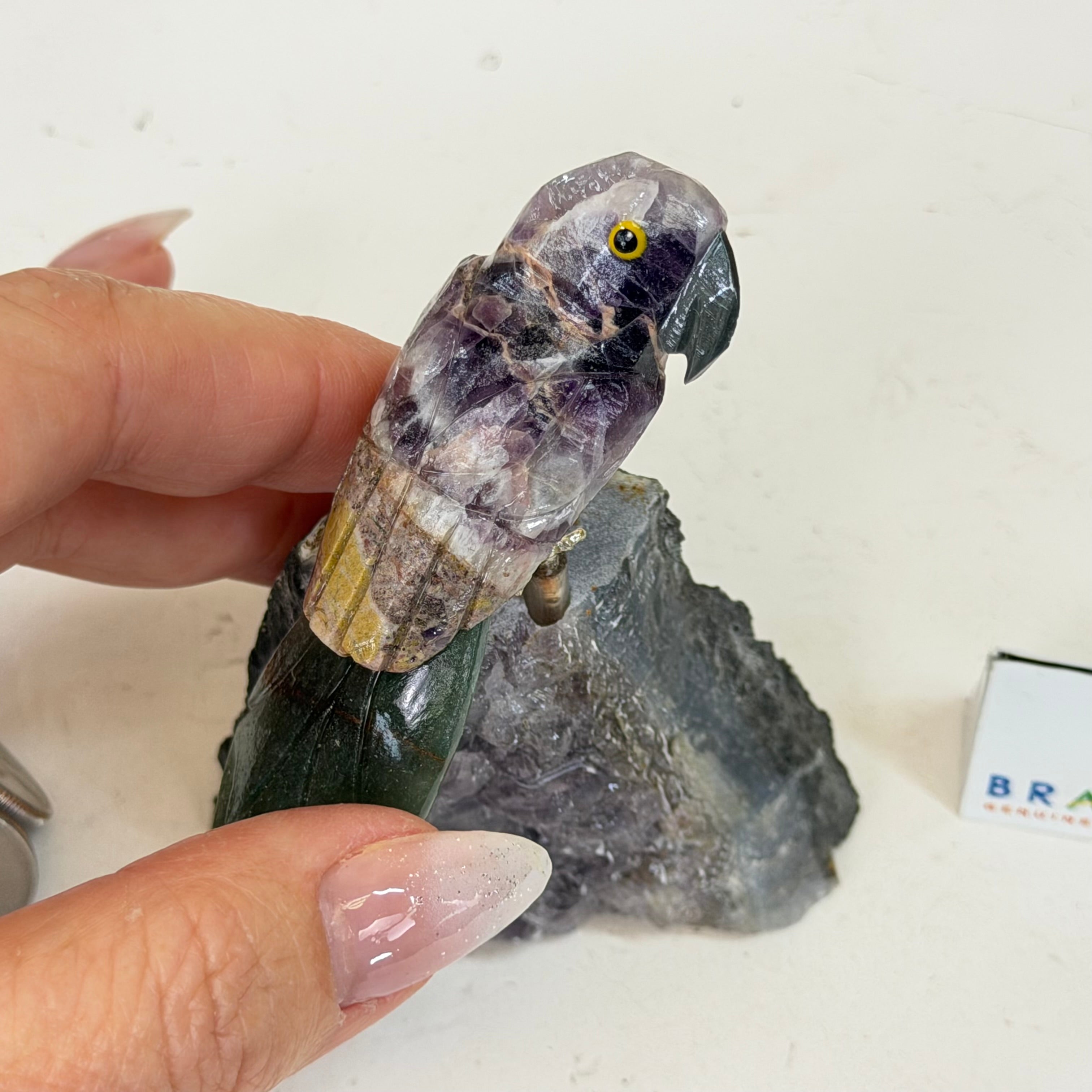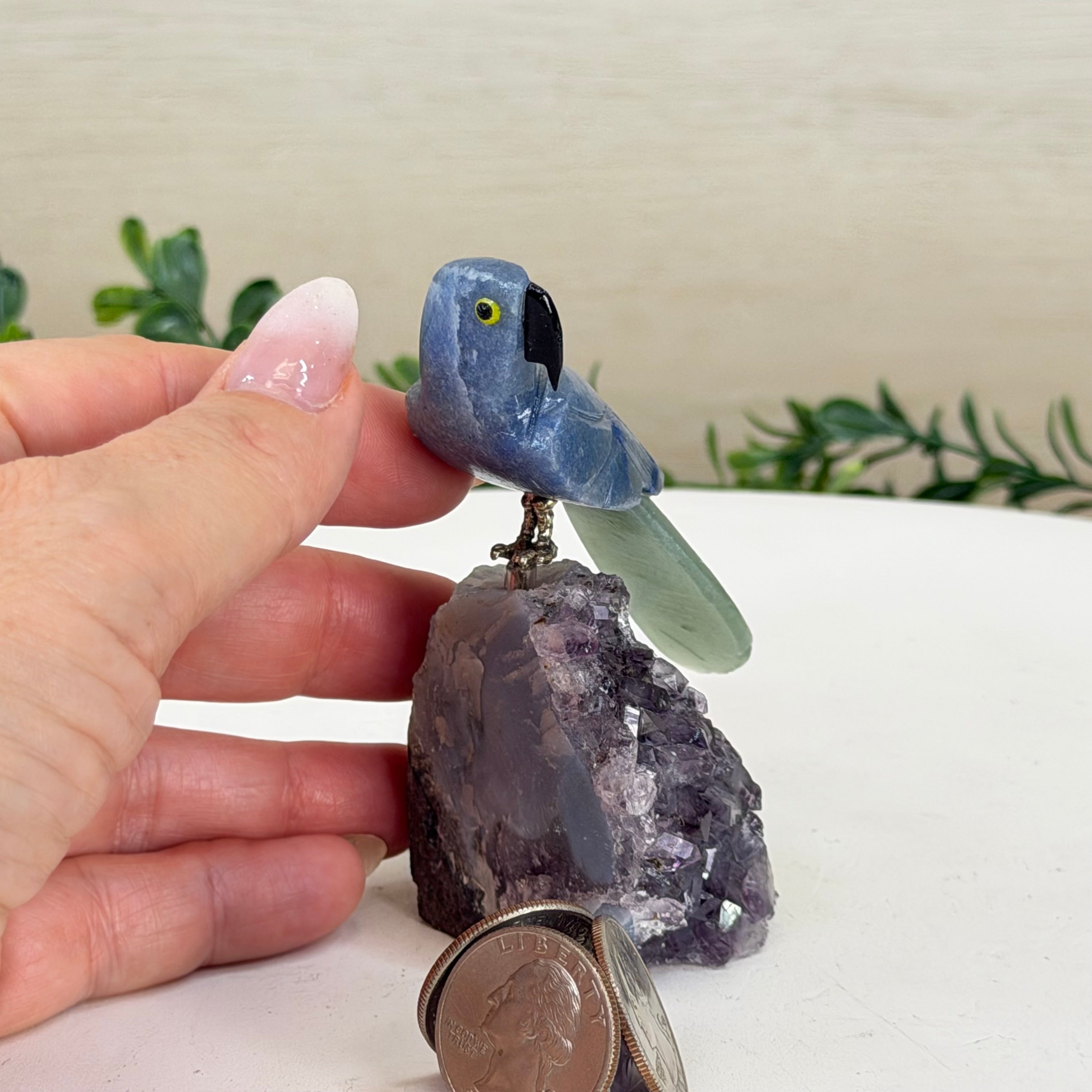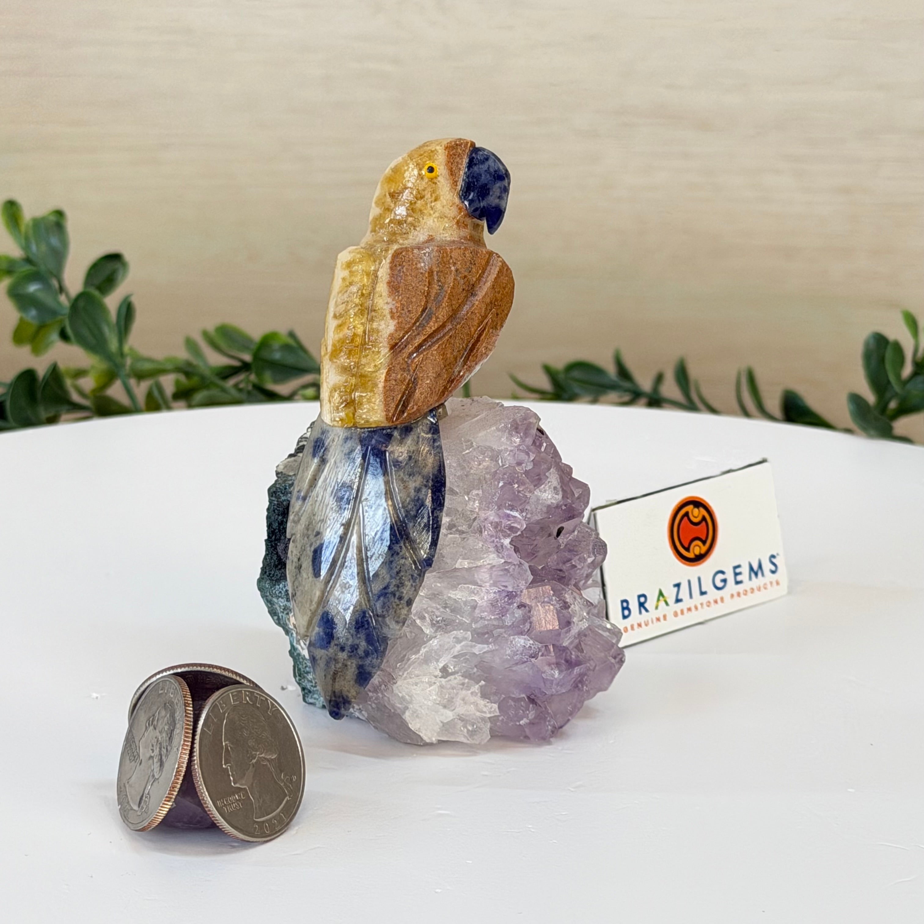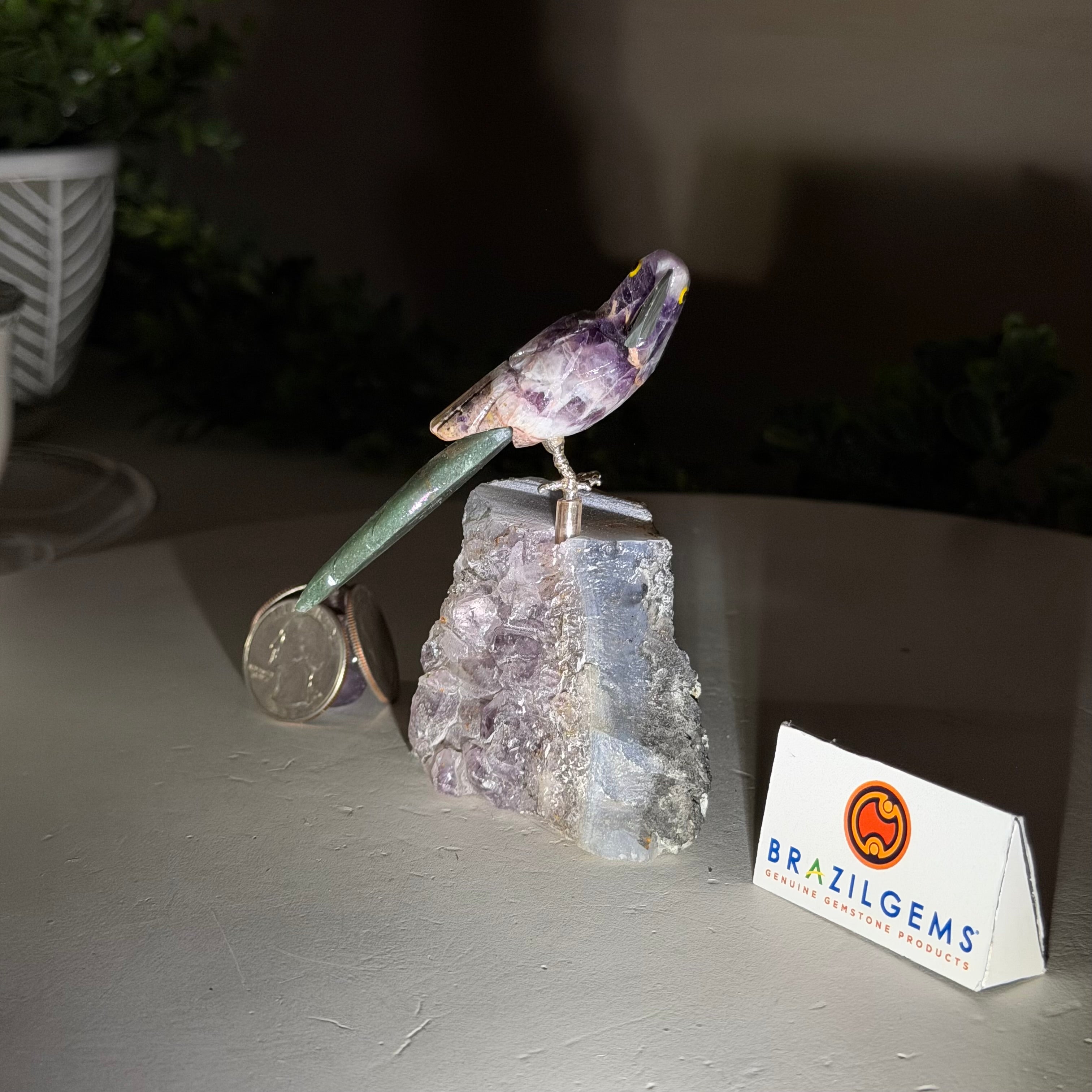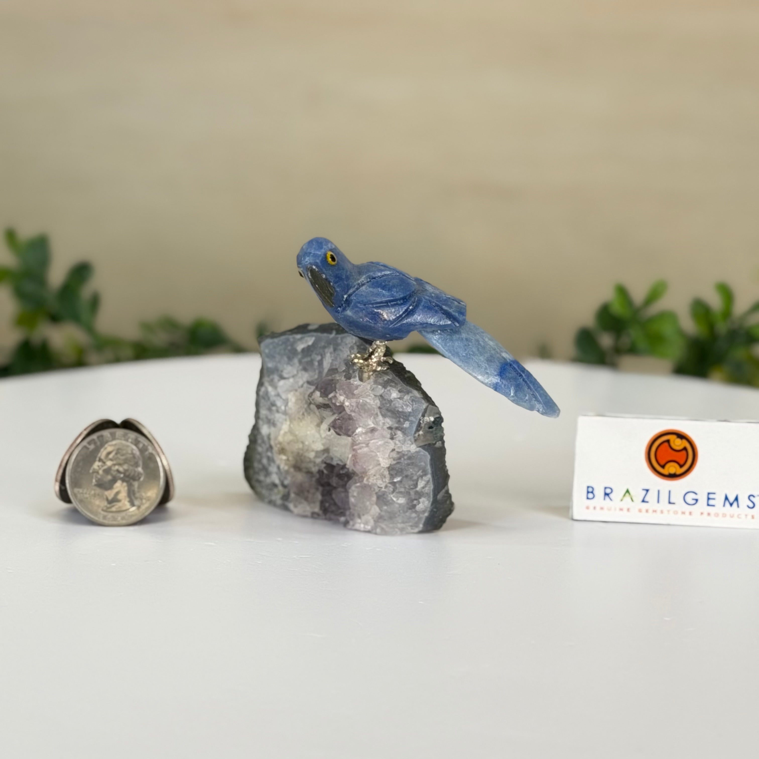 Each intricate detail of these birds is meticulously carved by skilled Brazilian artisans who have mastered the technique that combines the beauty of Brazil's gemstones with their colorful native birds into an amazing art piece. Elevate your space with the timeless charm of our Gemstone birds on an crystal cluster bases.