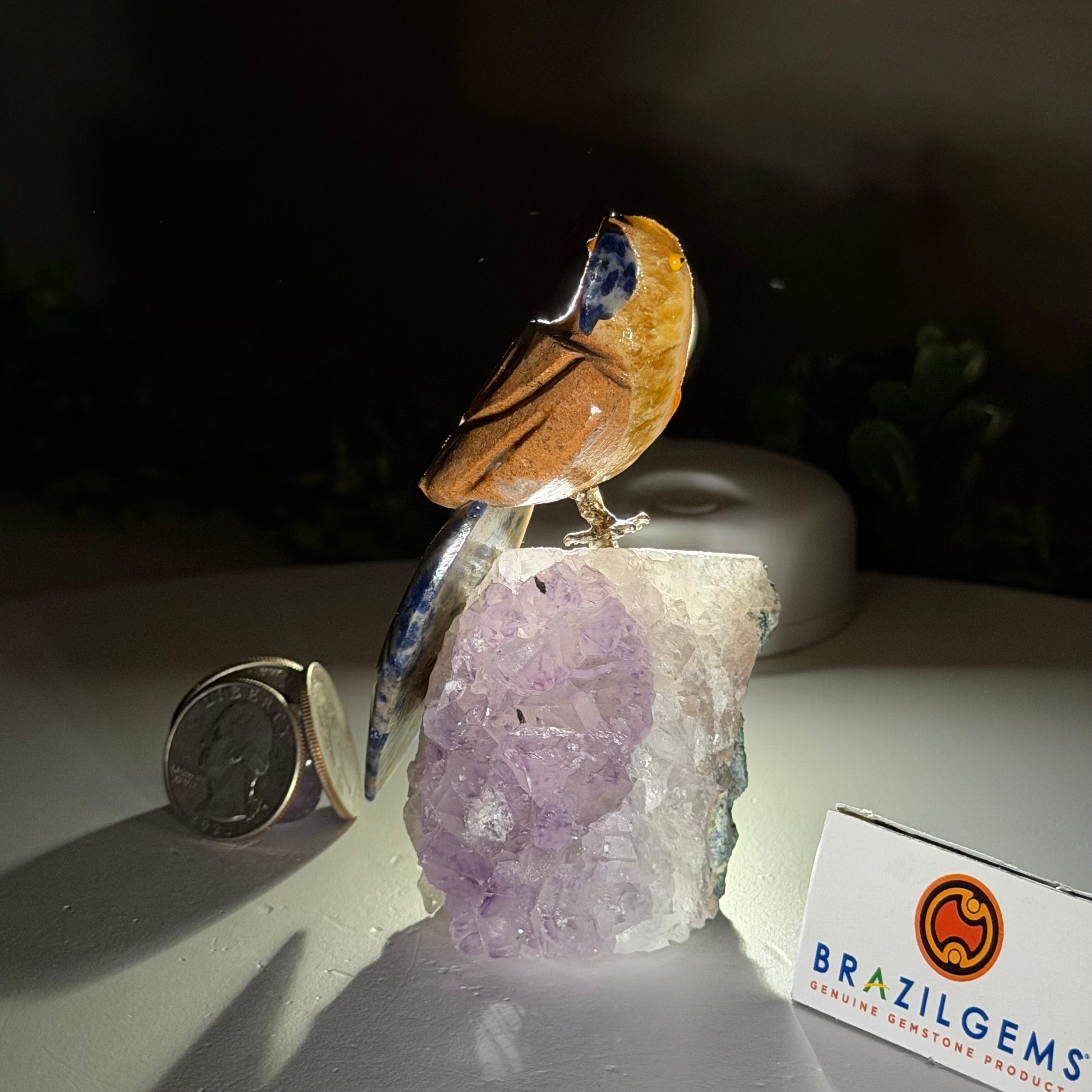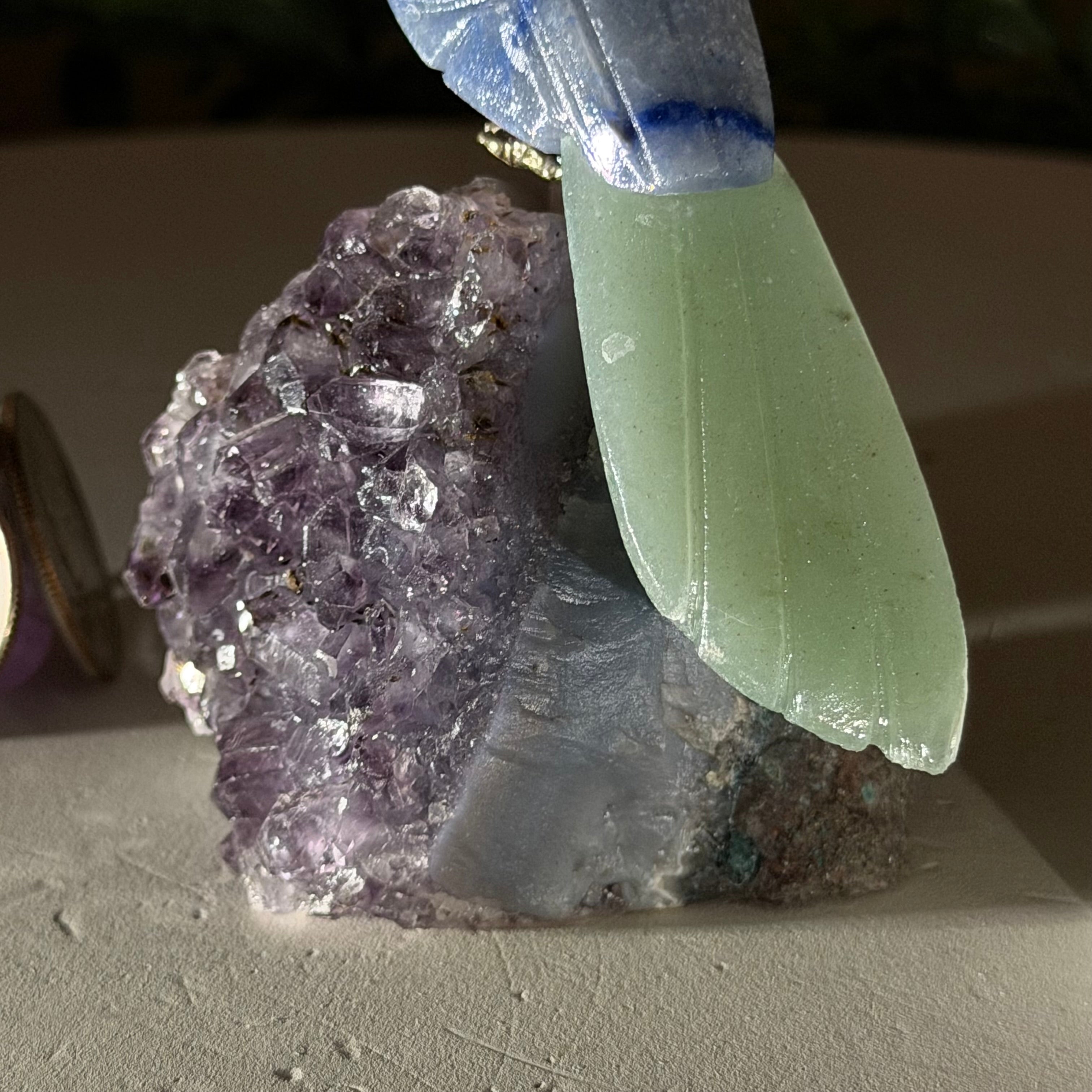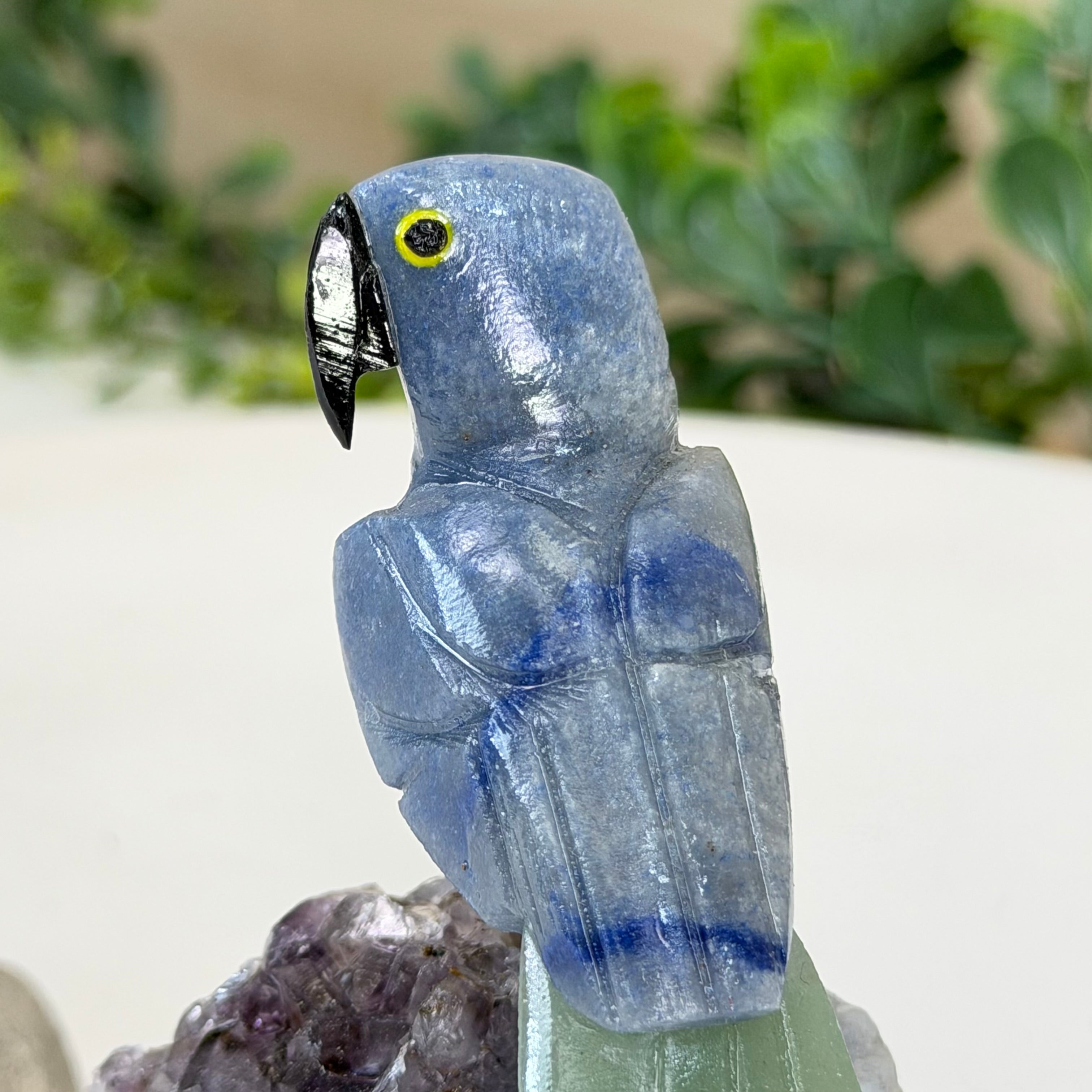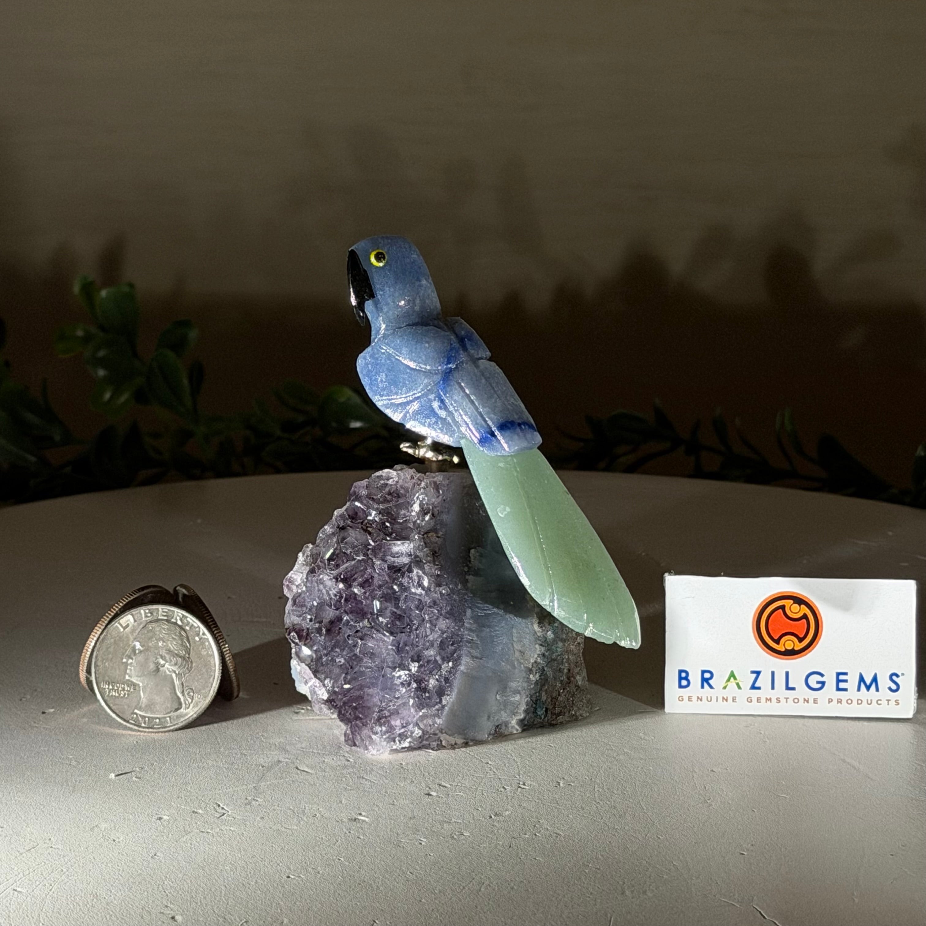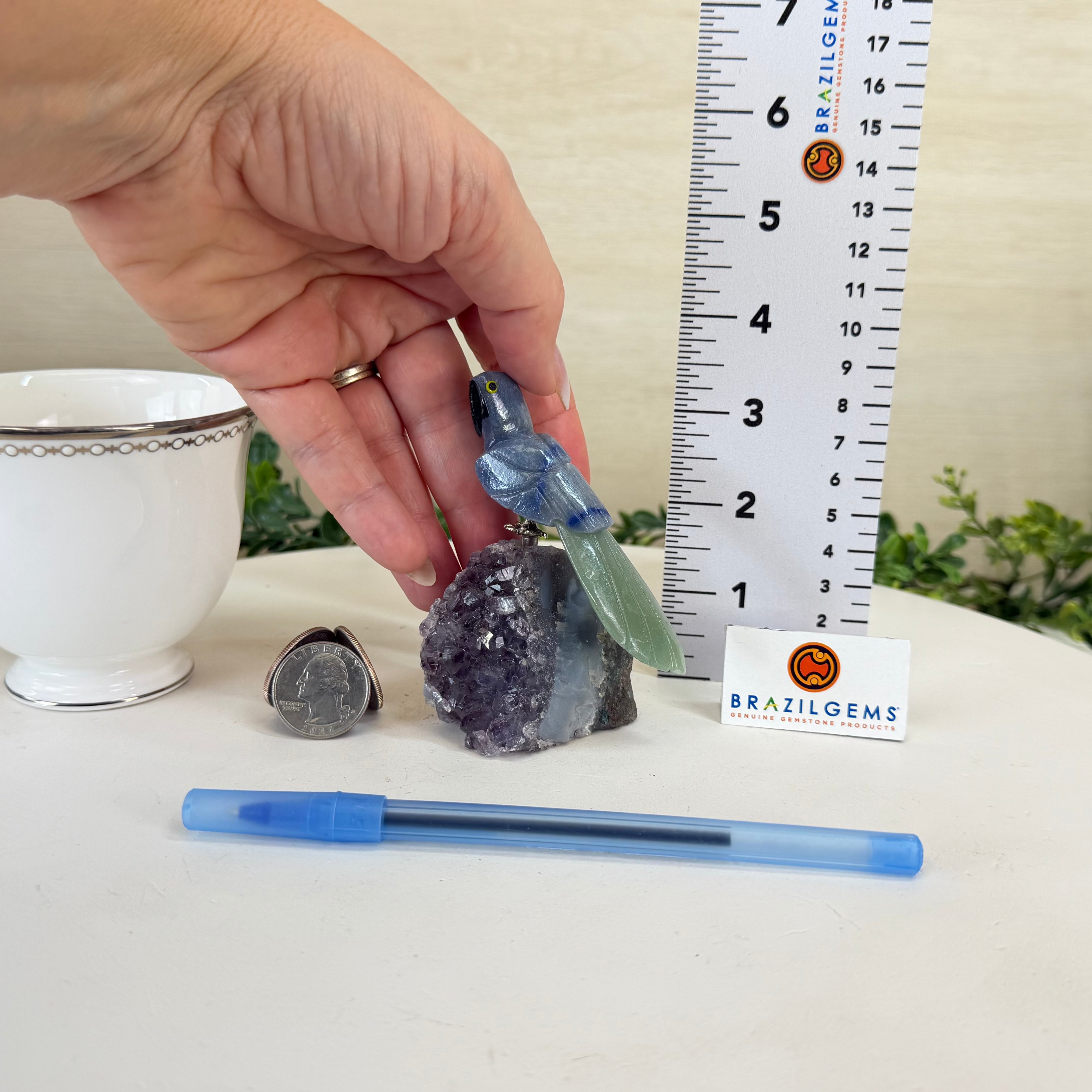 Each intricate detail of these birds is meticulously carved by skilled Brazilian artisans who have mastered the technique that combines the beauty of Brazil's gemstones with their colorful native birds into an amazing art piece. Elevate your space with the timeless charm of our Gemstone birds on an crystal cluster bases.
