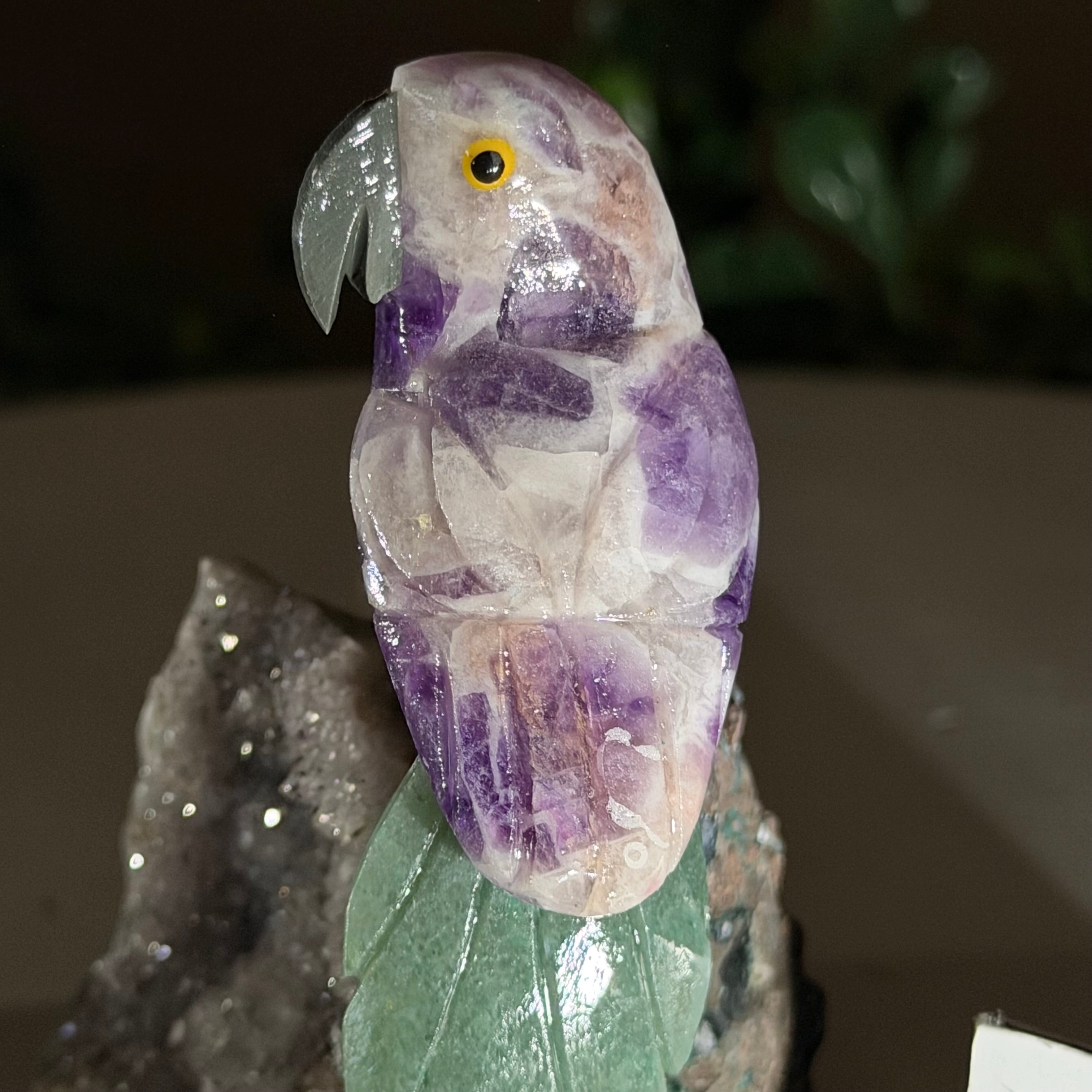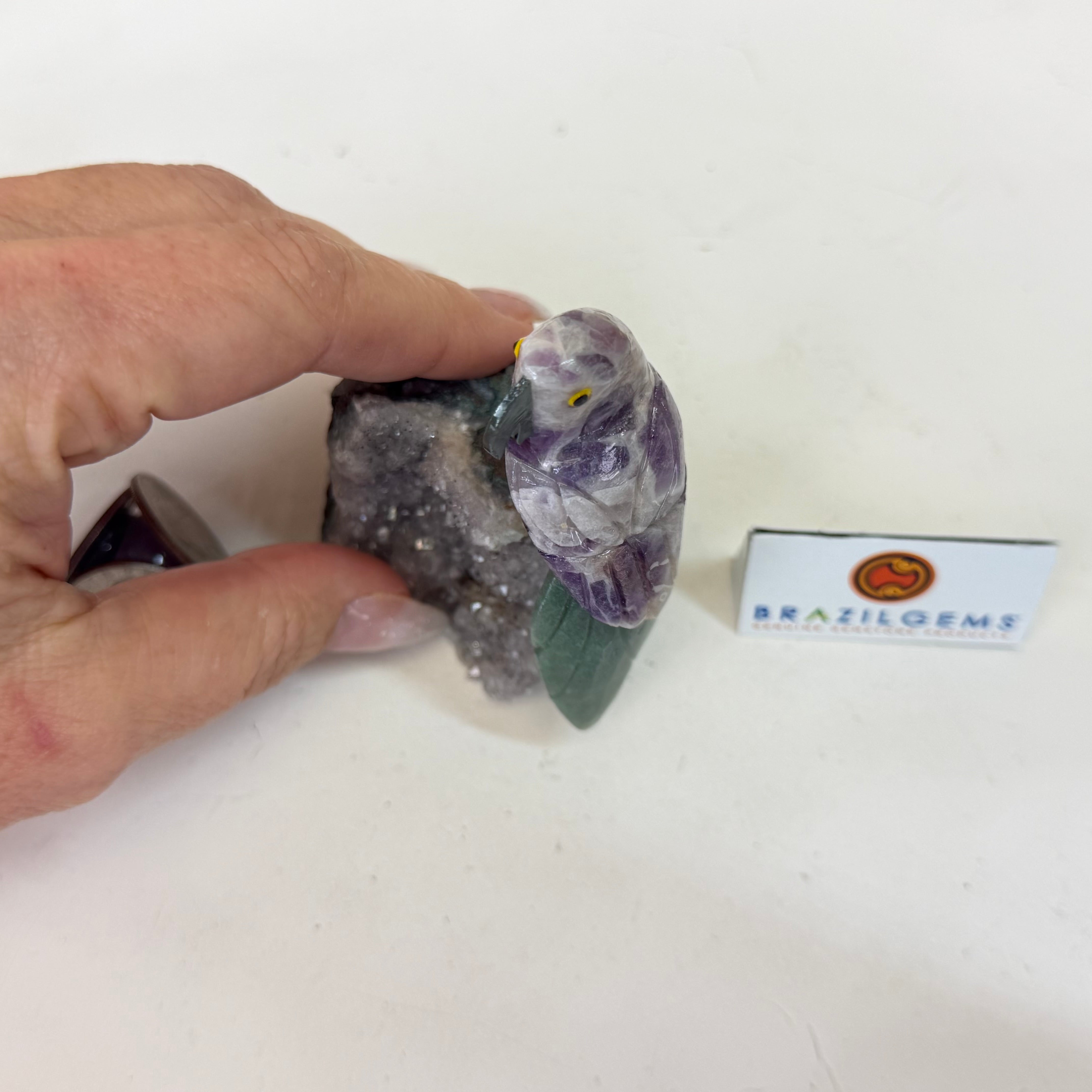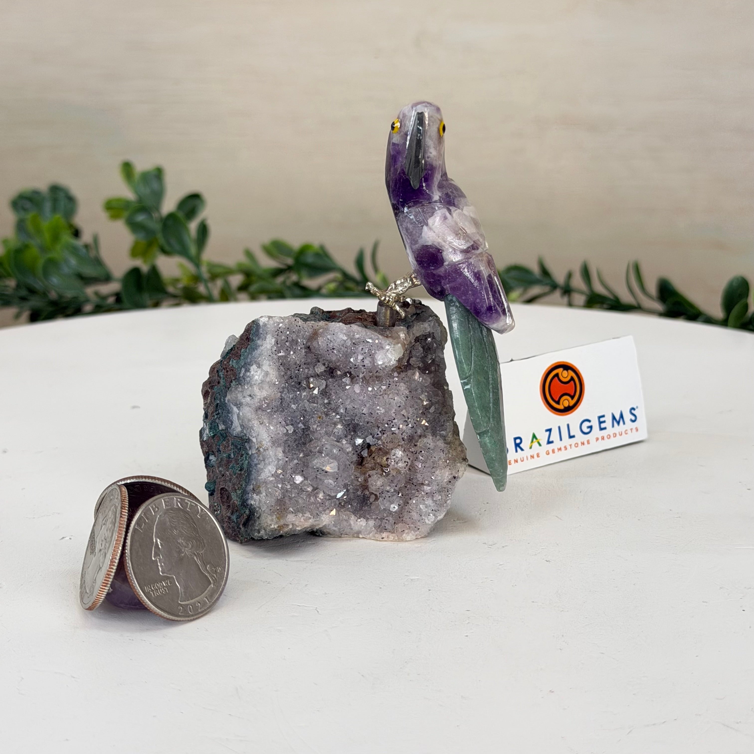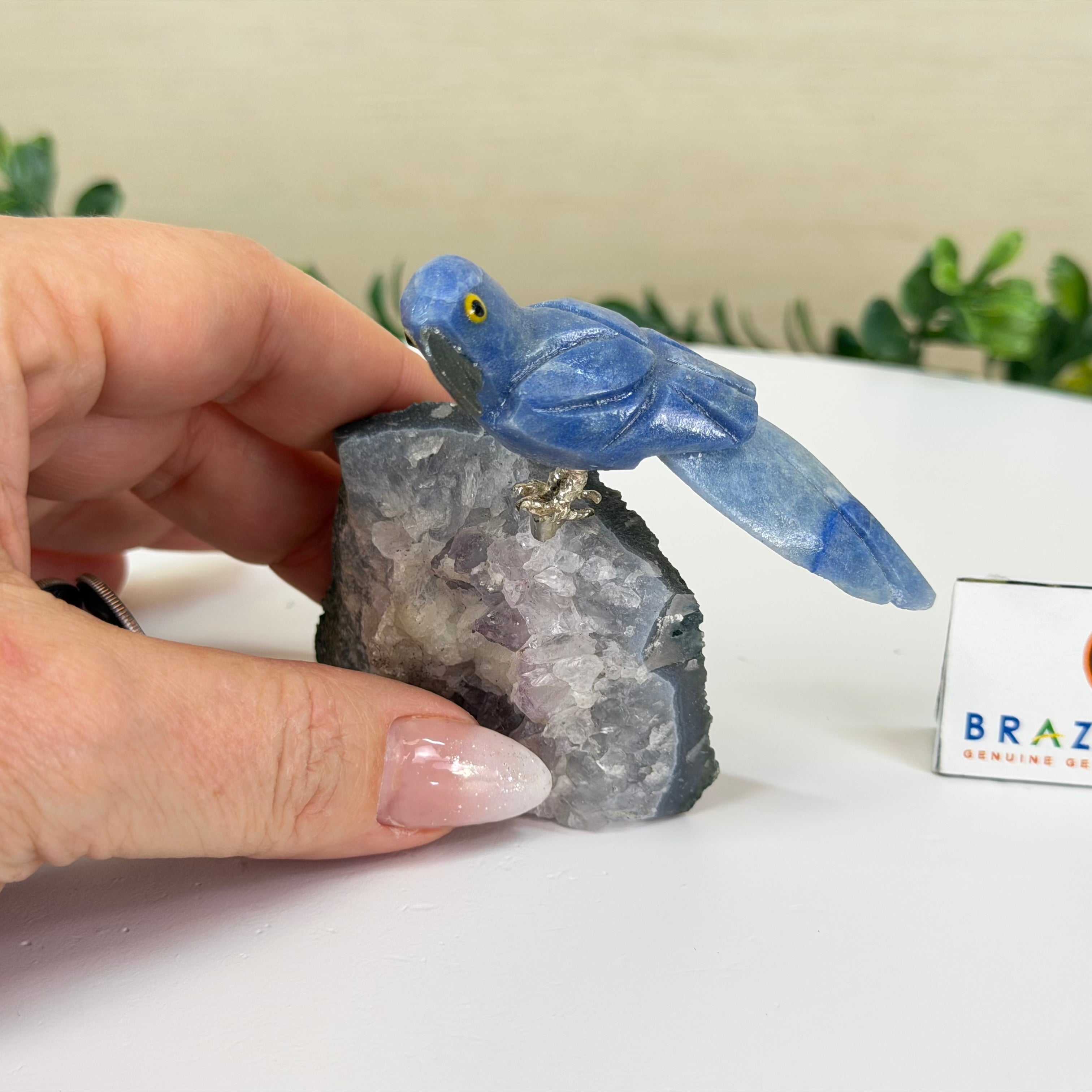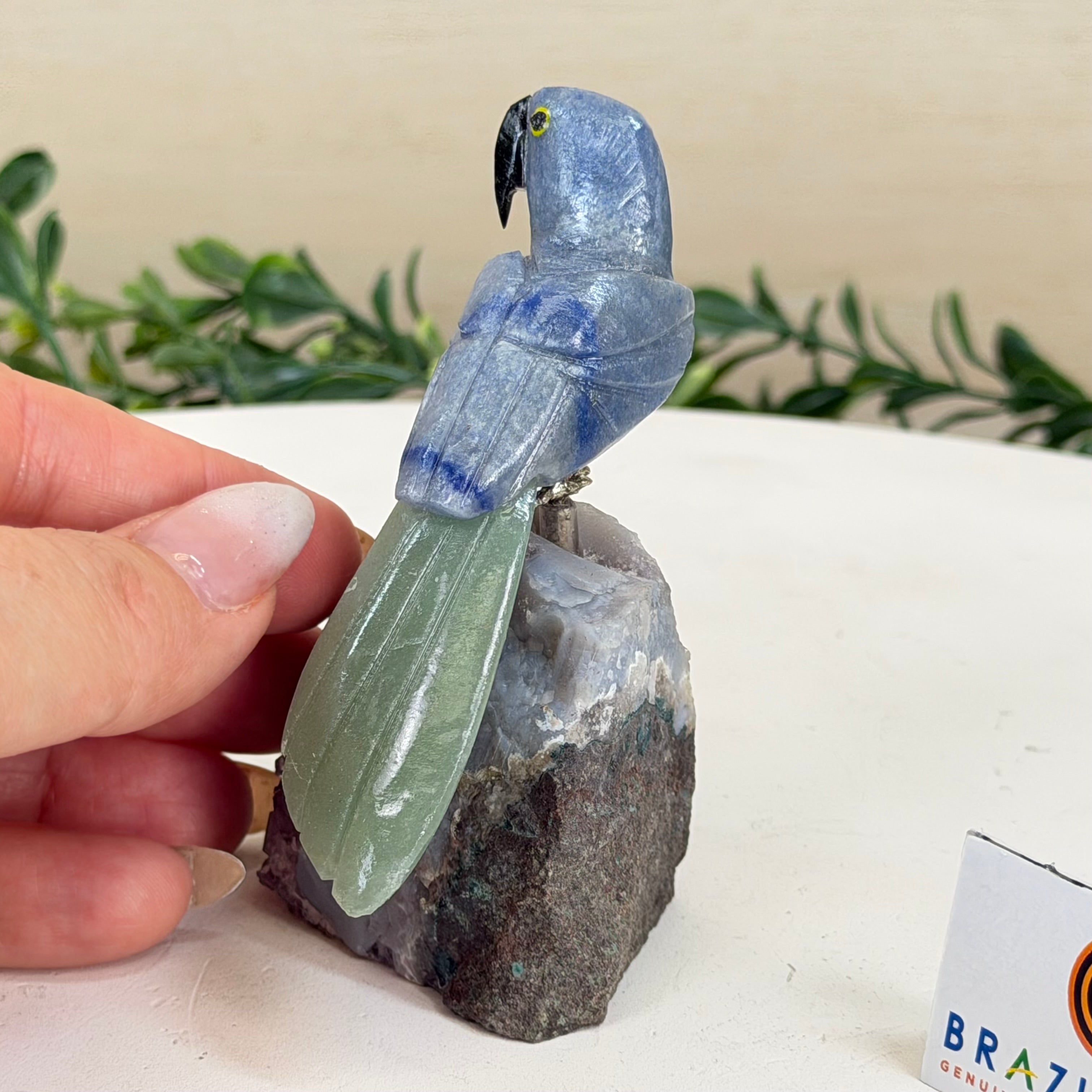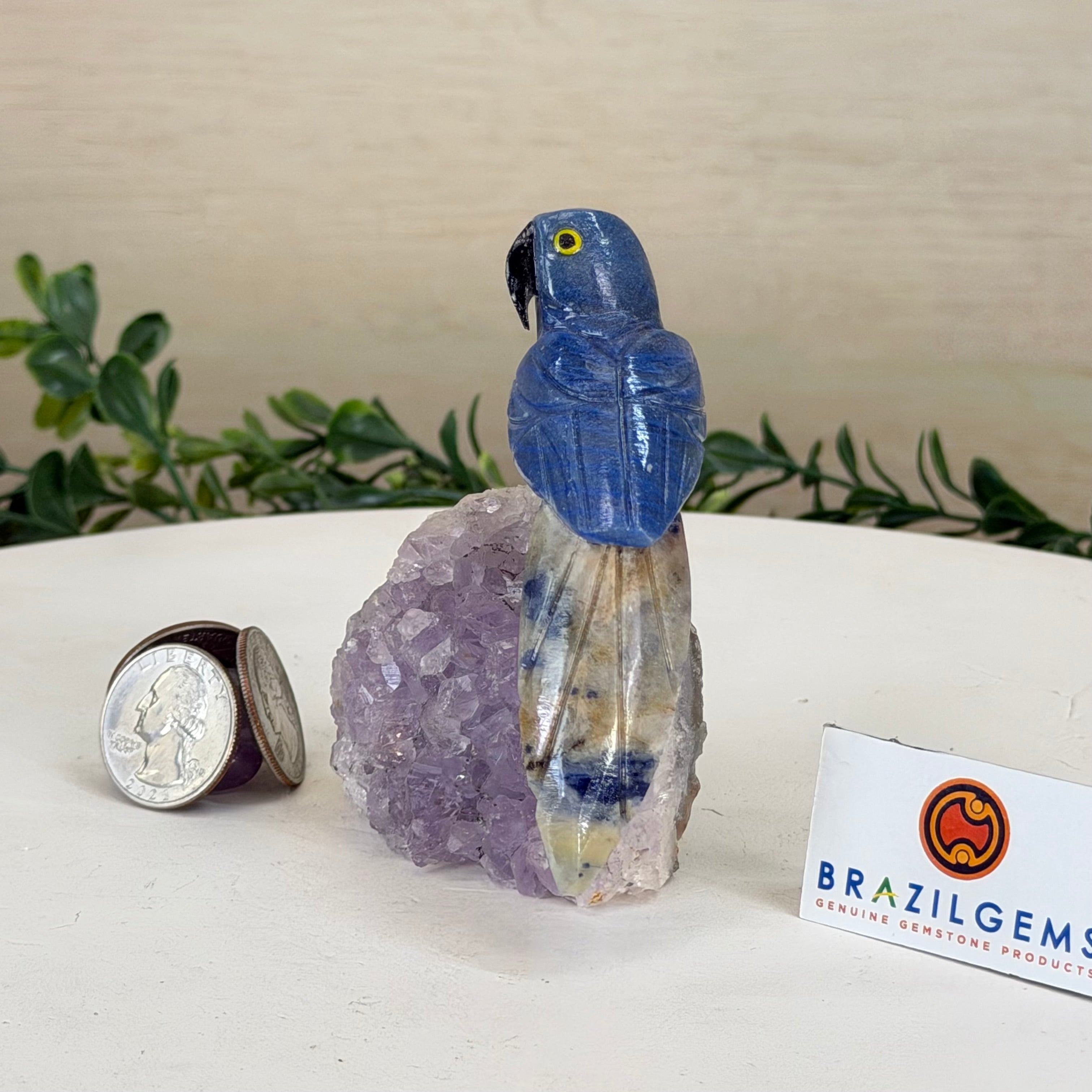 Each intricate detail of these birds is meticulously carved by skilled Brazilian artisans who have mastered the technique that combines the beauty of Brazil's gemstones with their colorful native birds into an amazing art piece. Elevate your space with the timeless charm of our Gemstone birds on an crystal cluster bases.