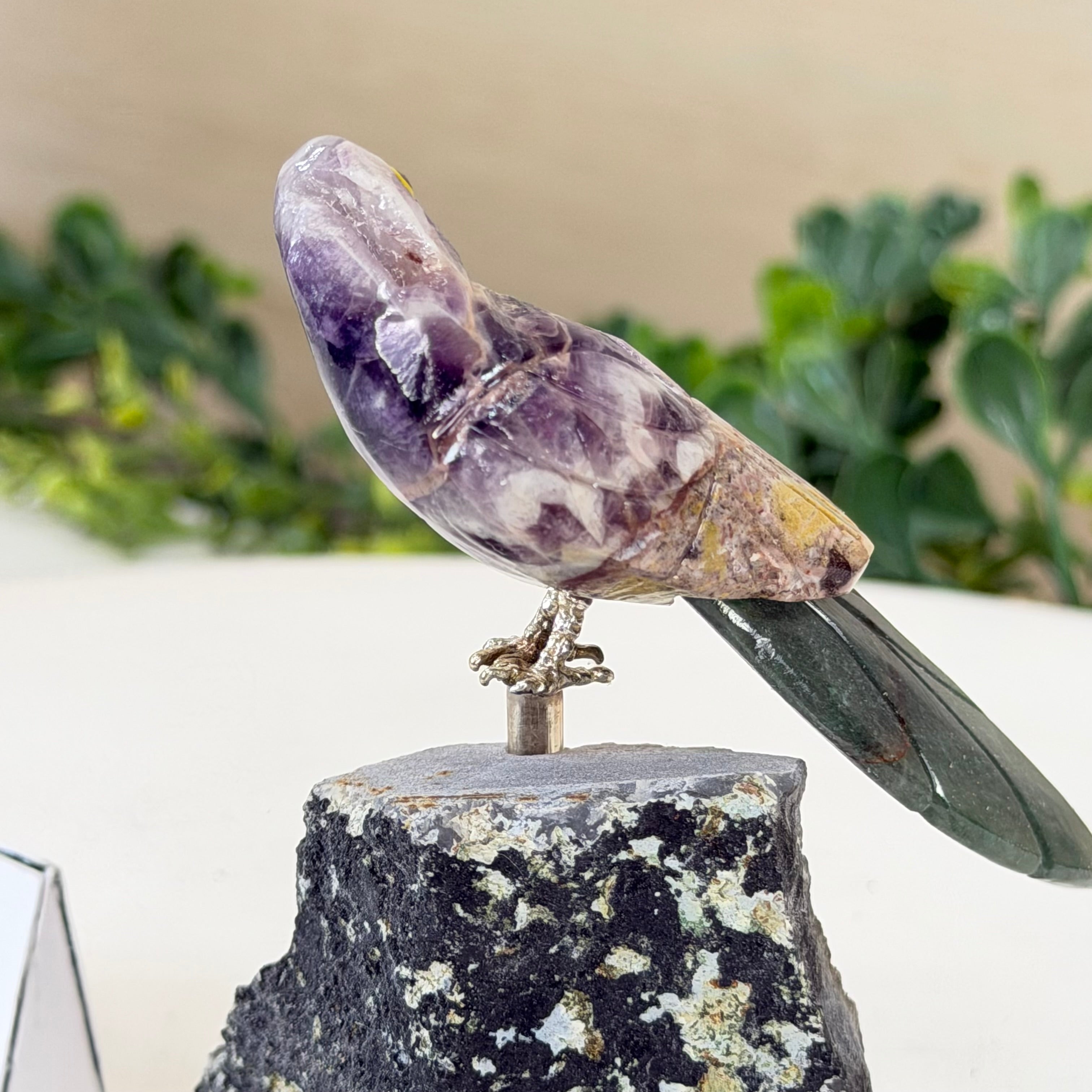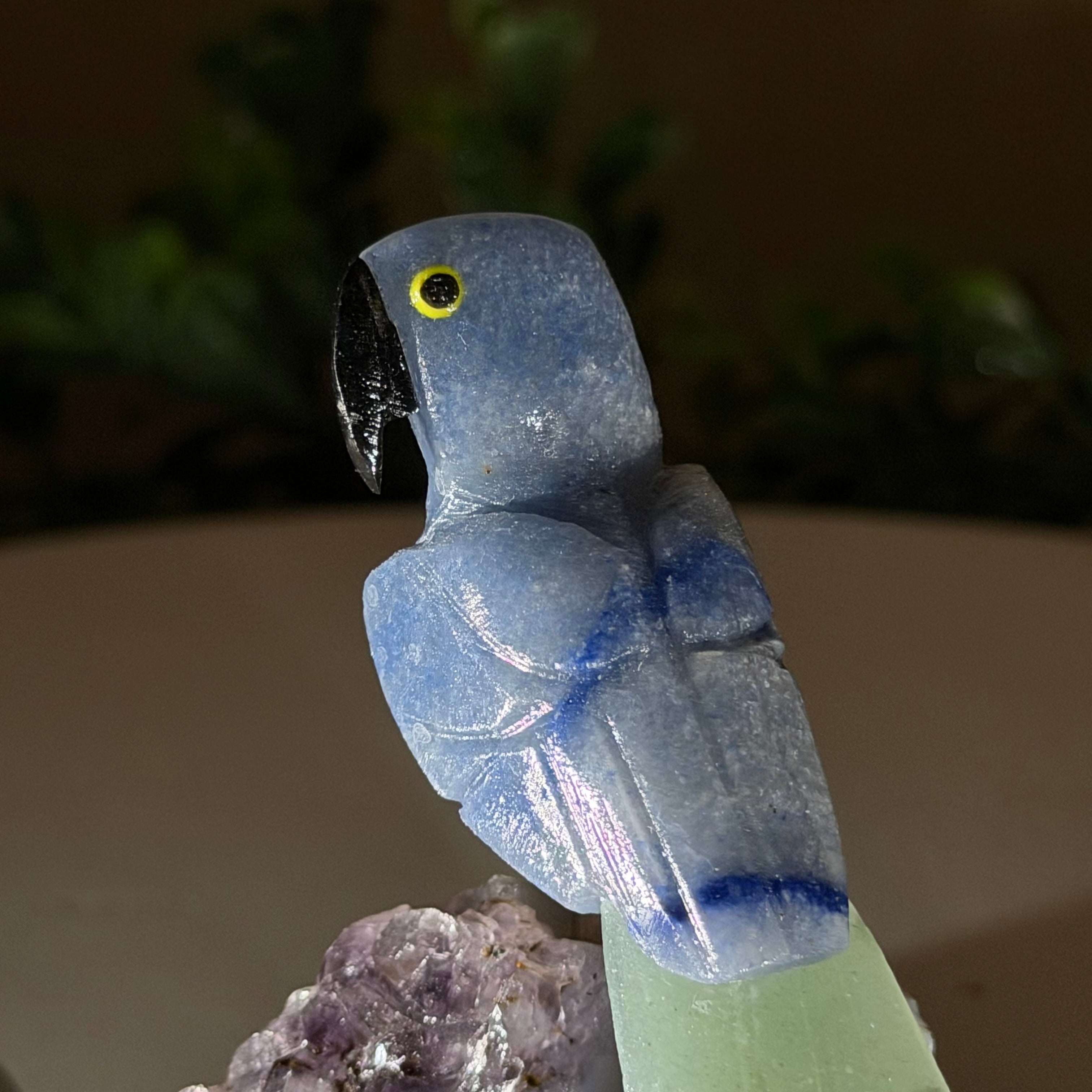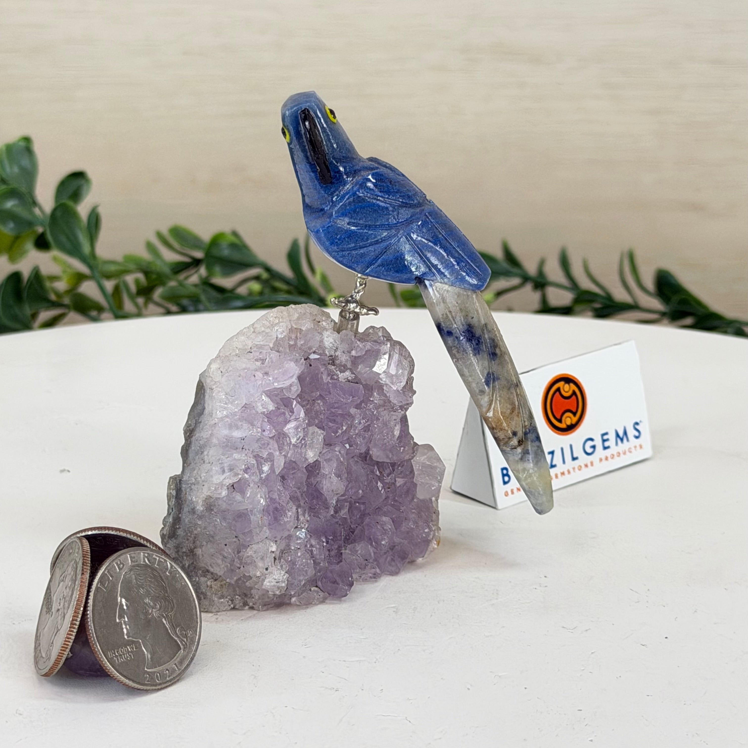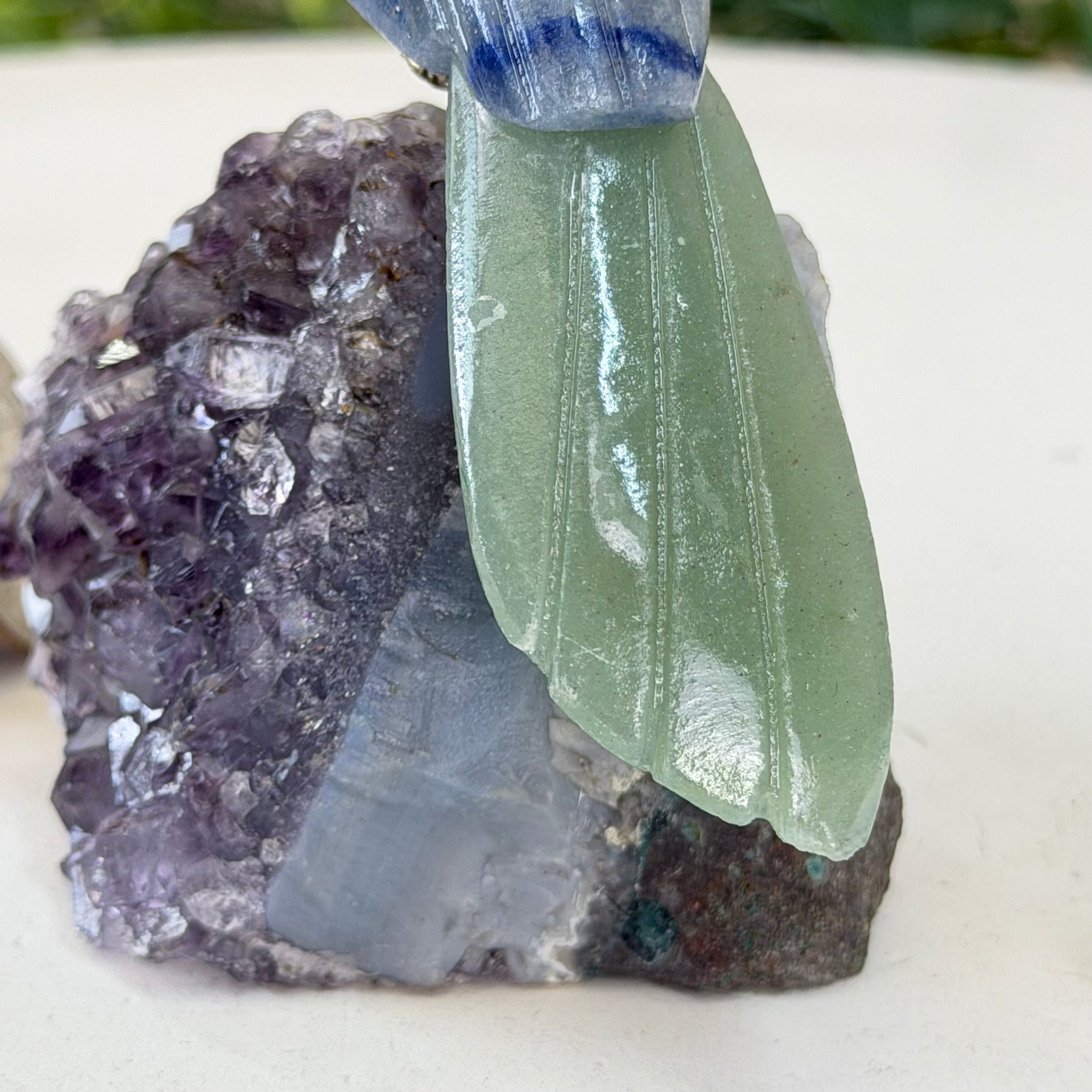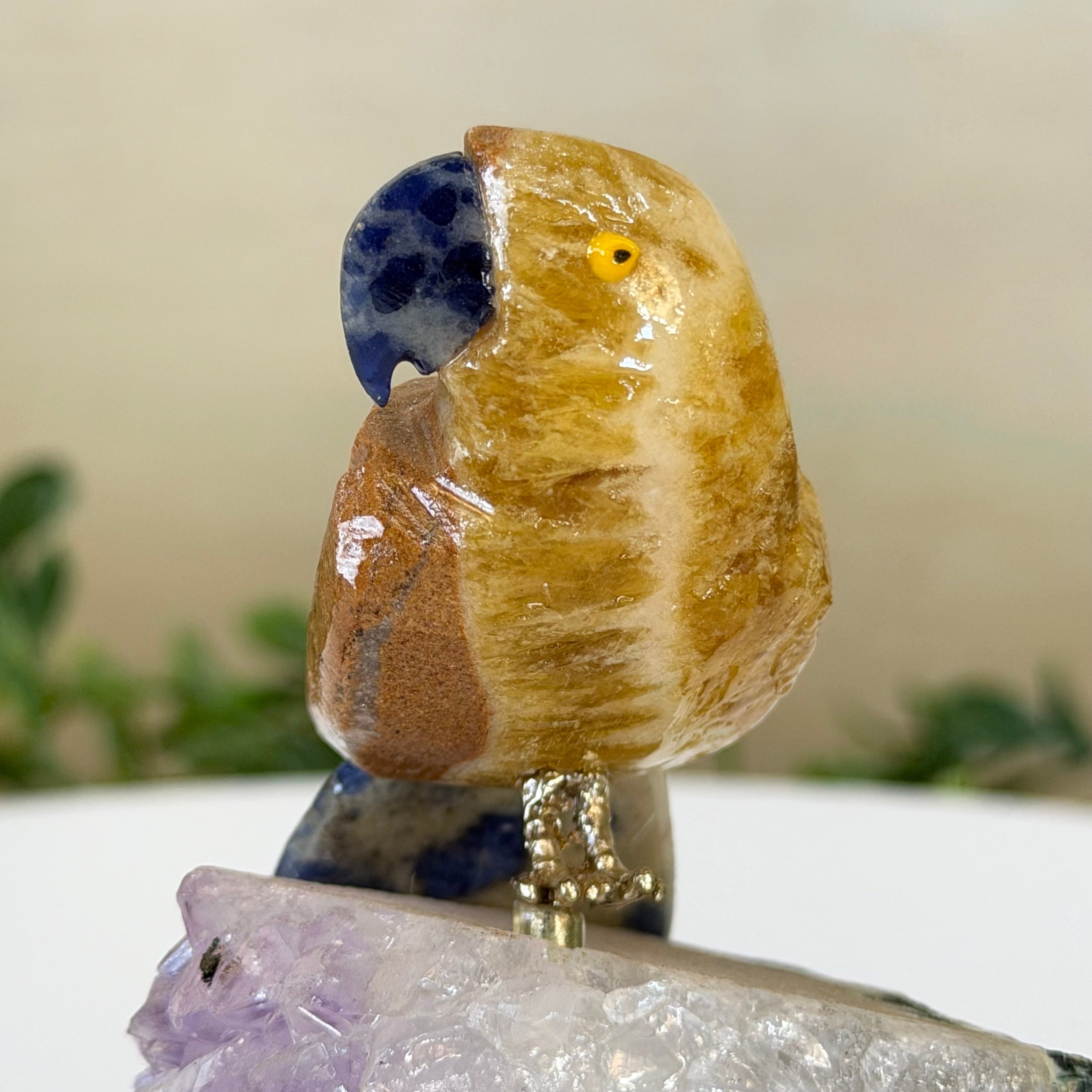 Each intricate detail of these birds is meticulously carved by skilled Brazilian artisans who have mastered the technique that combines the beauty of Brazil's gemstones with their colorful native birds into an amazing art piece. Elevate your space with the timeless charm of our Gemstone birds on an crystal cluster bases.