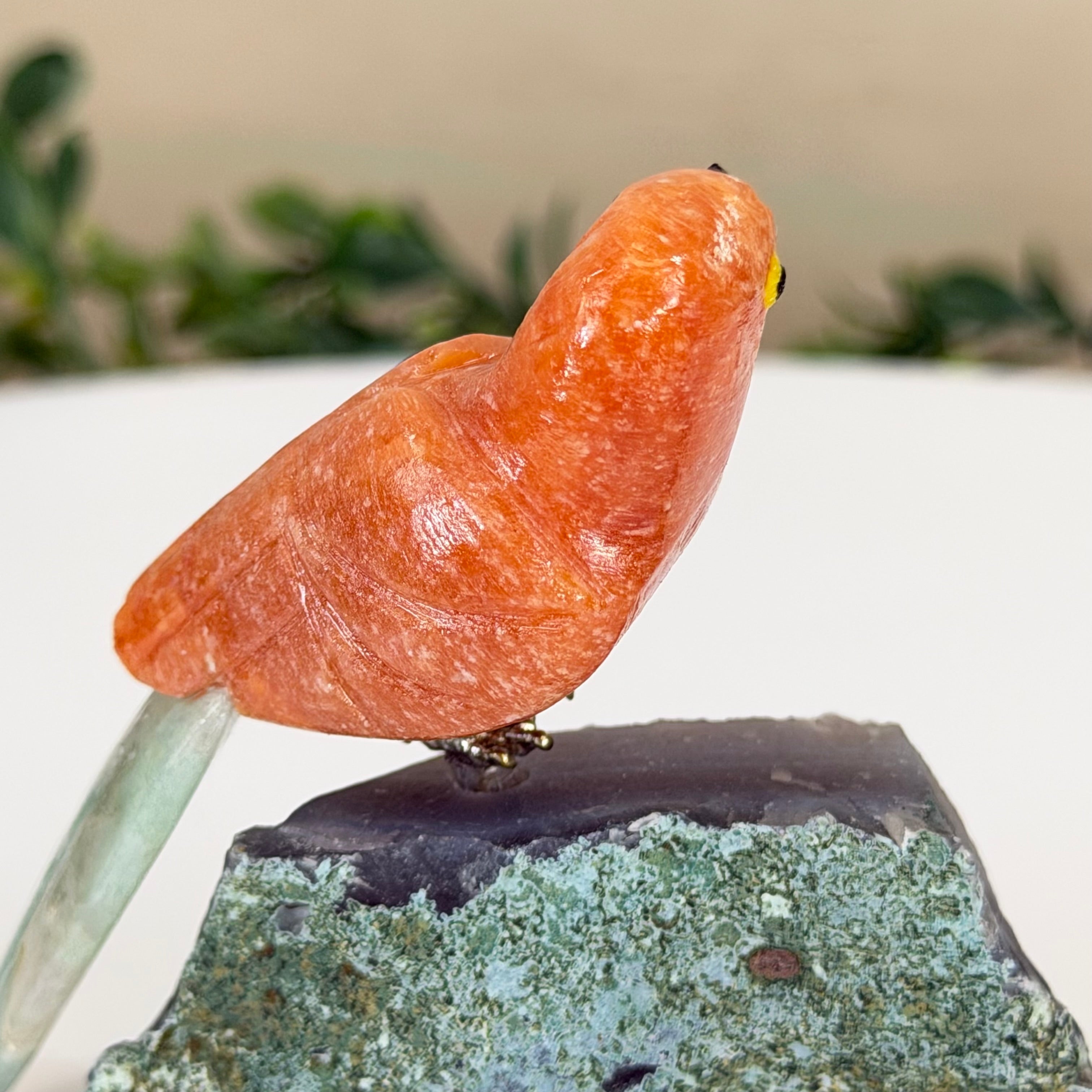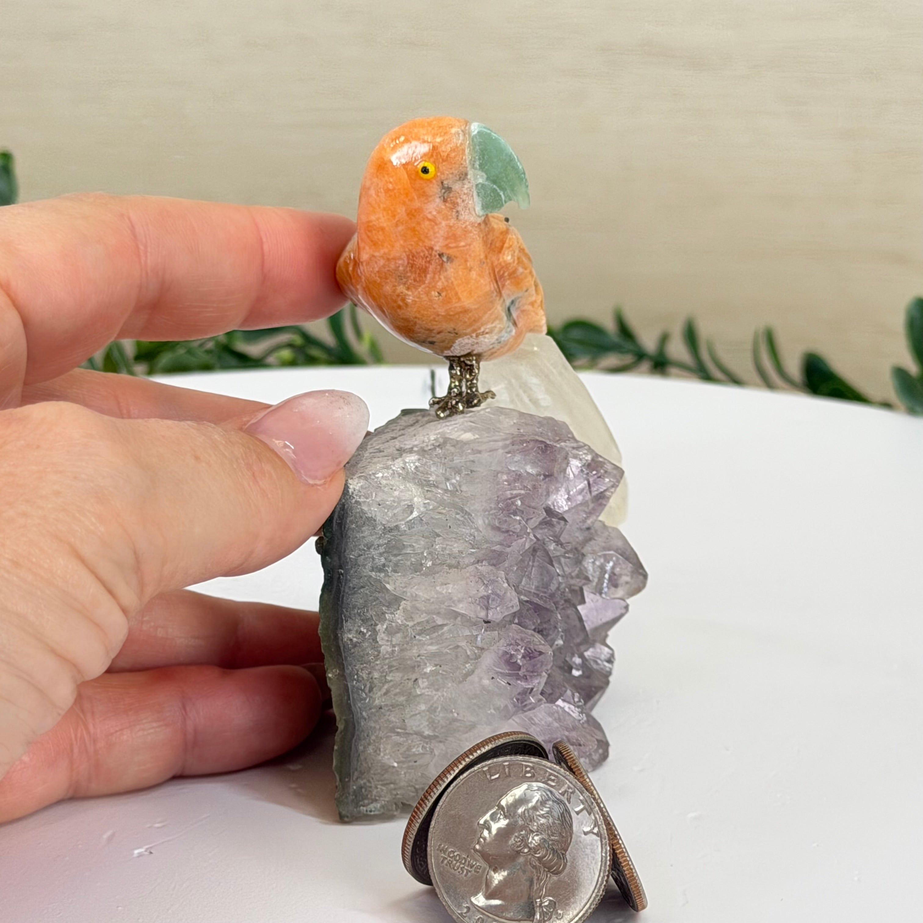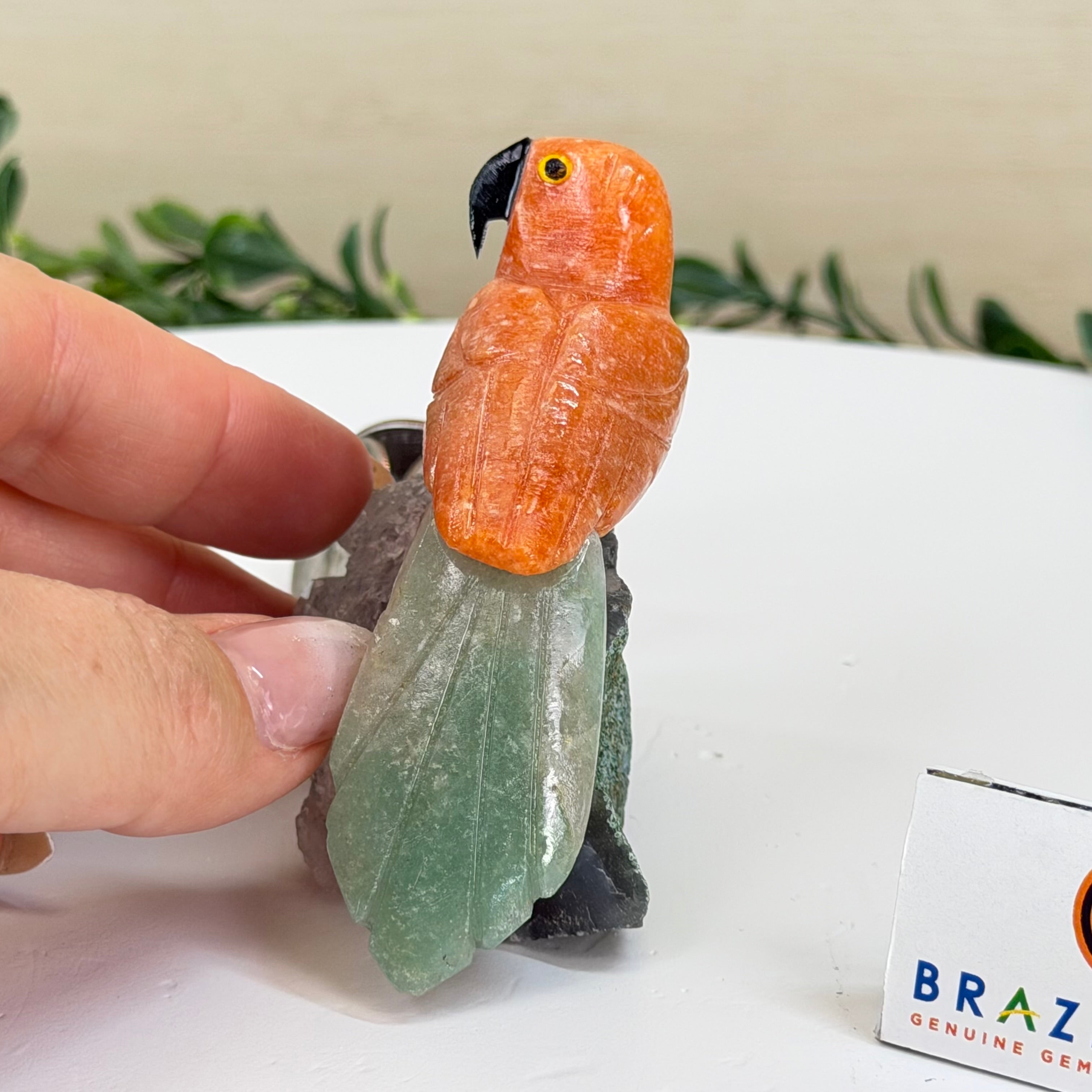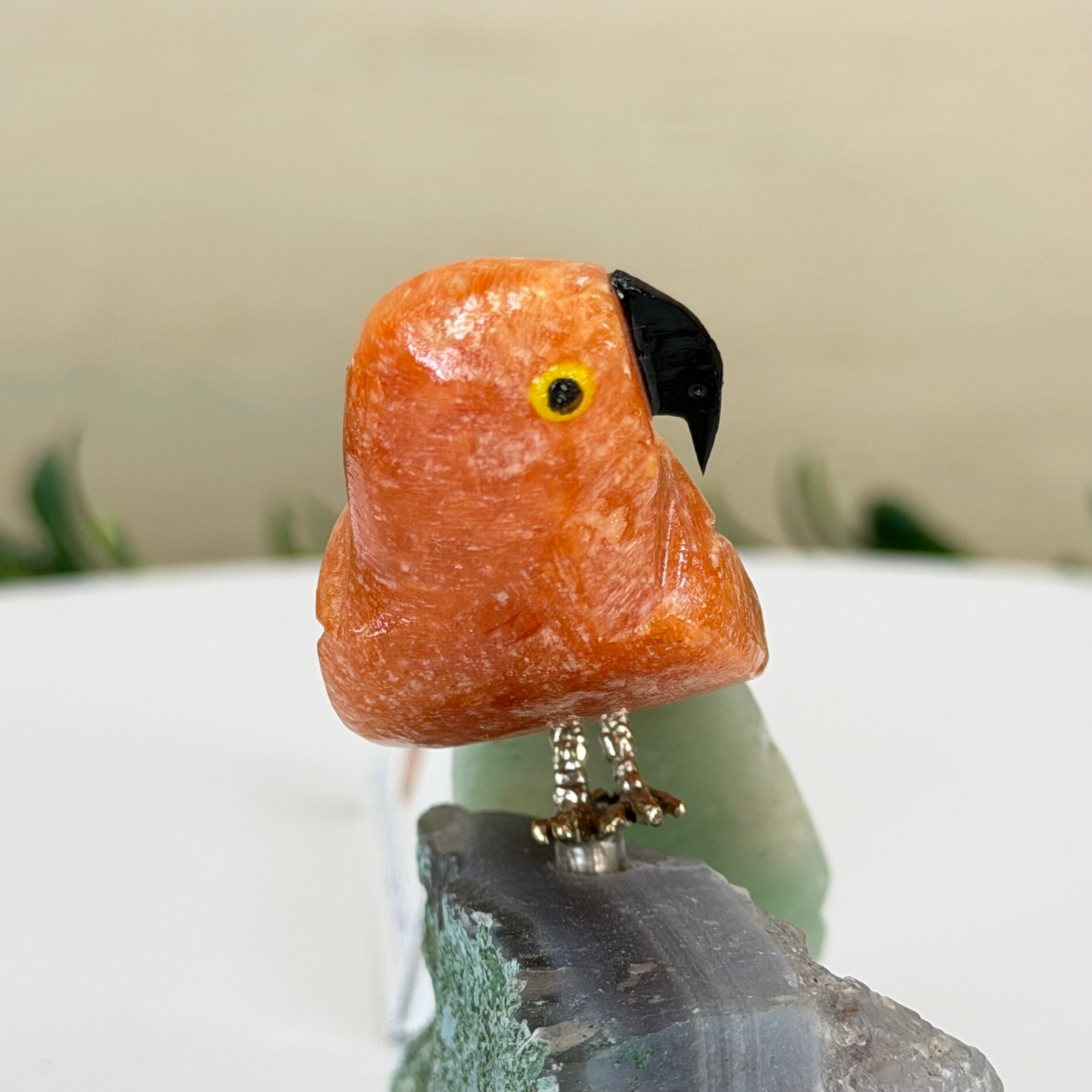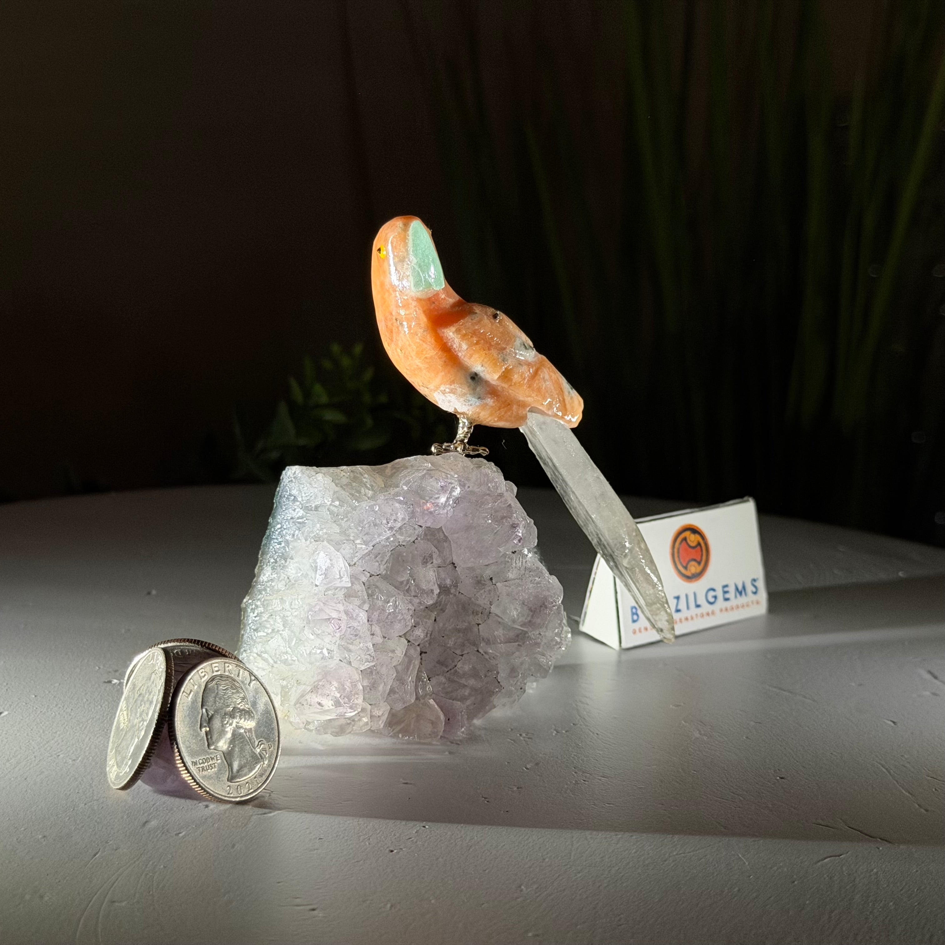 Each intricate detail of these birds is meticulously carved by skilled Brazilian artisans who have mastered the technique that combines the beauty of Brazil's gemstones with their colorful native birds into an amazing art piece. Elevate your space with the timeless charm of our Gemstone birds on an crystal cluster bases.