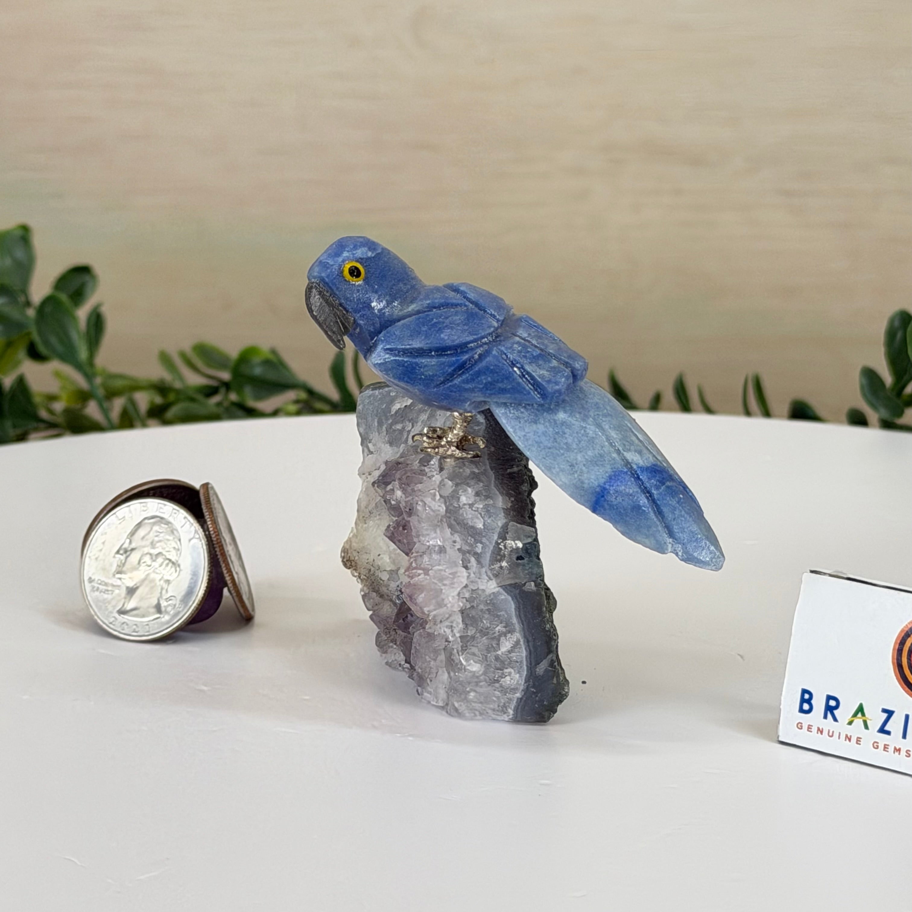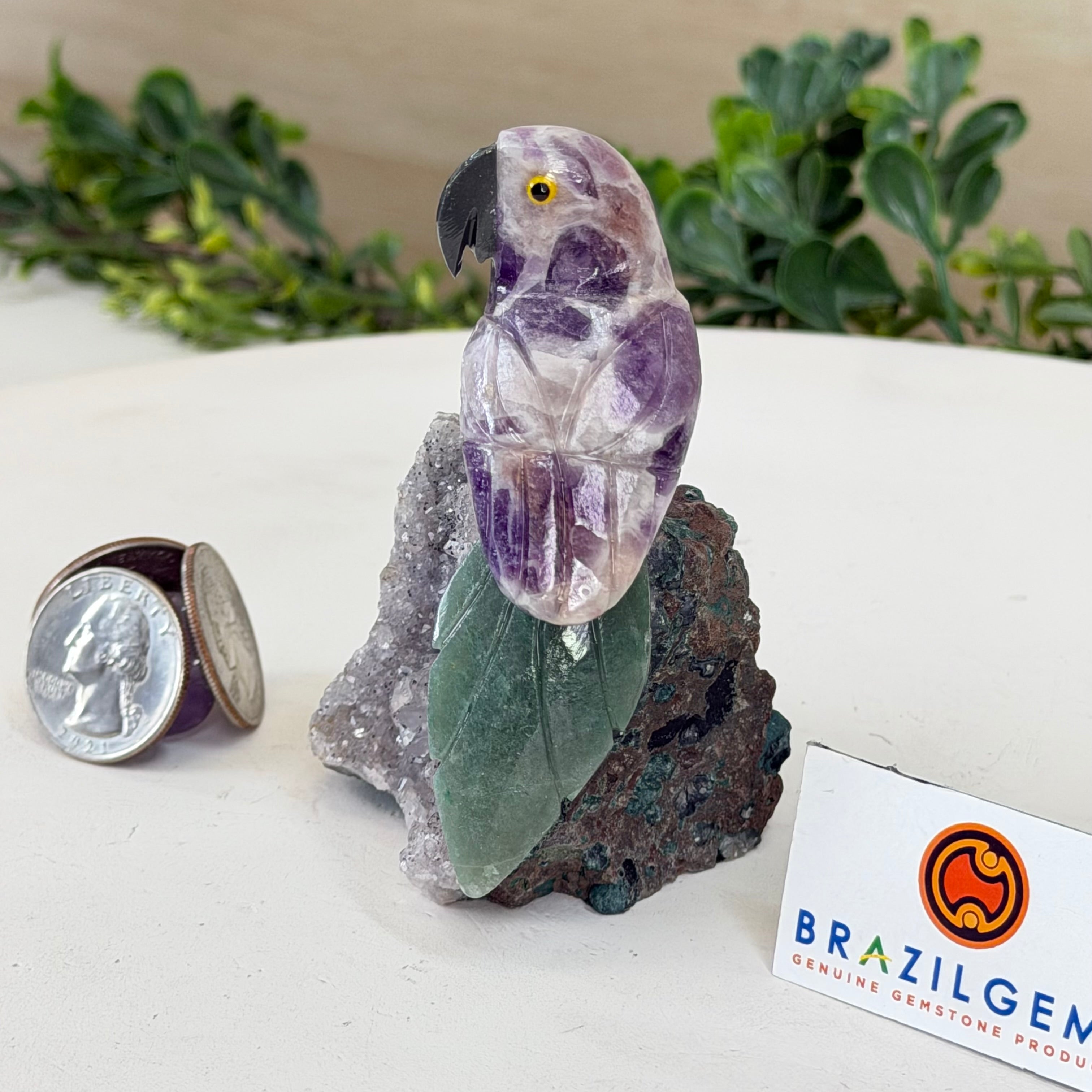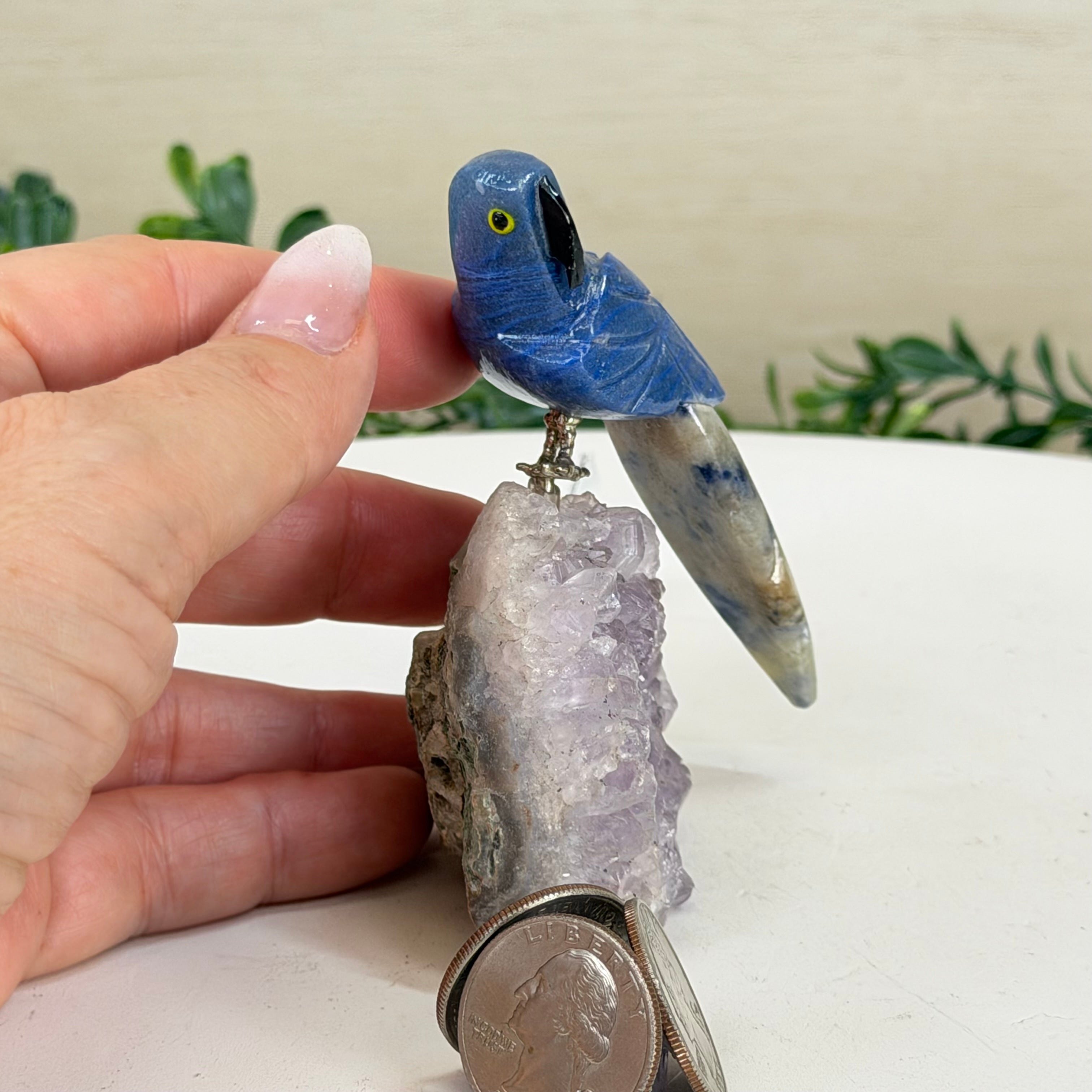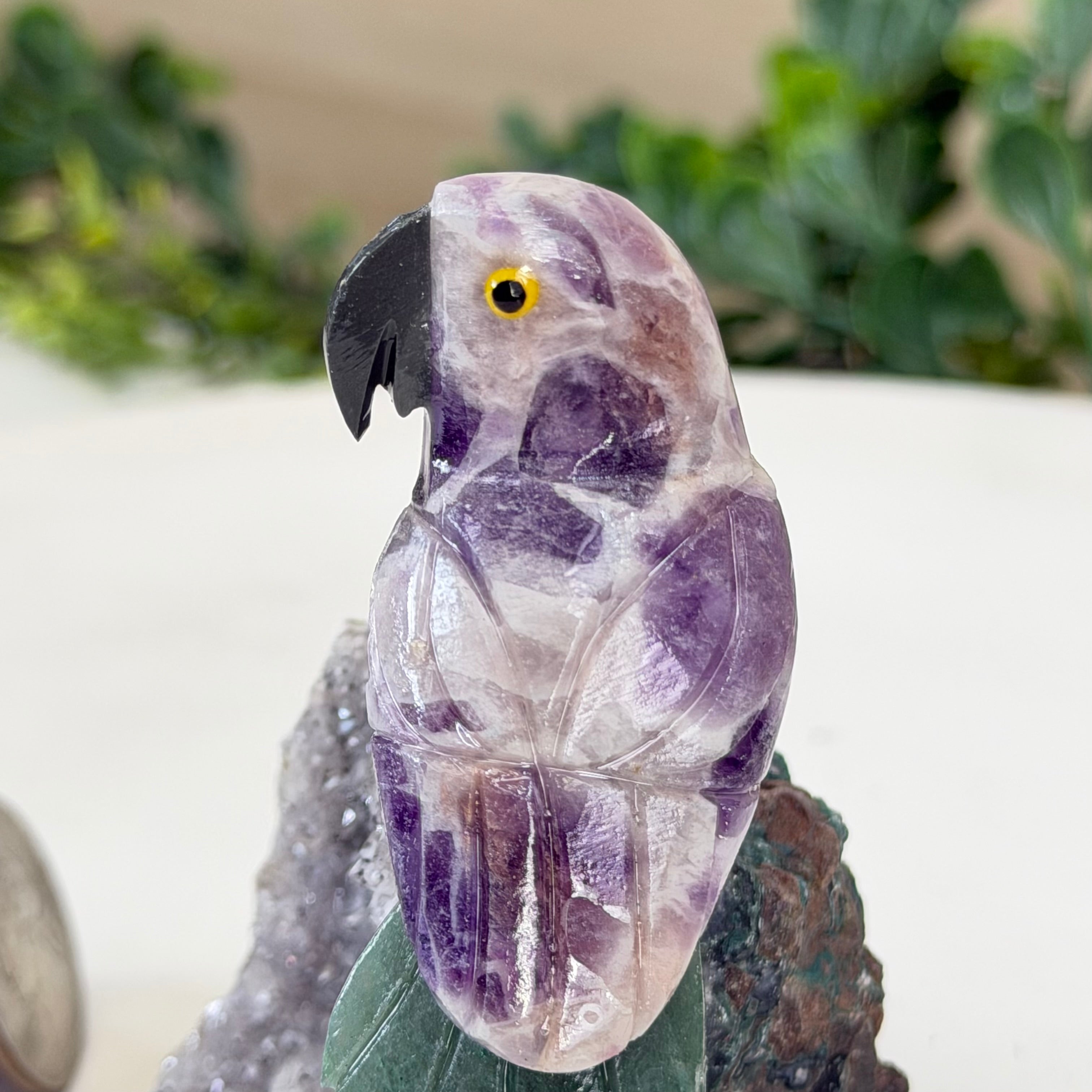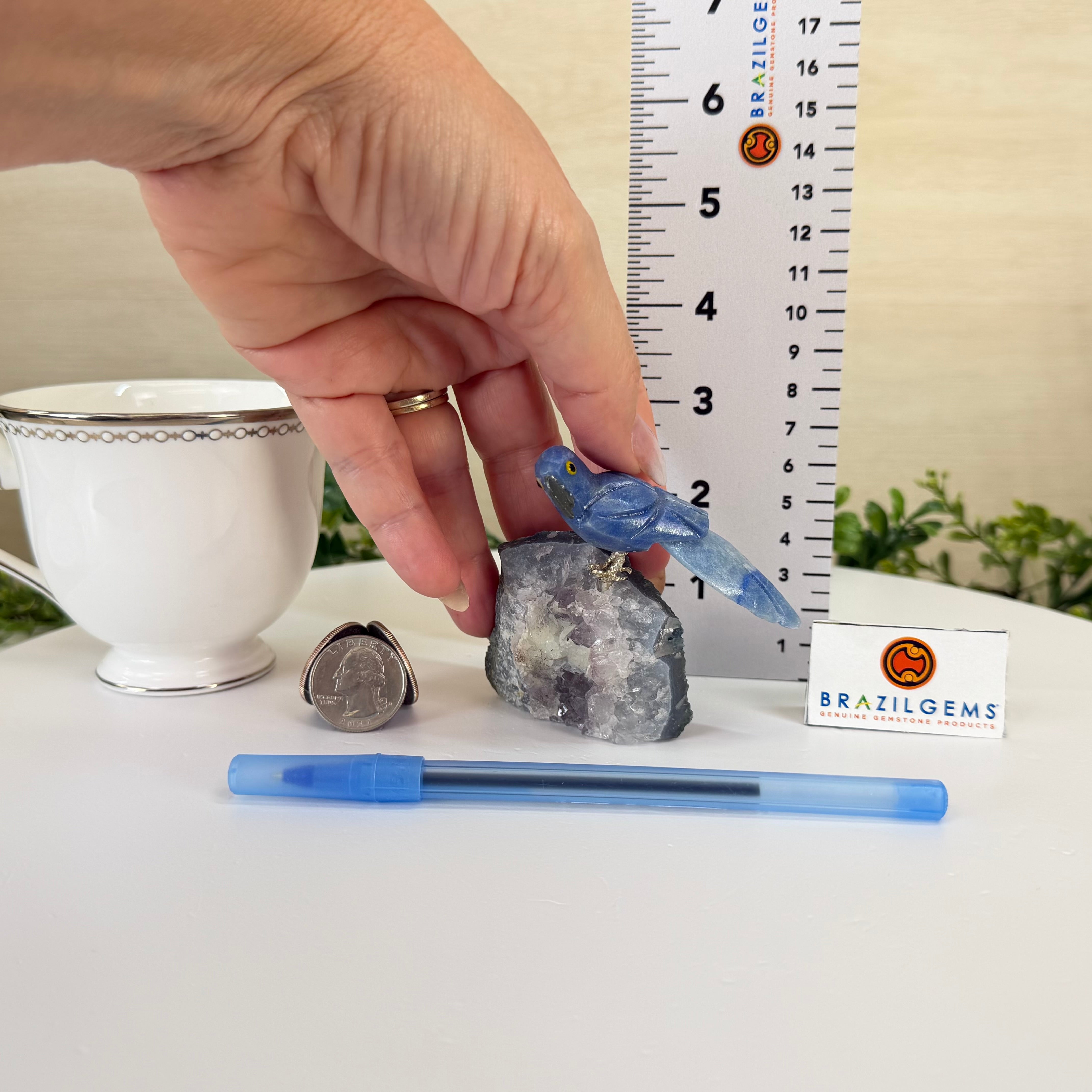 Each intricate detail of these birds is meticulously carved by skilled Brazilian artisans who have mastered the technique that combines the beauty of Brazil's gemstones with their colorful native birds into an amazing art piece. Elevate your space with the timeless charm of our Gemstone birds on an crystal cluster bases.