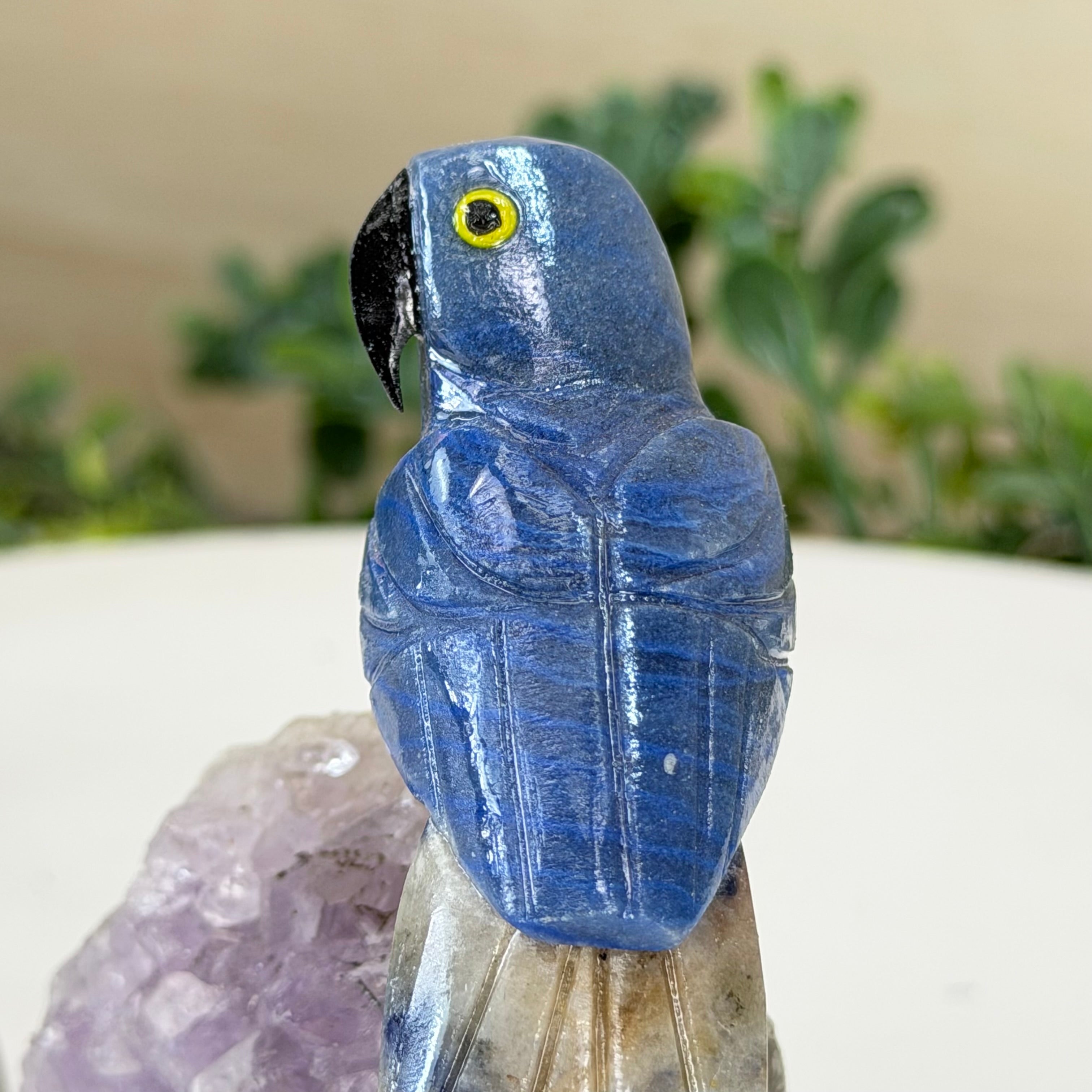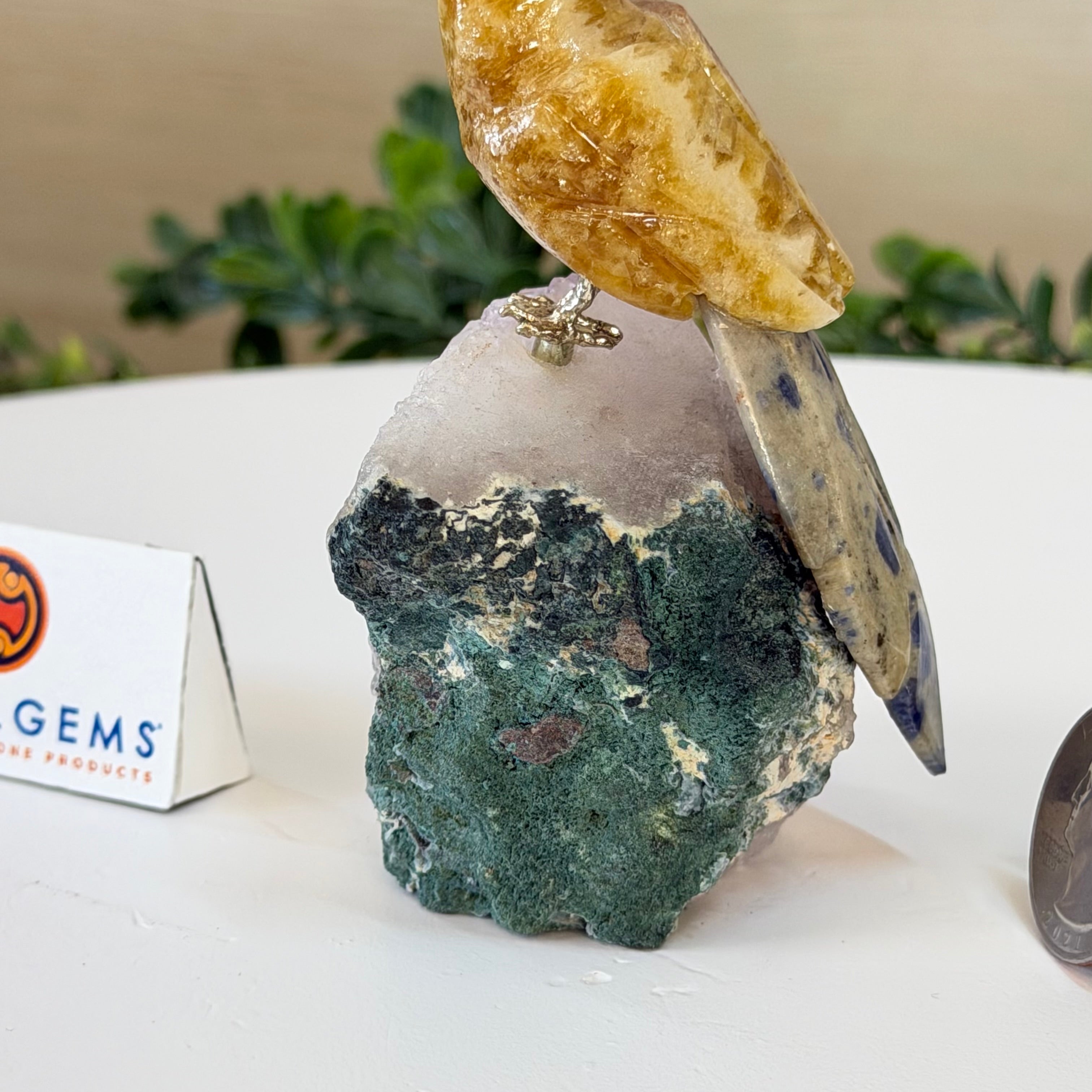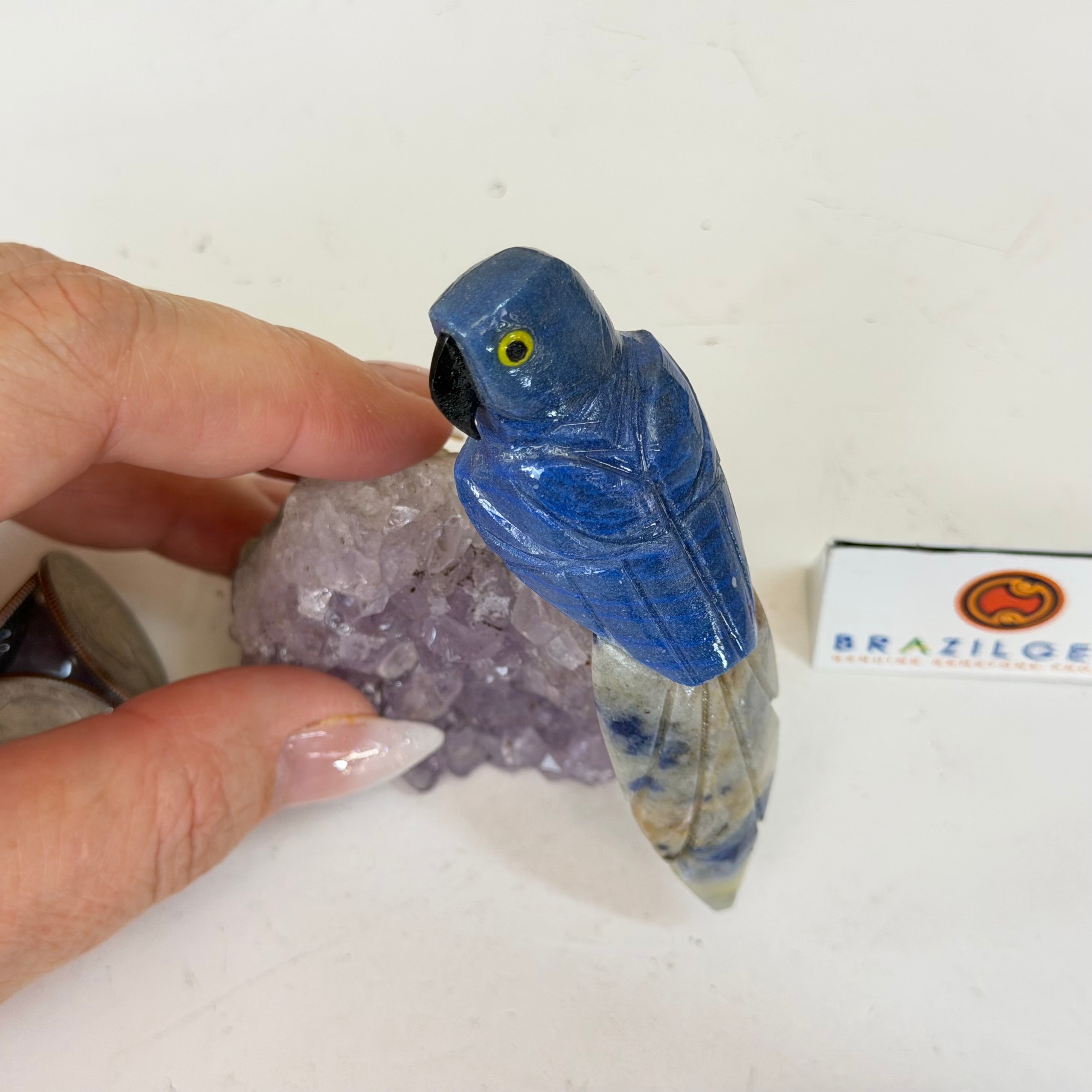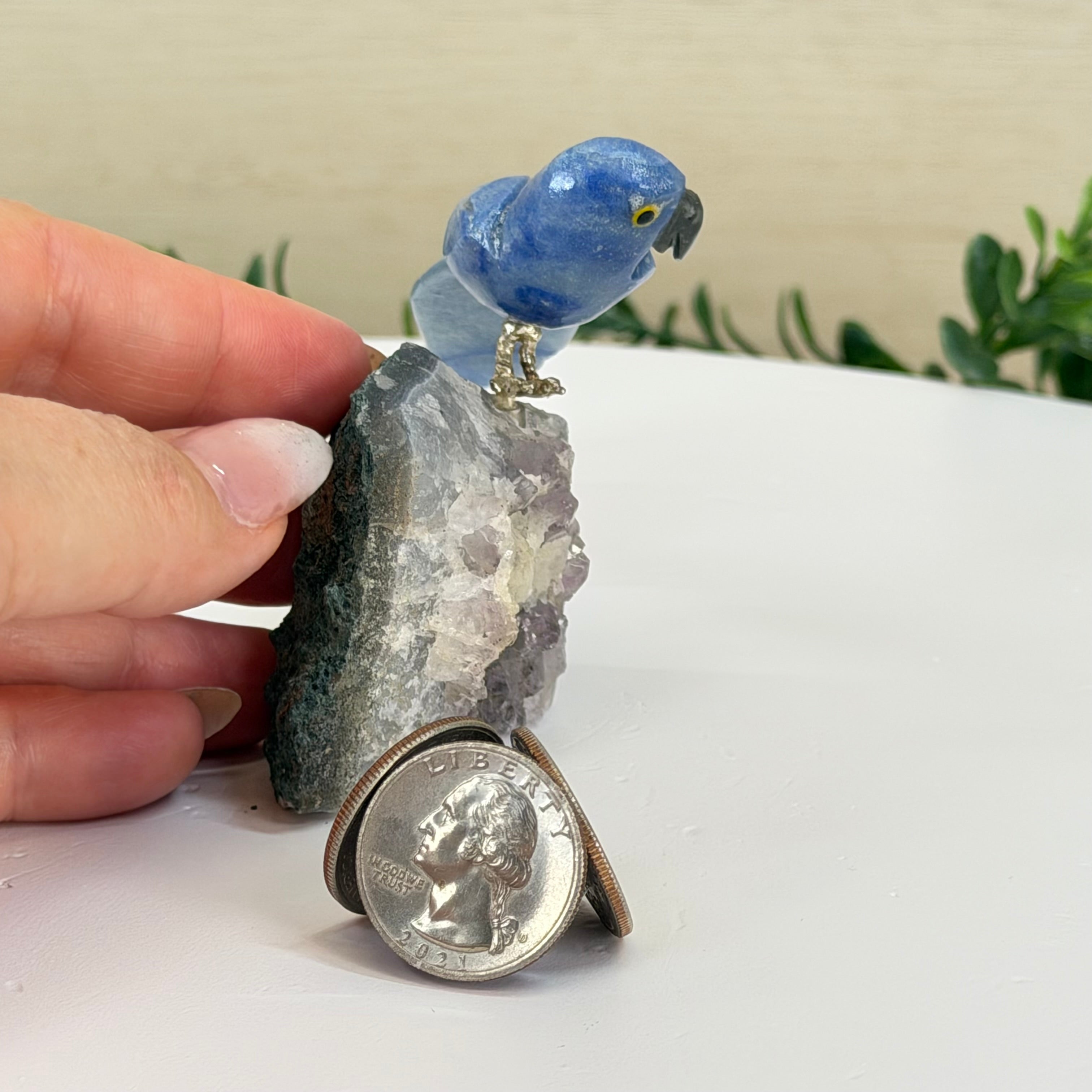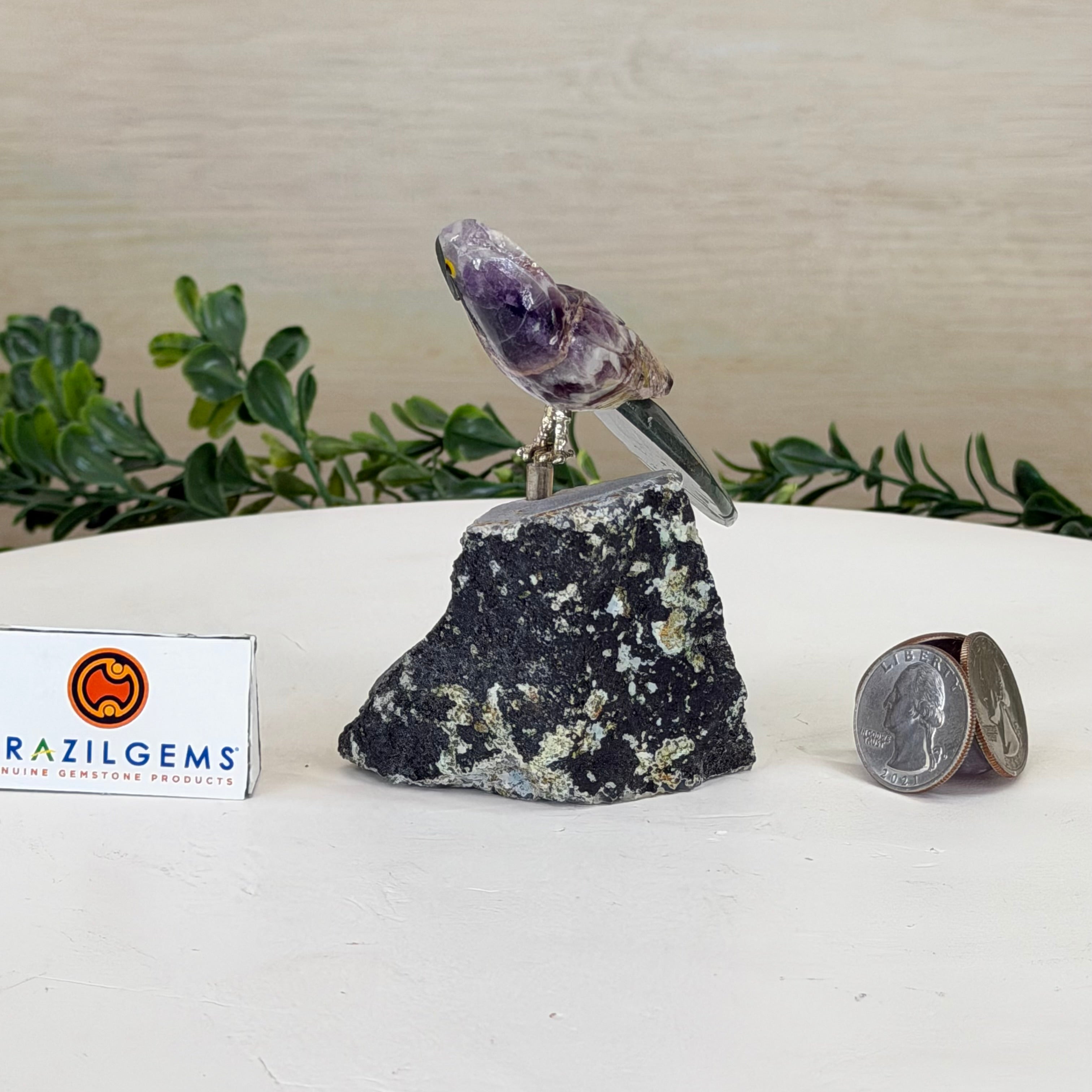 Each intricate detail of these birds is meticulously carved by skilled Brazilian artisans who have mastered the technique that combines the beauty of Brazil's gemstones with their colorful native birds into an amazing art piece. Elevate your space with the timeless charm of our Gemstone birds on an crystal cluster bases.