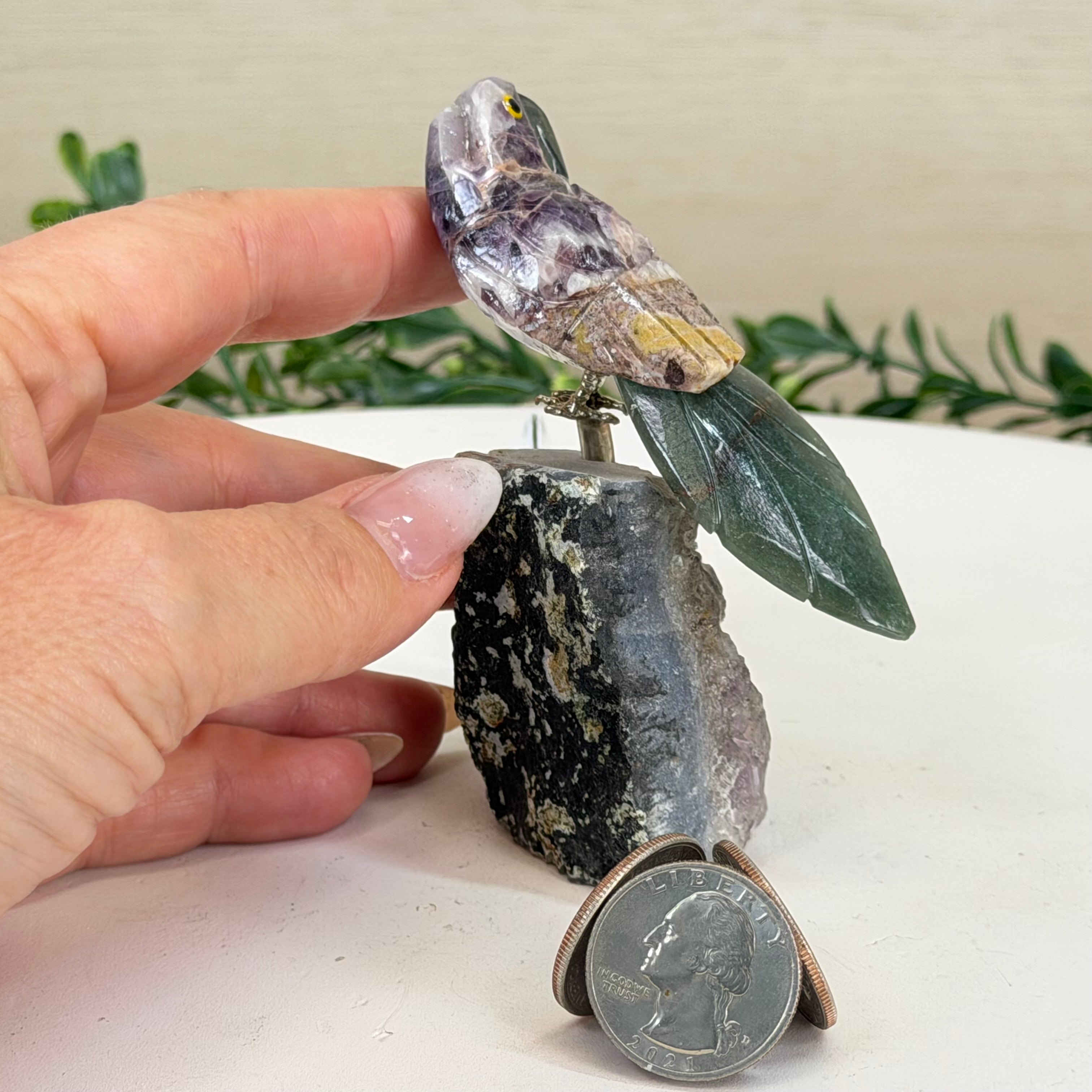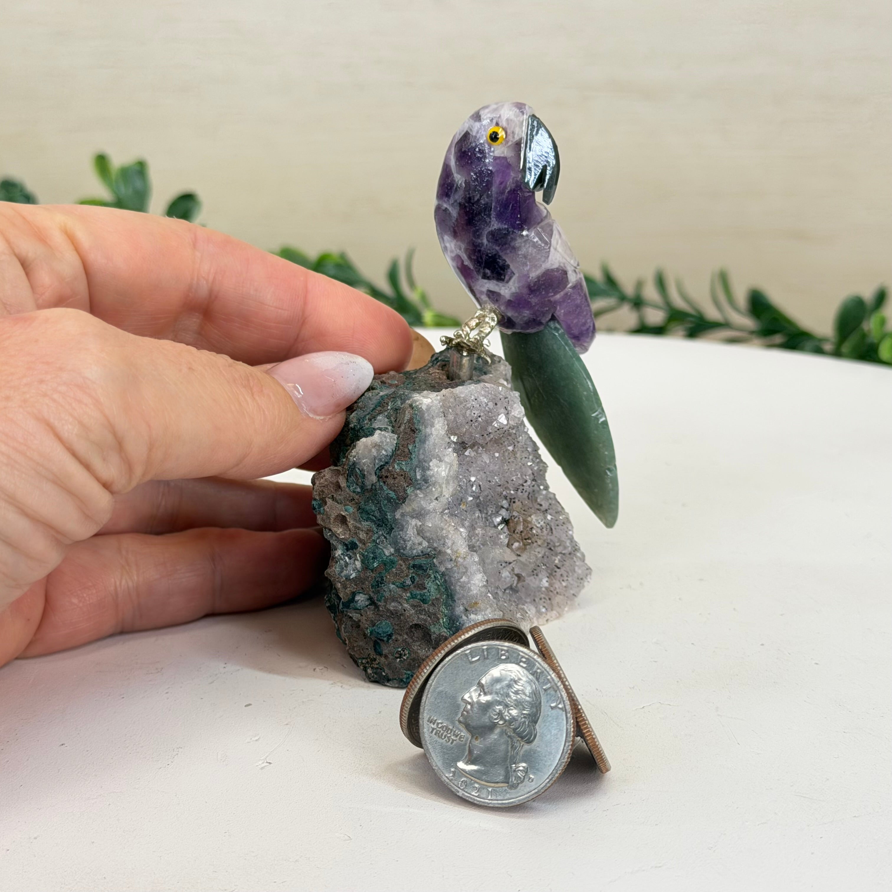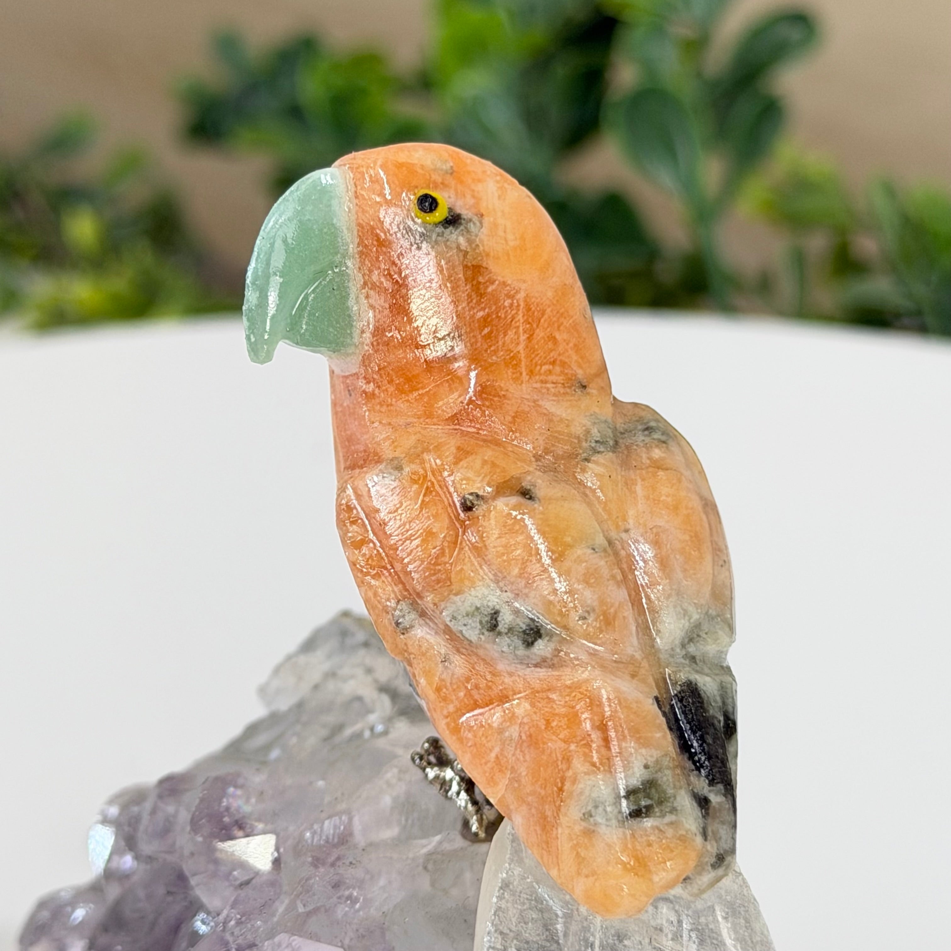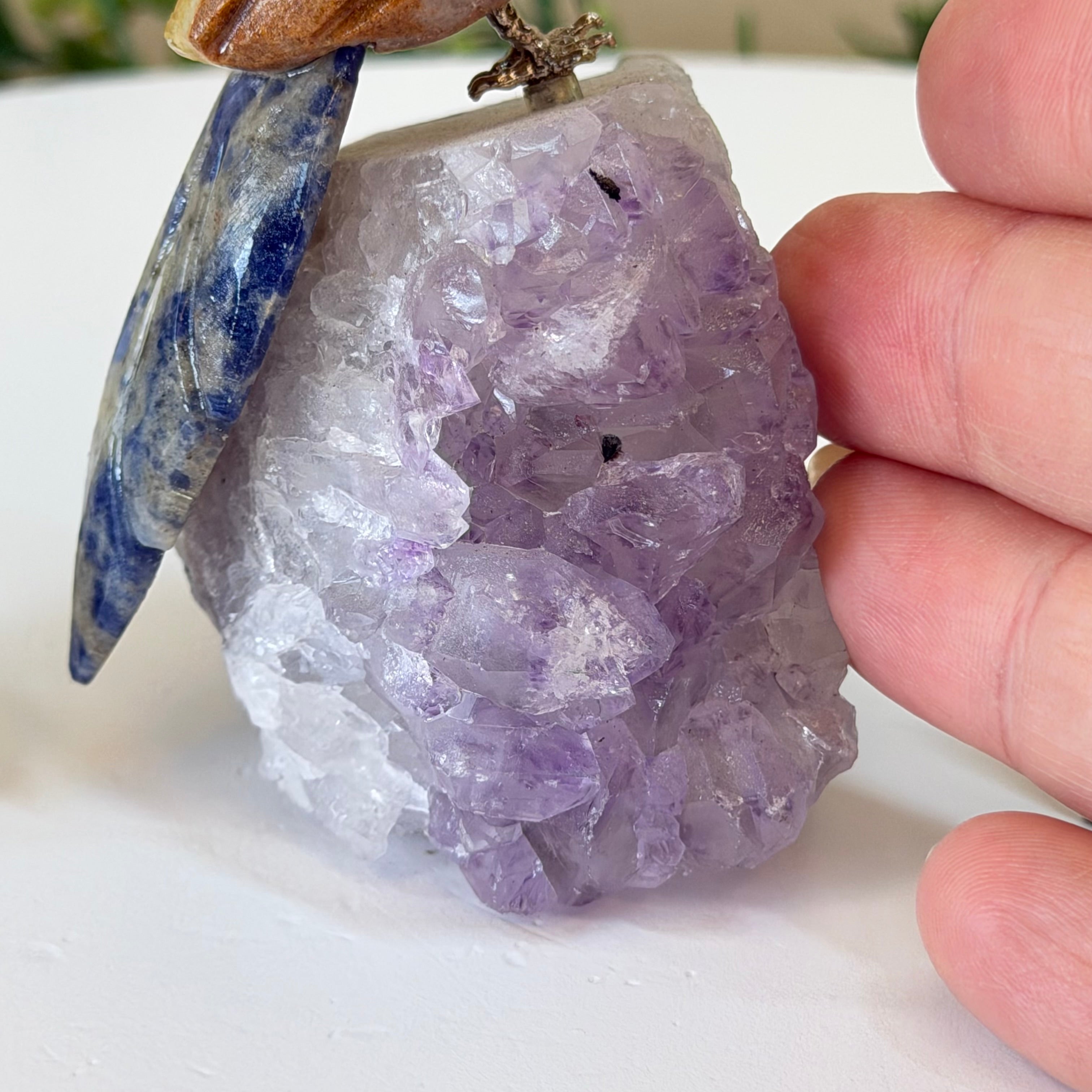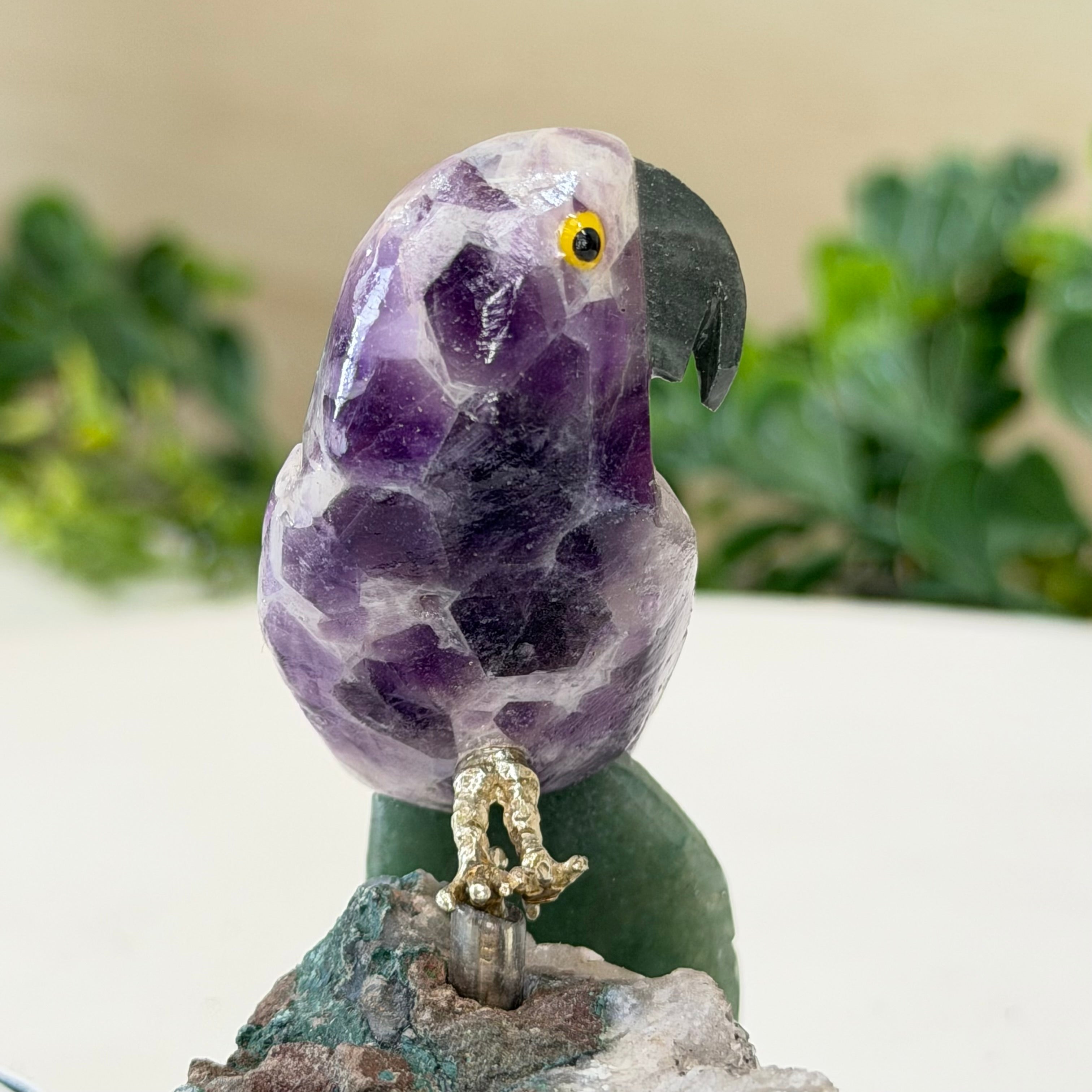 Each intricate detail of these birds is meticulously carved by skilled Brazilian artisans who have mastered the technique that combines the beauty of Brazil's gemstones with their colorful native birds into an amazing art piece. Elevate your space with the timeless charm of our Gemstone birds on an crystal cluster bases.