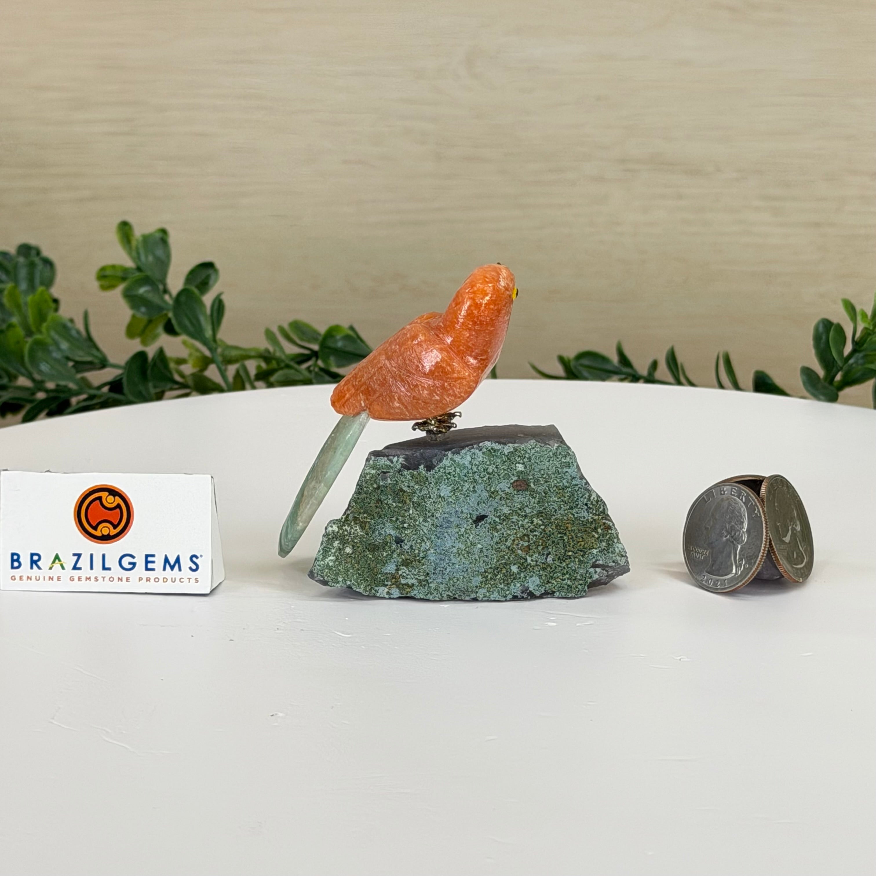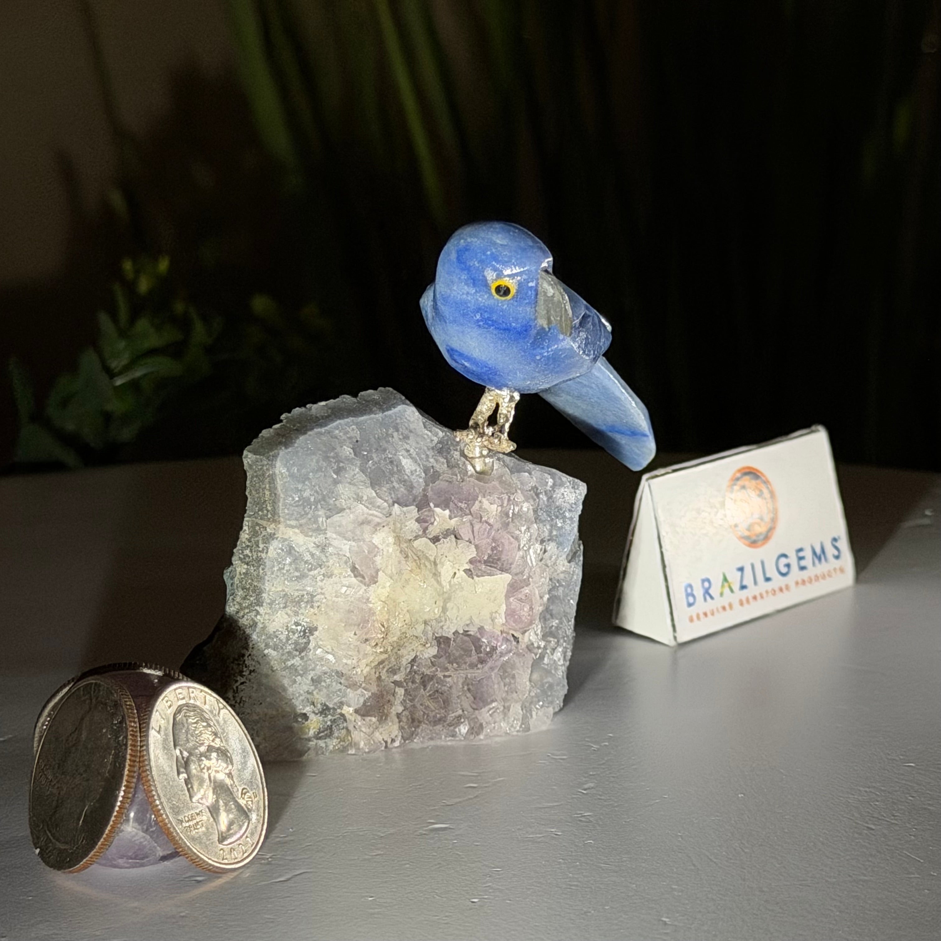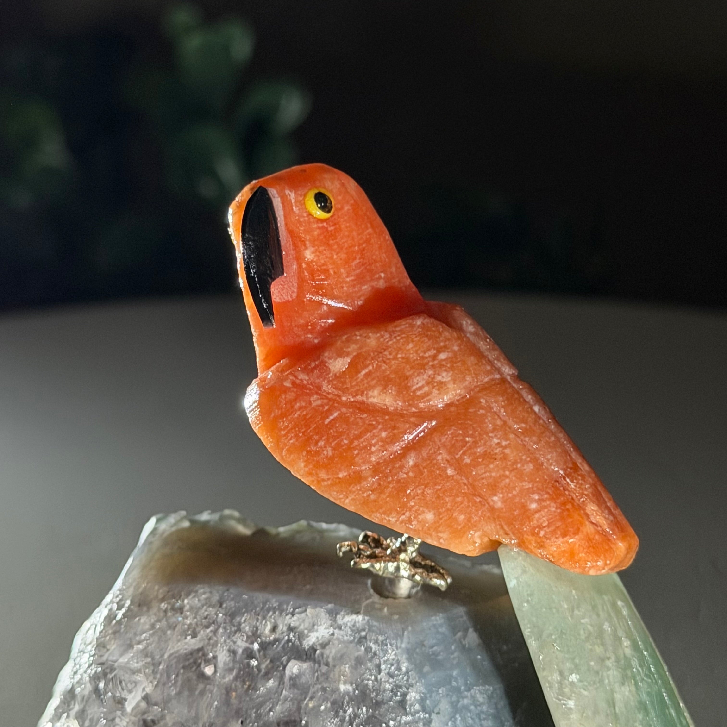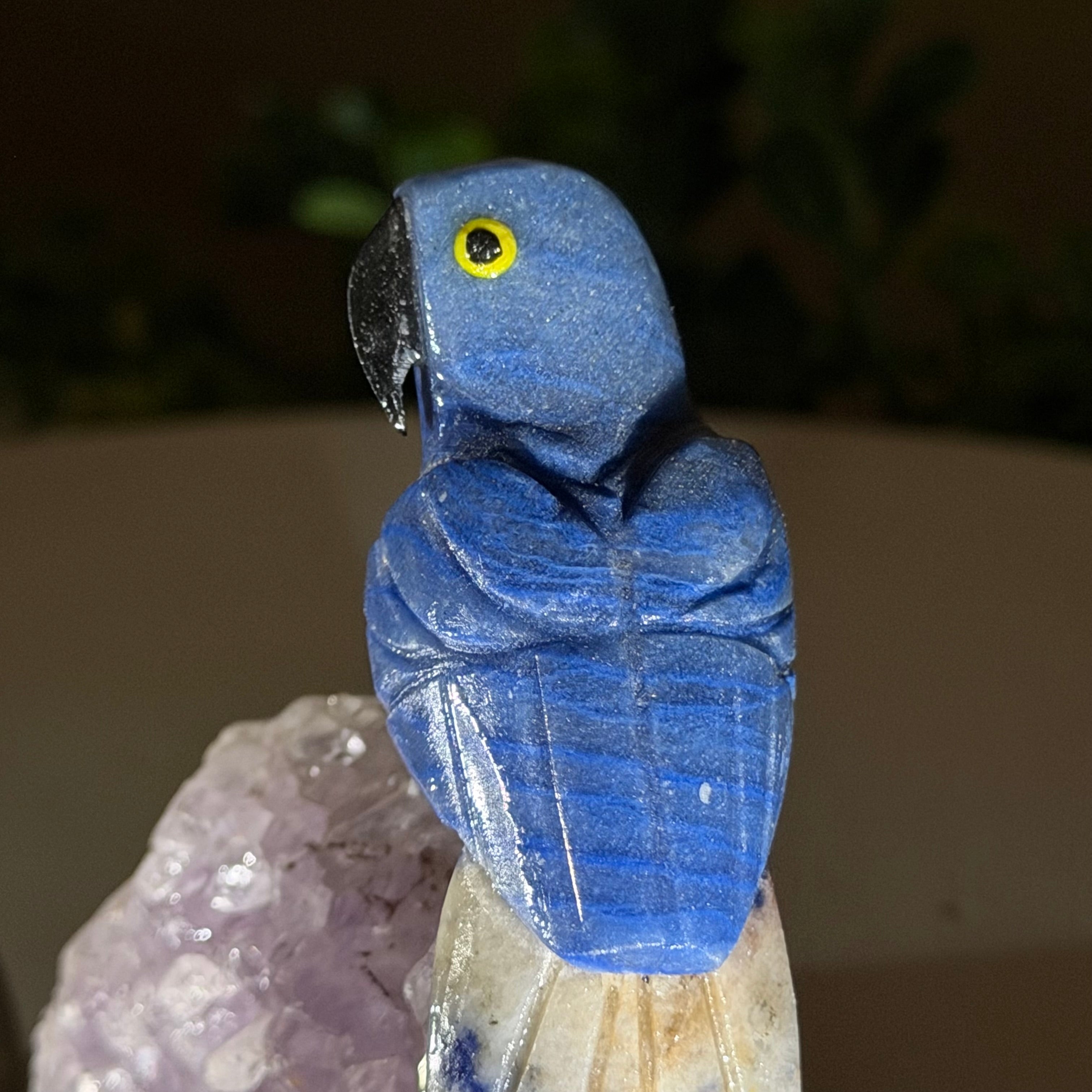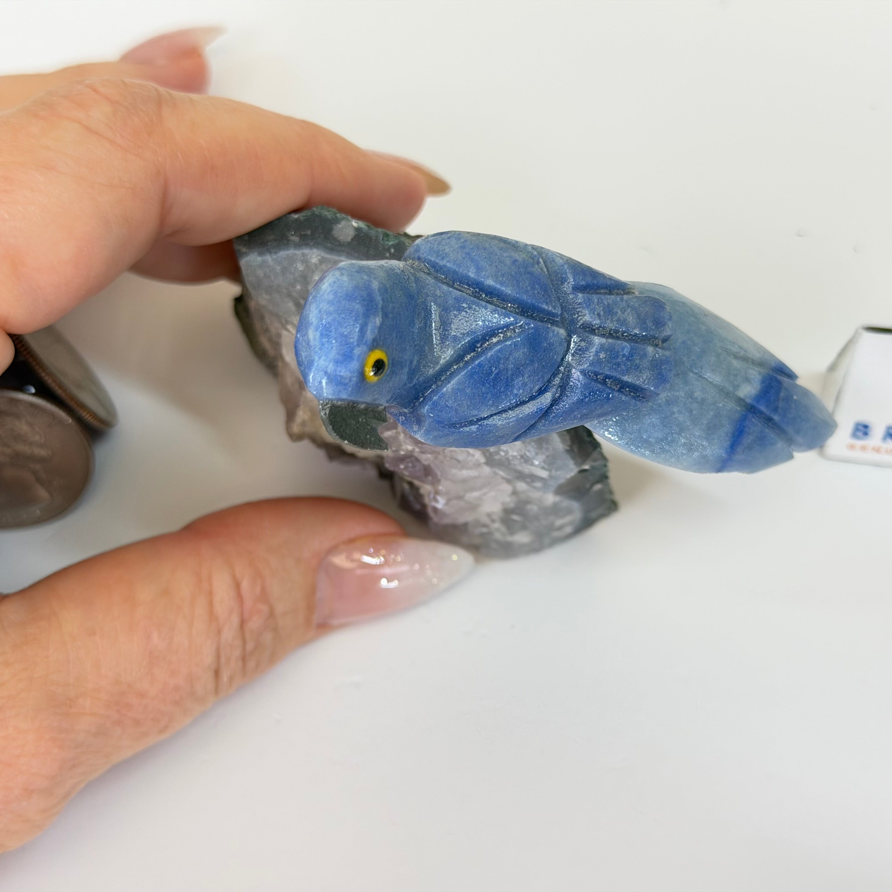 Each intricate detail of these birds is meticulously carved by skilled Brazilian artisans who have mastered the technique that combines the beauty of Brazil's gemstones with their colorful native birds into an amazing art piece. Elevate your space with the timeless charm of our Gemstone birds on an crystal cluster bases.