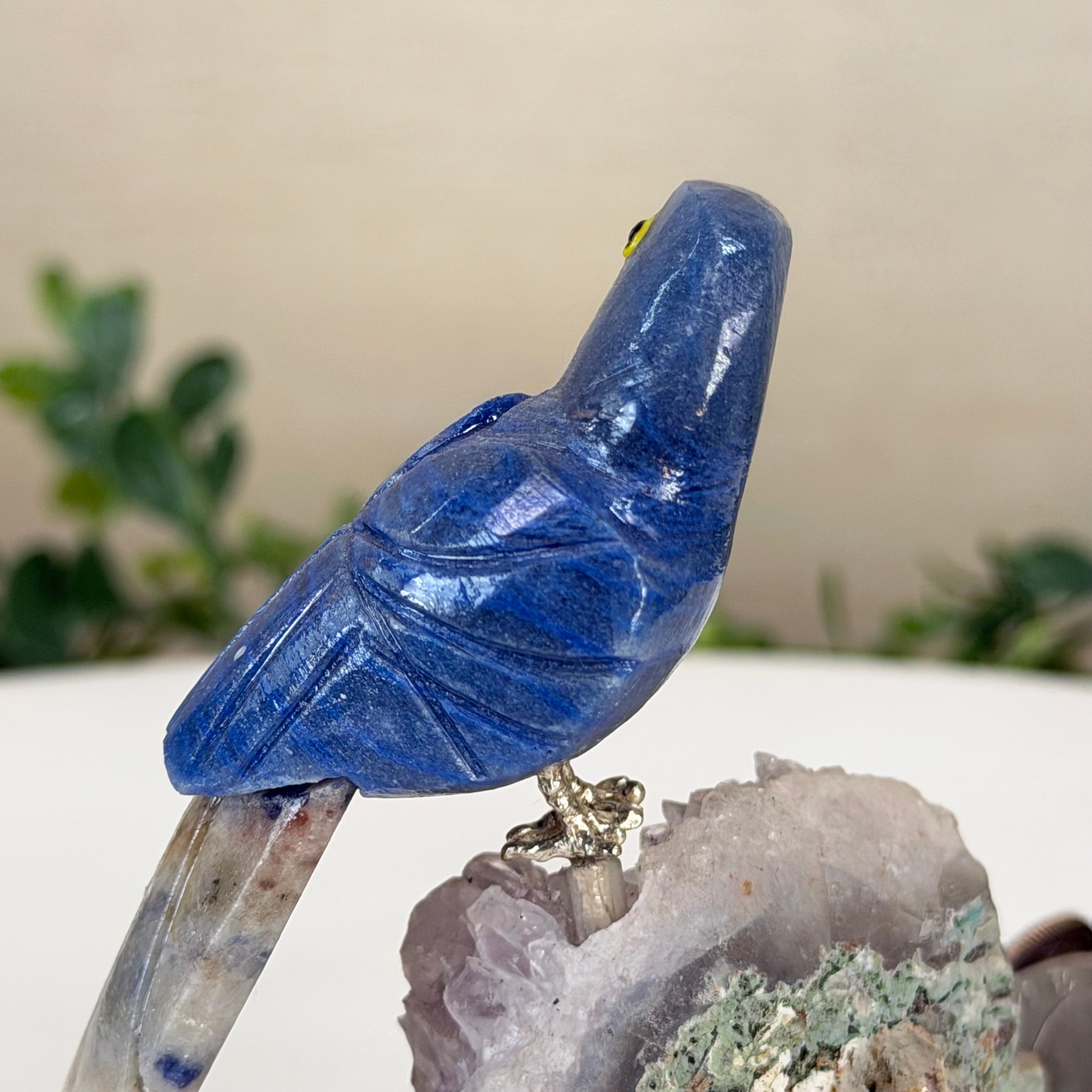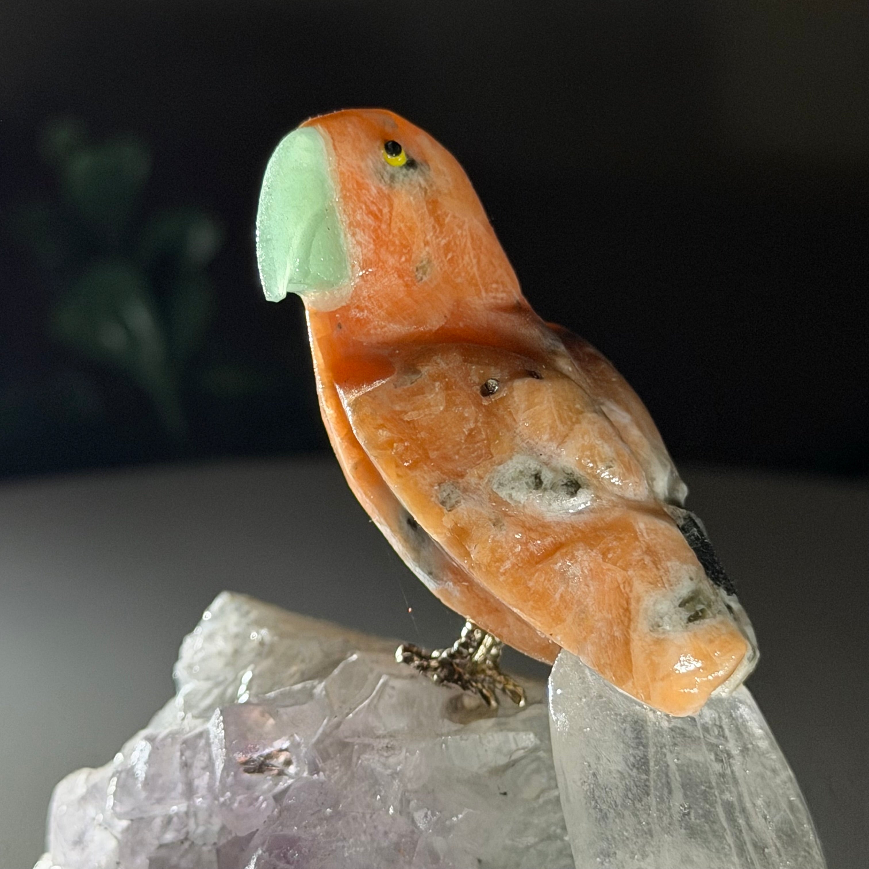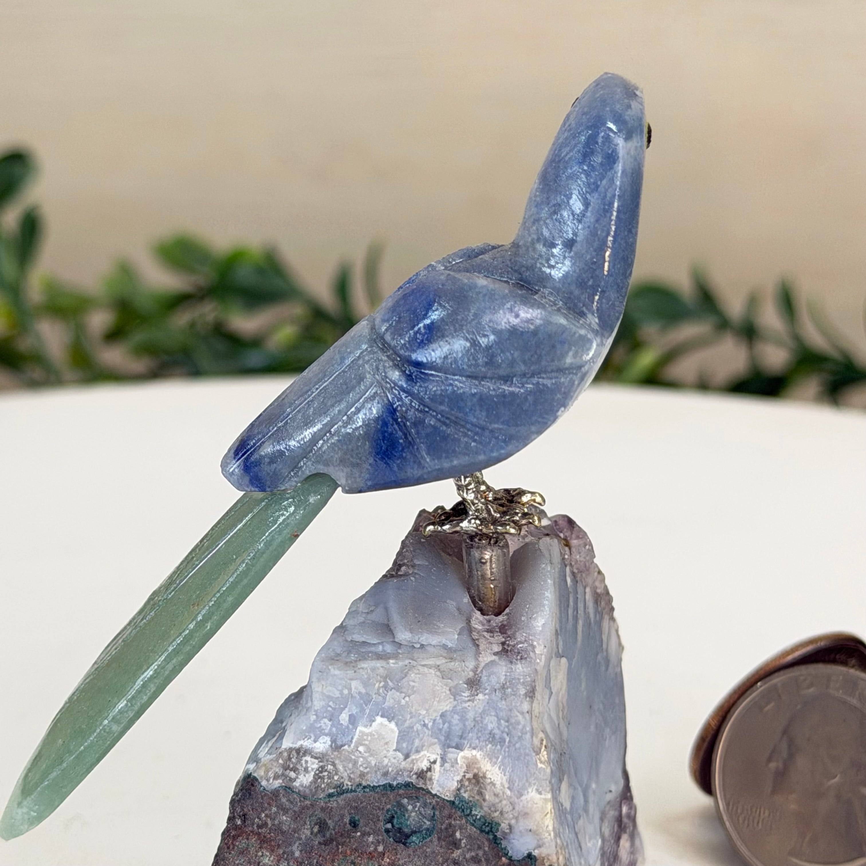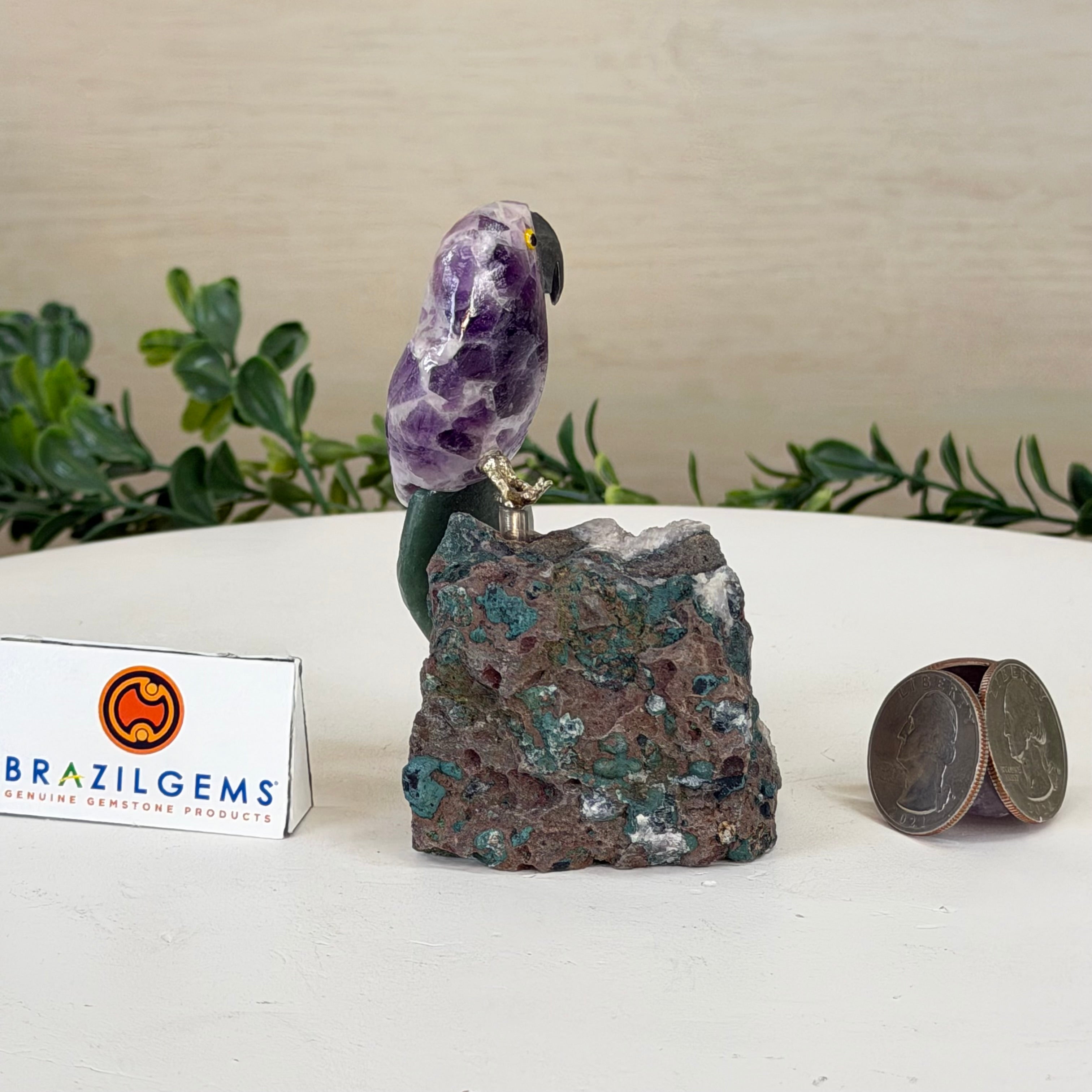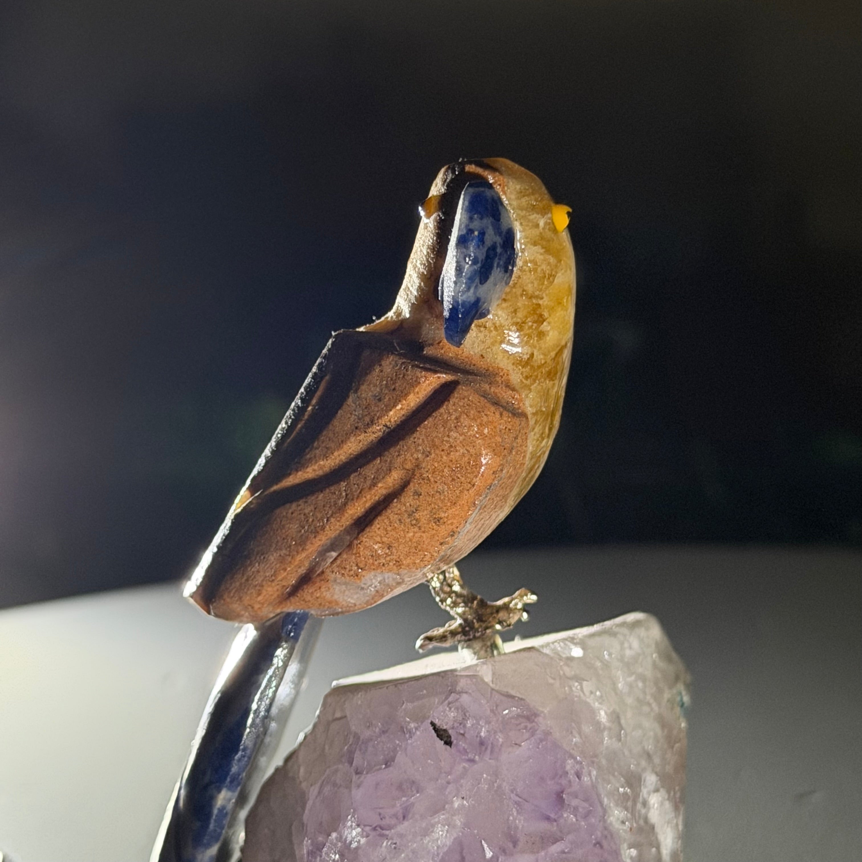 Each intricate detail of these birds is meticulously carved by skilled Brazilian artisans who have mastered the technique that combines the beauty of Brazil's gemstones with their colorful native birds into an amazing art piece. Elevate your space with the timeless charm of our Gemstone birds on an crystal cluster bases.