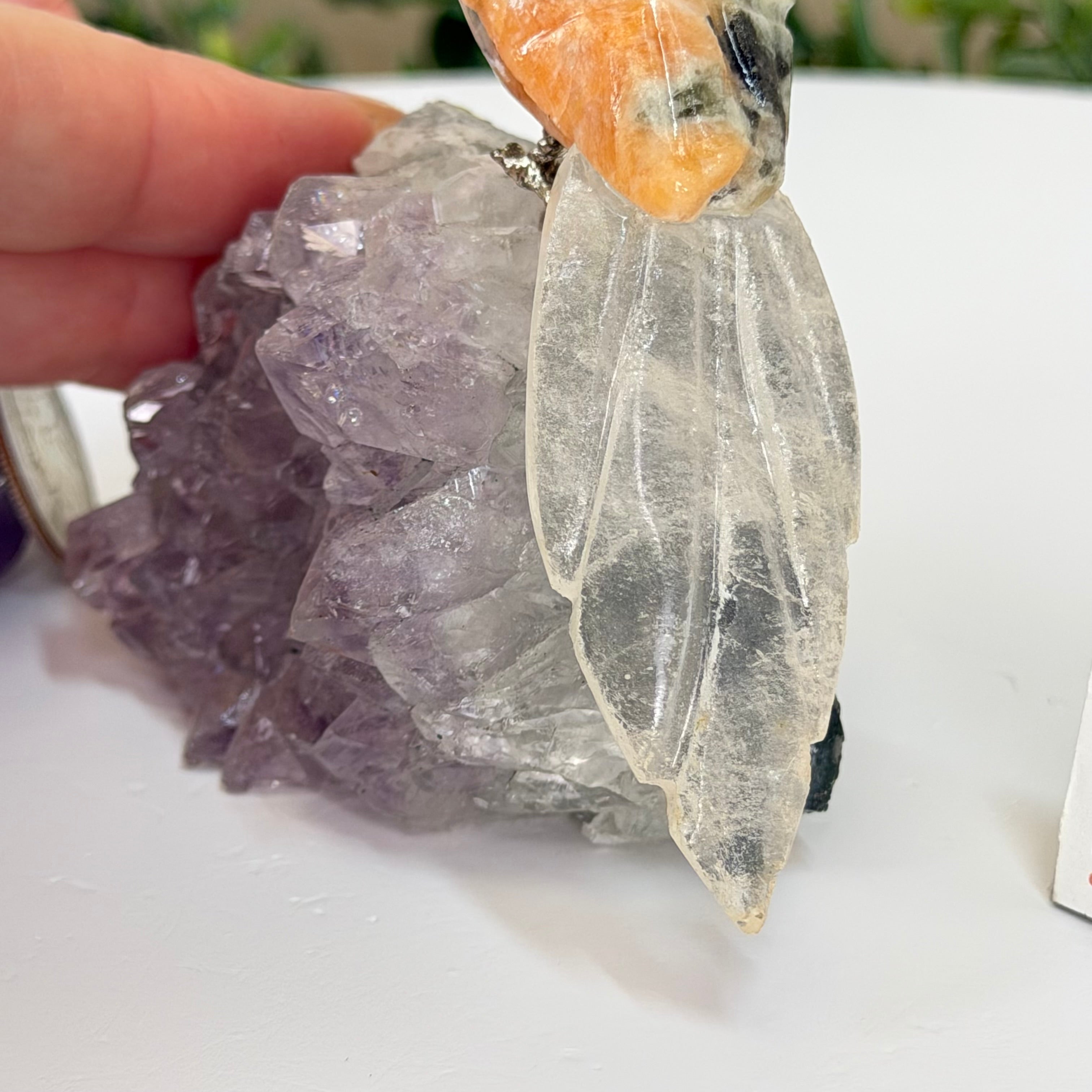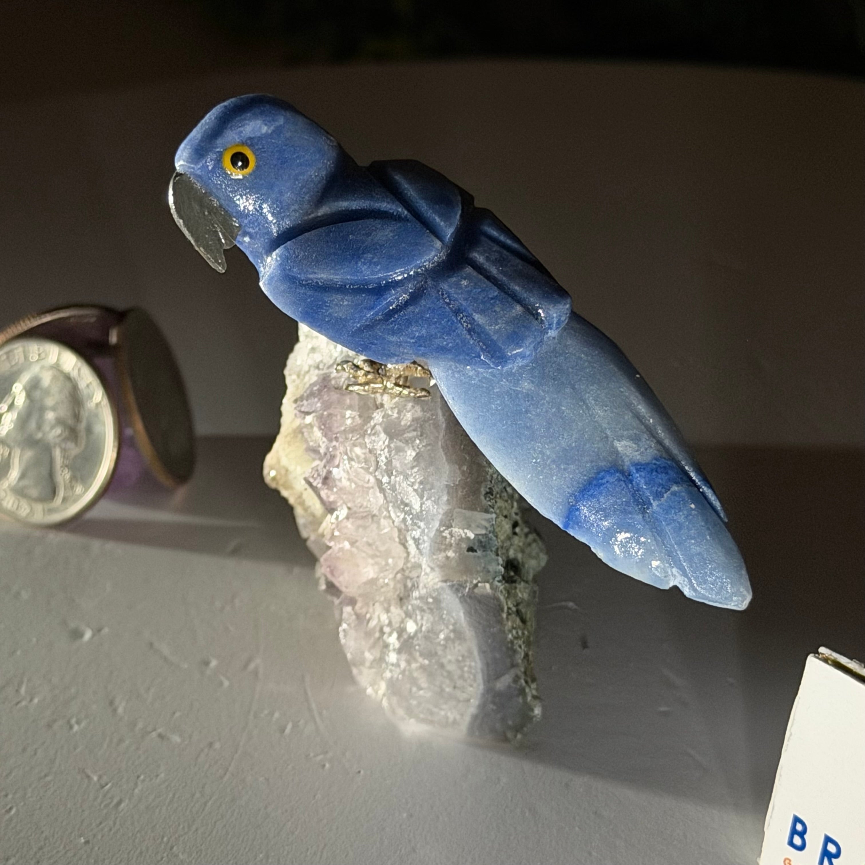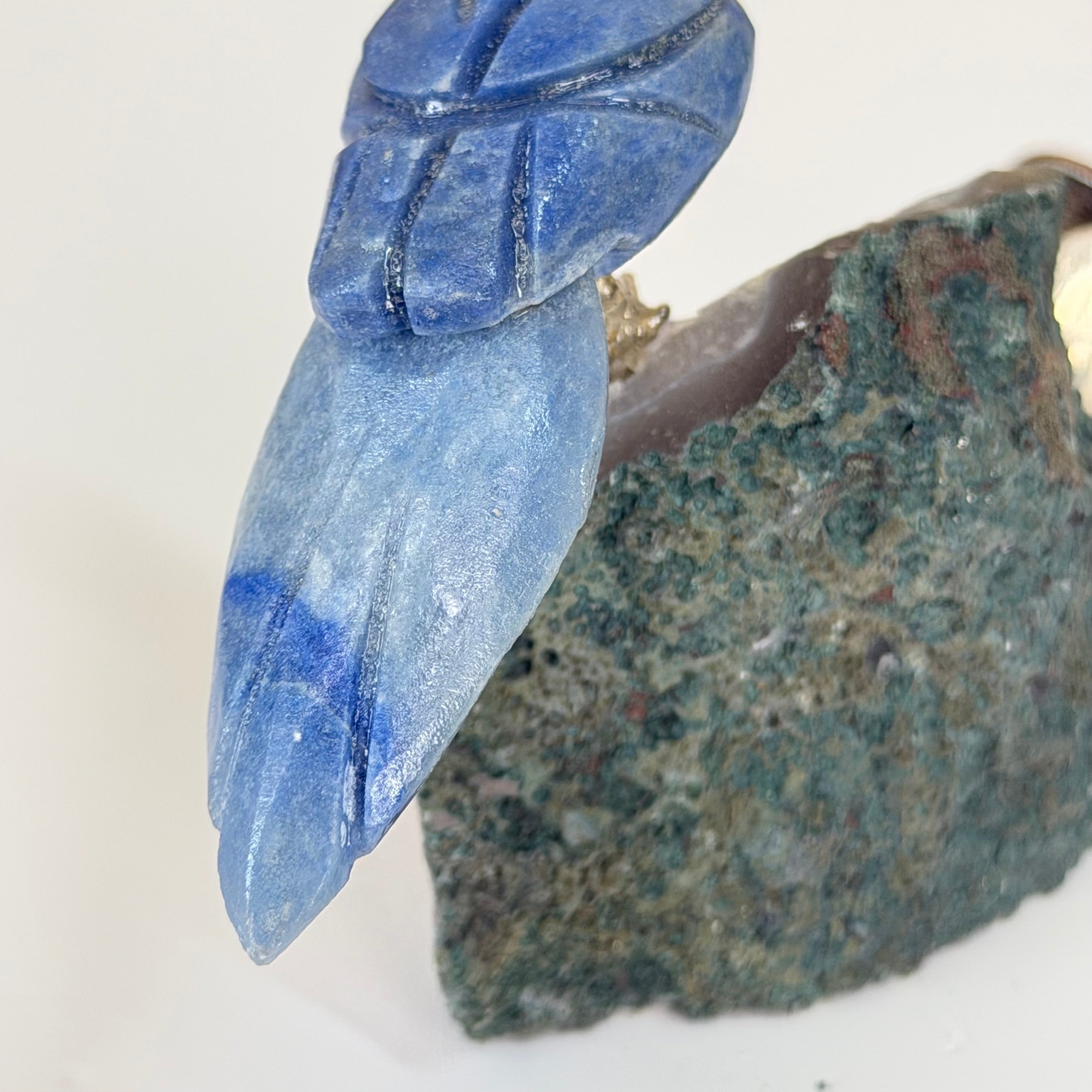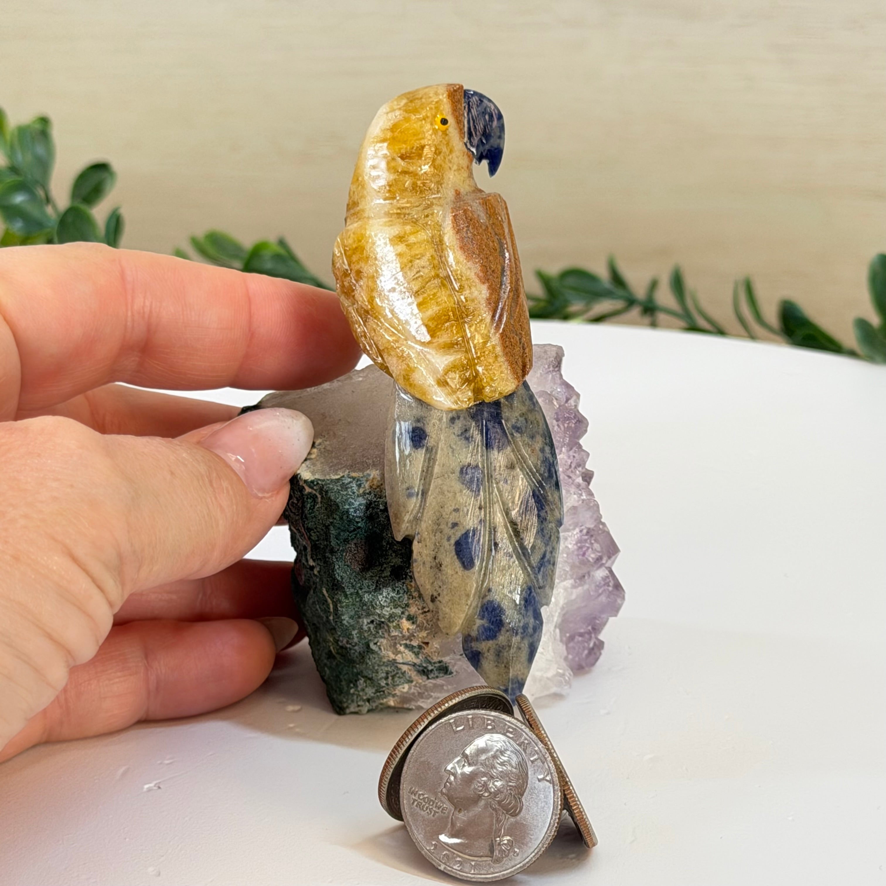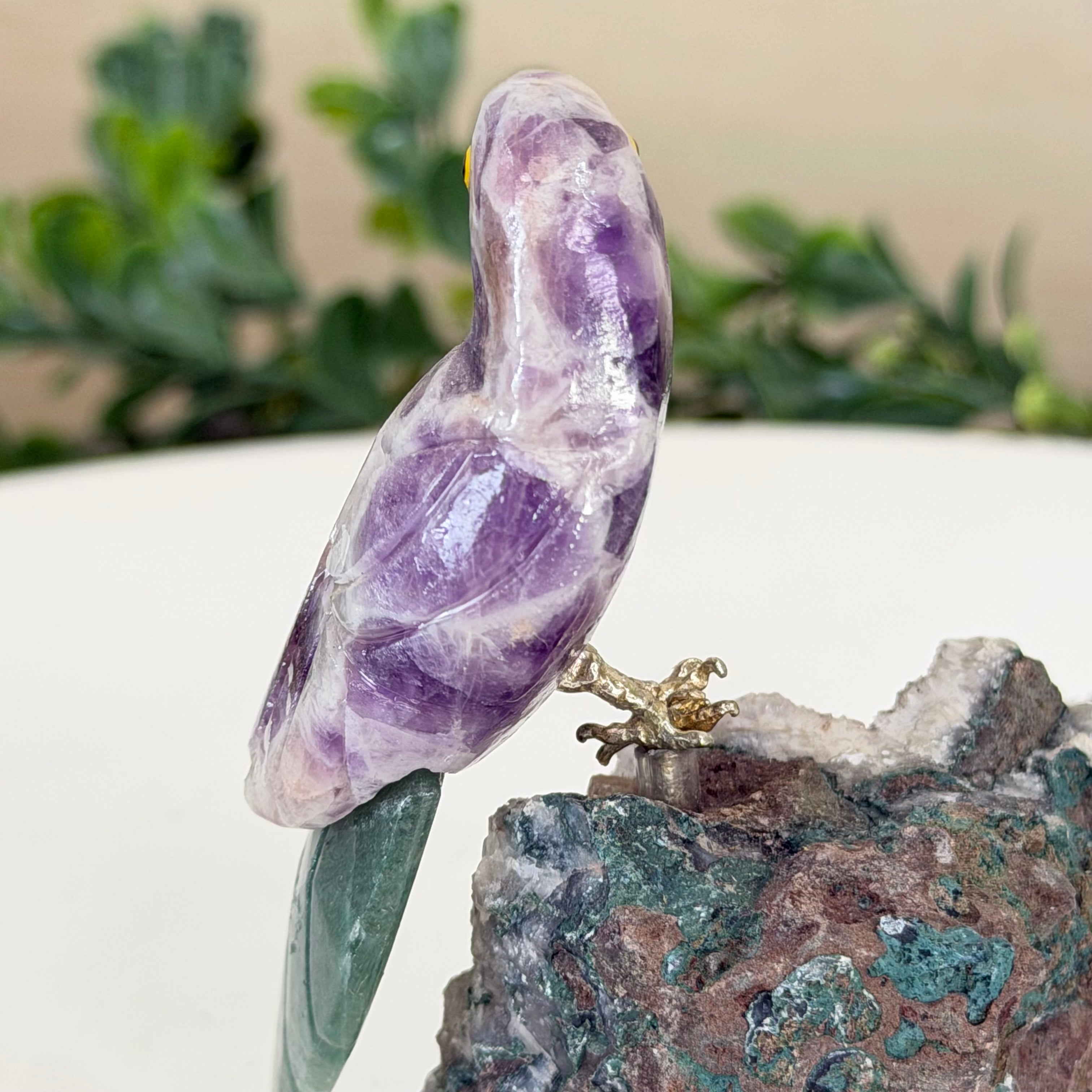 Each intricate detail of these birds is meticulously carved by skilled Brazilian artisans who have mastered the technique that combines the beauty of Brazil's gemstones with their colorful native birds into an amazing art piece. Elevate your space with the timeless charm of our Gemstone birds on an crystal cluster bases.