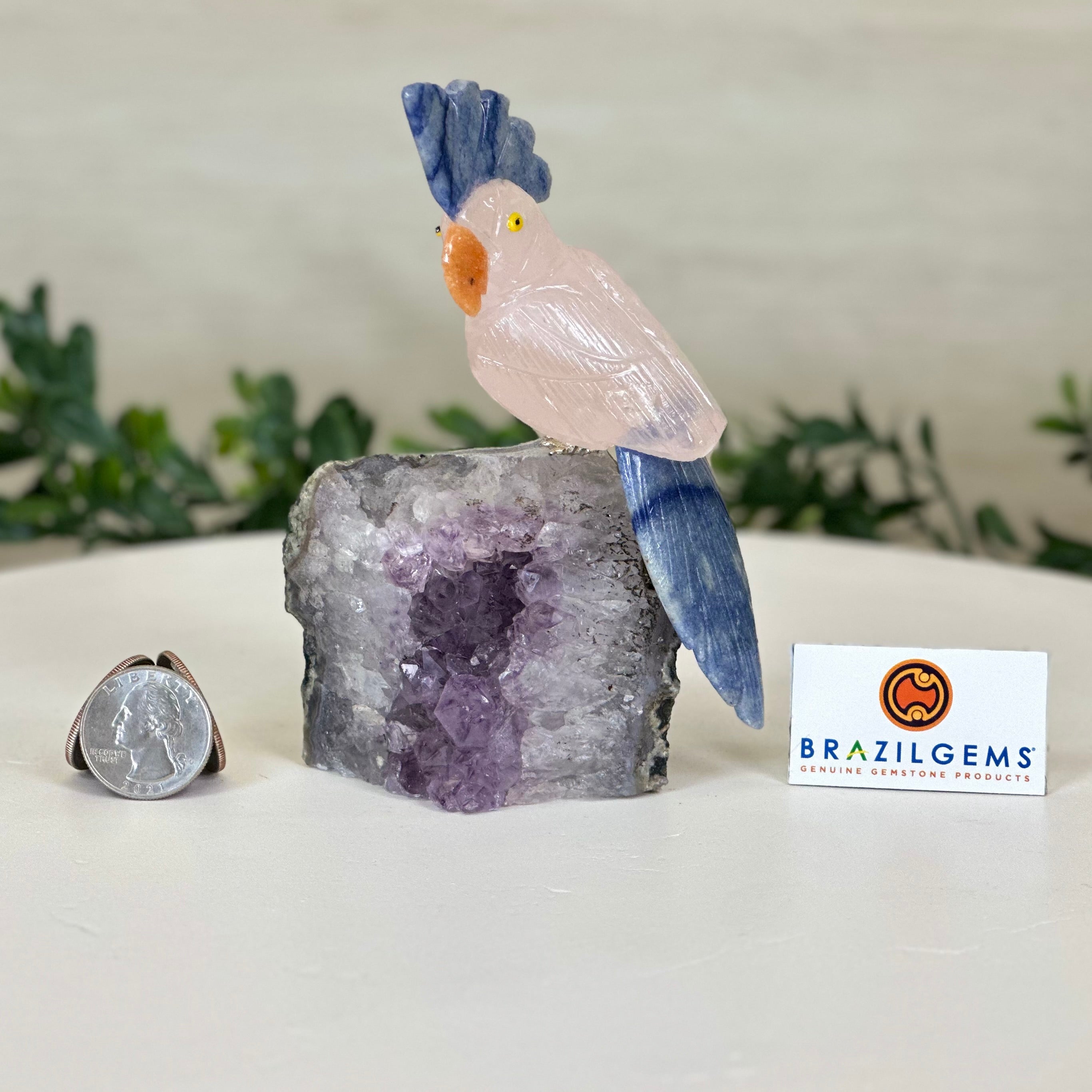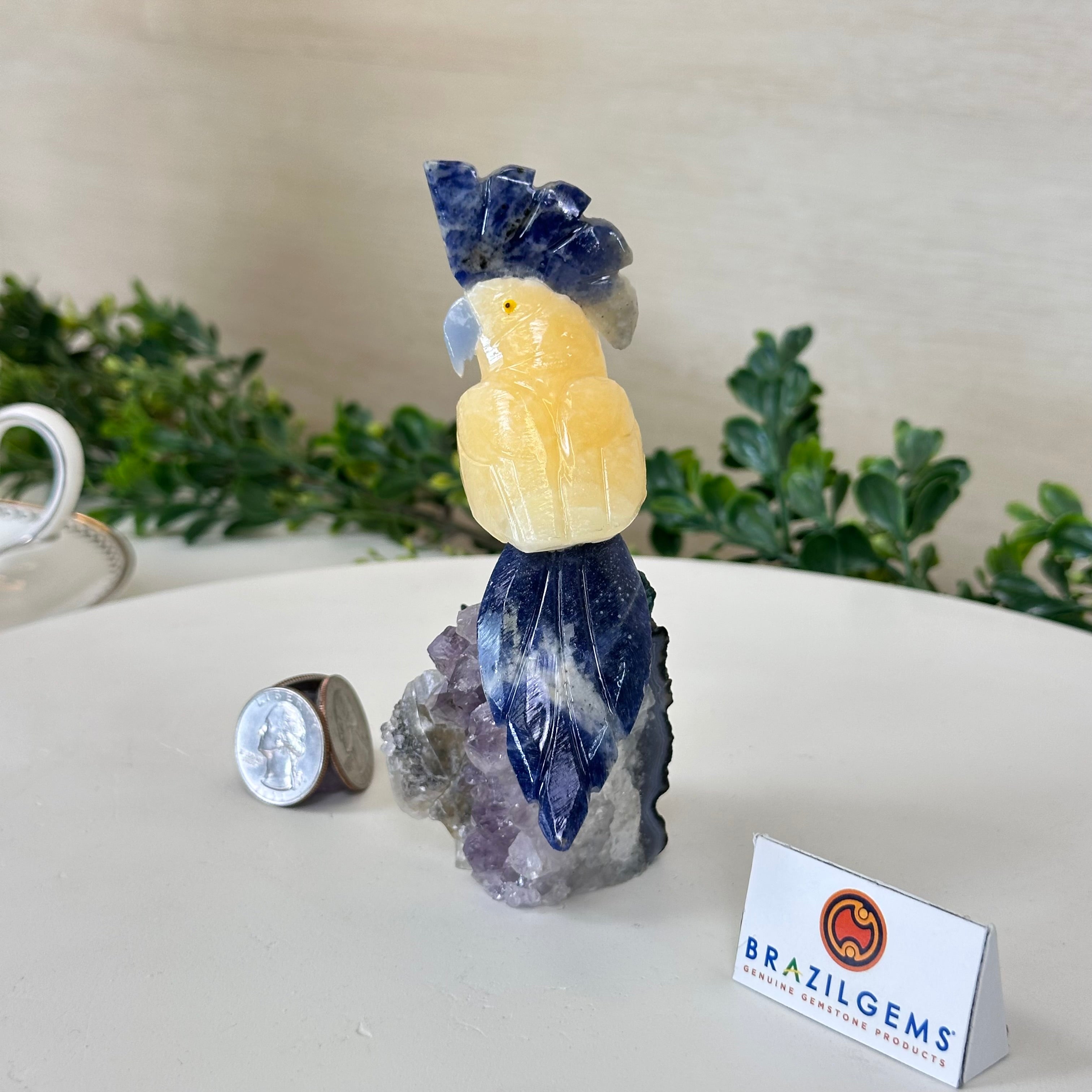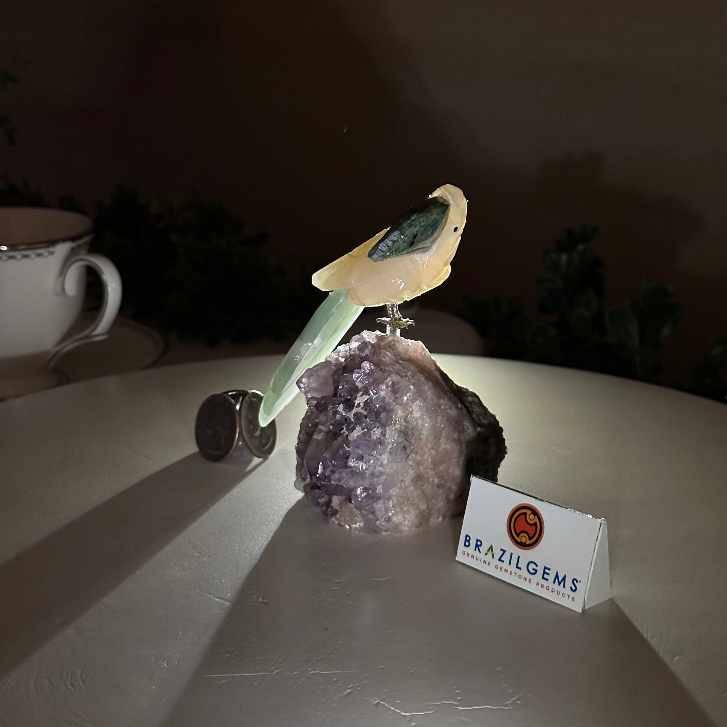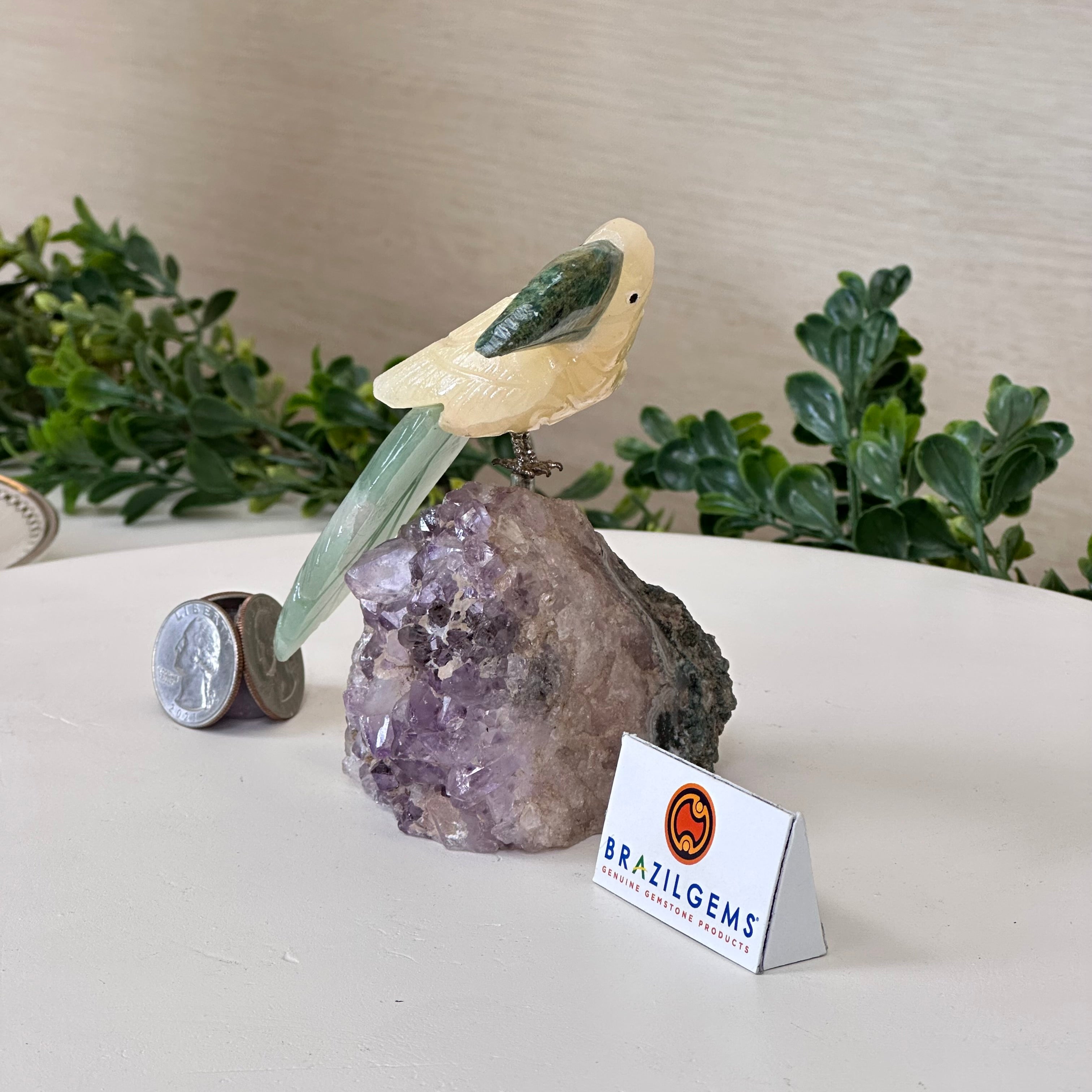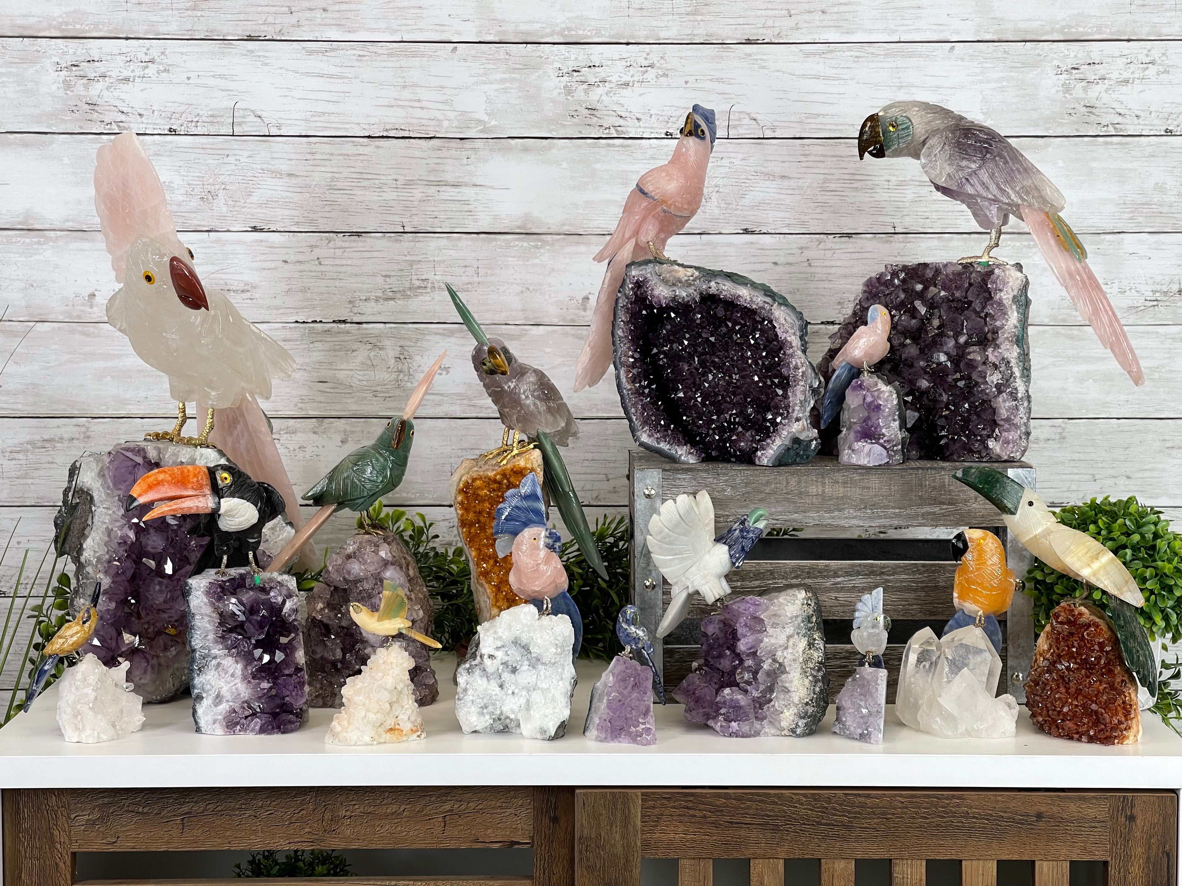 Each intricate detail of these birds is meticulously carved by skilled Brazilian artisans who have mastered the technique that combines the beauty of Brazil's gemstones with their colorful native birds into an amazing art piece. Elevate your space with the timeless charm of our Gemstone birds on an crystal cluster bases.