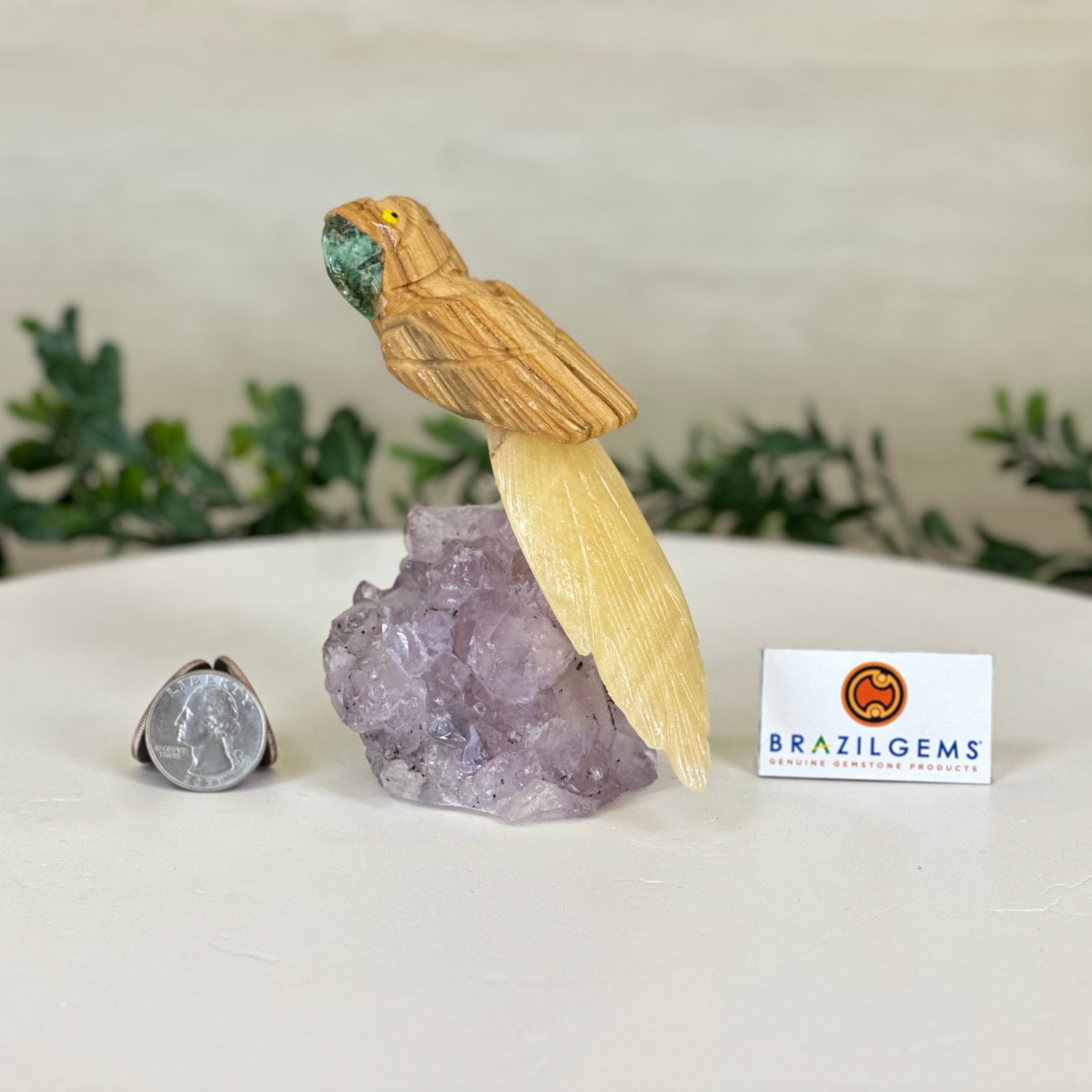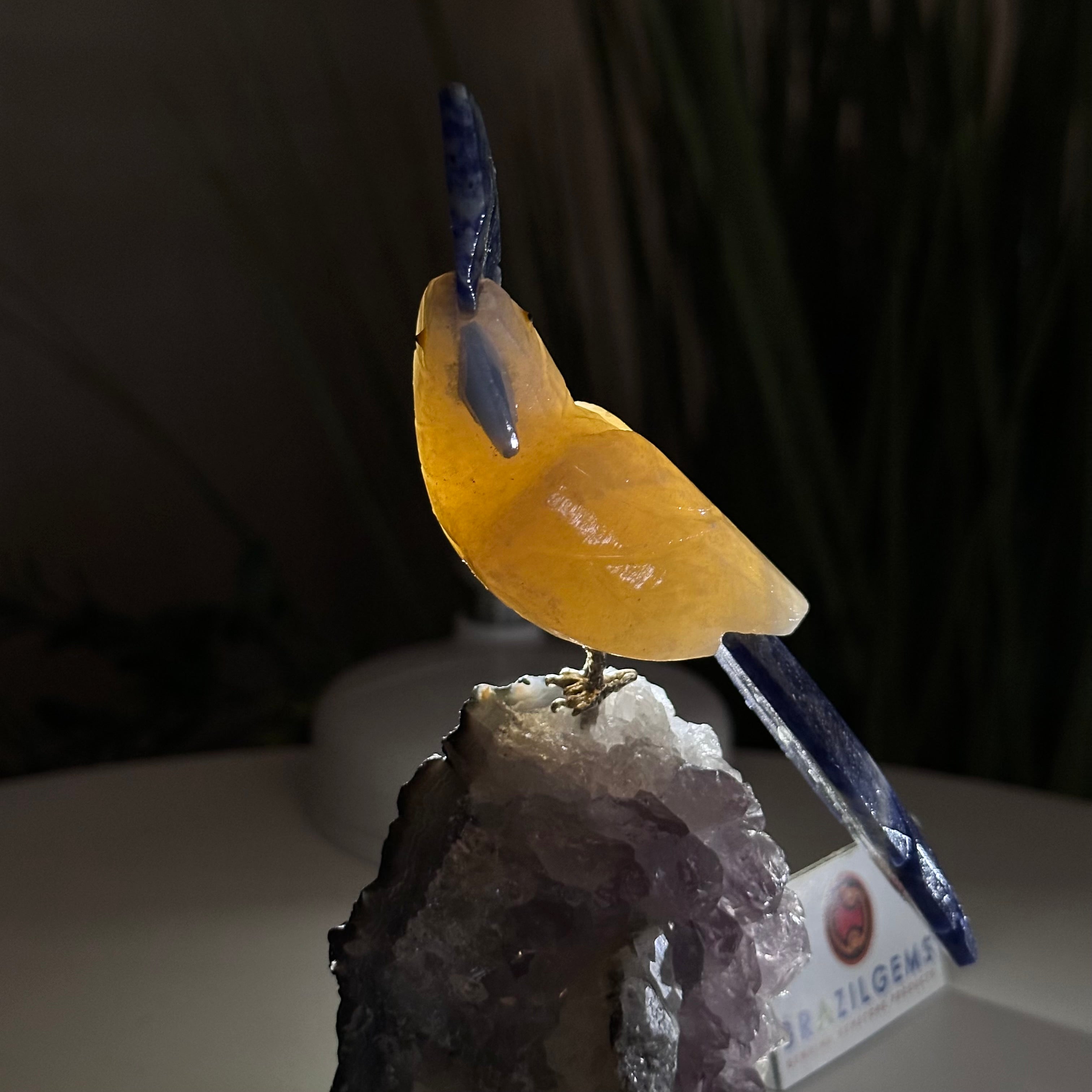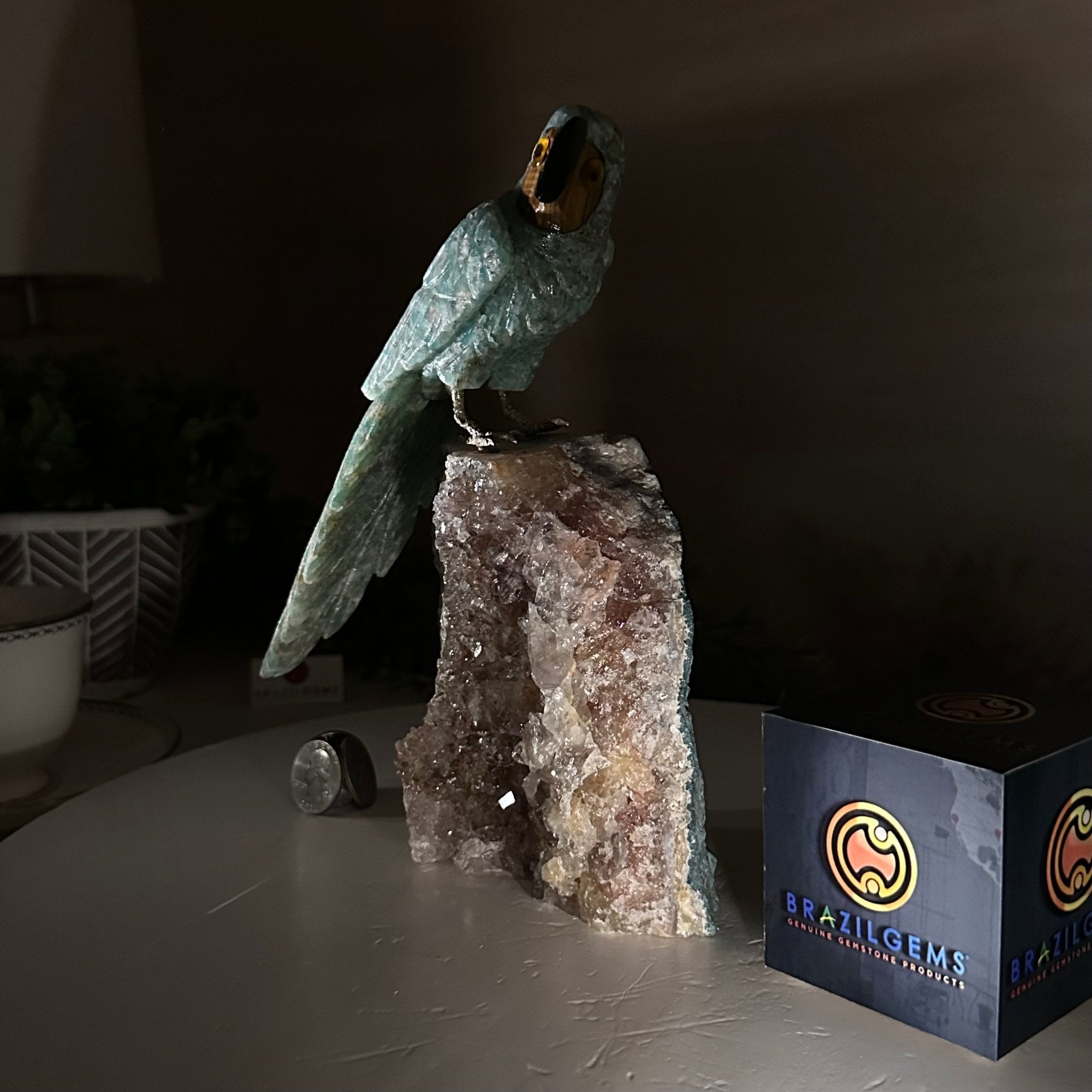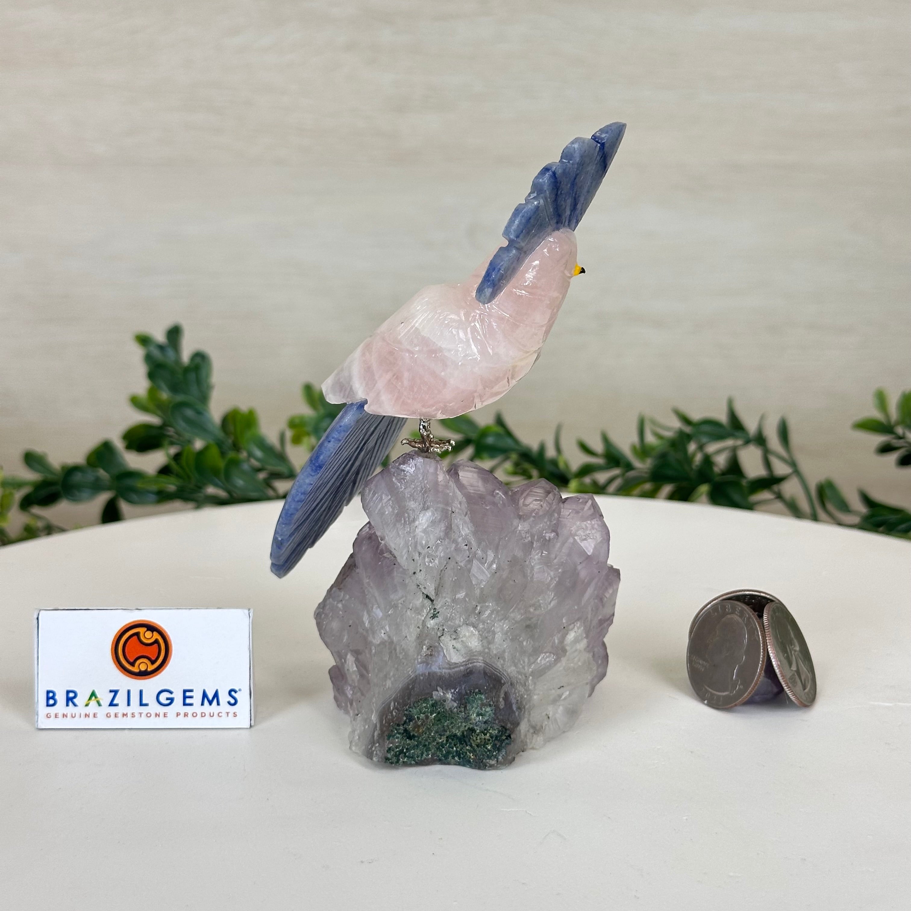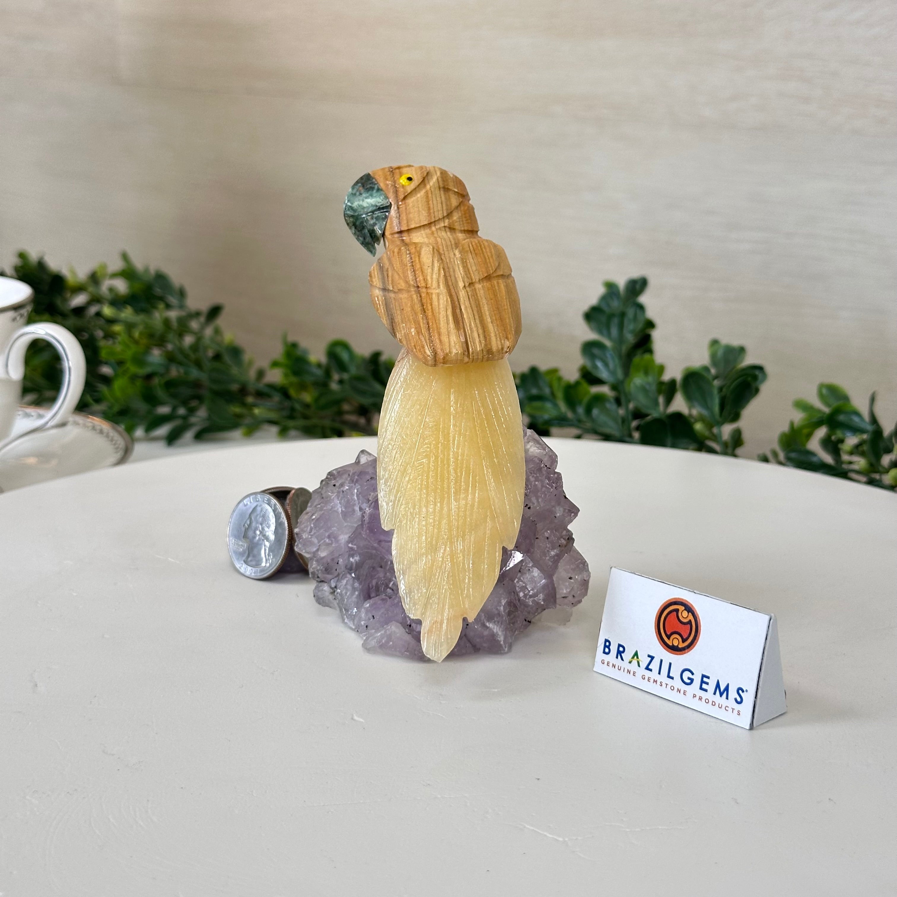 Each intricate detail of these birds is meticulously carved by skilled Brazilian artisans who have mastered the technique that combines the beauty of Brazil's gemstones with their colorful native birds into an amazing art piece. Elevate your space with the timeless charm of our Gemstone birds on an crystal cluster bases.