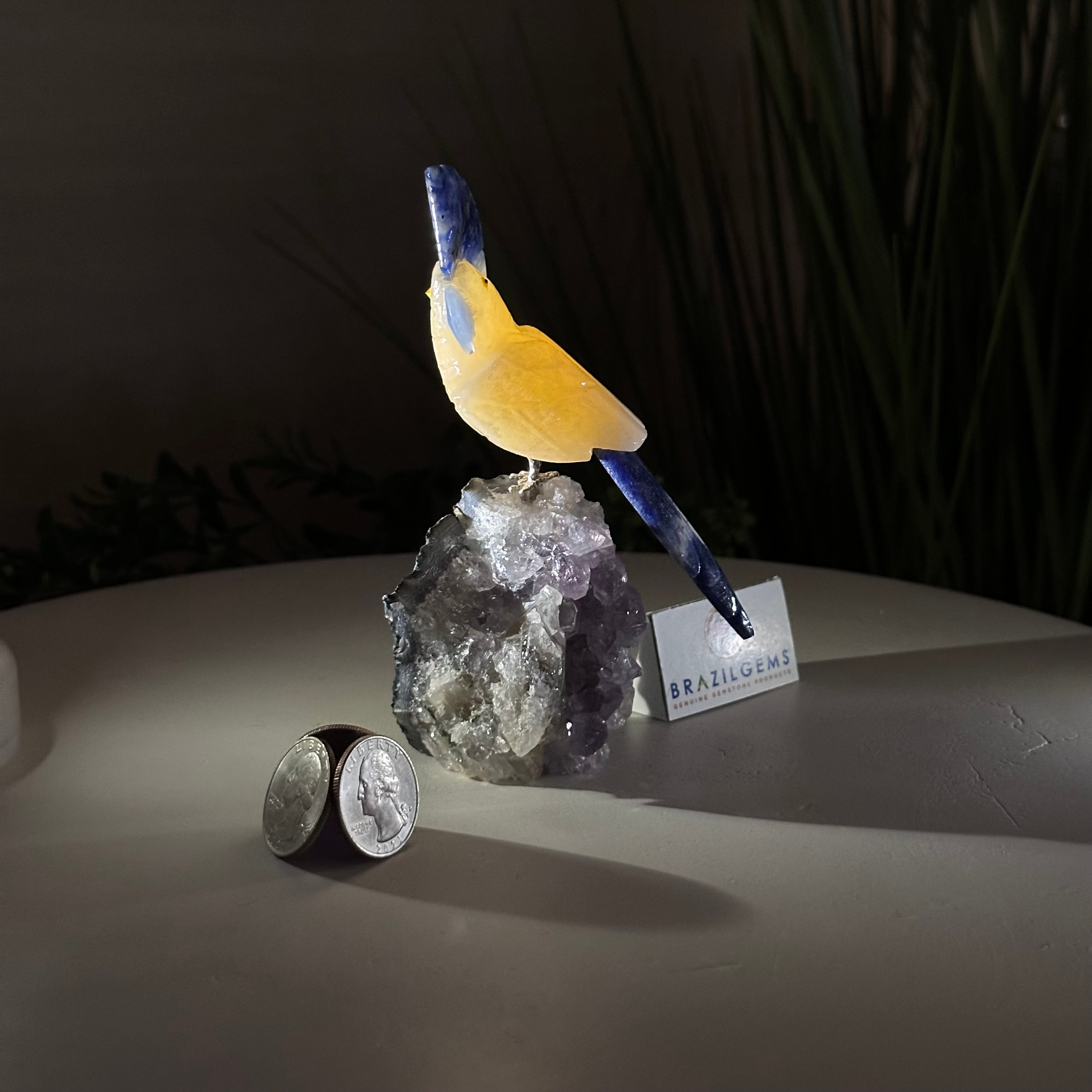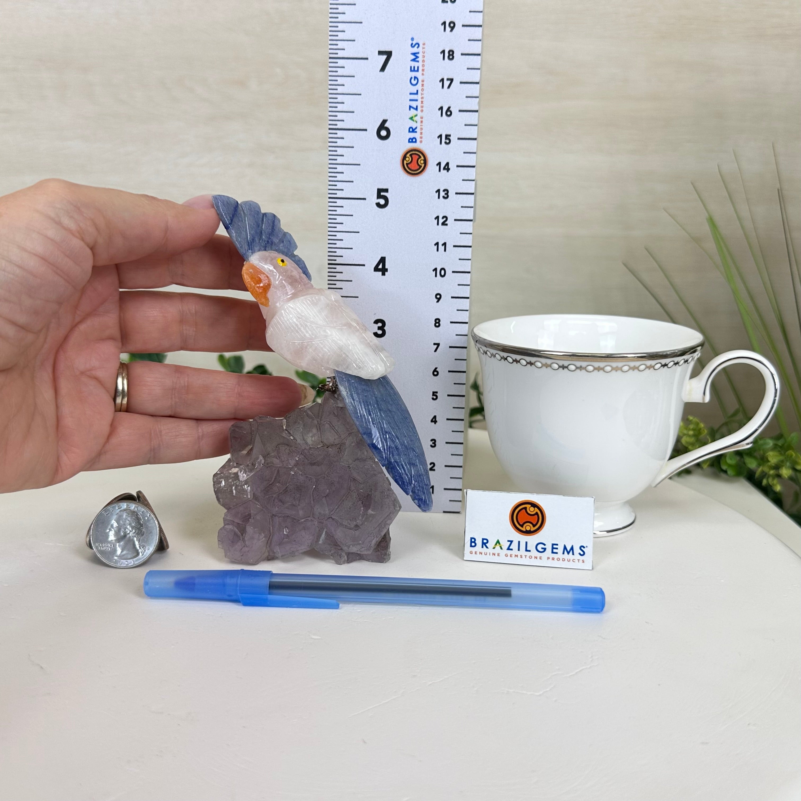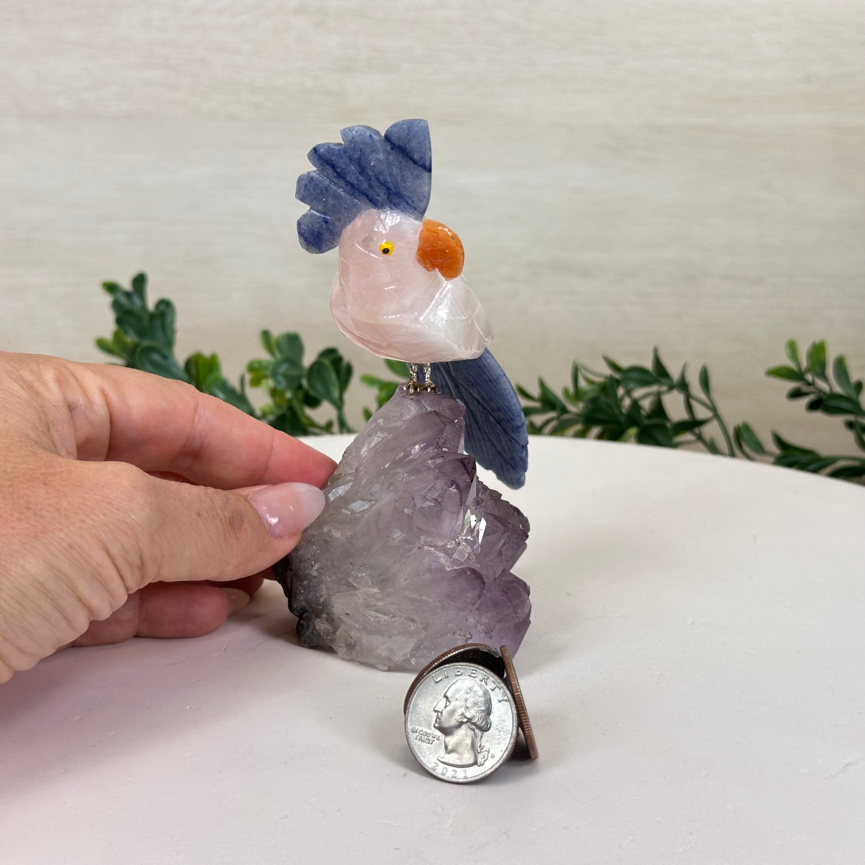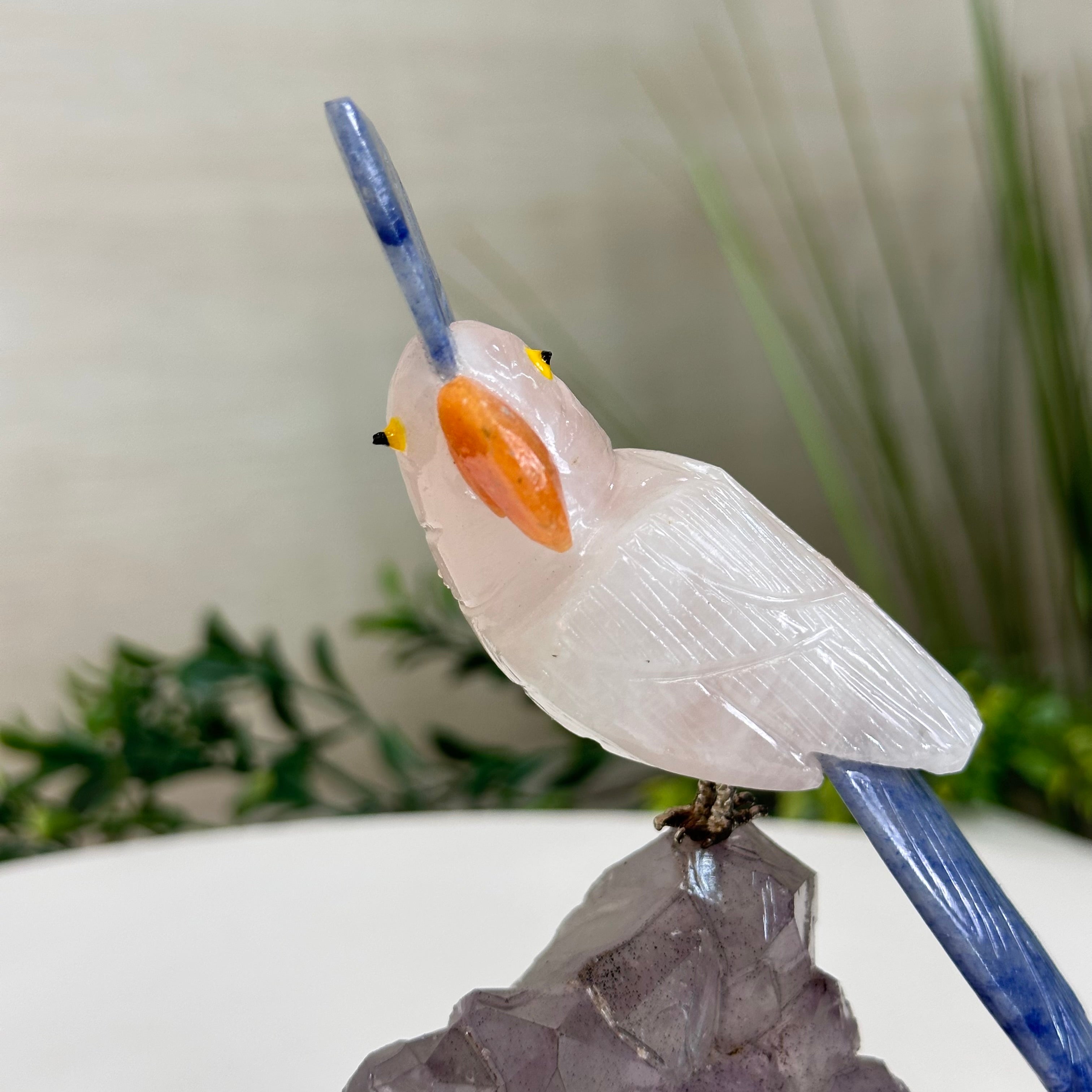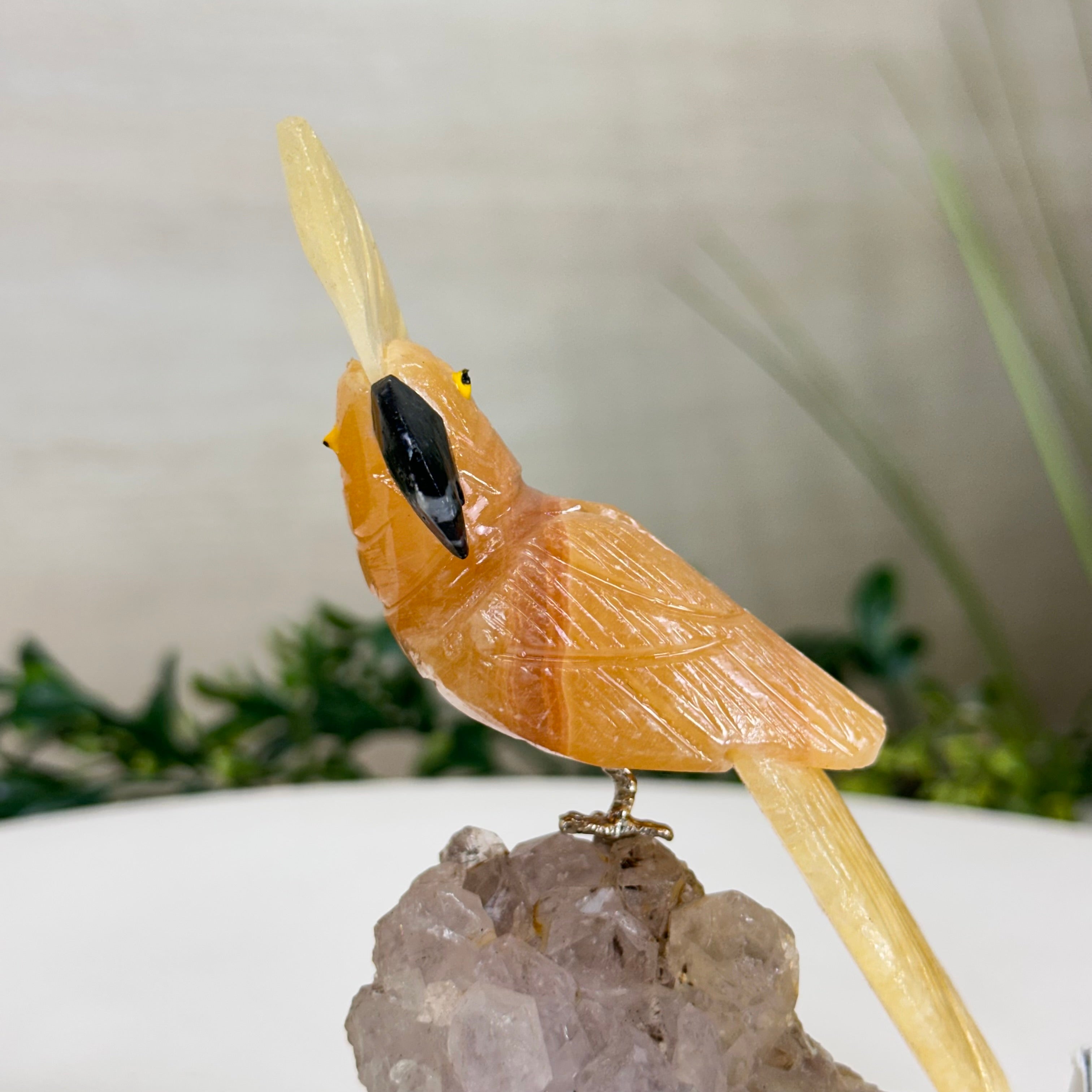 Each intricate detail of these birds is meticulously carved by skilled Brazilian artisans who have mastered the technique that combines the beauty of Brazil's gemstones with their colorful native birds into an amazing art piece. Elevate your space with the timeless charm of our Gemstone birds on an crystal cluster bases.
