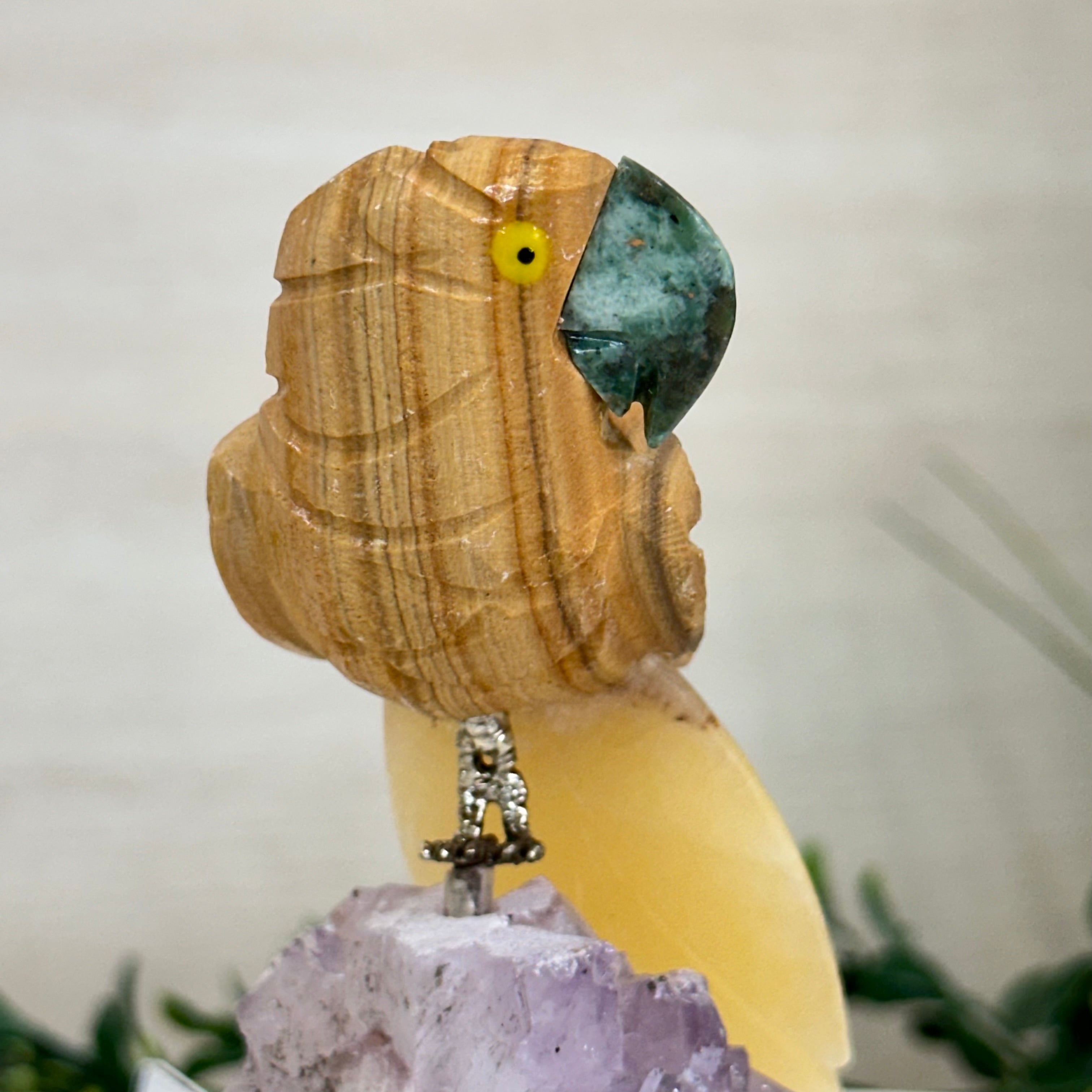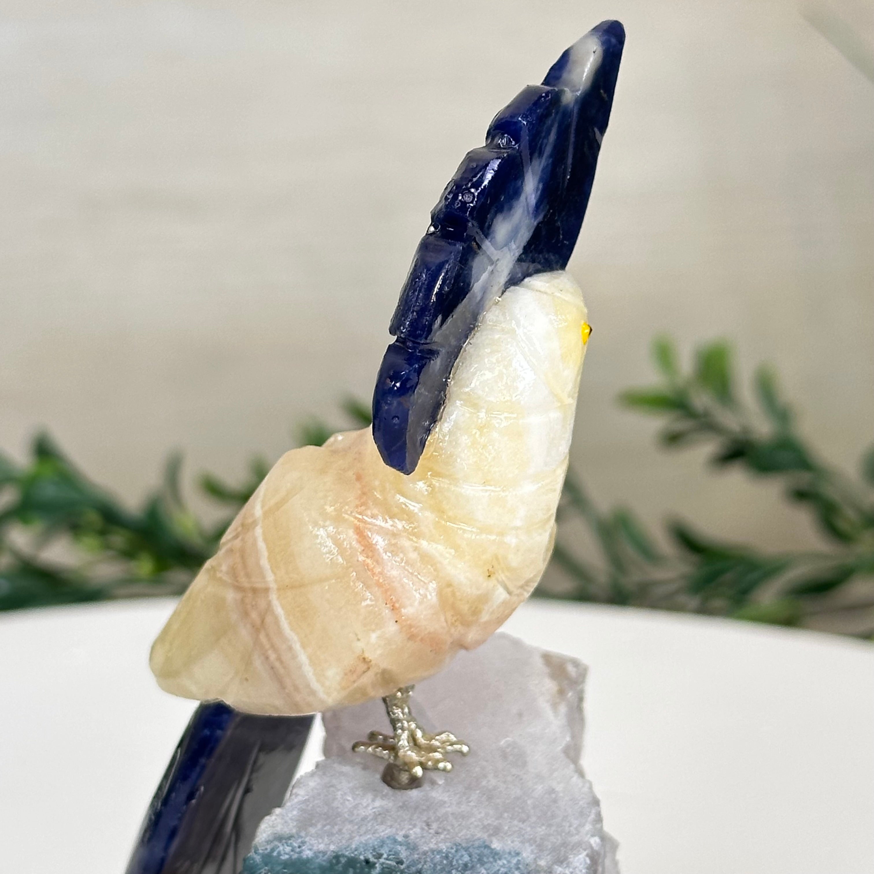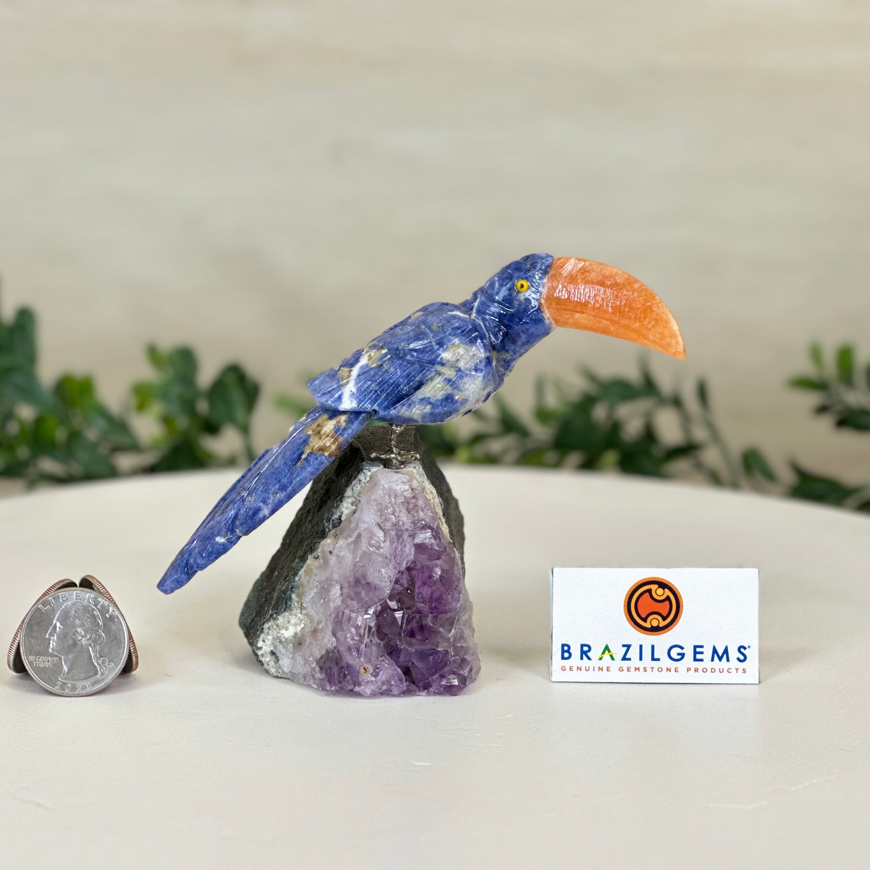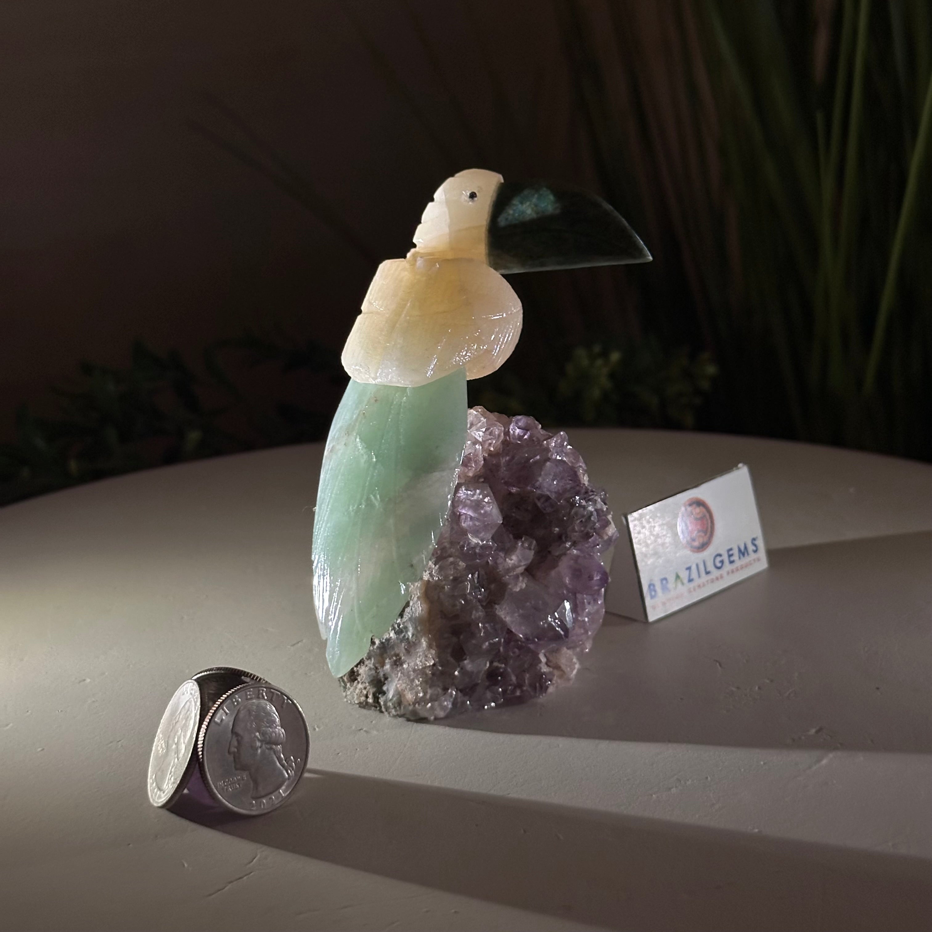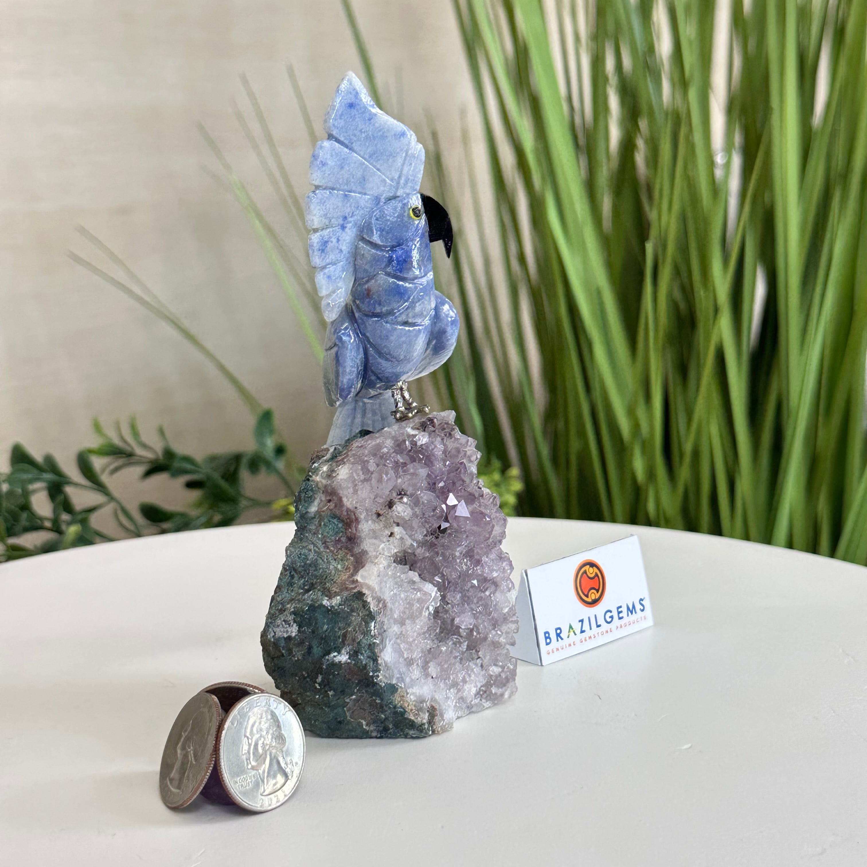 Each intricate detail of these birds is meticulously carved by skilled Brazilian artisans who have mastered the technique that combines the beauty of Brazil's gemstones with their colorful native birds into an amazing art piece. Elevate your space with the timeless charm of our Gemstone birds on an crystal cluster bases.