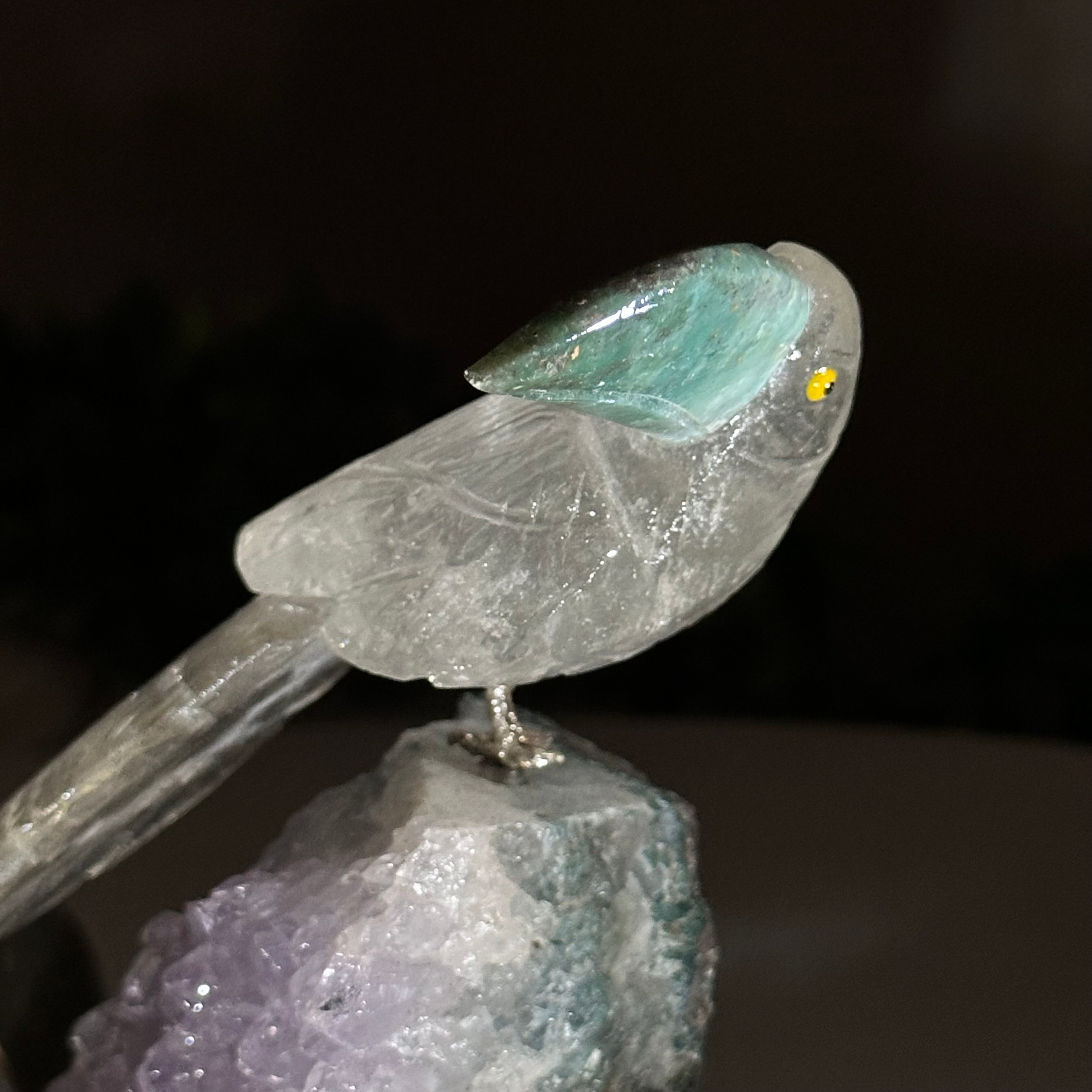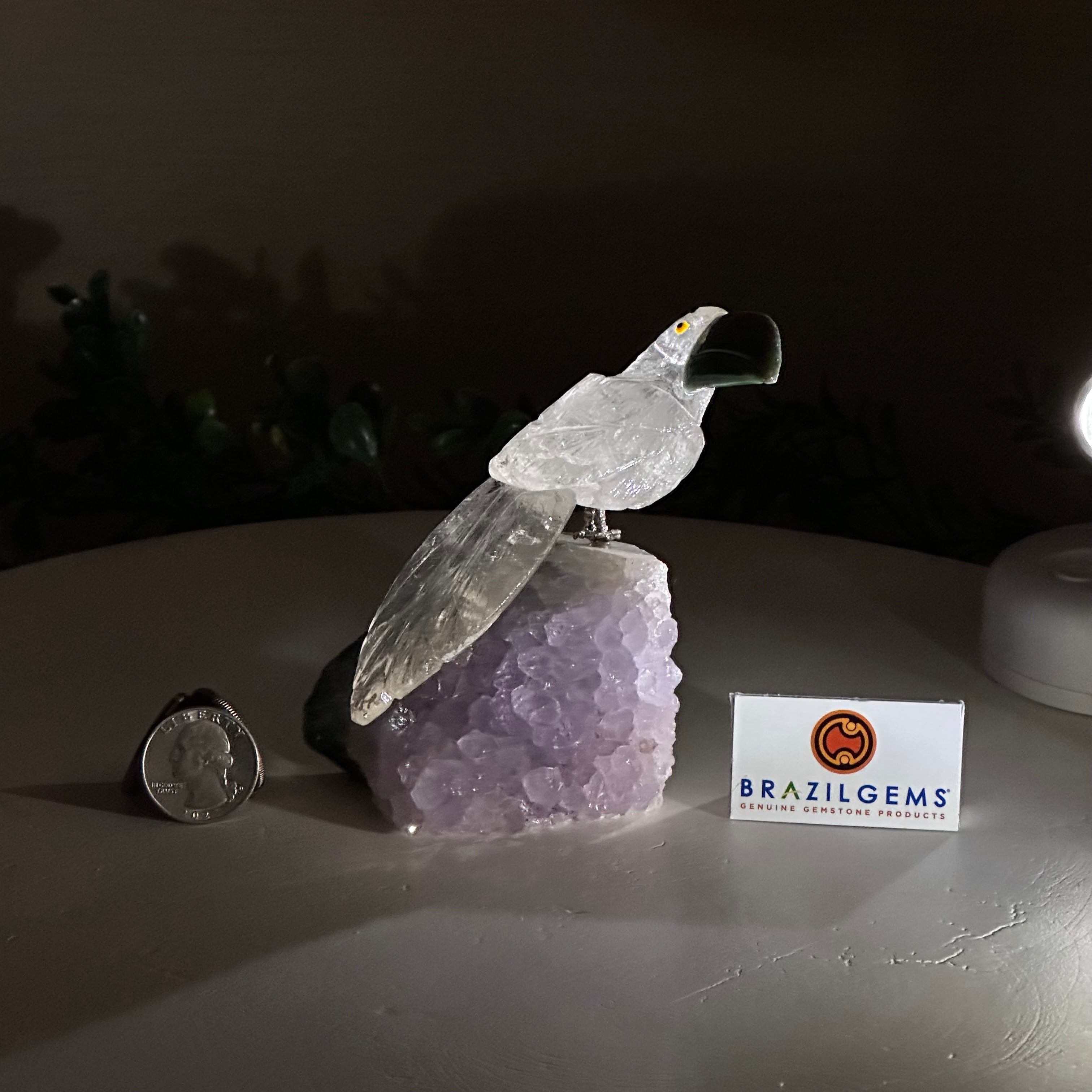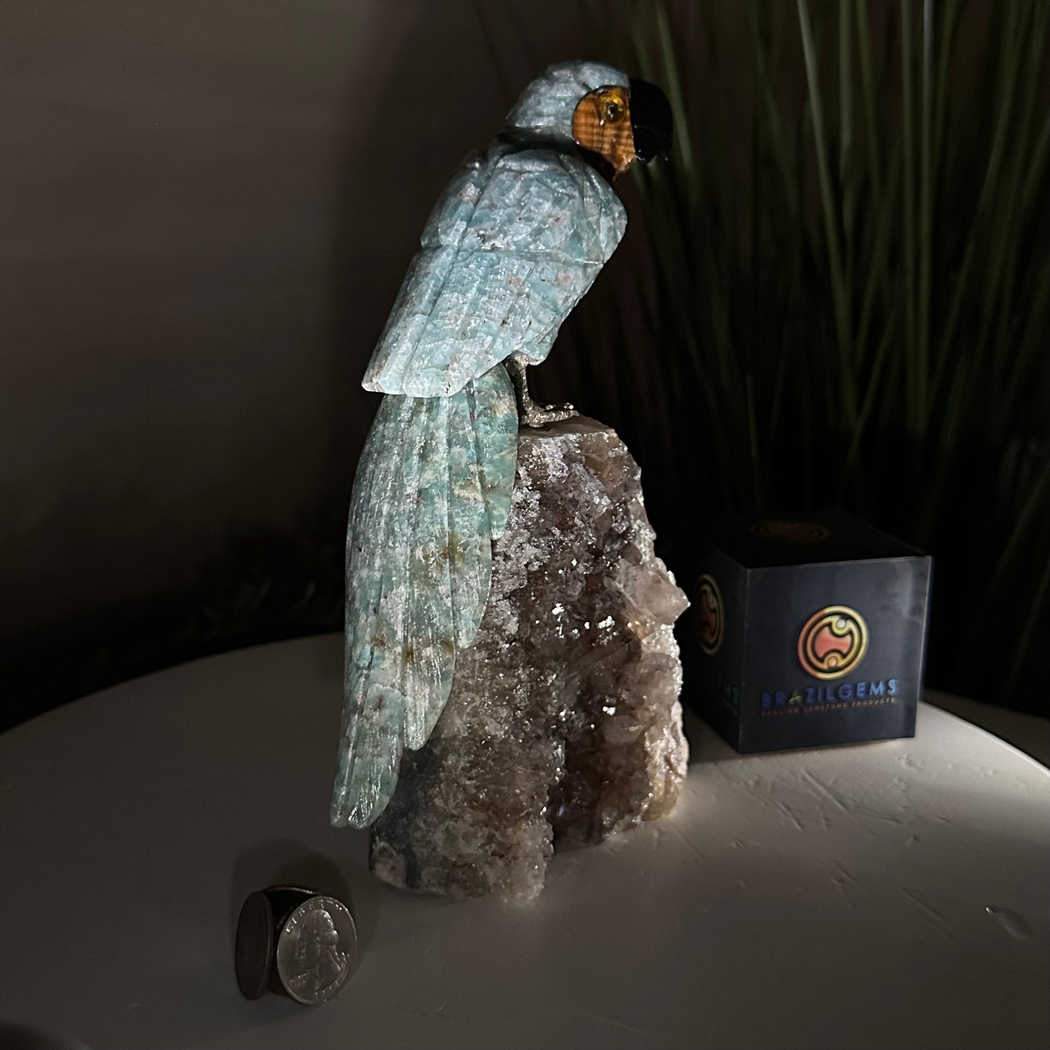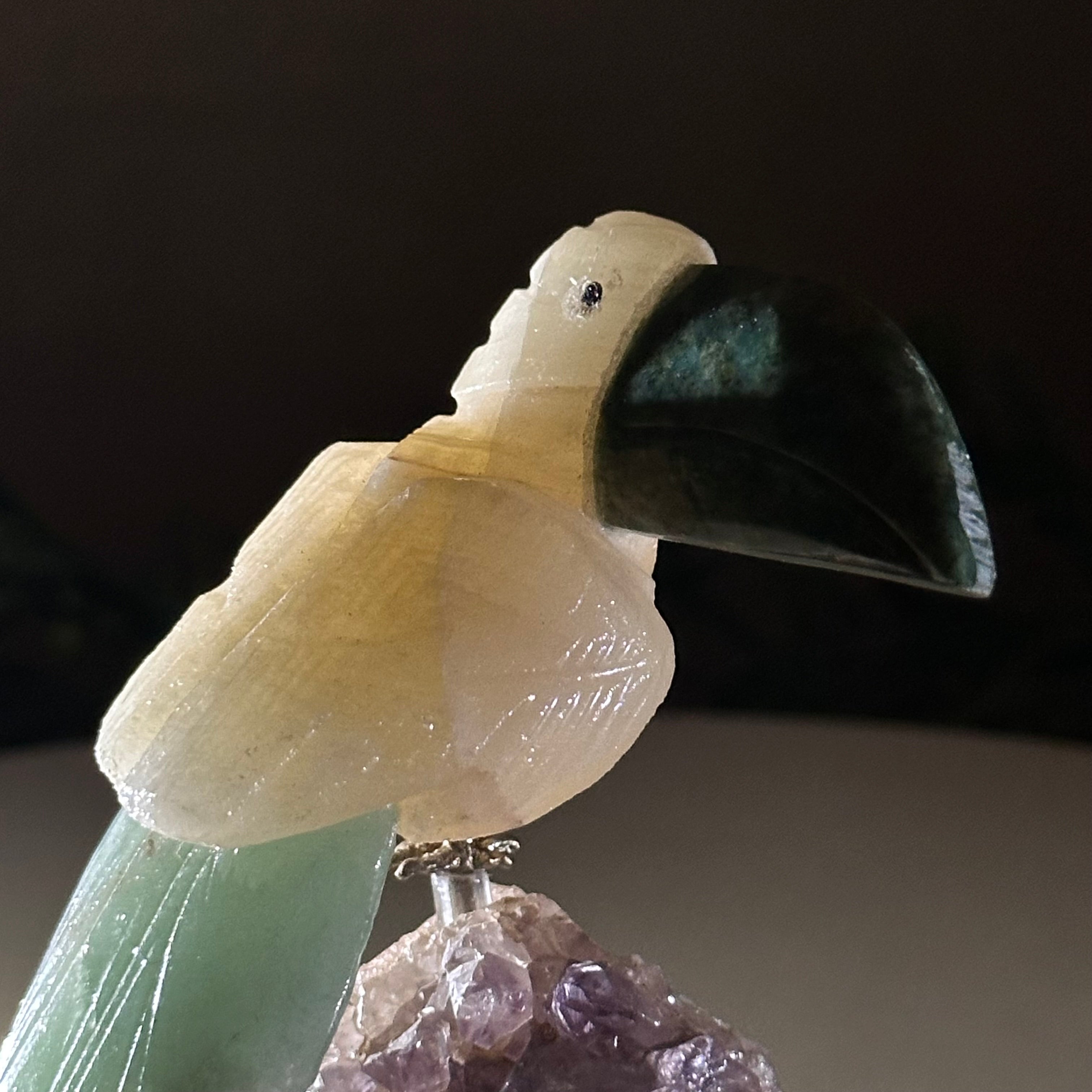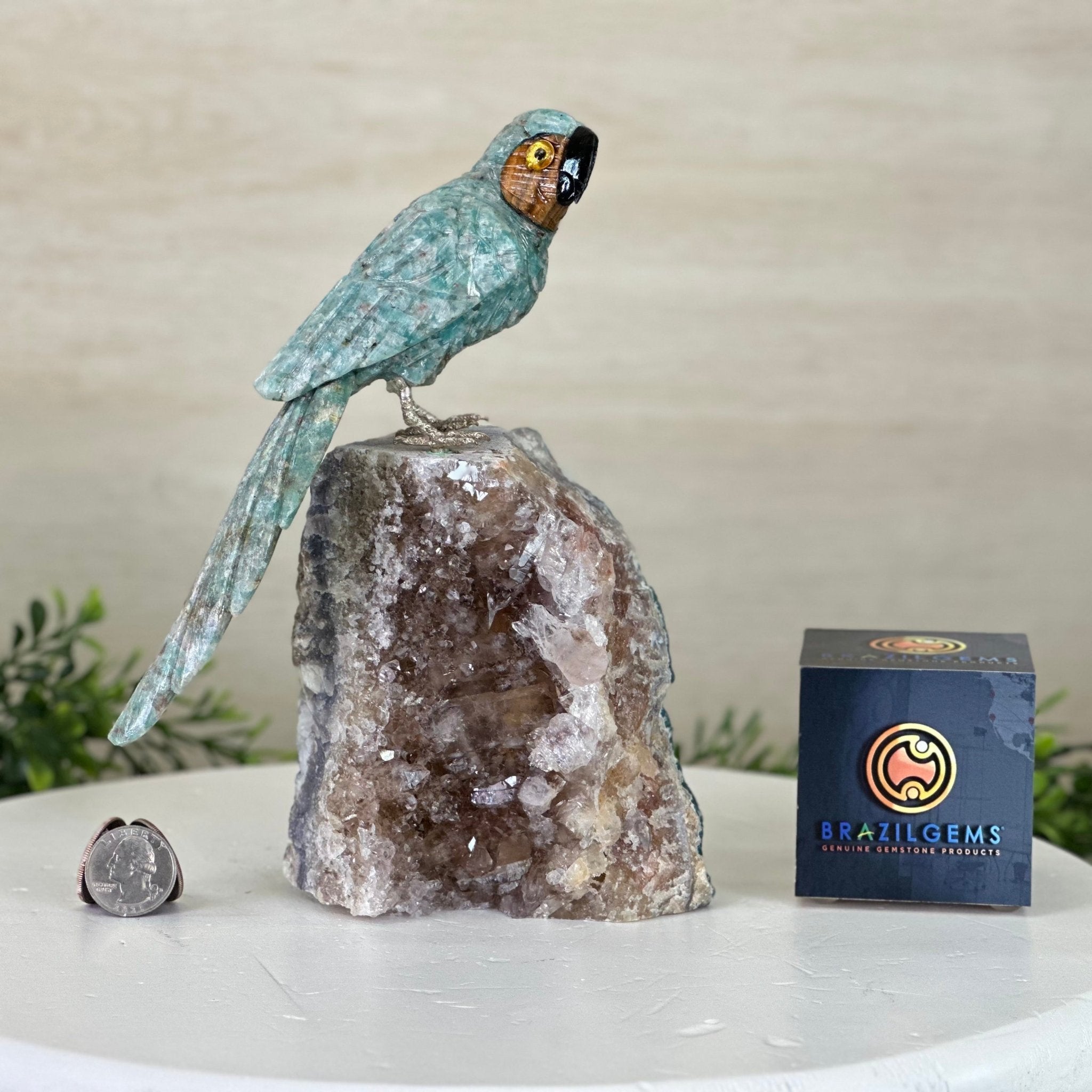 Each intricate detail of these birds is meticulously carved by skilled Brazilian artisans who have mastered the technique that combines the beauty of Brazil's gemstones with their colorful native birds into an amazing art piece. Elevate your space with the timeless charm of our Gemstone birds on an crystal cluster bases.