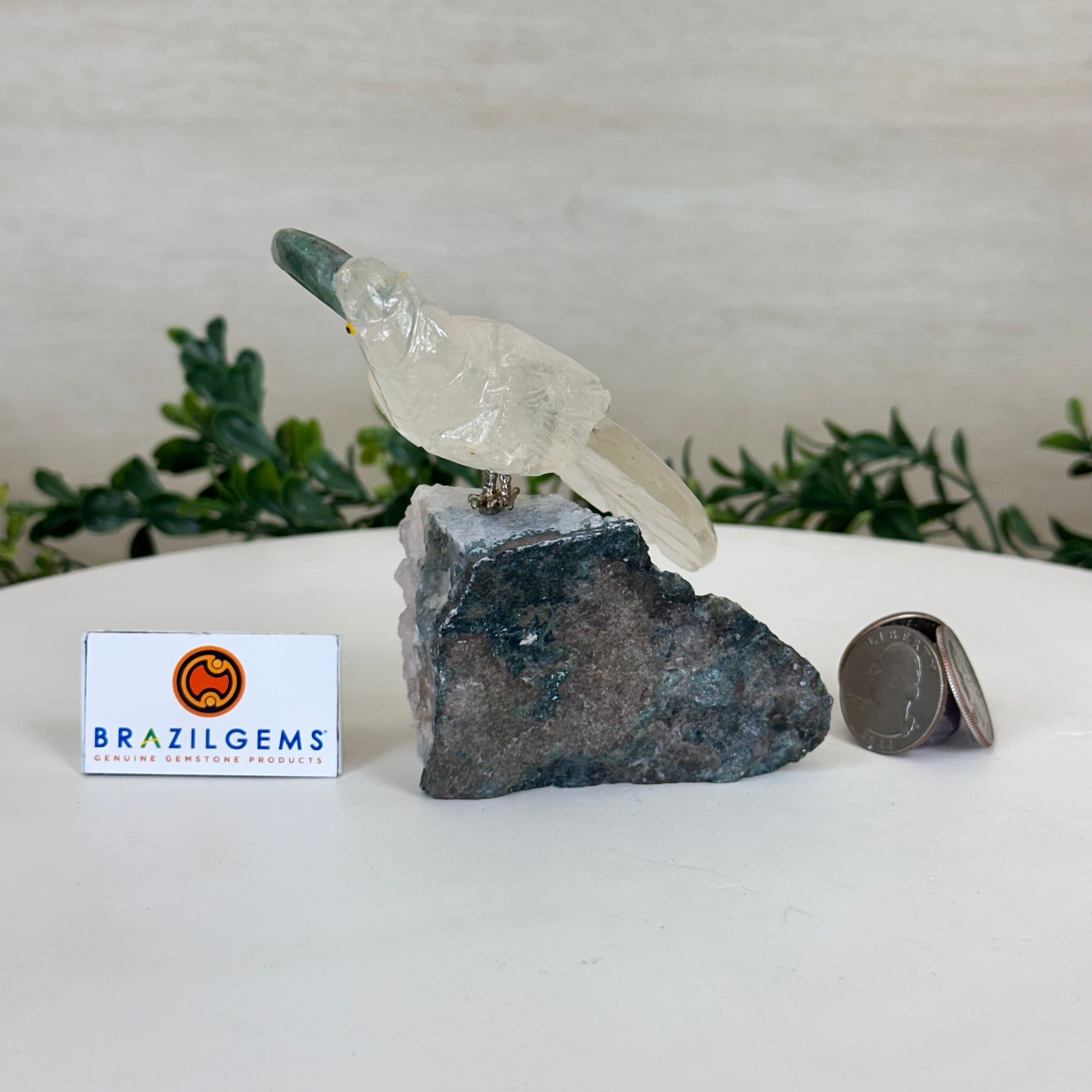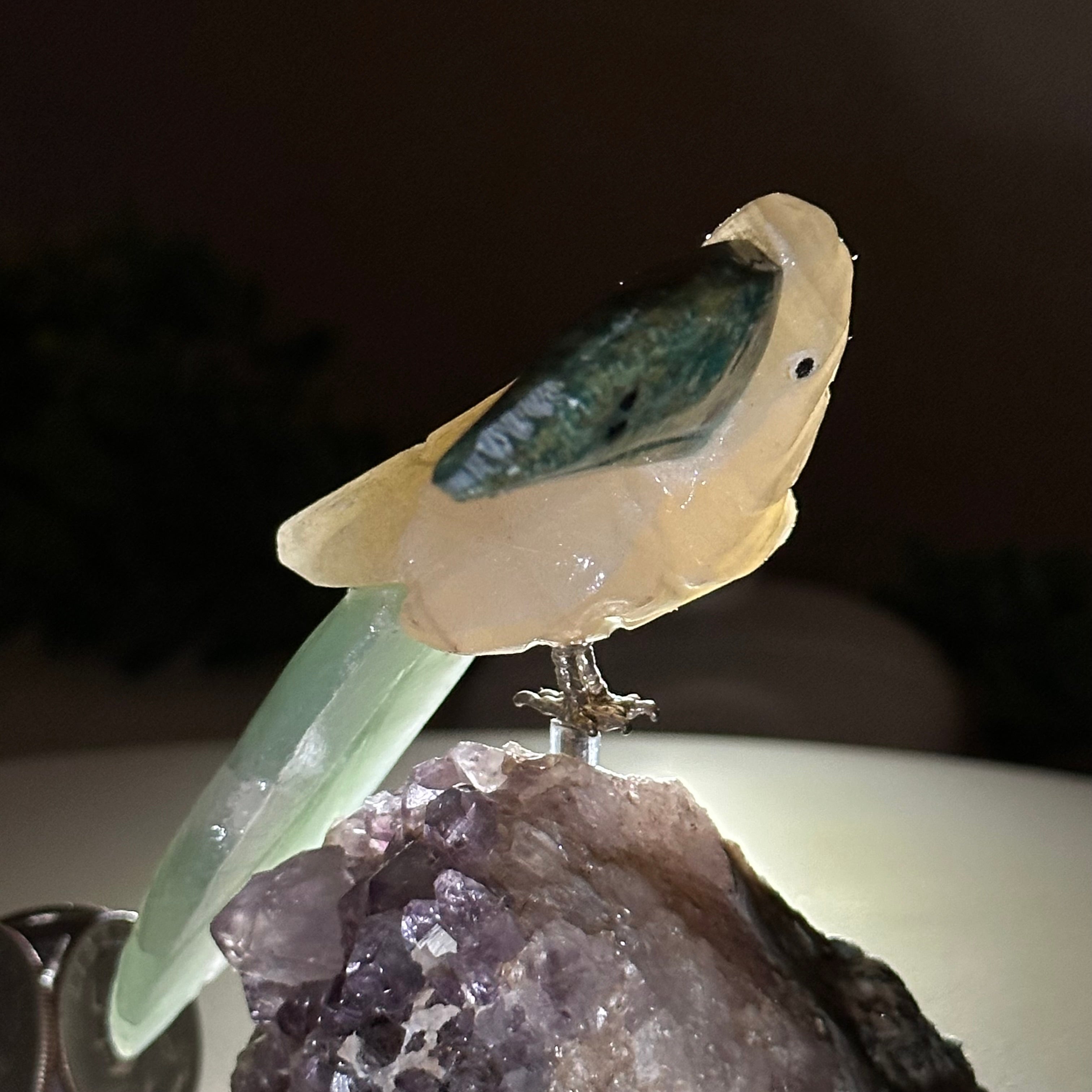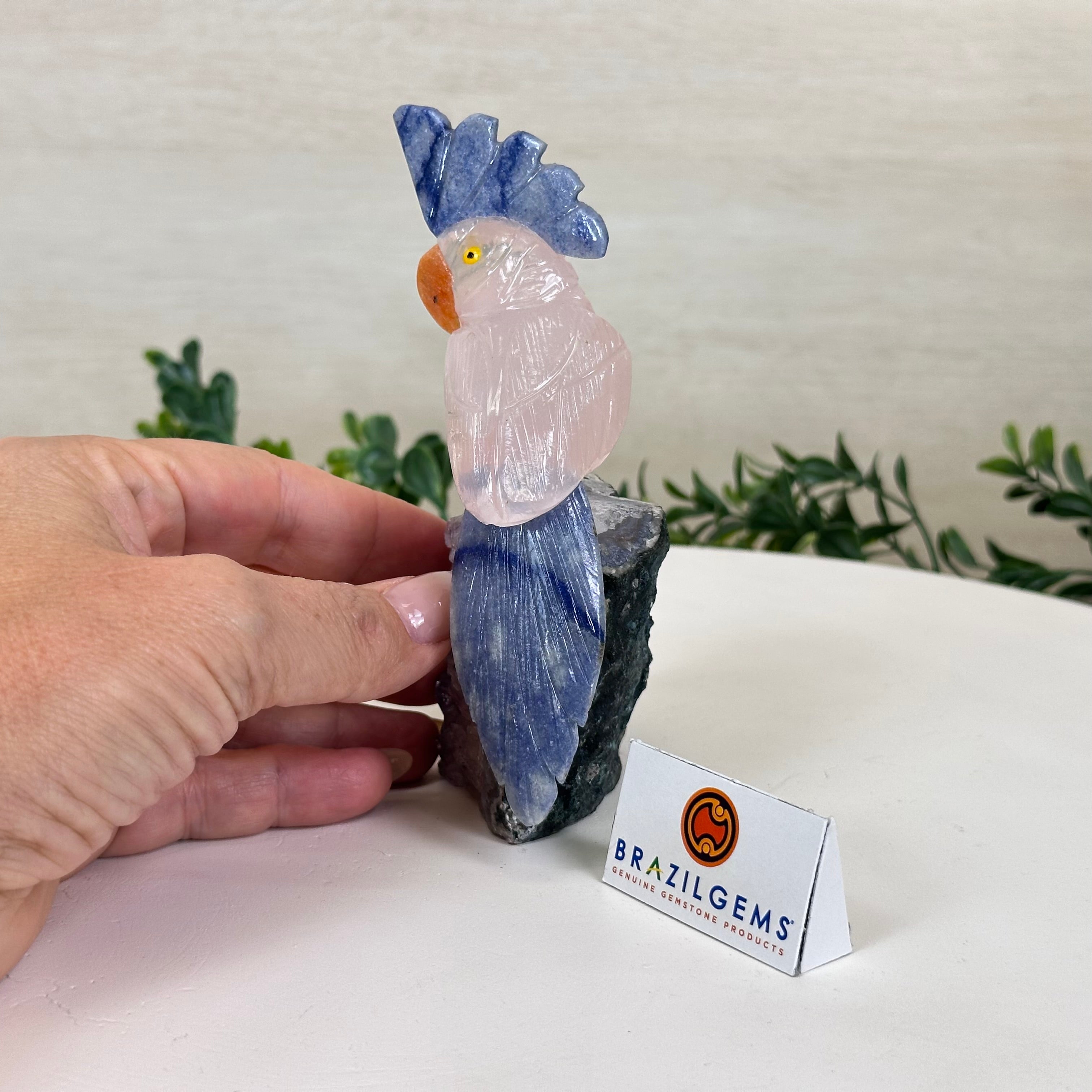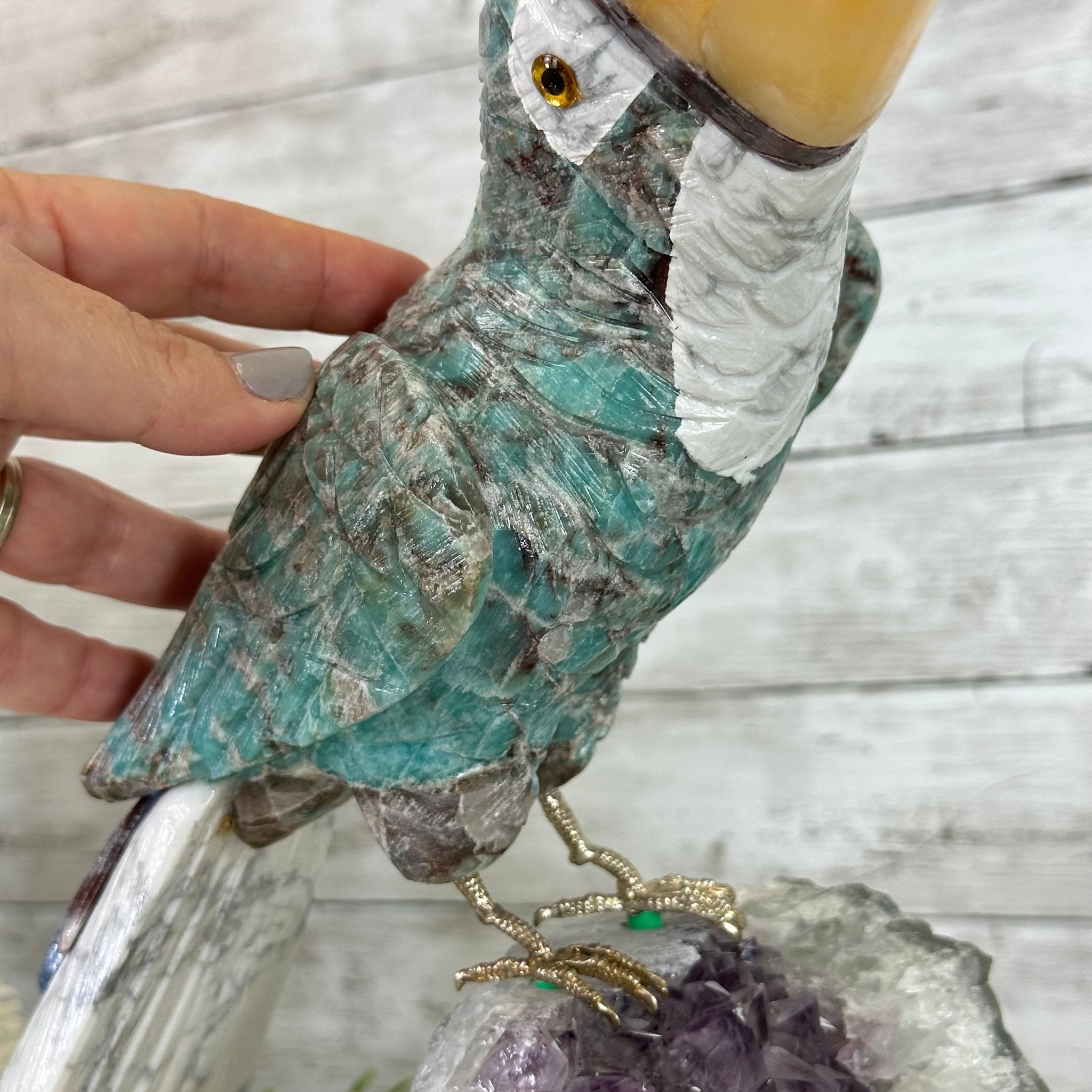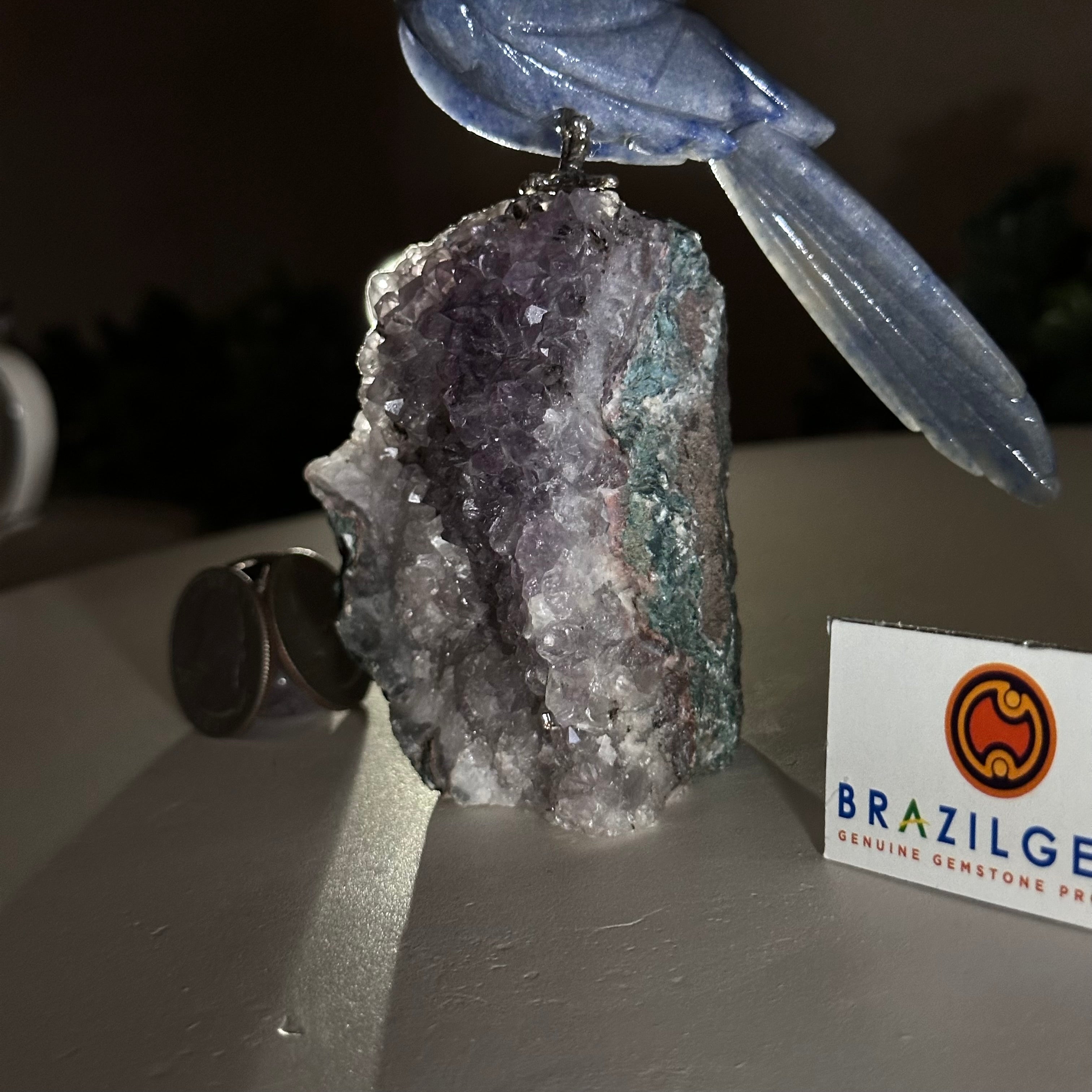 Each intricate detail of these birds is meticulously carved by skilled Brazilian artisans who have mastered the technique that combines the beauty of Brazil's gemstones with their colorful native birds into an amazing art piece. Elevate your space with the timeless charm of our Gemstone birds on an crystal cluster bases.