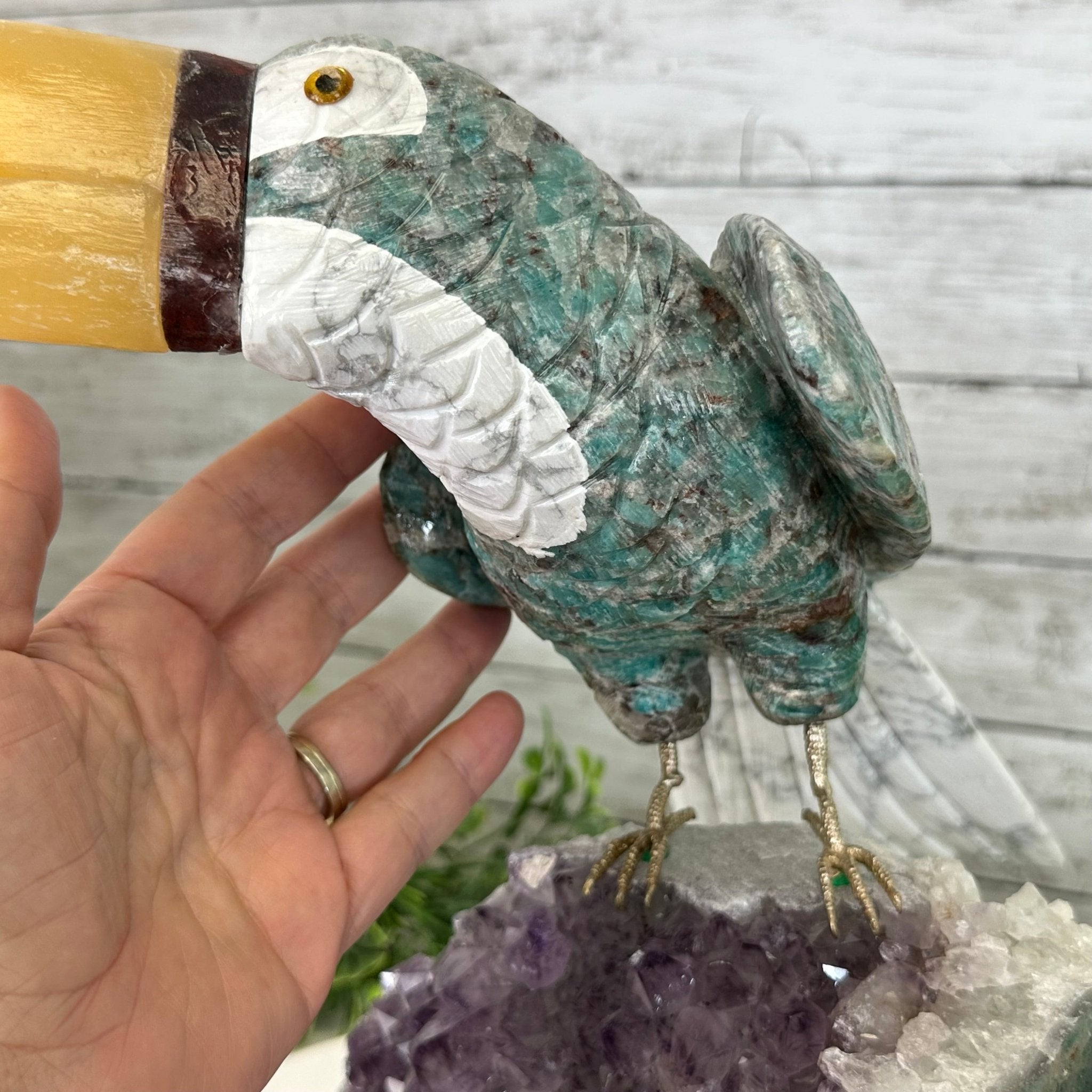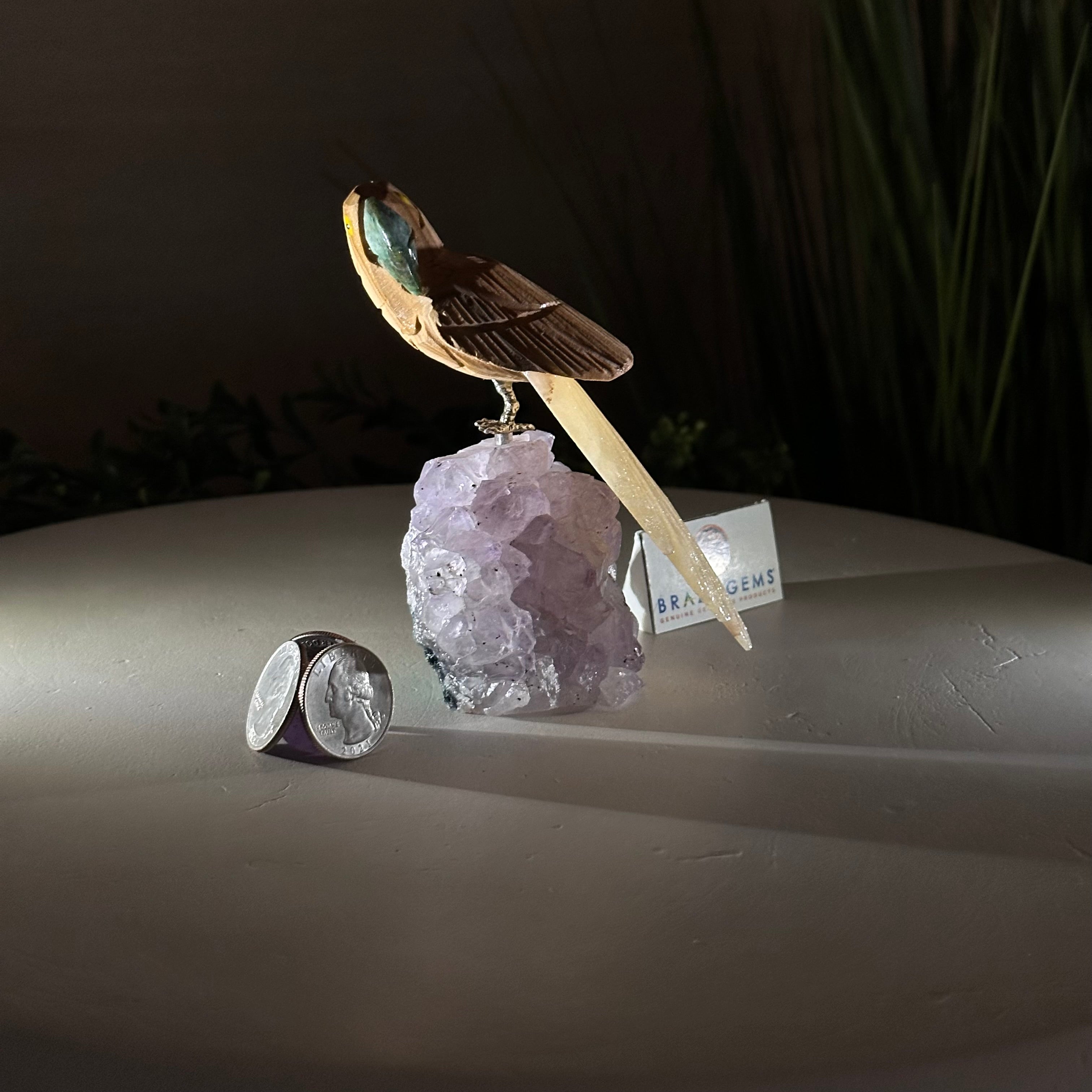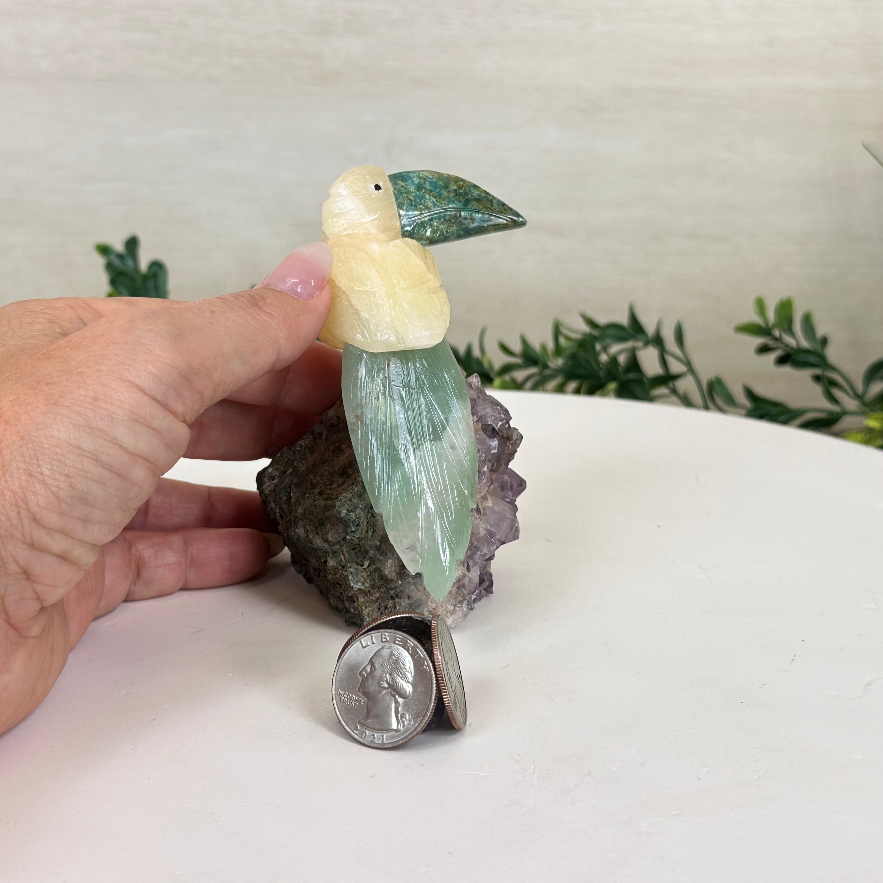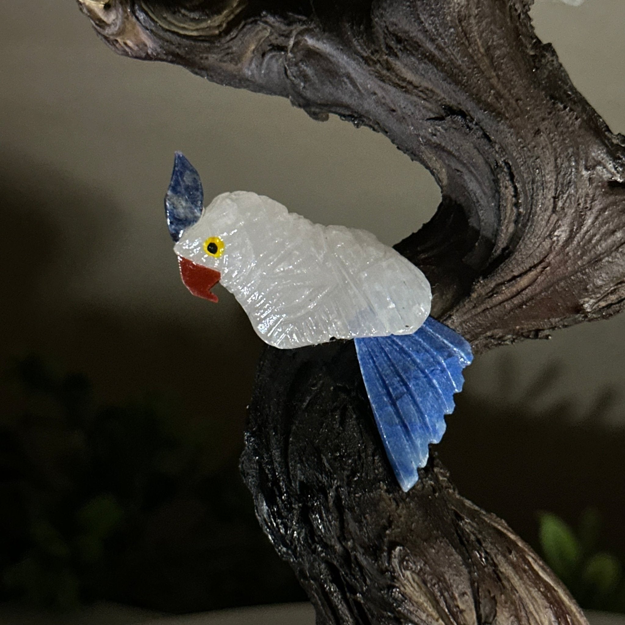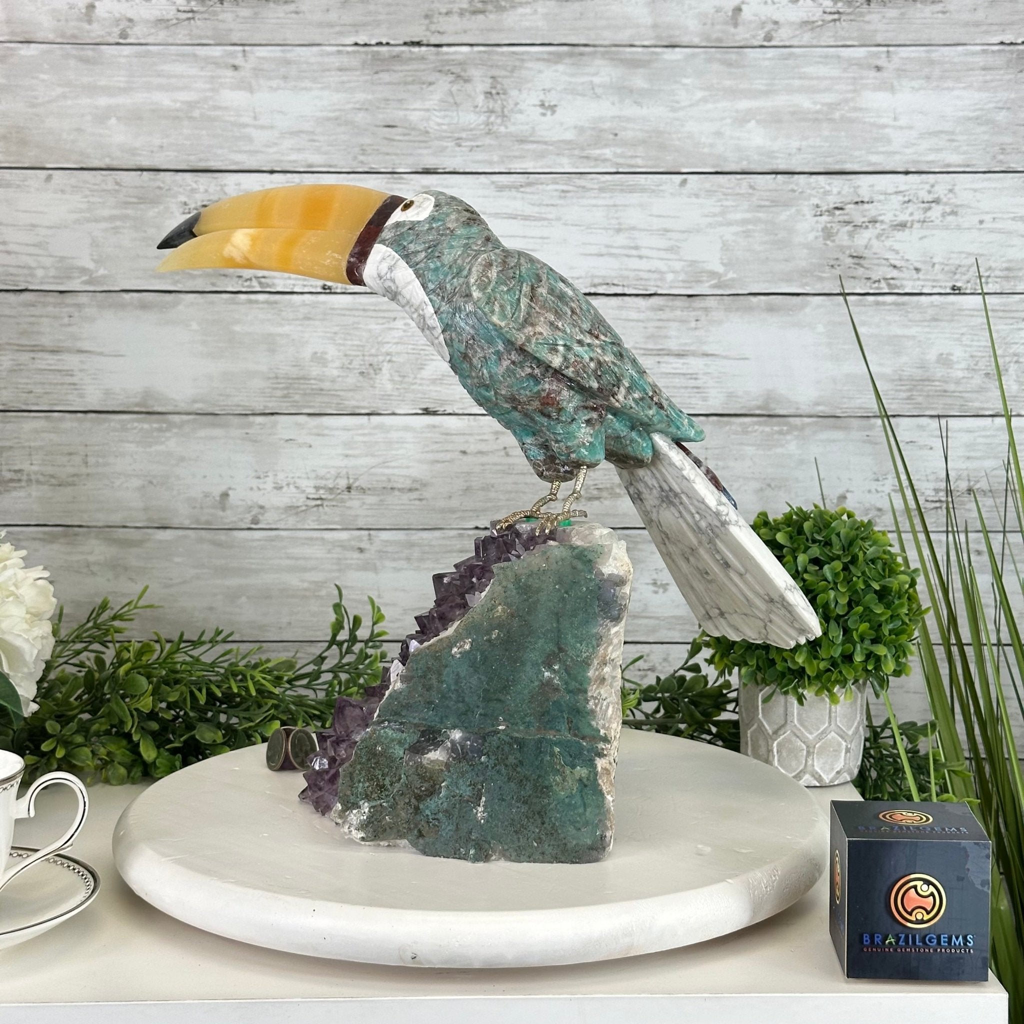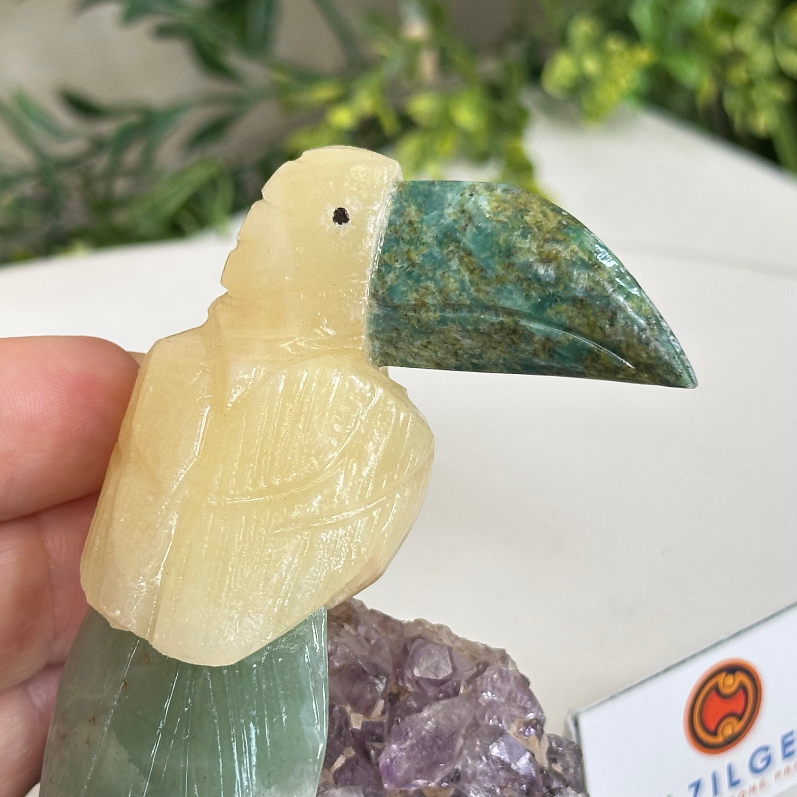 Each intricate detail of these birds is meticulously carved by skilled Brazilian artisans who have mastered the technique that combines the beauty of Brazil's gemstones with their colorful native birds into an amazing art piece. Elevate your space with the timeless charm of our Gemstone birds on an crystal cluster bases.