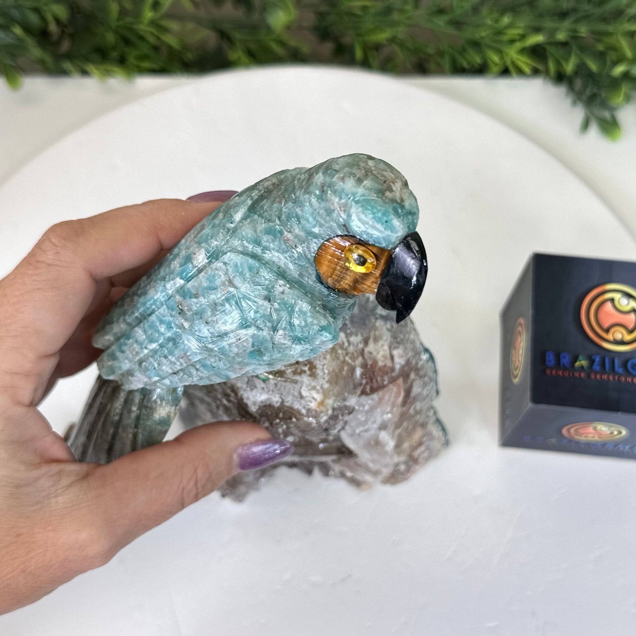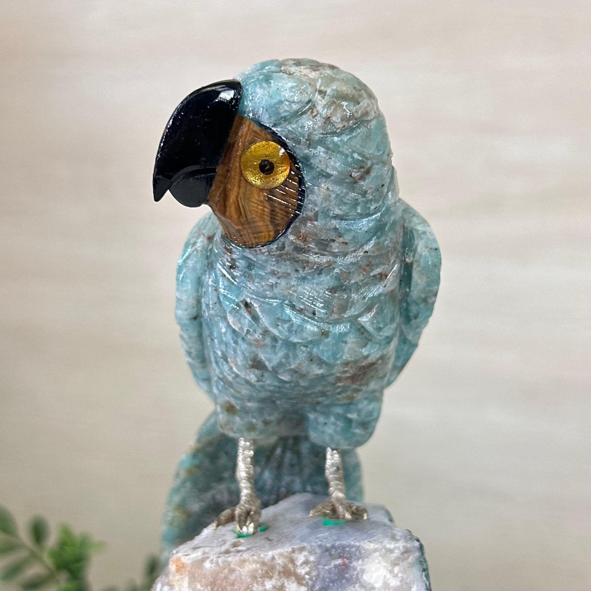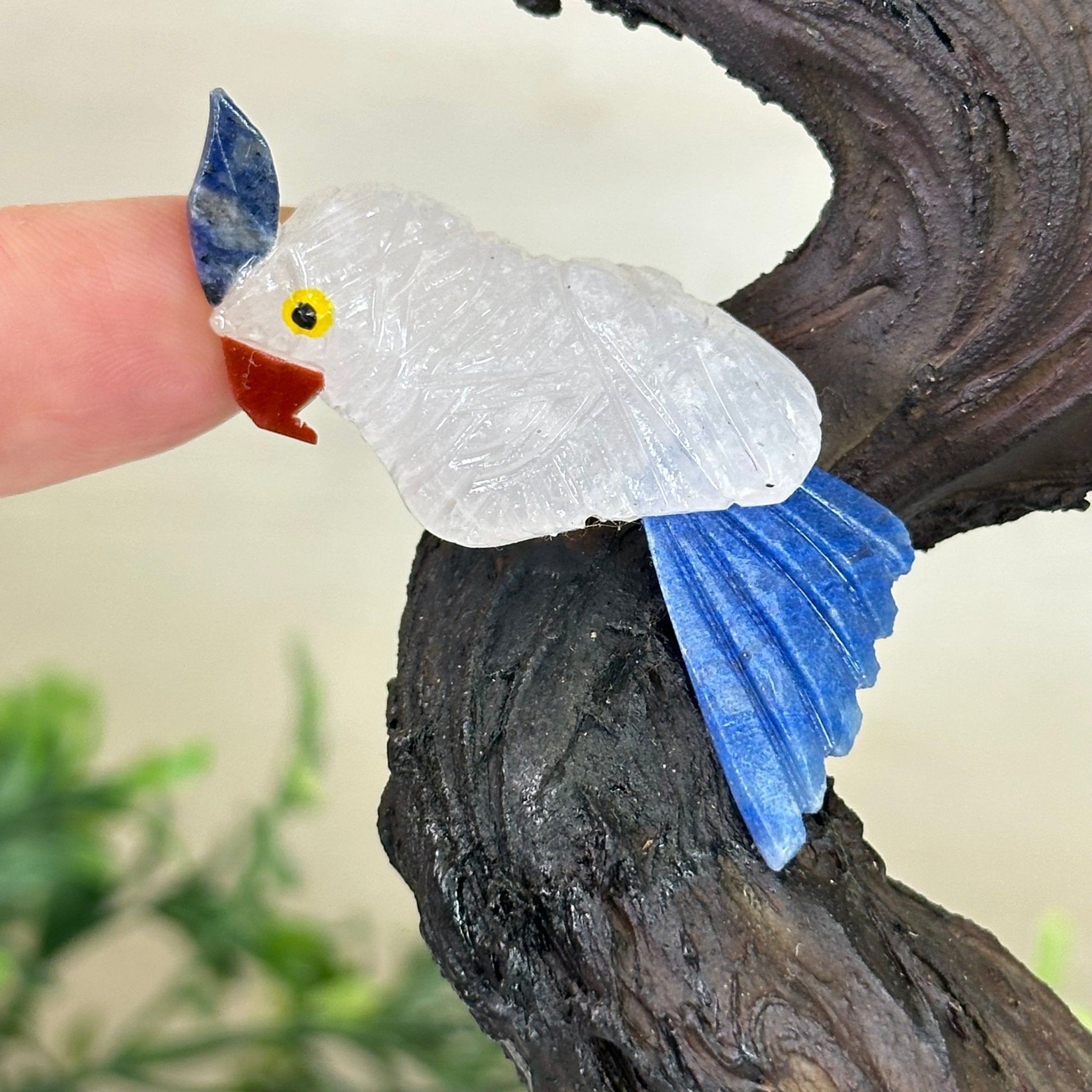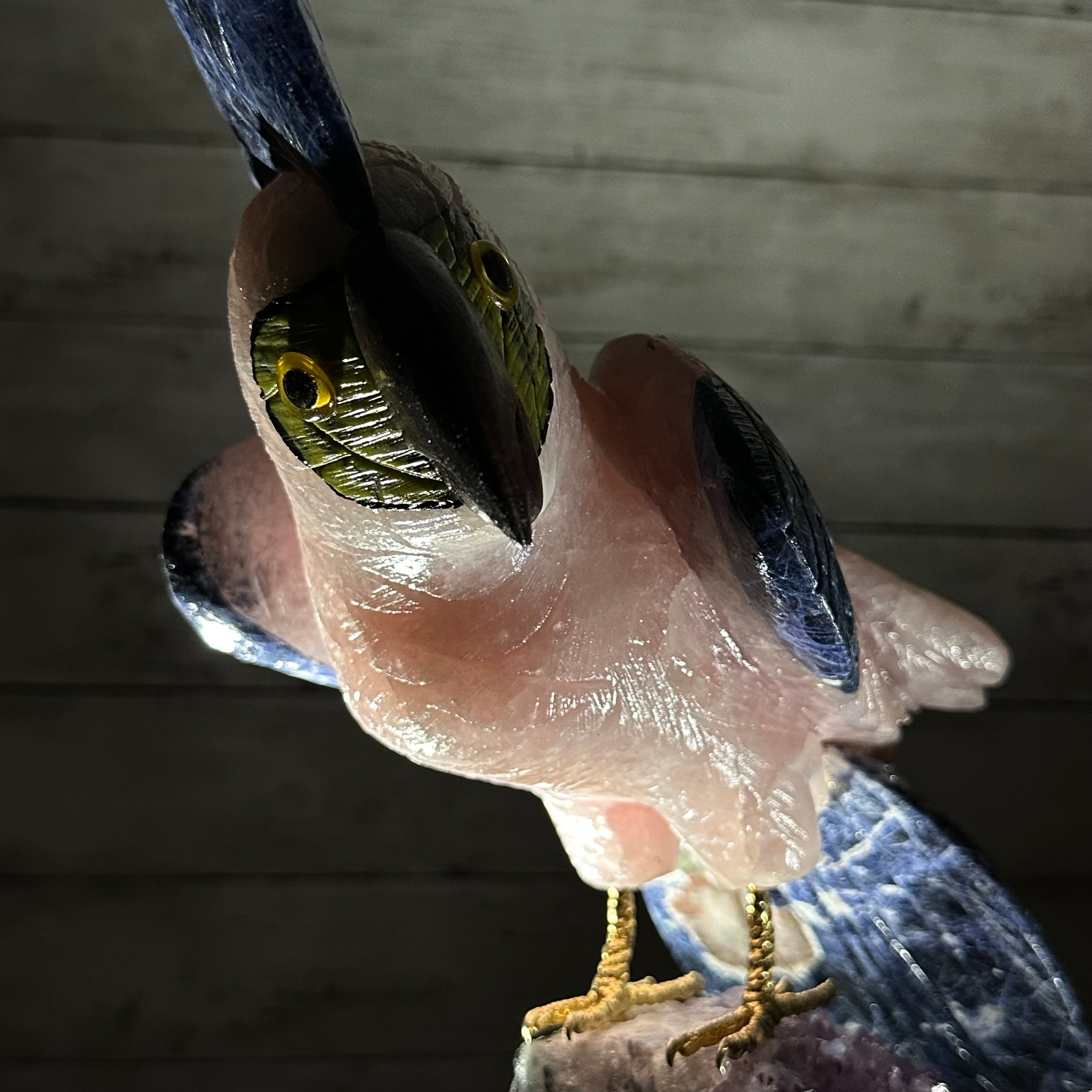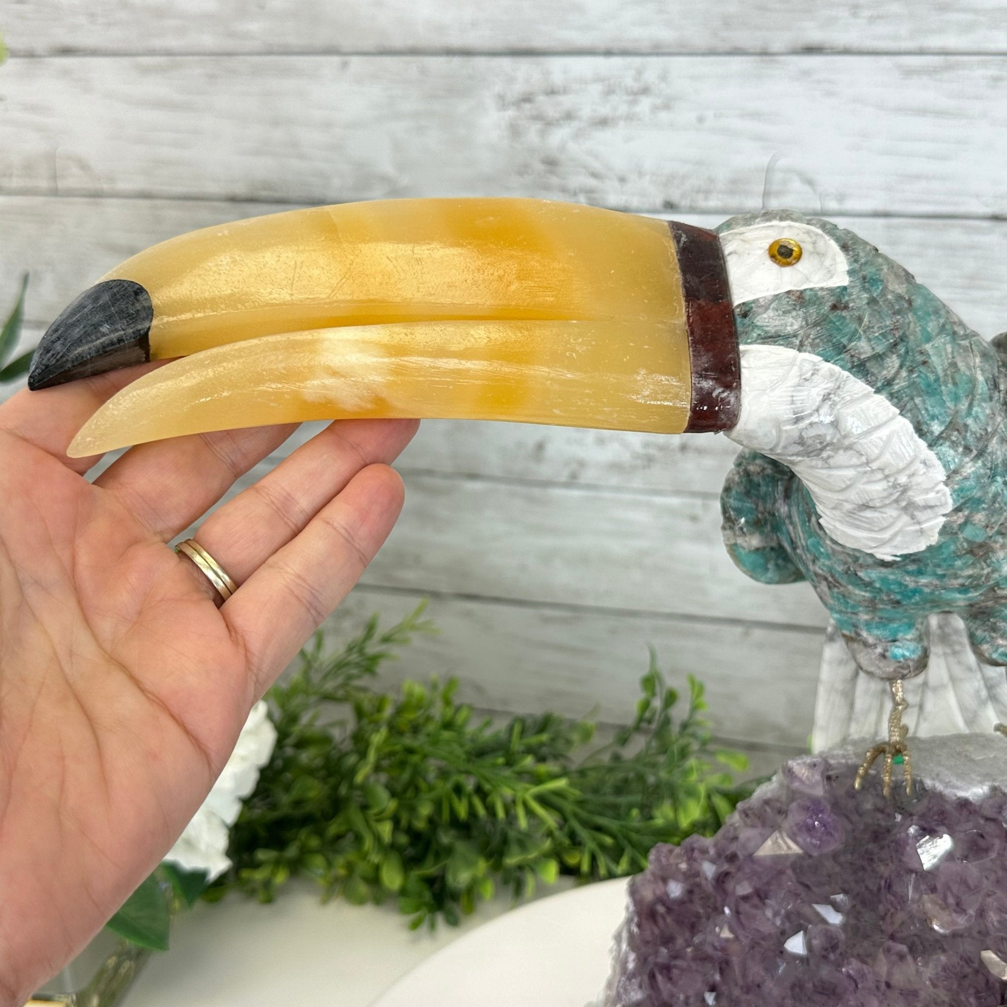 Each intricate detail of these birds is meticulously carved by skilled Brazilian artisans who have mastered the technique that combines the beauty of Brazil's gemstones with their colorful native birds into an amazing art piece. Elevate your space with the timeless charm of our Gemstone birds on an crystal cluster bases.