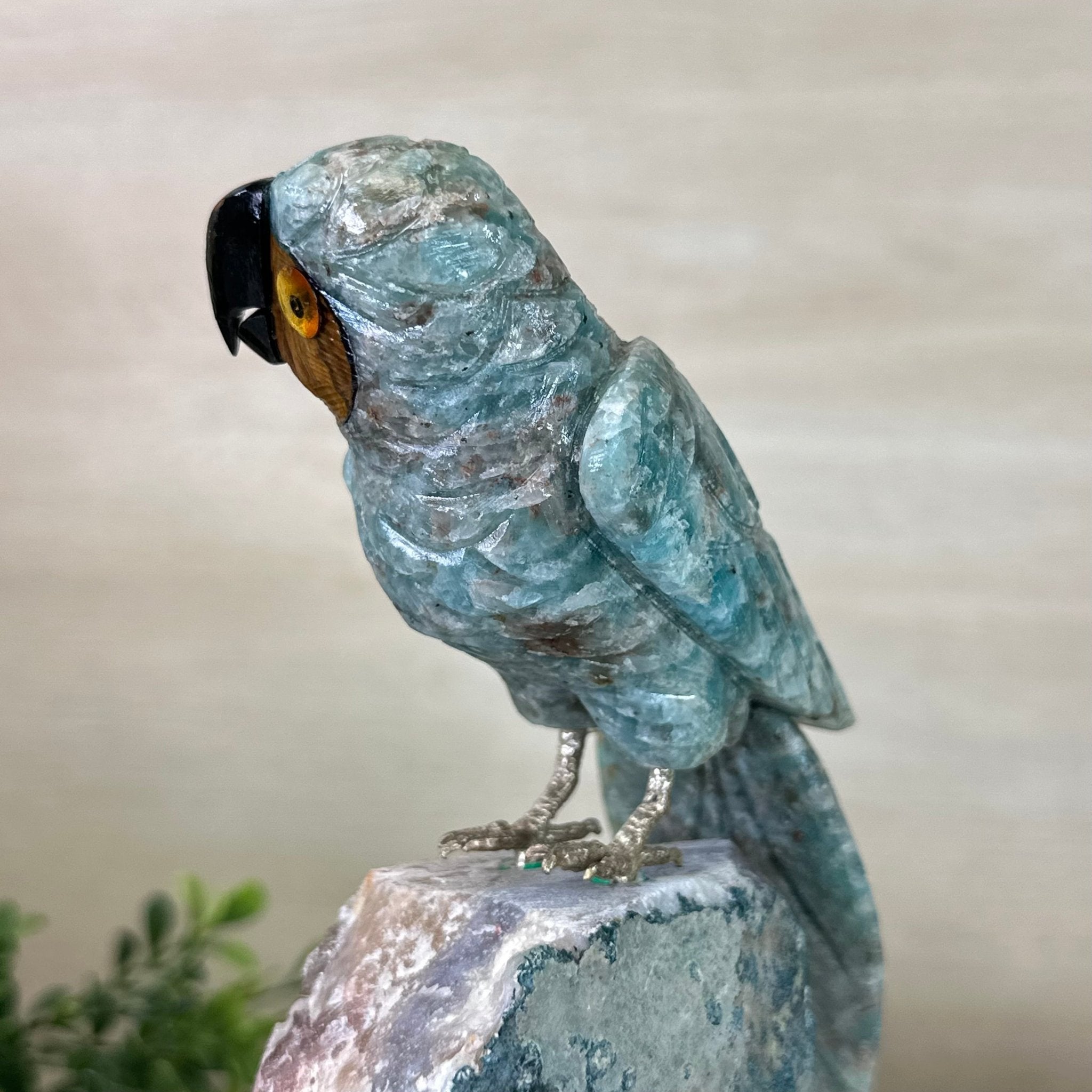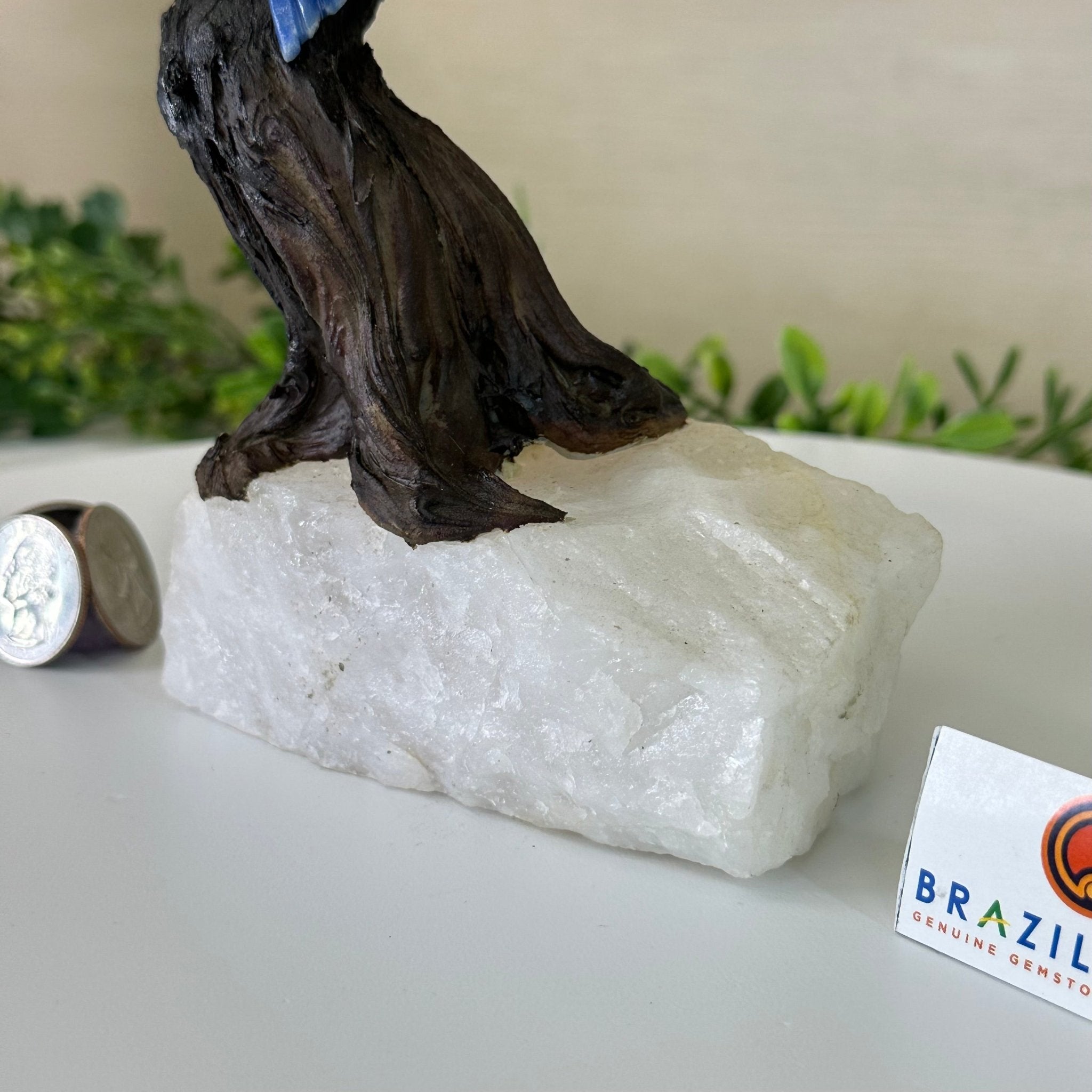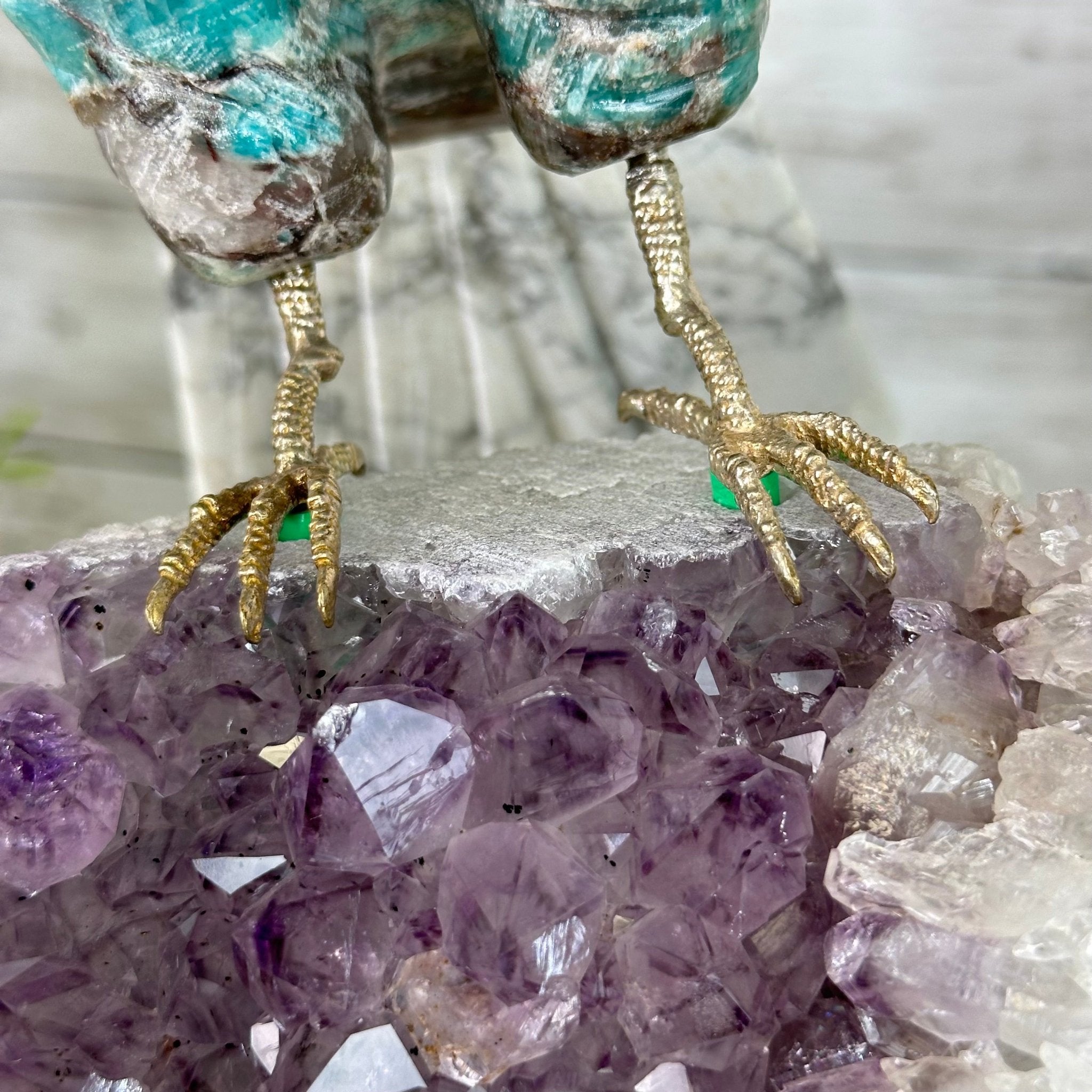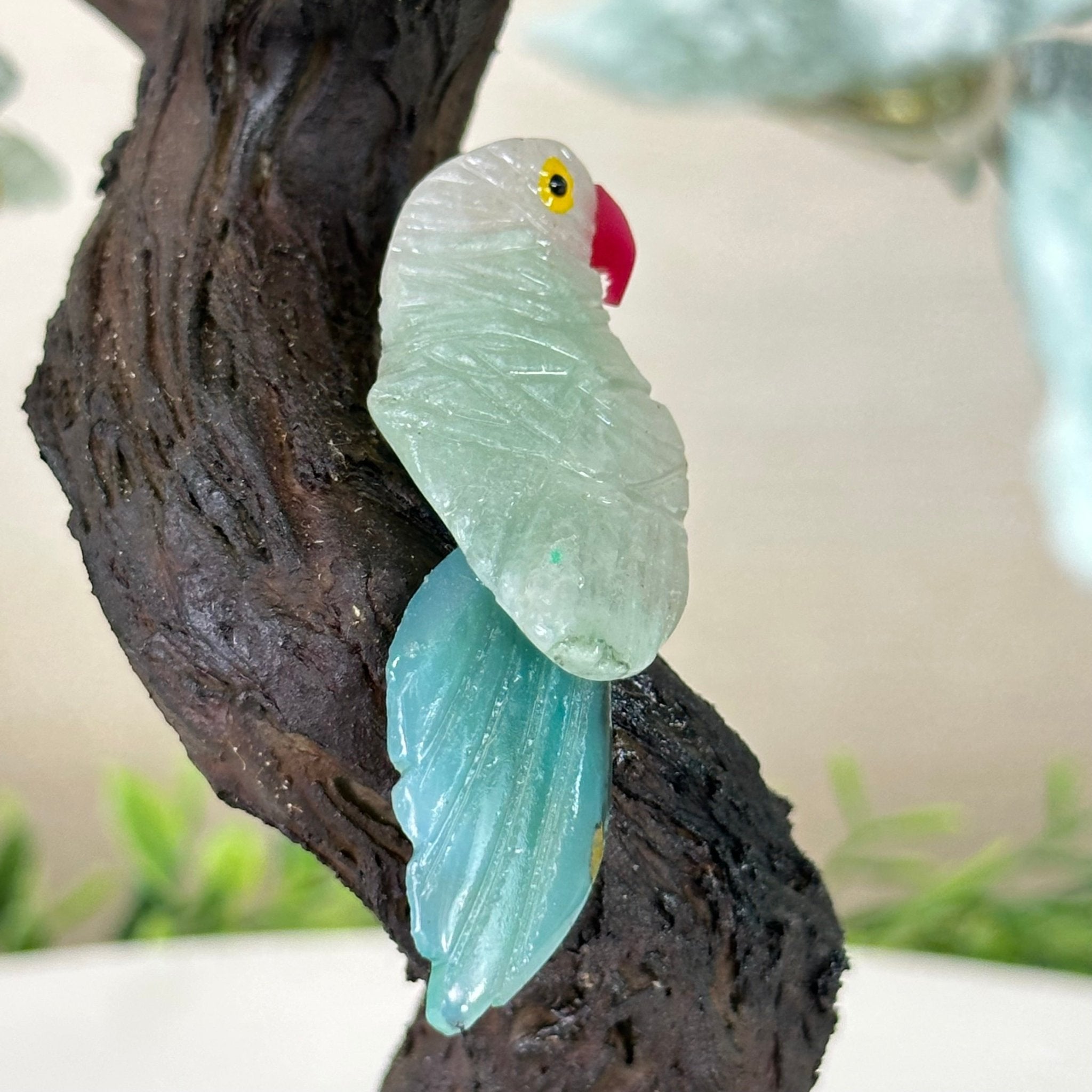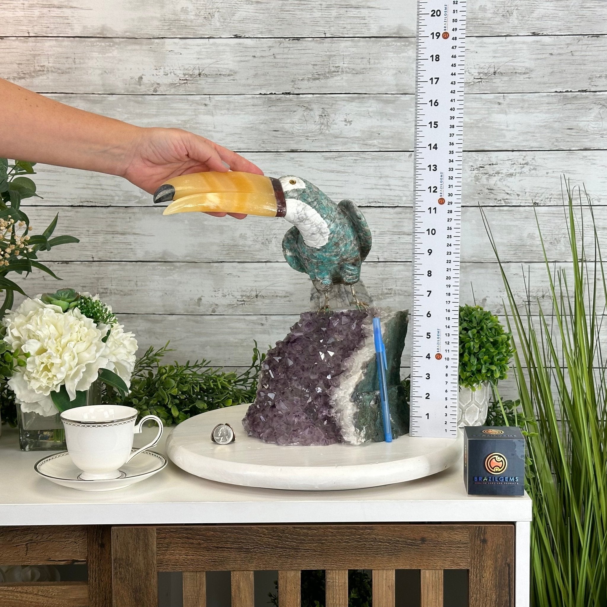 Each intricate detail of these birds is meticulously carved by skilled Brazilian artisans who have mastered the technique that combines the beauty of Brazil's gemstones with their colorful native birds into an amazing art piece. Elevate your space with the timeless charm of our Gemstone birds on an crystal cluster bases.