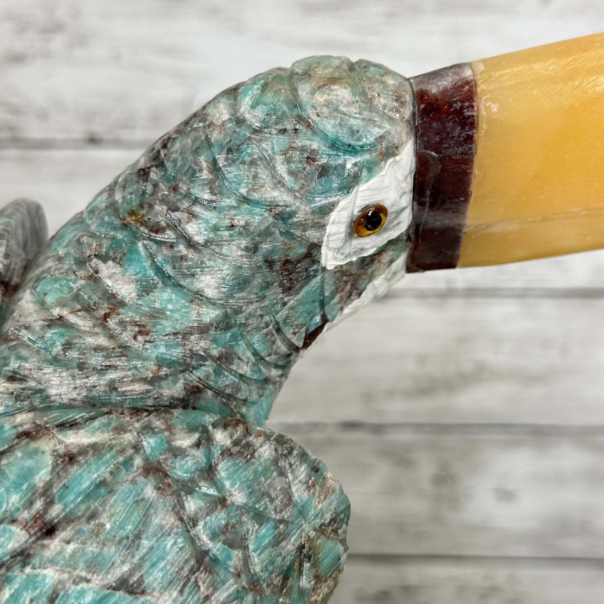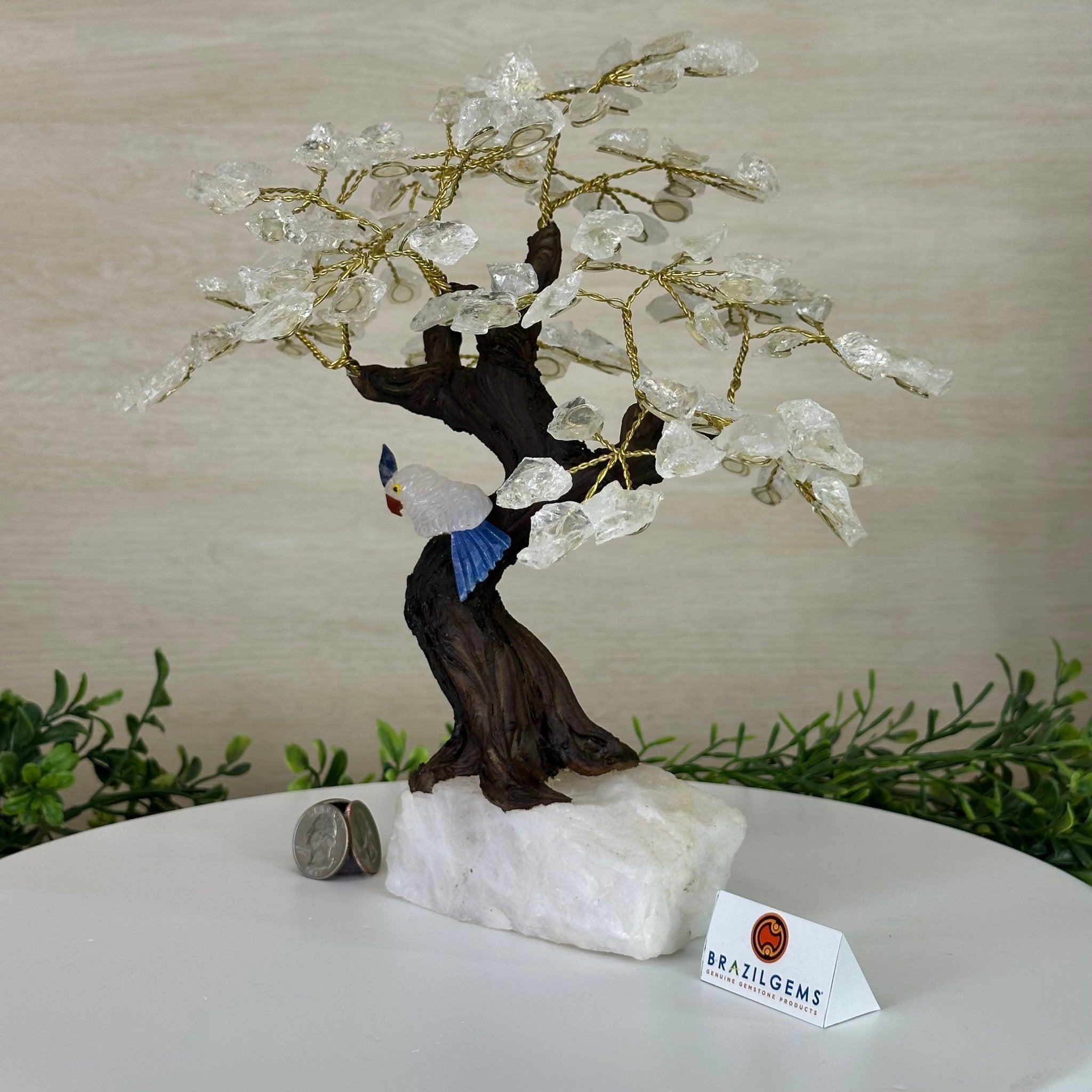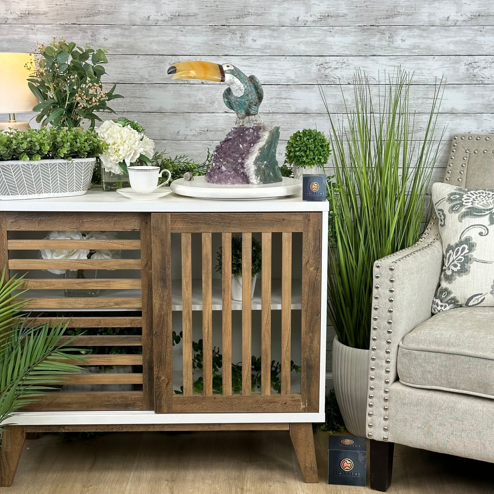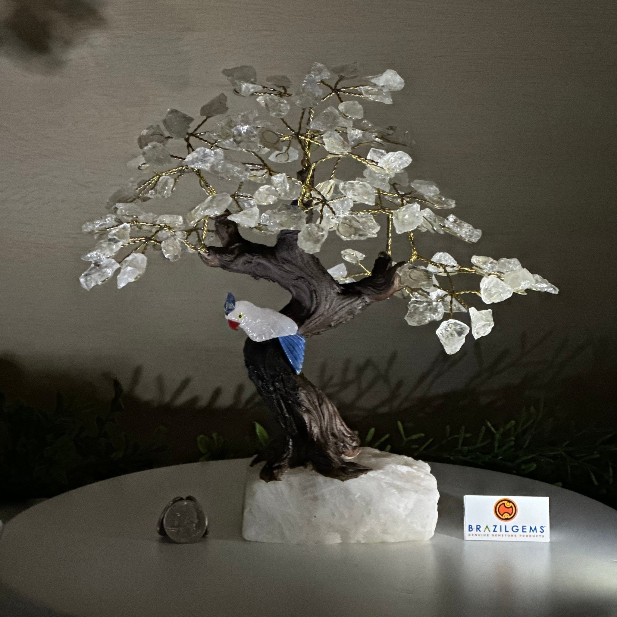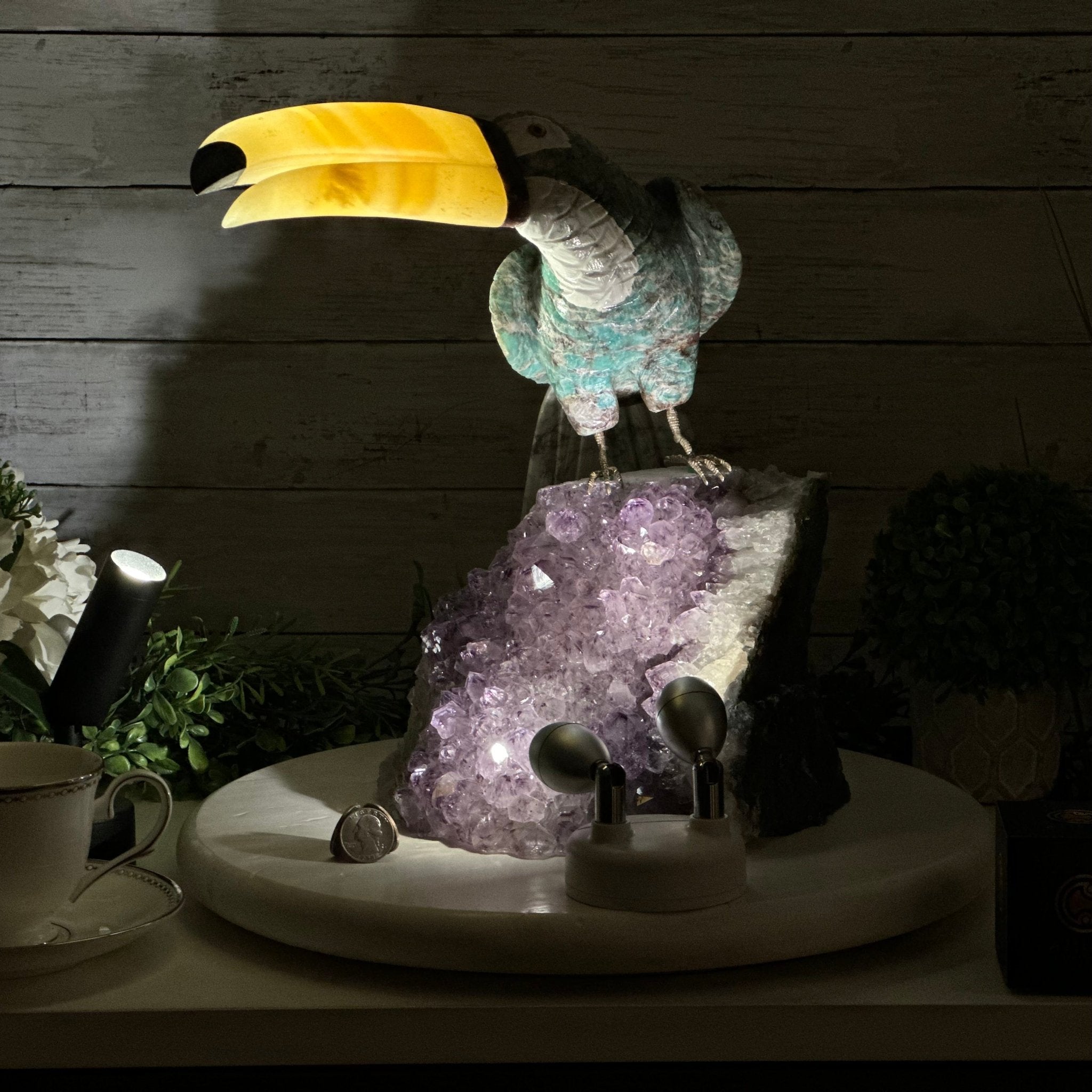 Each intricate detail of these birds is meticulously carved by skilled Brazilian artisans who have mastered the technique that combines the beauty of Brazil's gemstones with their colorful native birds into an amazing art piece. Elevate your space with the timeless charm of our Gemstone birds on an crystal cluster bases.