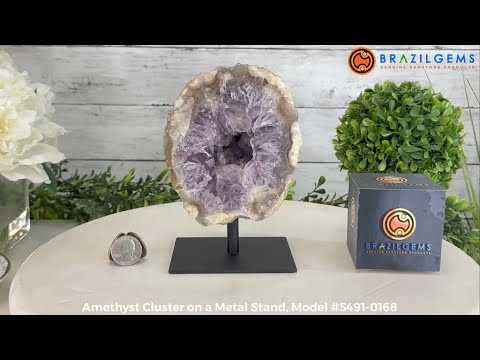 Infuse your room with the natural elegance of this Standard Plus Quality Natural Brazilian Amethyst Cluster on a black metal base. This gemstone has nicely shaped amethyst points with lovely agate bands surrounding. It is polished on the front with a natural rough outer shell.