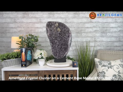 This Standard Plus Quality Amethyst Cluster is 69.9 lbs heavy and 22" tall, and has a concrete base. The cluster has violet color crystals and is the perfect size for a desk or shelf.