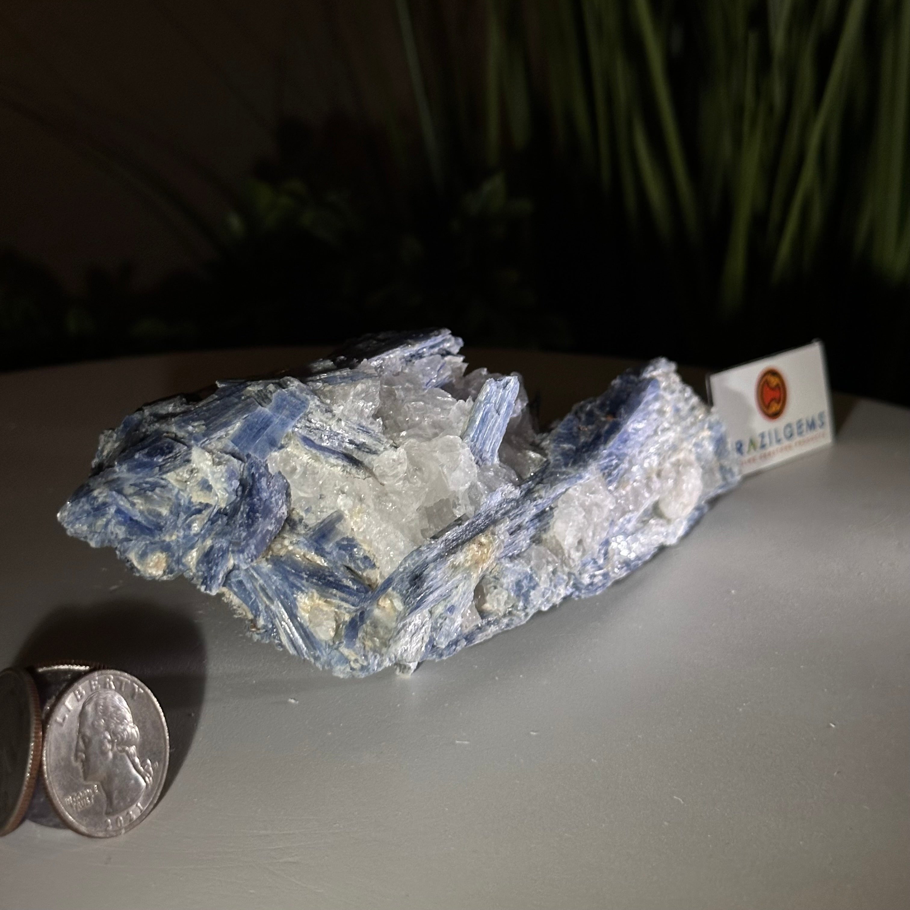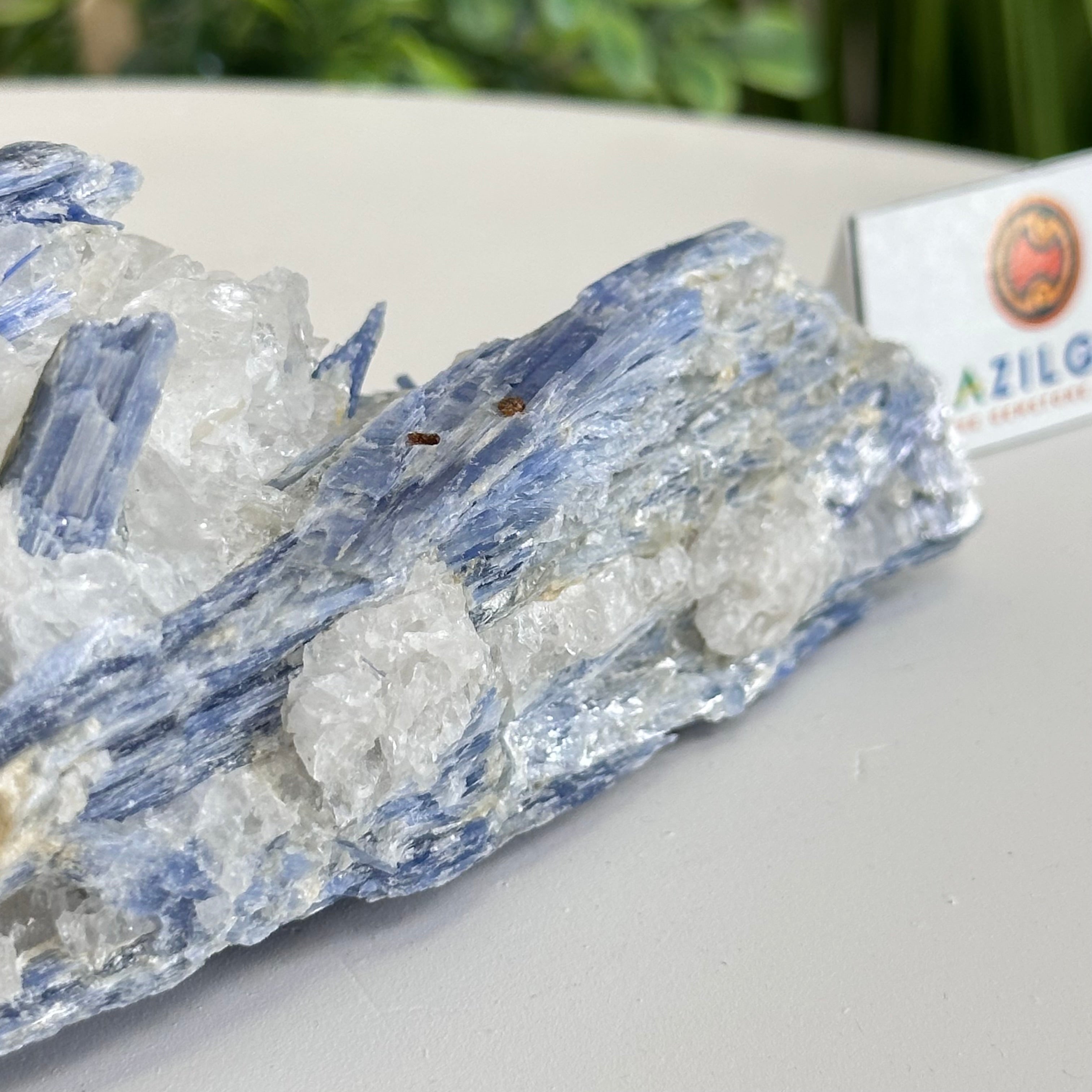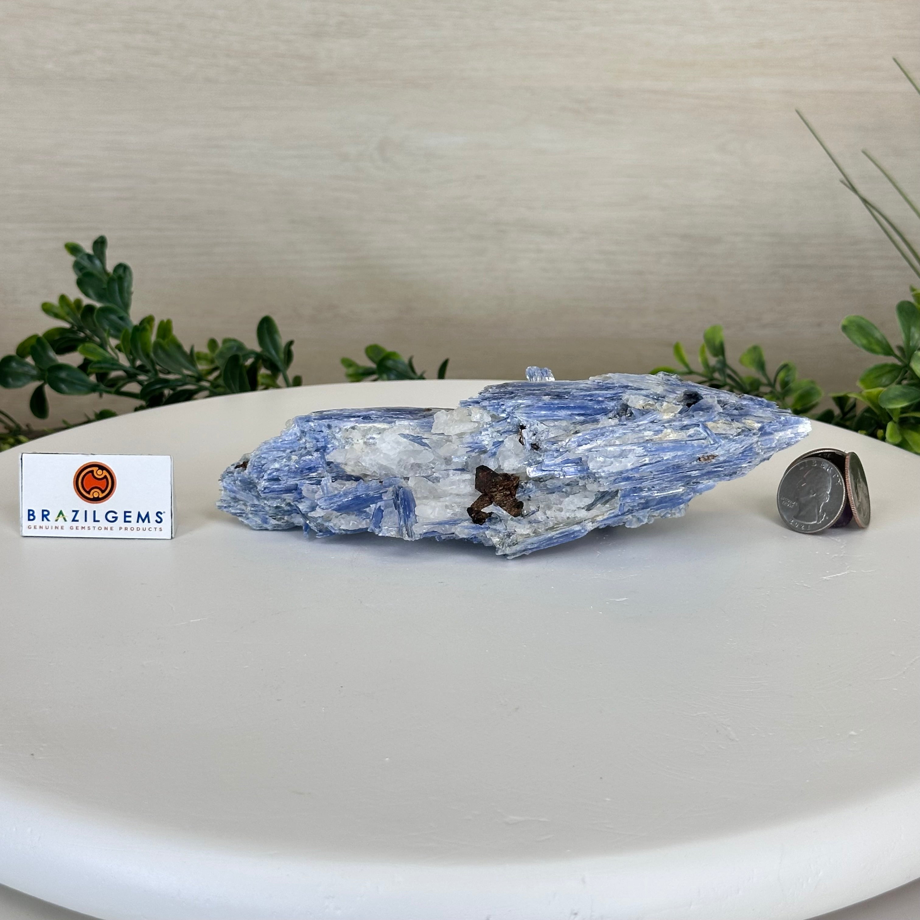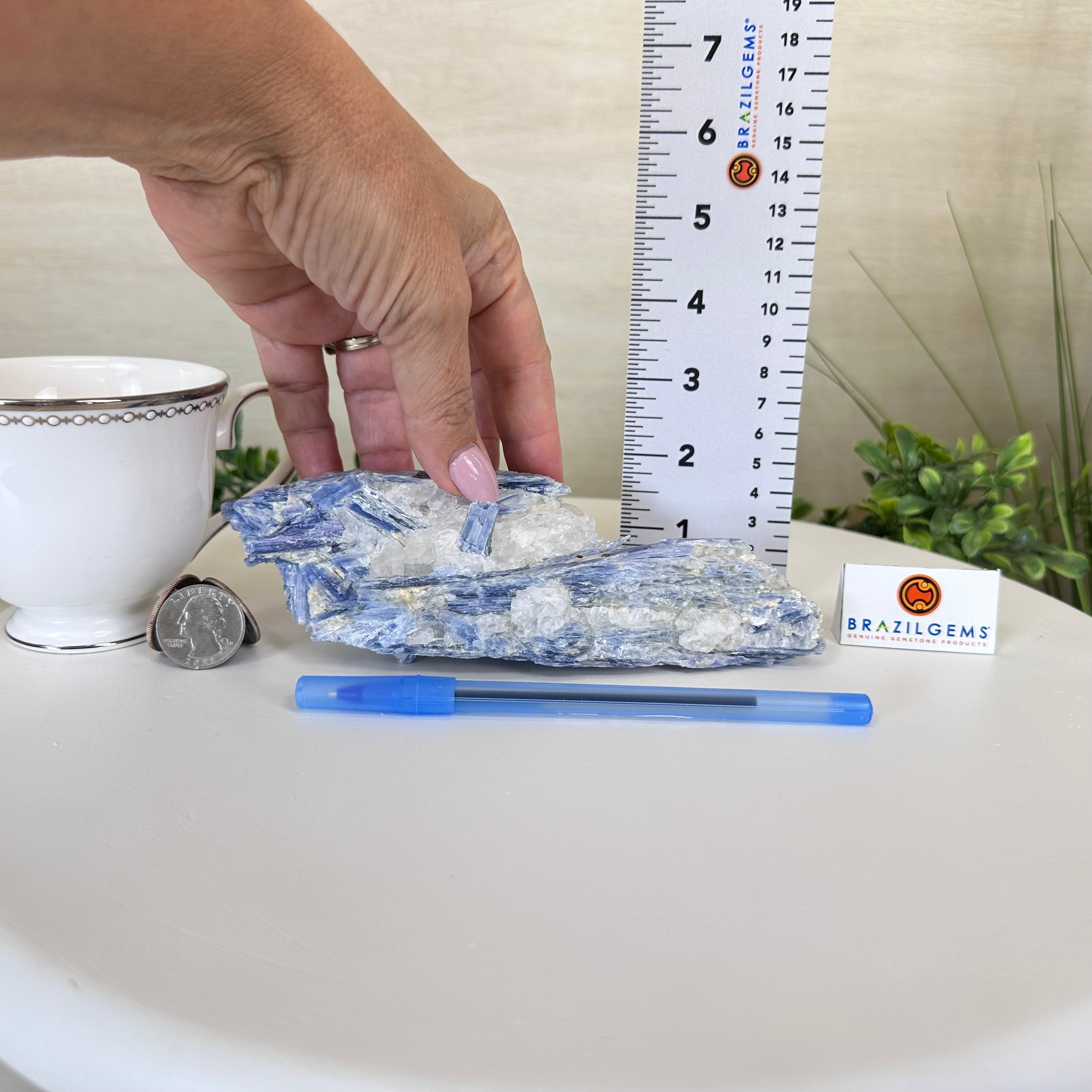 Disclaimer: This is a natural gemstone crystal sold by Brazil Gems® as is and as you see it in its images and video. It is the exact one you will receive. It may contain natural imperfections and/or imperfections, broken edges and repairs from the extraction and prepping processes. Kyanite is a very delicate and brittle gemstone with delicate crystal blades jutting out and handling the piece can inevitably cause its points/blades to break off in small pieces. It's best to handle it as little as possible. At Brazil Gems® we make every effort to get measurements as exact as possible but they are done by human hands and eyes and therefore may have minor discrepancies.