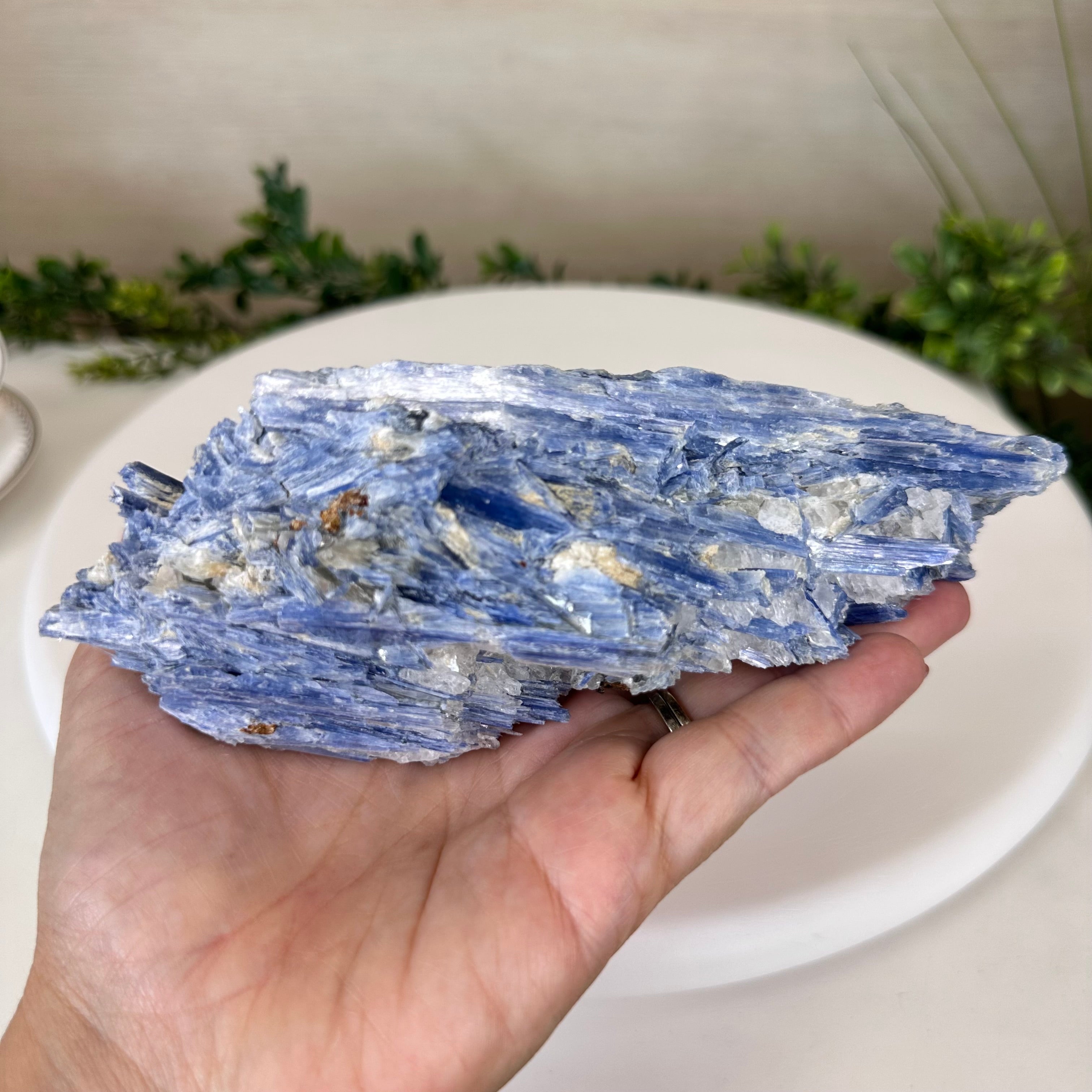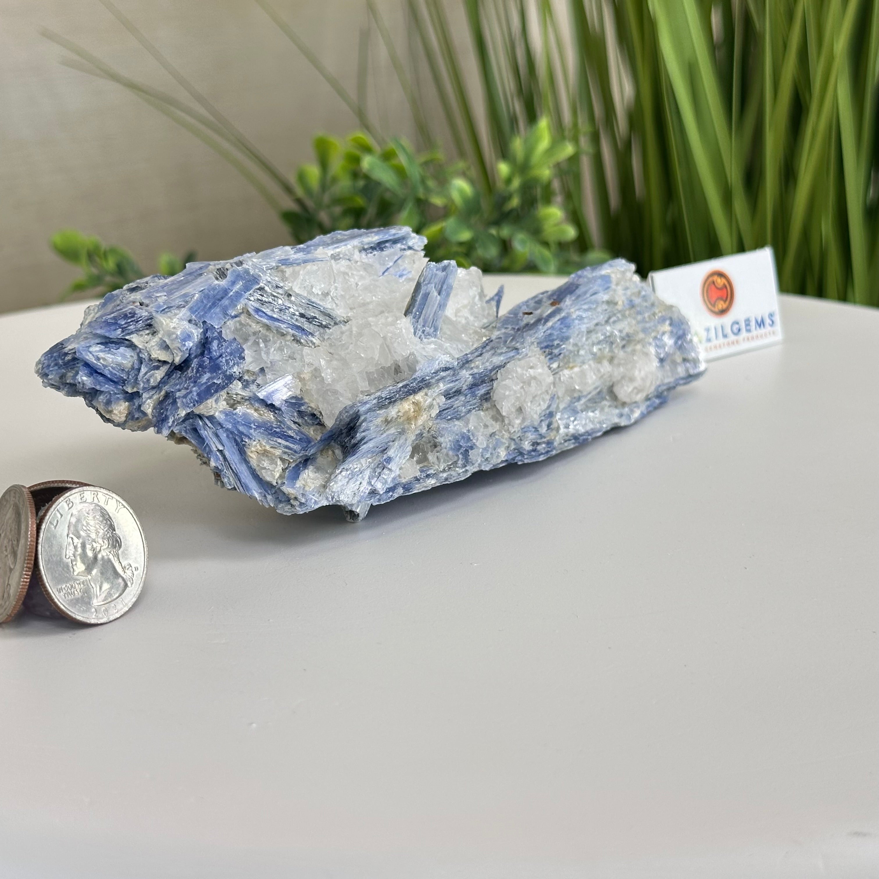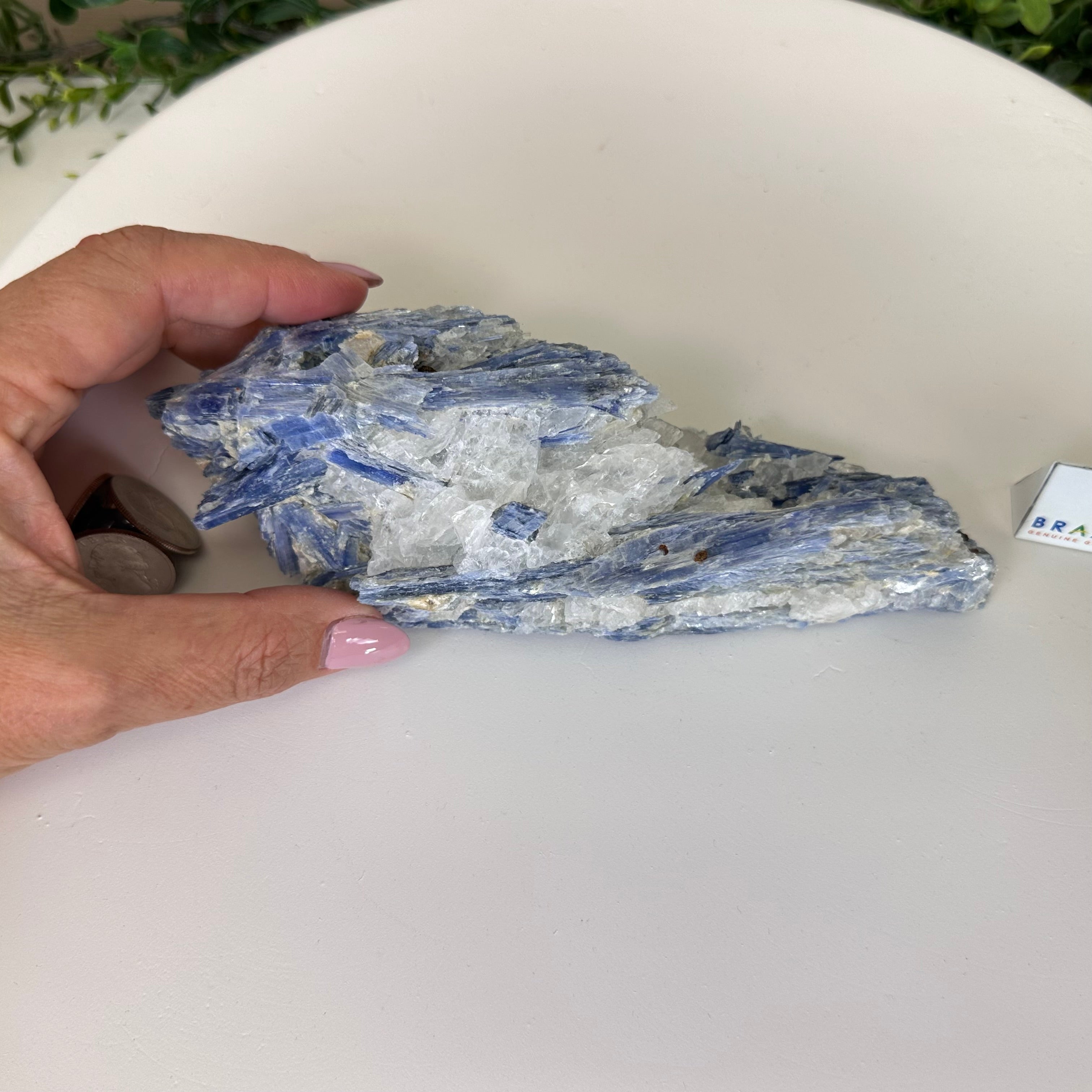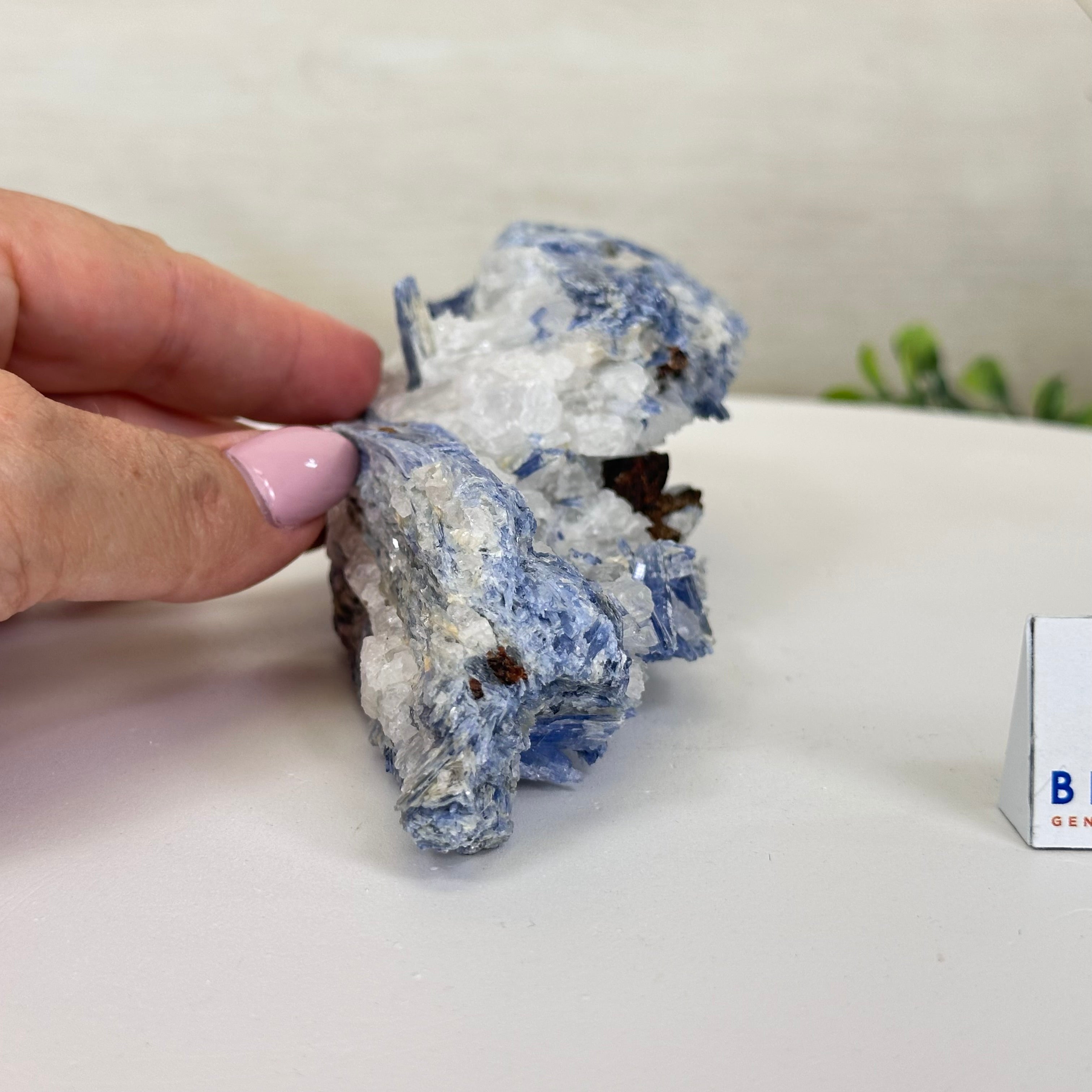 Disclaimer: This is a natural gemstone crystal sold by Brazil Gems® as is and as you see it in its images and video. It is the exact one you will receive. It may contain natural imperfections and/or imperfections, broken edges and repairs from the extraction and prepping processes. Kyanite is a very delicate and brittle gemstone with delicate crystal blades jutting out and handling the piece can inevitably cause its points/blades to break off in small pieces. It's best to handle it as little as possible. At Brazil Gems® we make every effort to get measurements as exact as possible but they are done by human hands and eyes and therefore may have minor discrepancies.